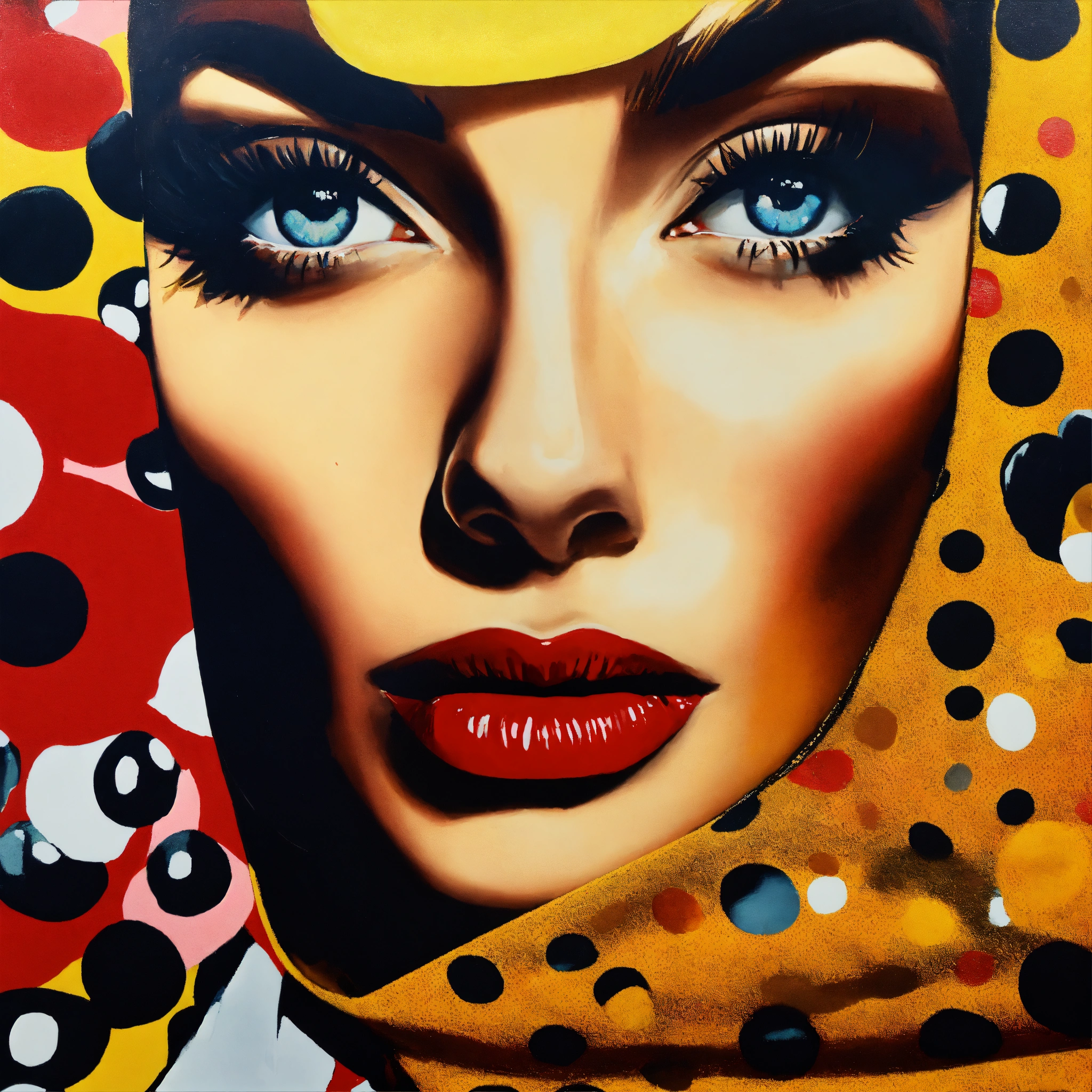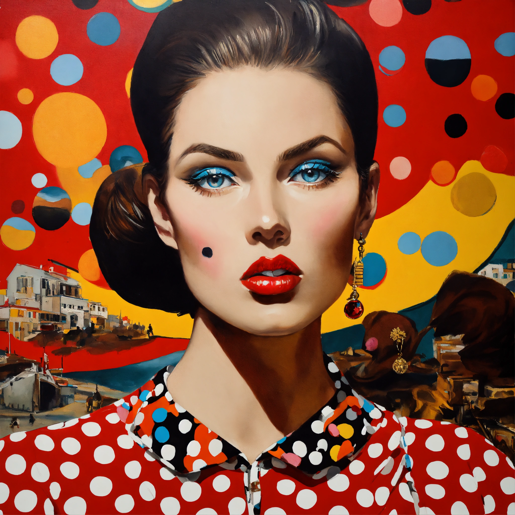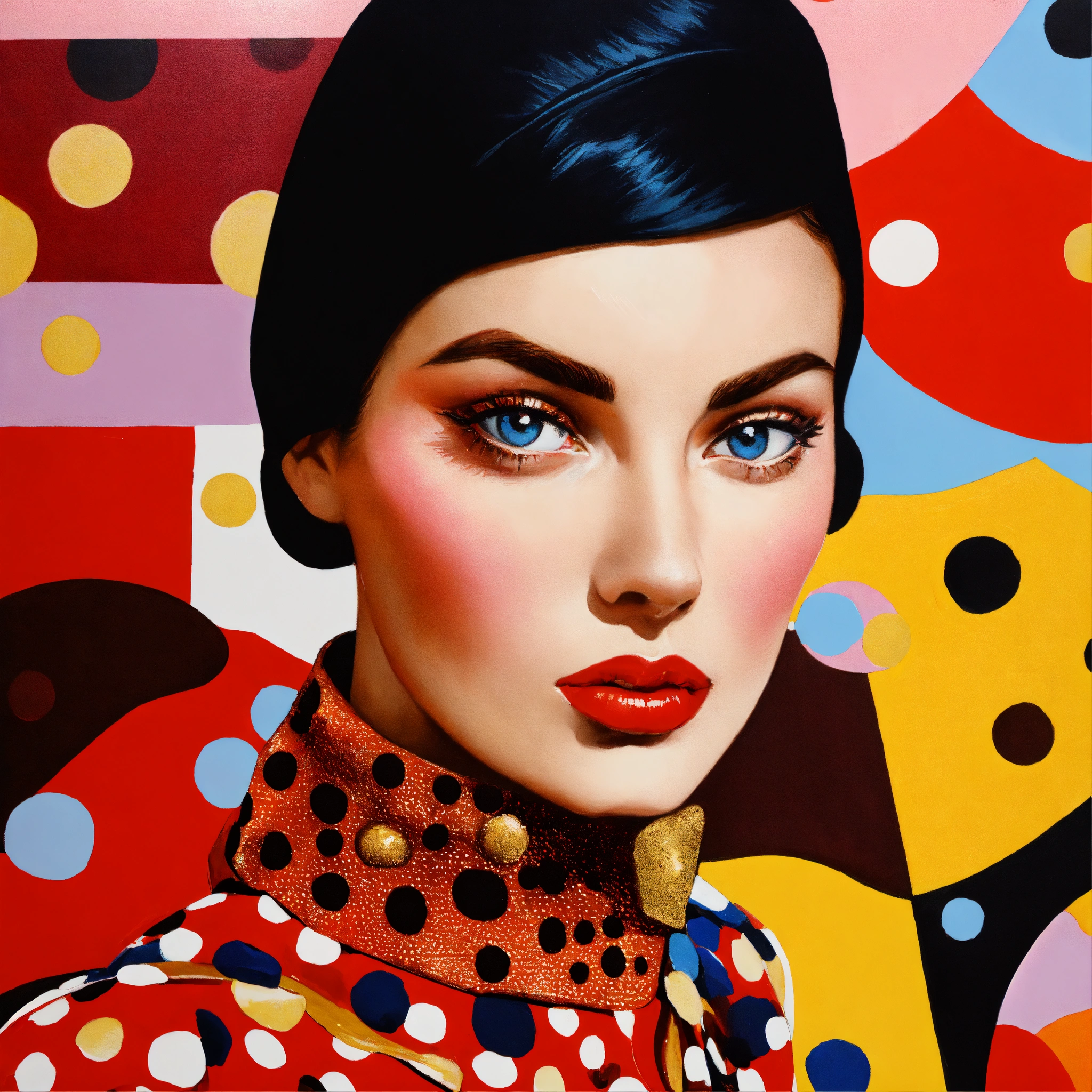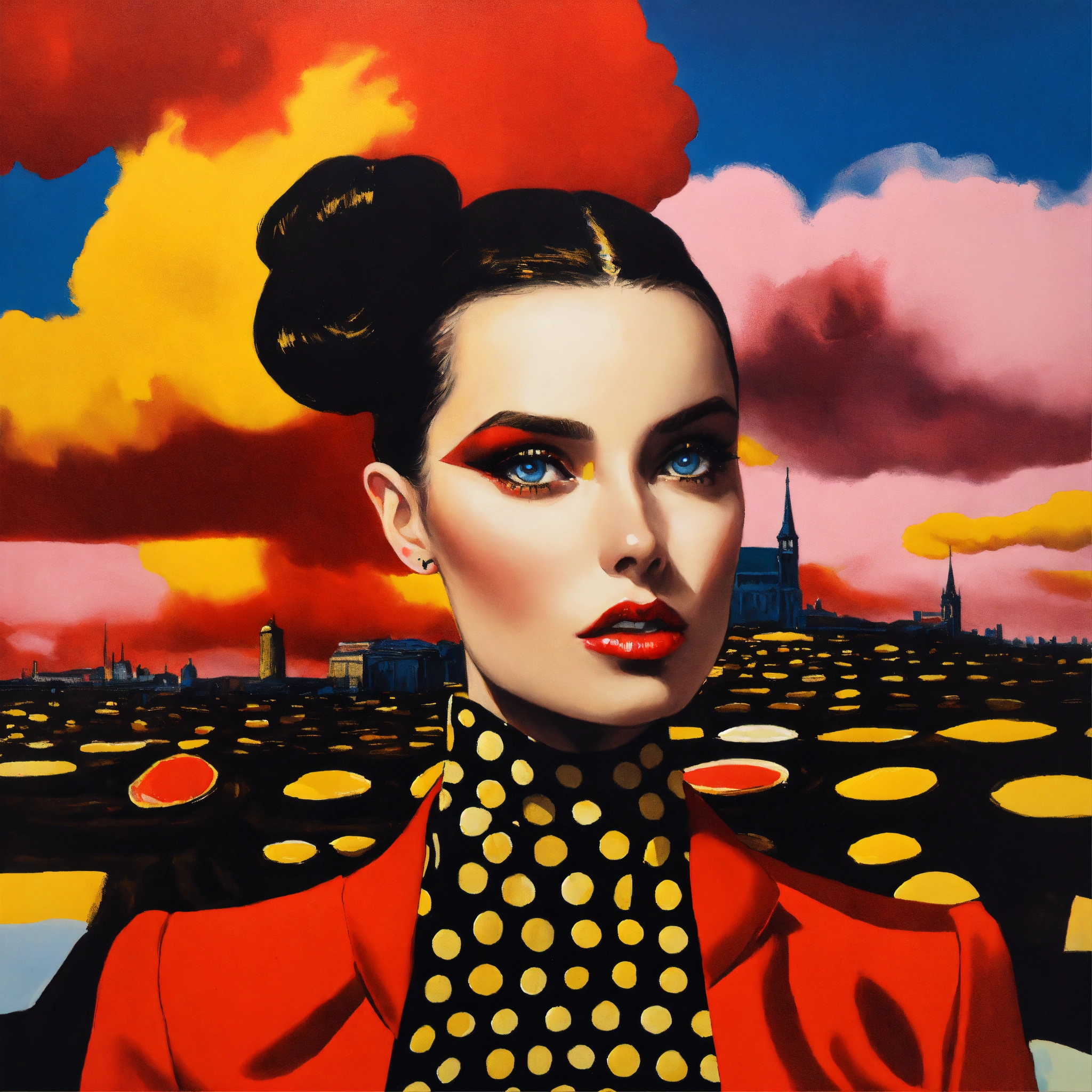 Close up of a female fashion designer in william klein coloured oil painting, woman eating dark chocolate, with women's eyes looking straight at you complex background, perspective, wide angle. very surreal. pop art style loads of colour and dada surrealism. more bizarre and perfect painting. bizarre shaped clouds of polka dot golden and cardinal red skys.loads of polkadot red gold and black every were.