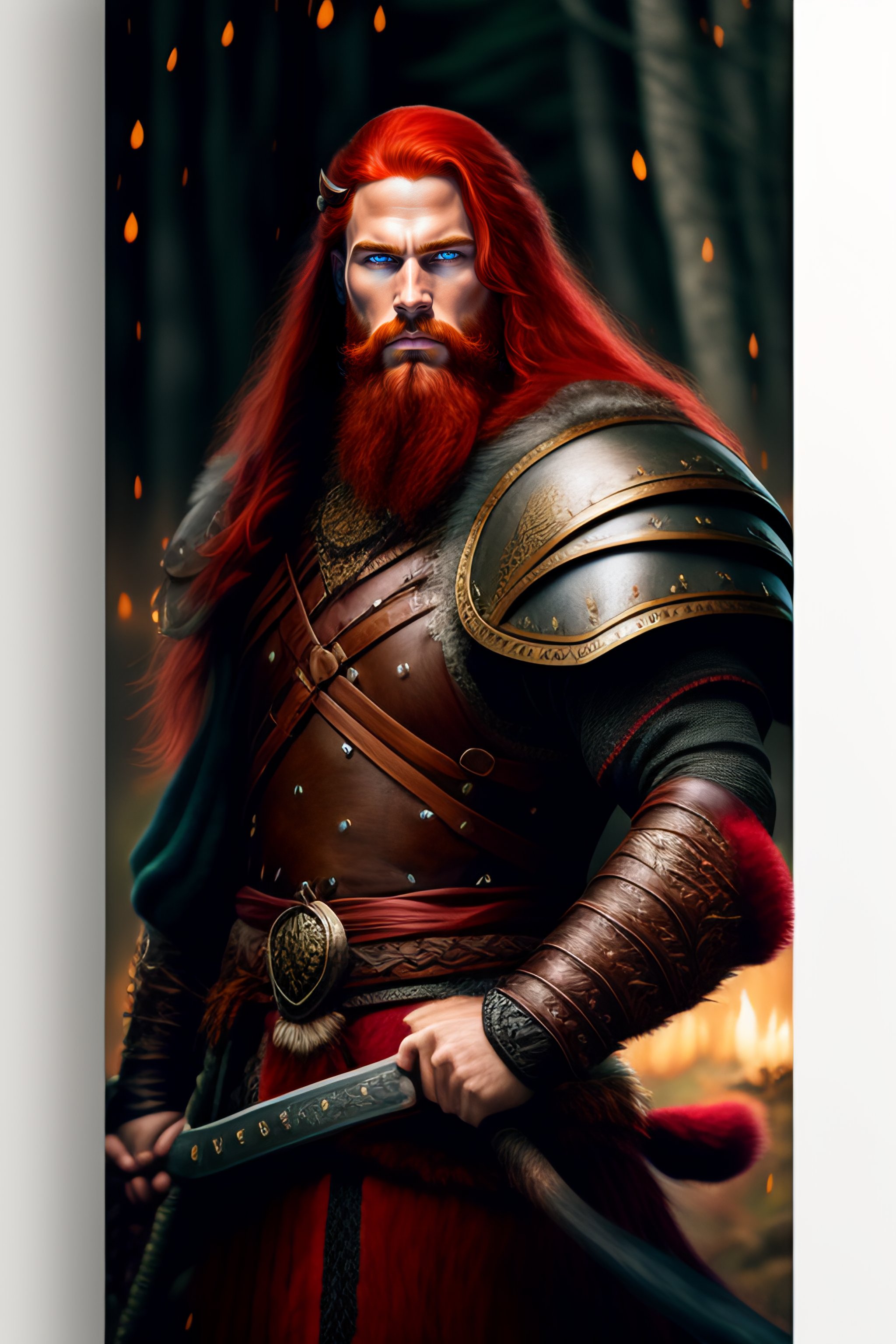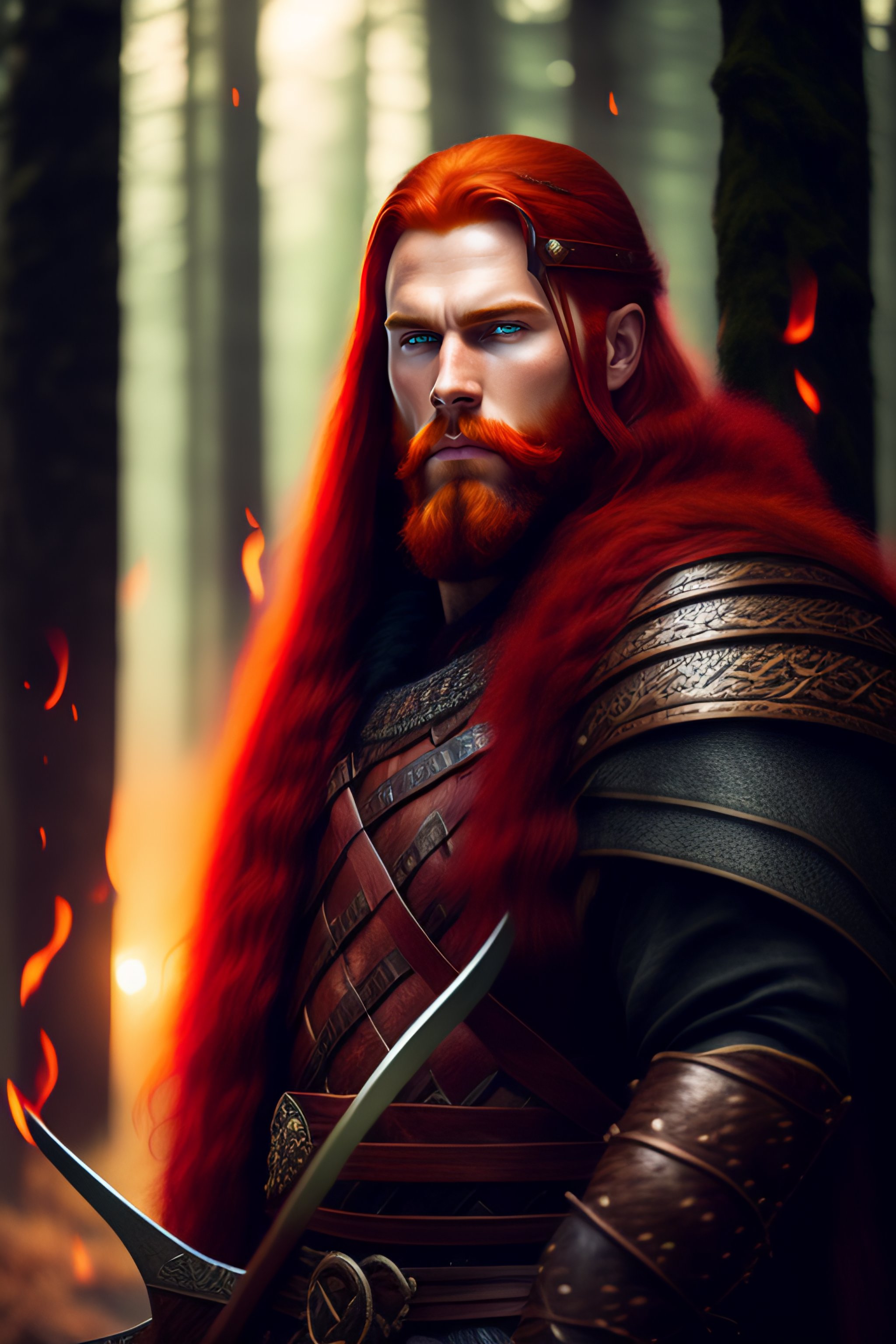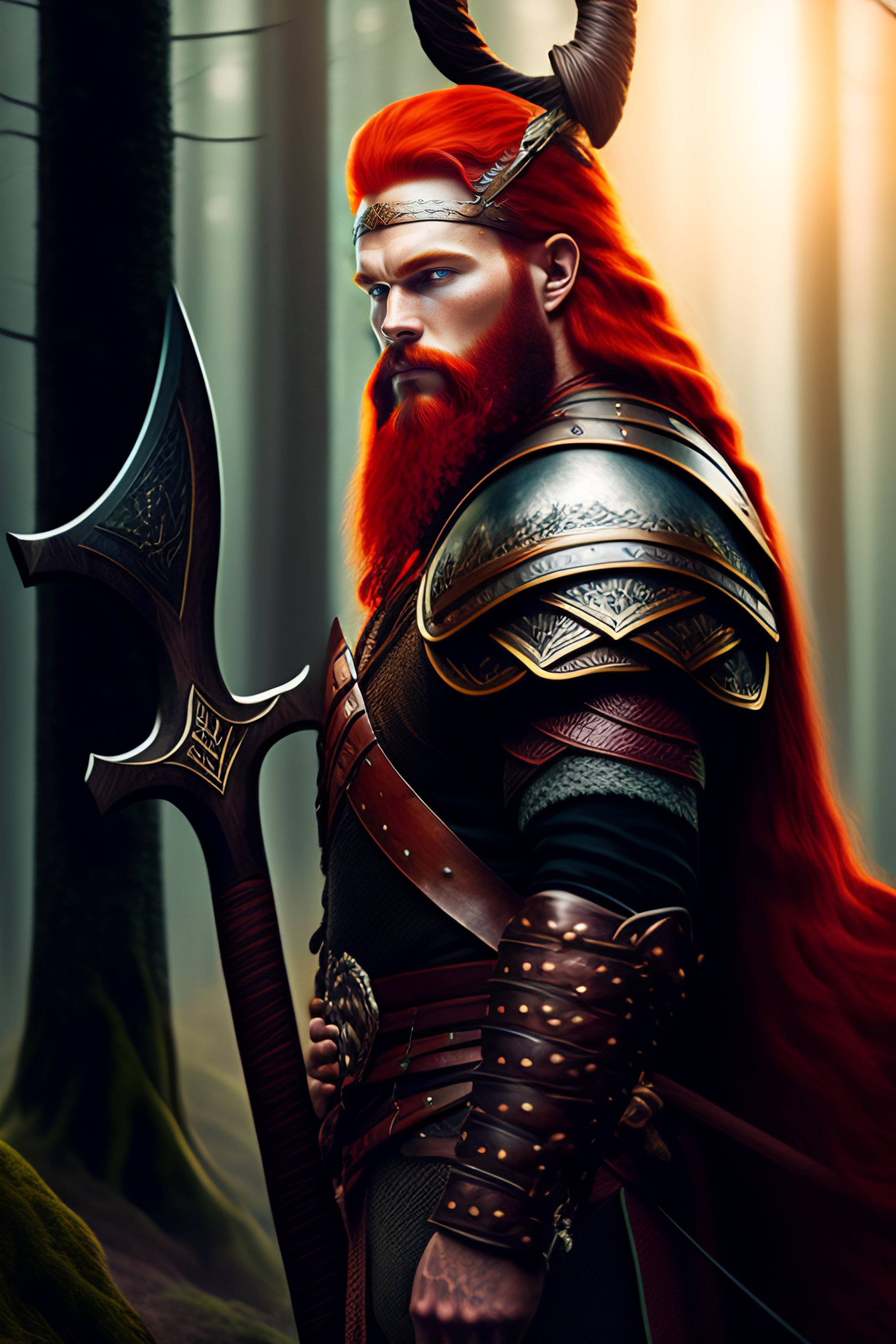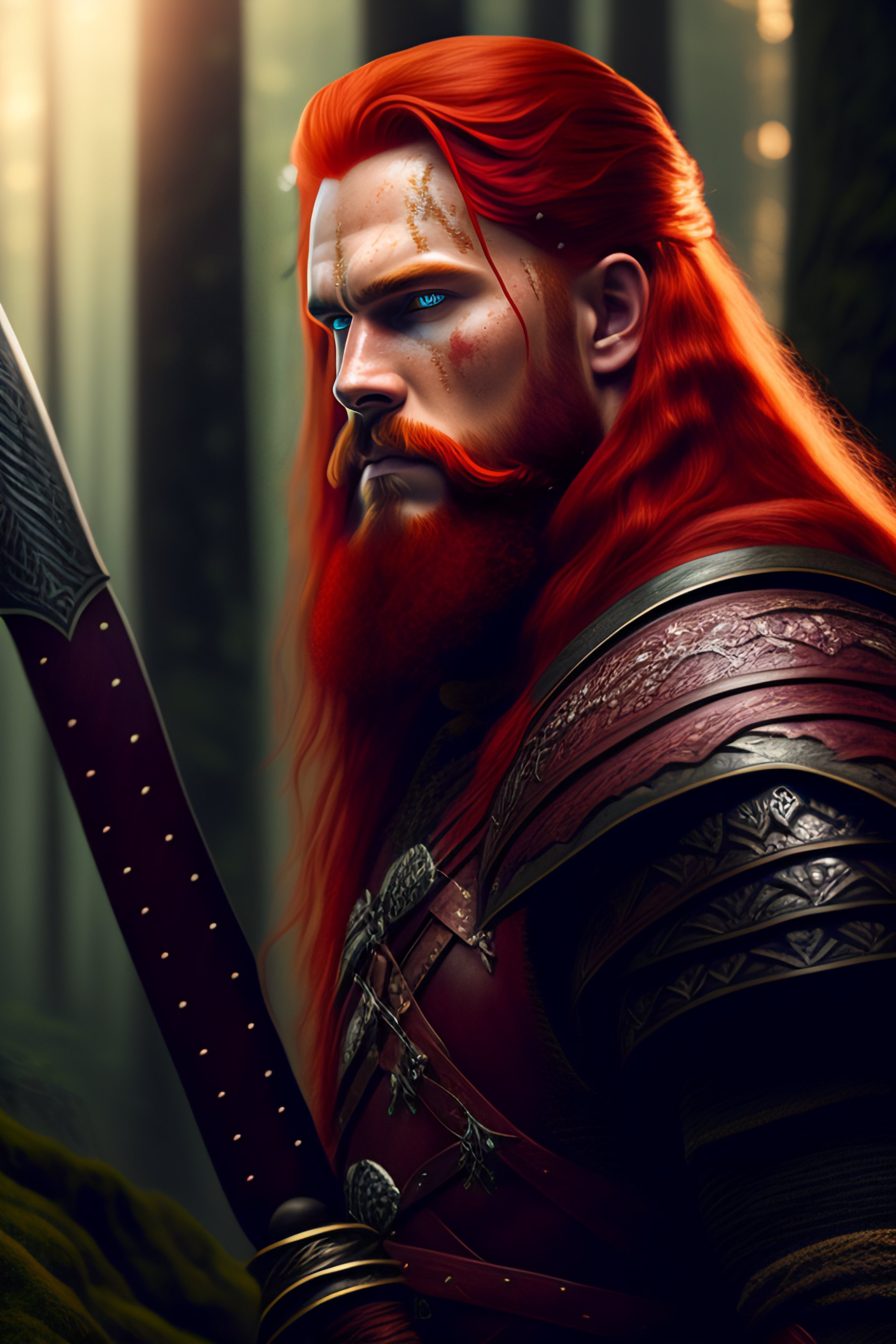 Portrait of a red haired viking warrior wielding an axe, dark forest background, fantasy, high fantasy, elegant, epic composition, highly detailed, intricate, digital painting, trending on artstation, concept art, smooth, dark, gloomy, realistic, sharp focus, illustration, 8k, 4k, dramatic lighting, d&d, upper body