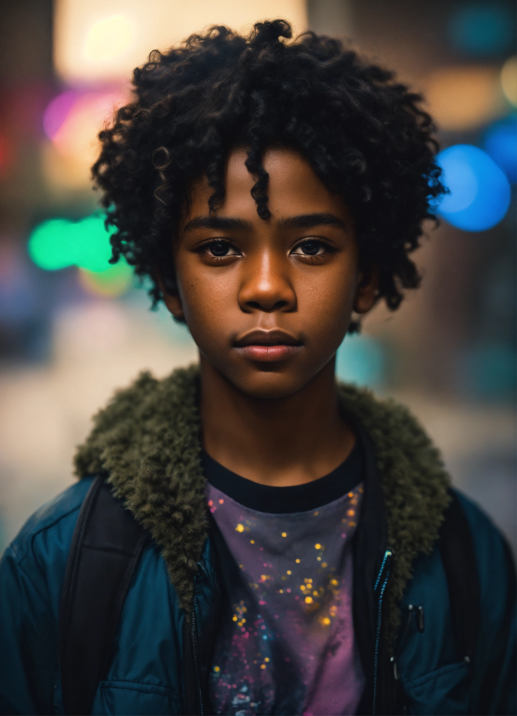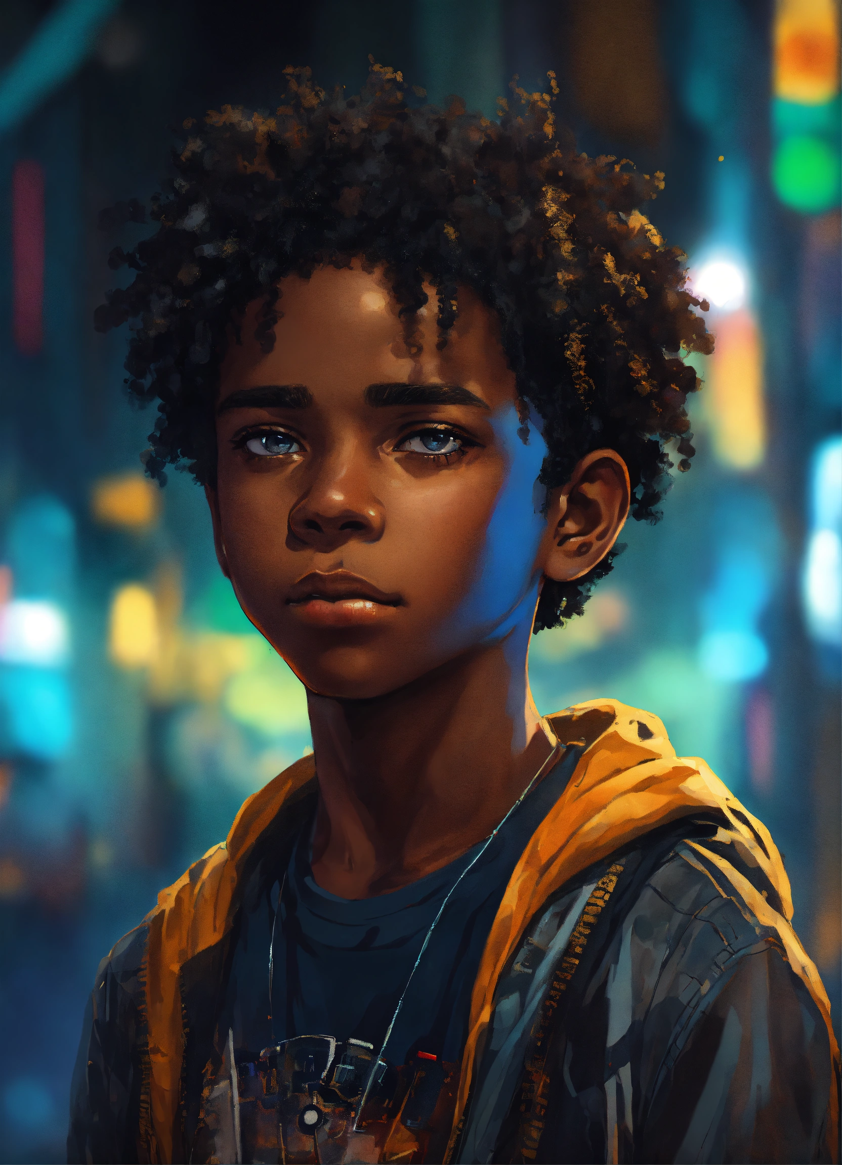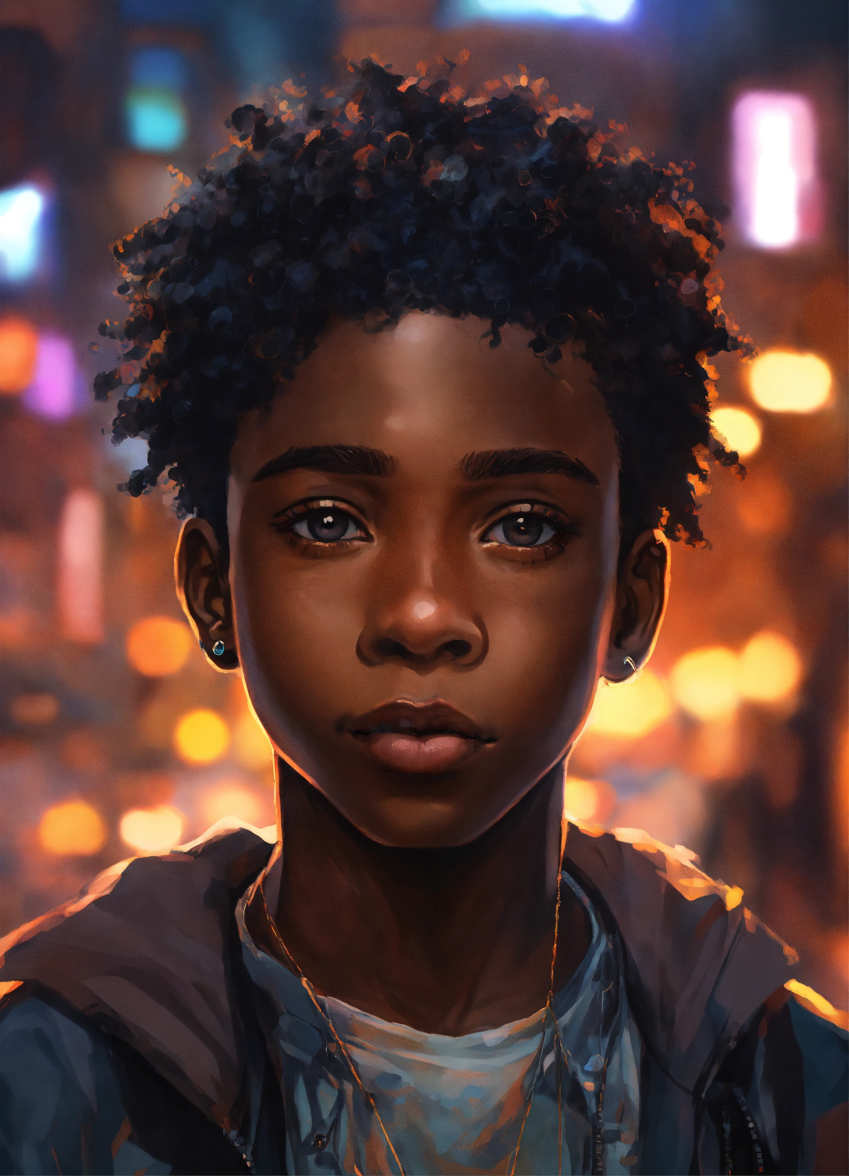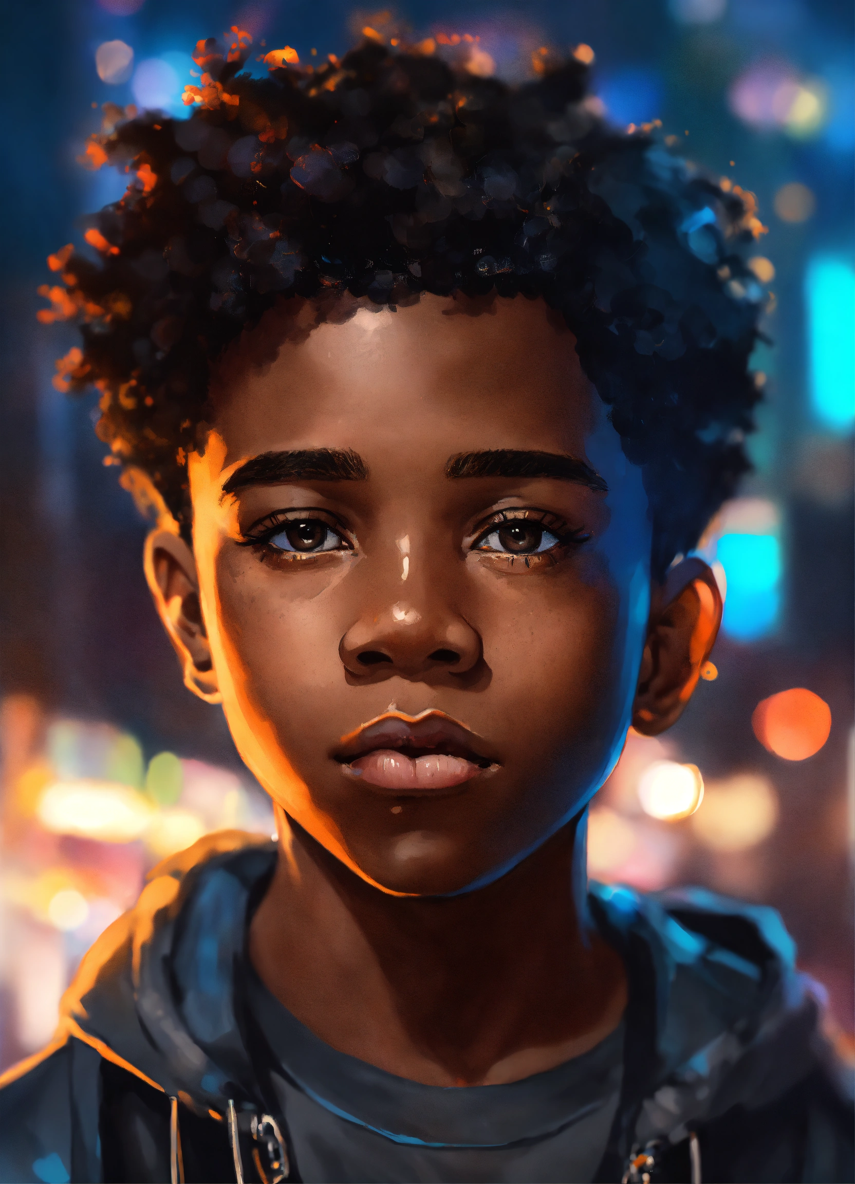 Highly detailed portrait of african american young boy 13 years old, ashy black hair wavy, kind light eyes, black stweetwear, cyberpunk, cartoon realism, black, grunge aesthetic!!! bokeh