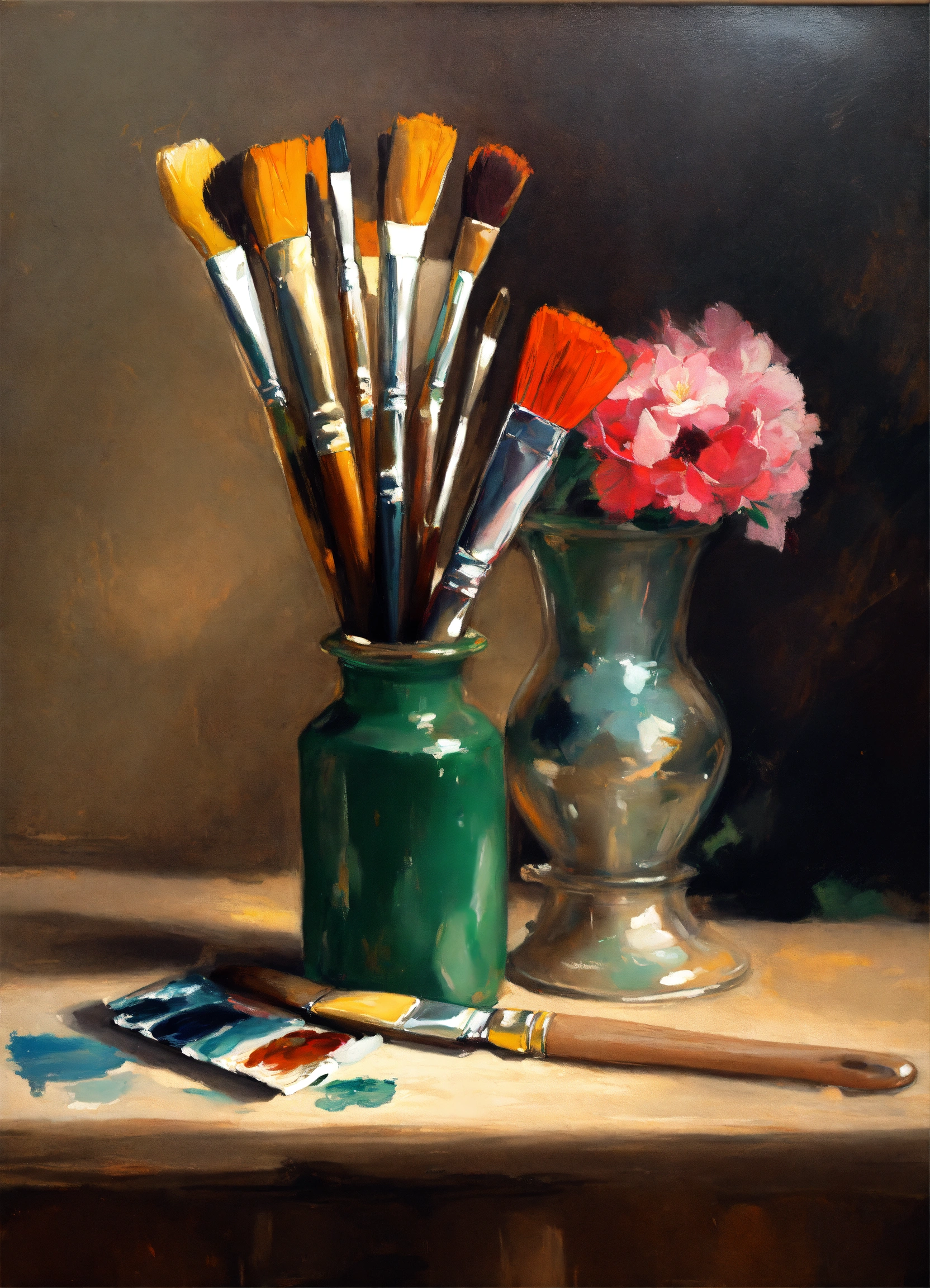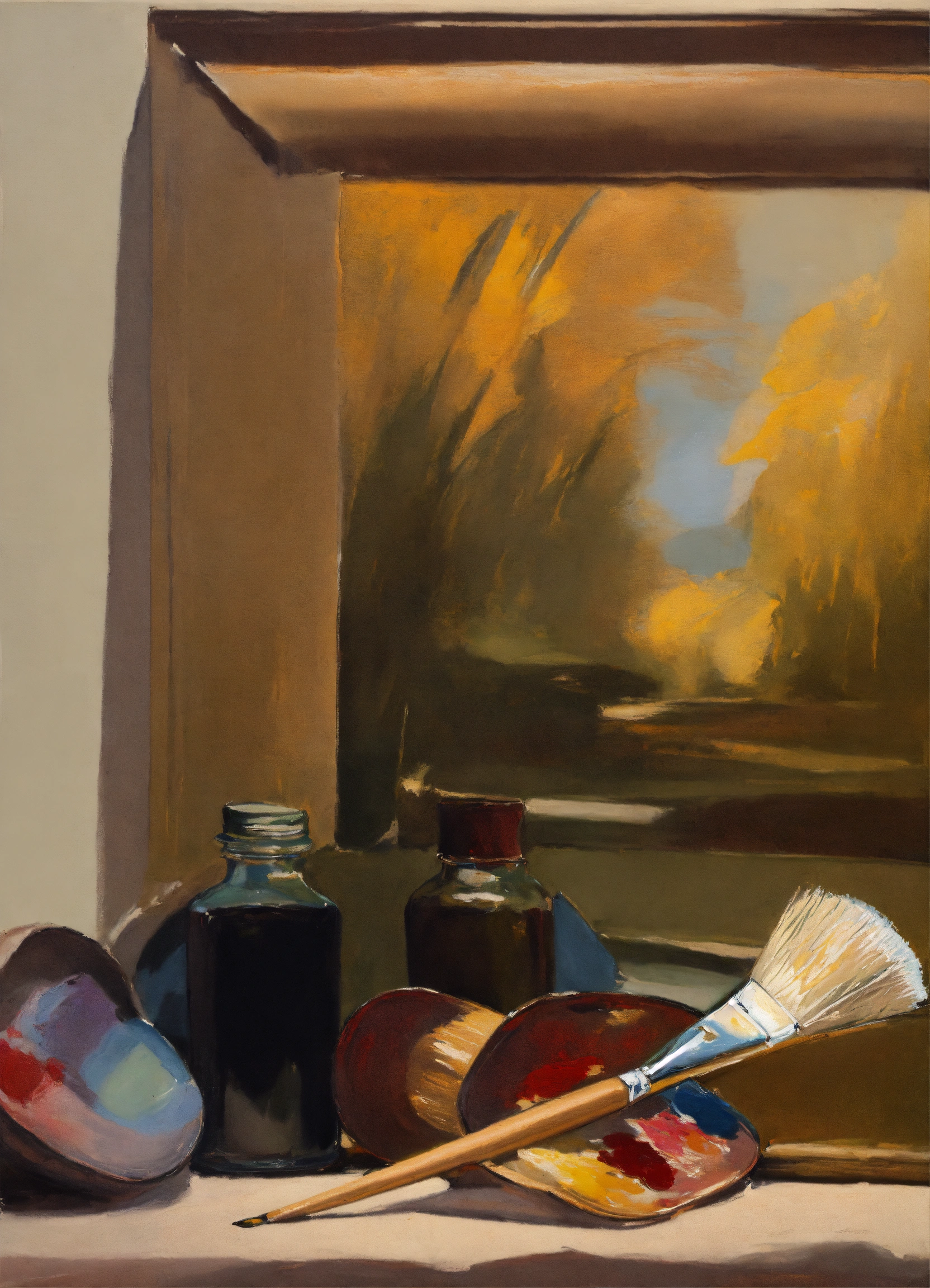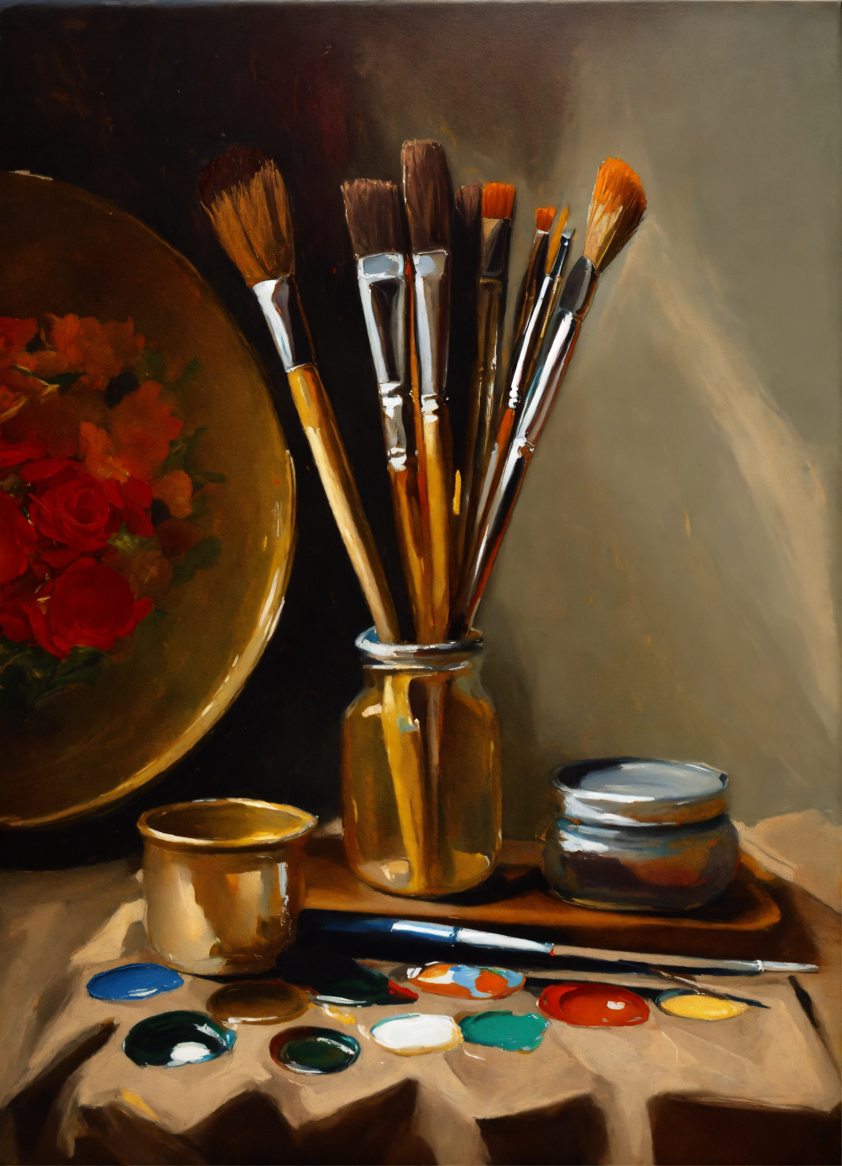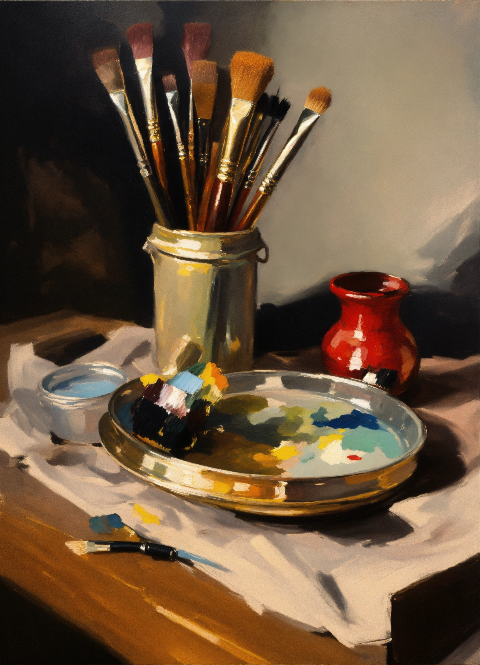Oil painting of a paint brush and palette in the style of john singer sargent