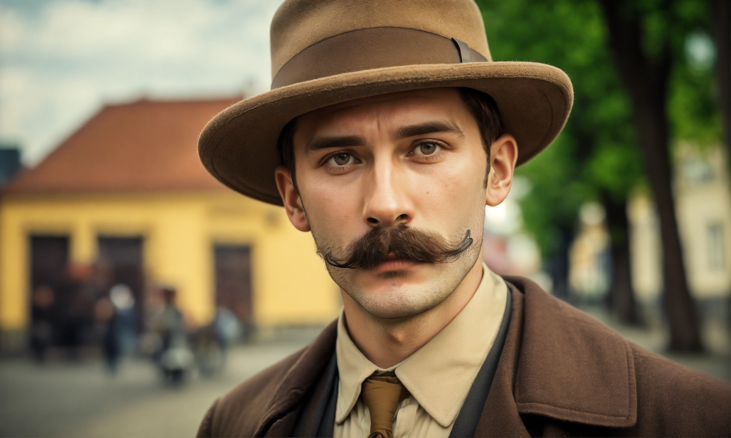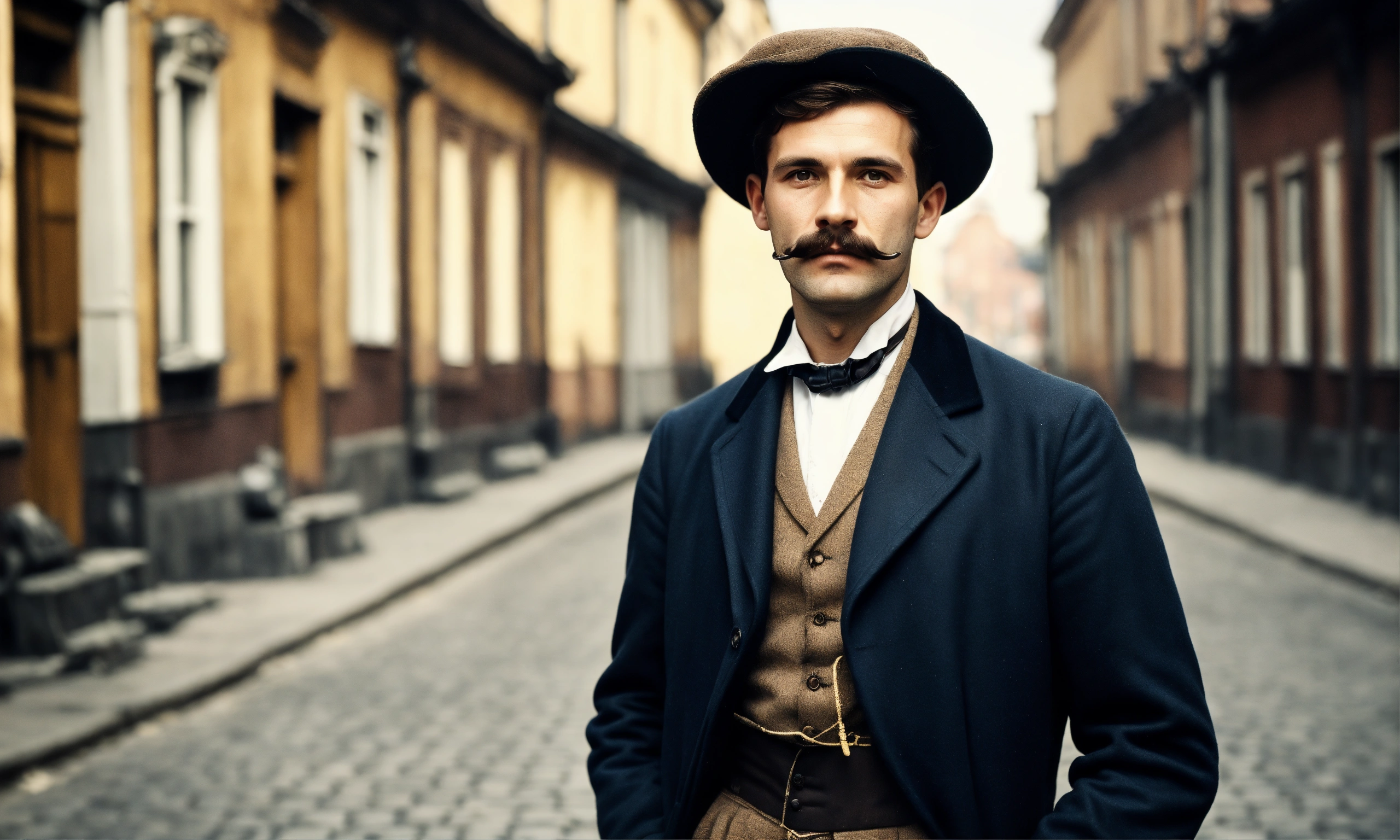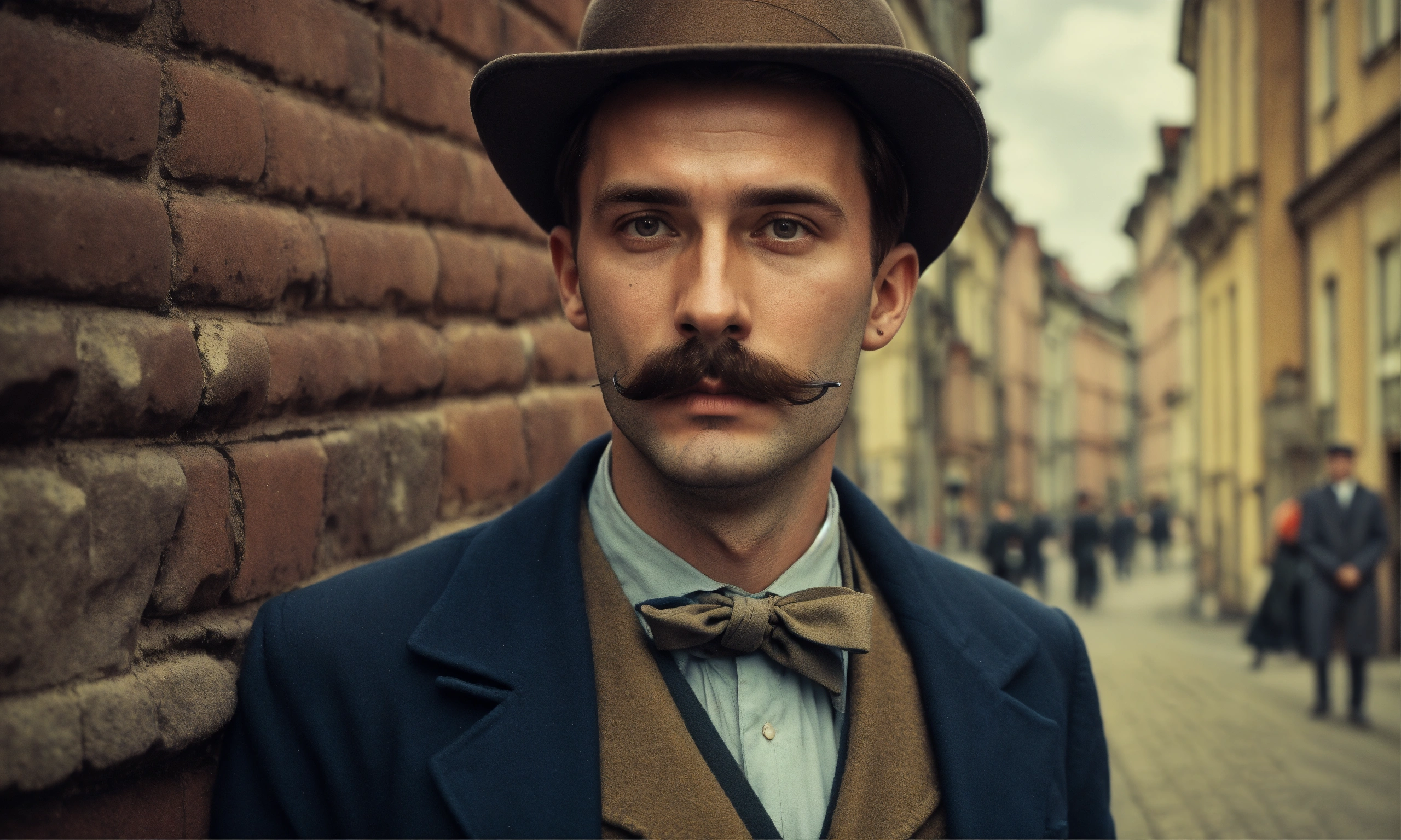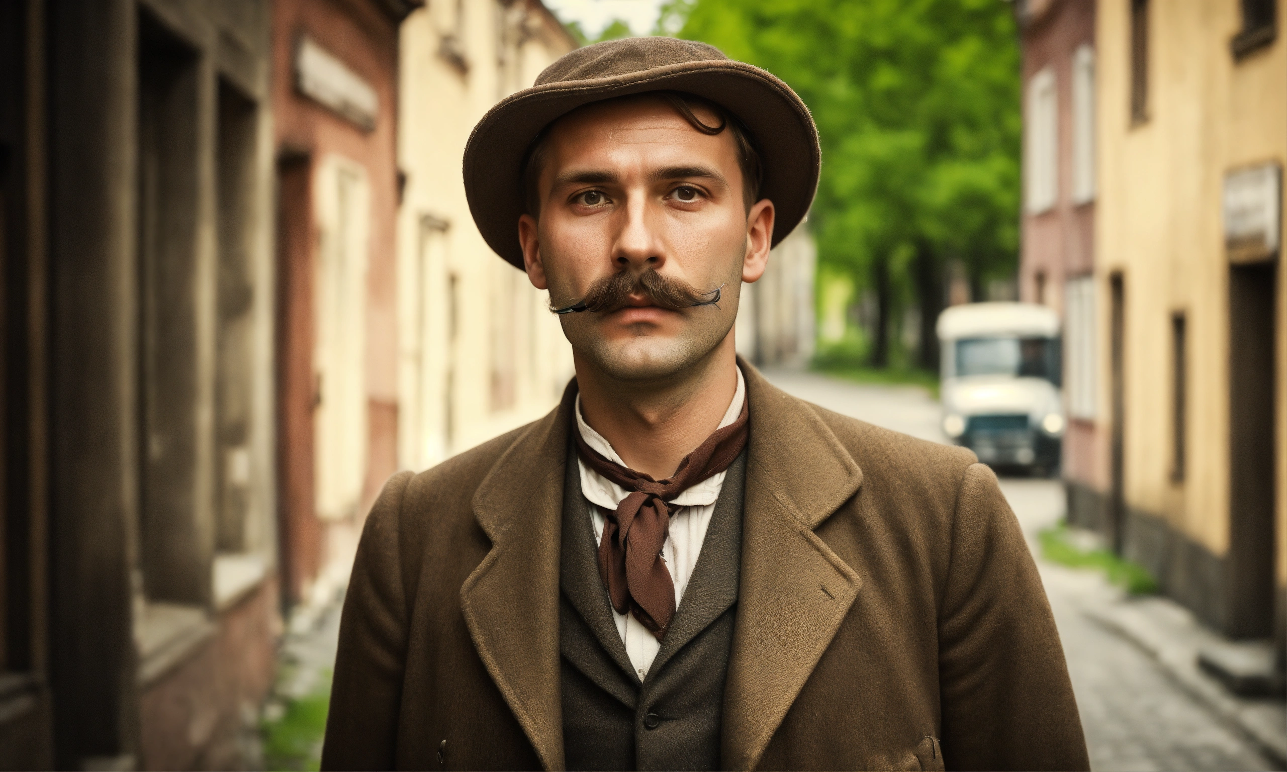 Cute poland brunette poor man age 30 with a mustache, 1920-1930 on streen in warshaw. retro style photo. without people. focus camera on face man. season summer, keep in mind that the street must be without people, retro style photo. without people. man full height. on street