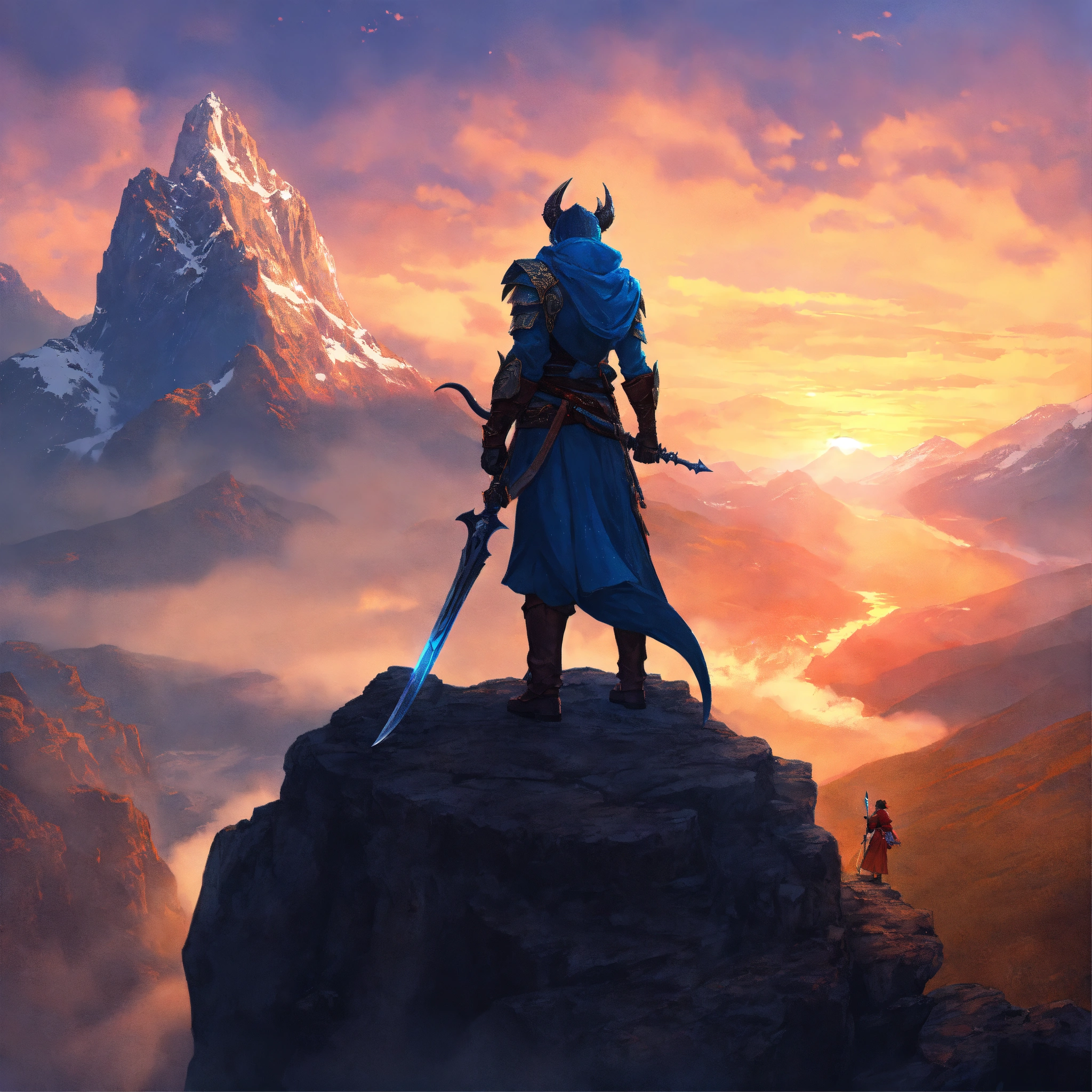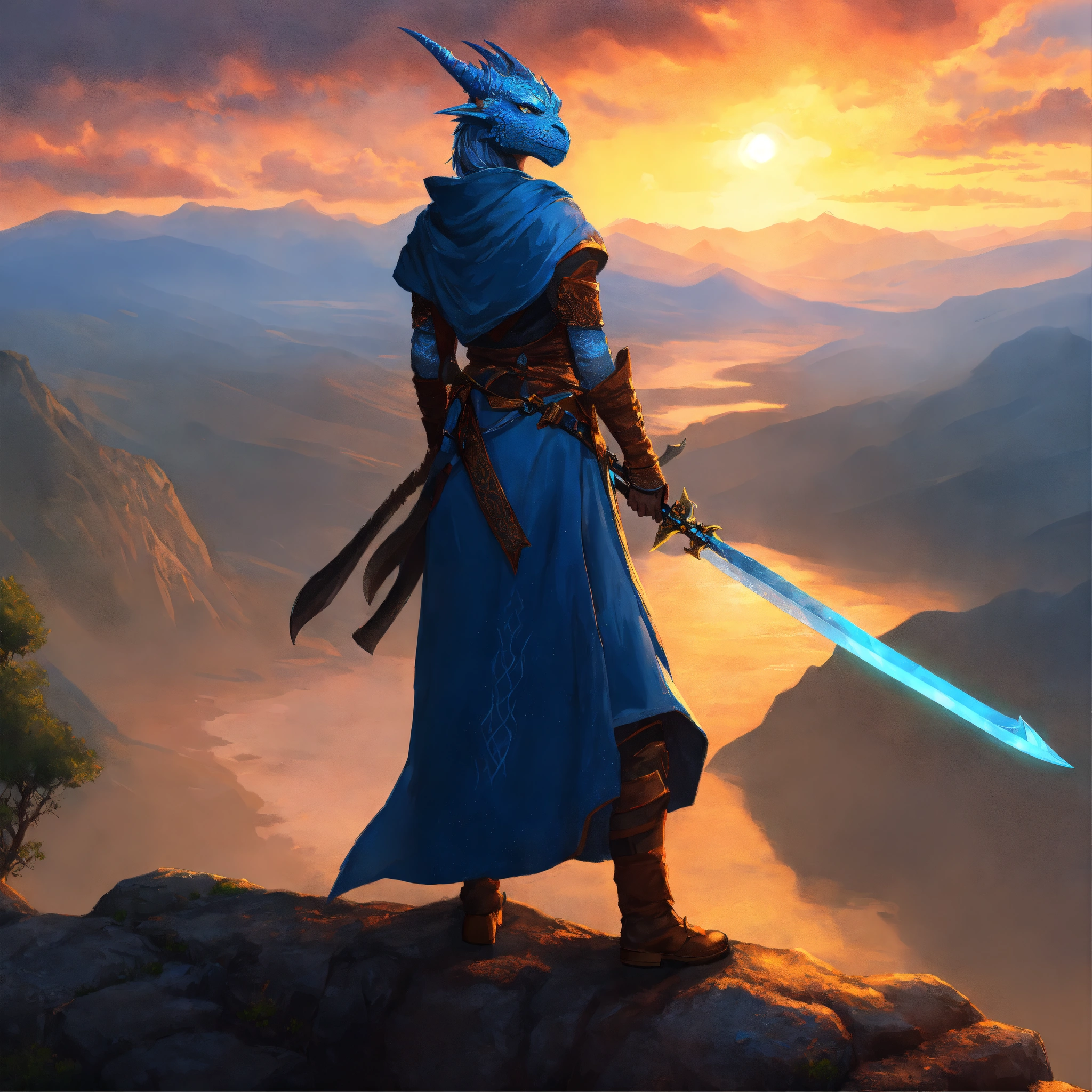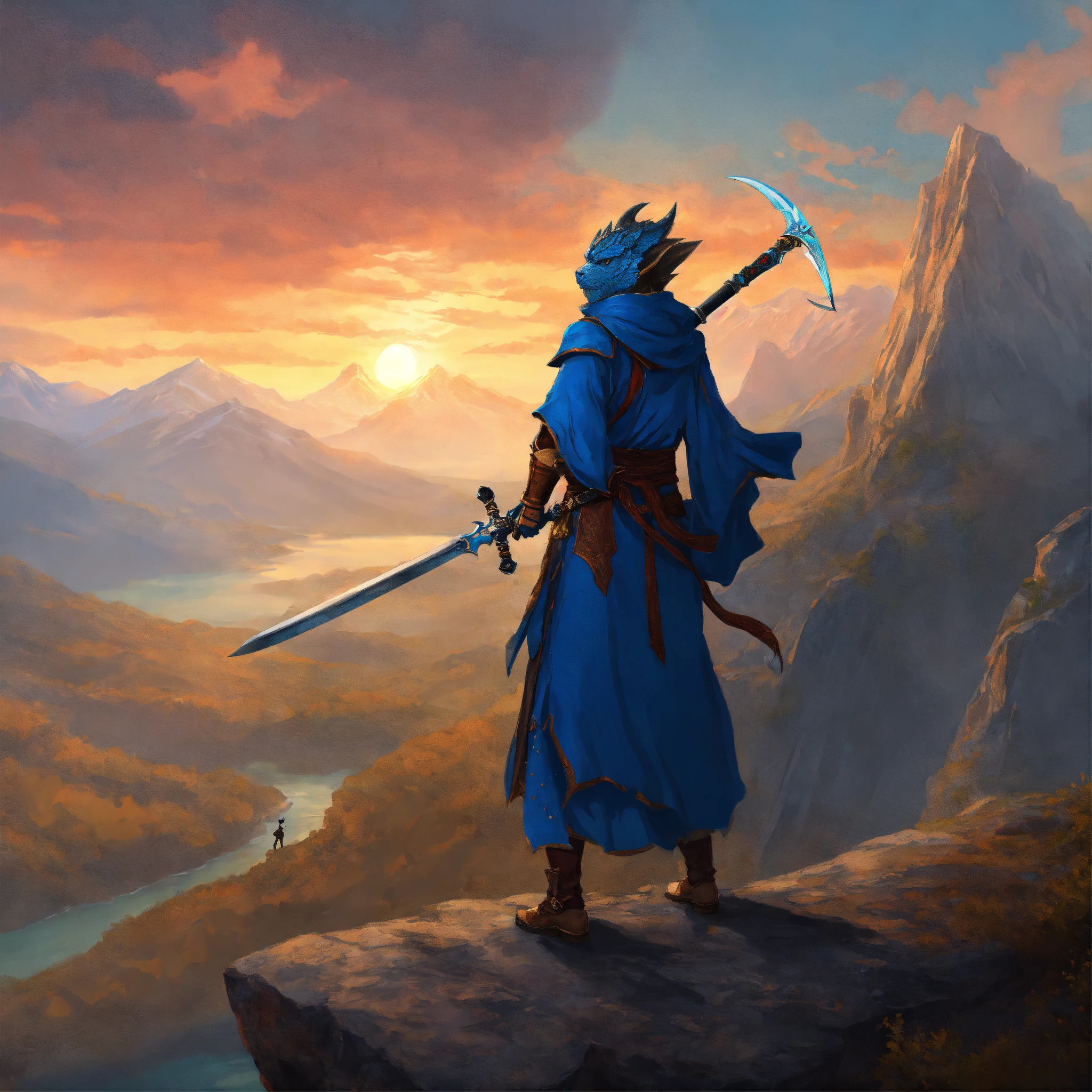 Female blue dragonborn, wielding a glaive, wearing a monk robe, heroic stance, standing on a cliff, watching the sunrise, mountainous background, digital art