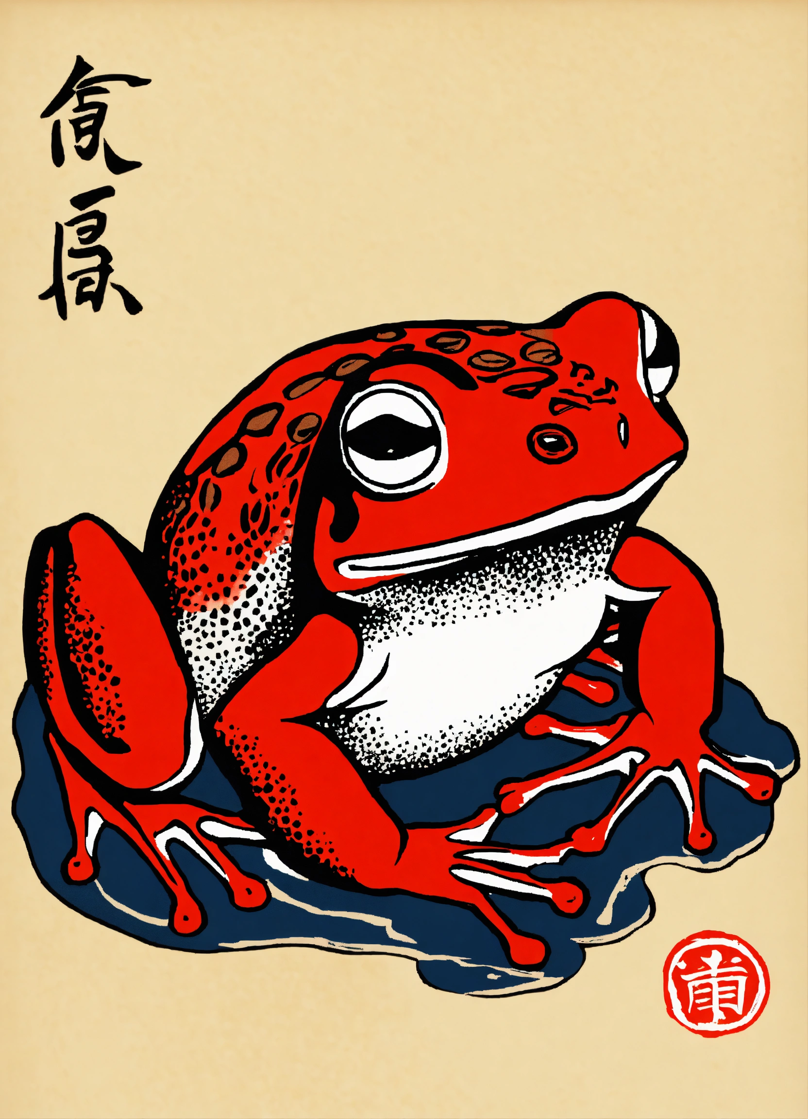 Simple drawing with japonais style, matsumoto hoji frog, vintage red frog woodblock, ukiyo-e frog, japanese frog white background
