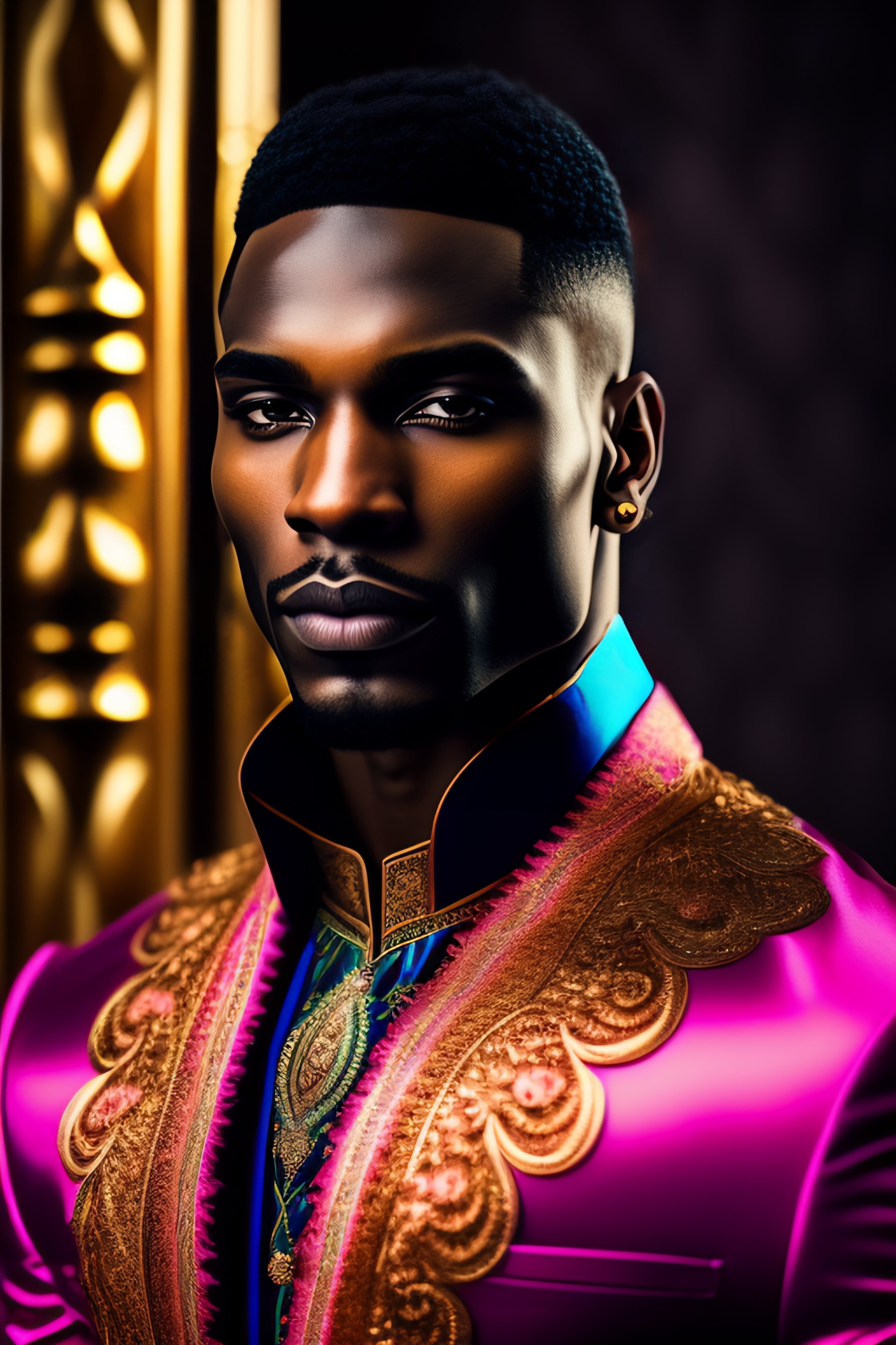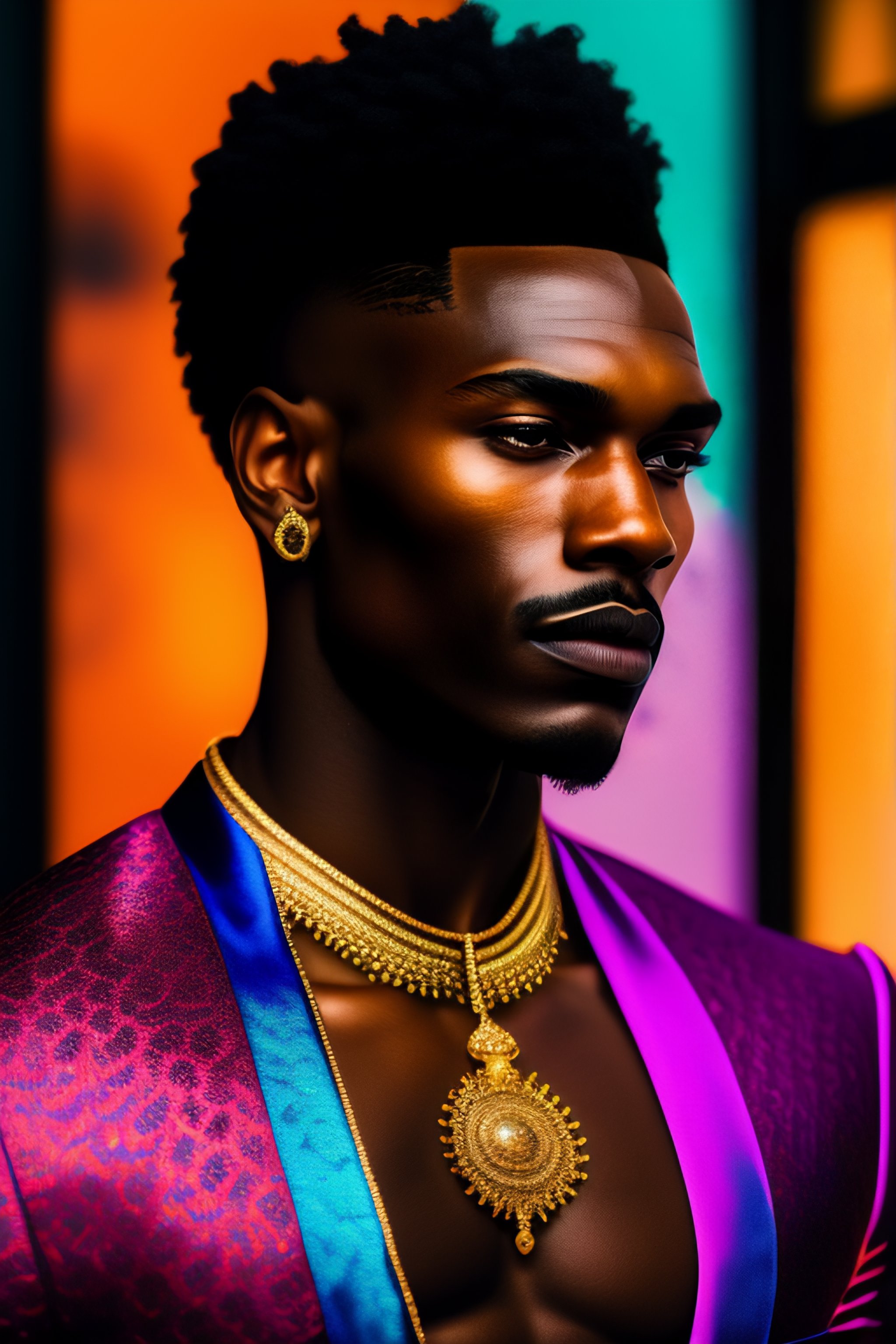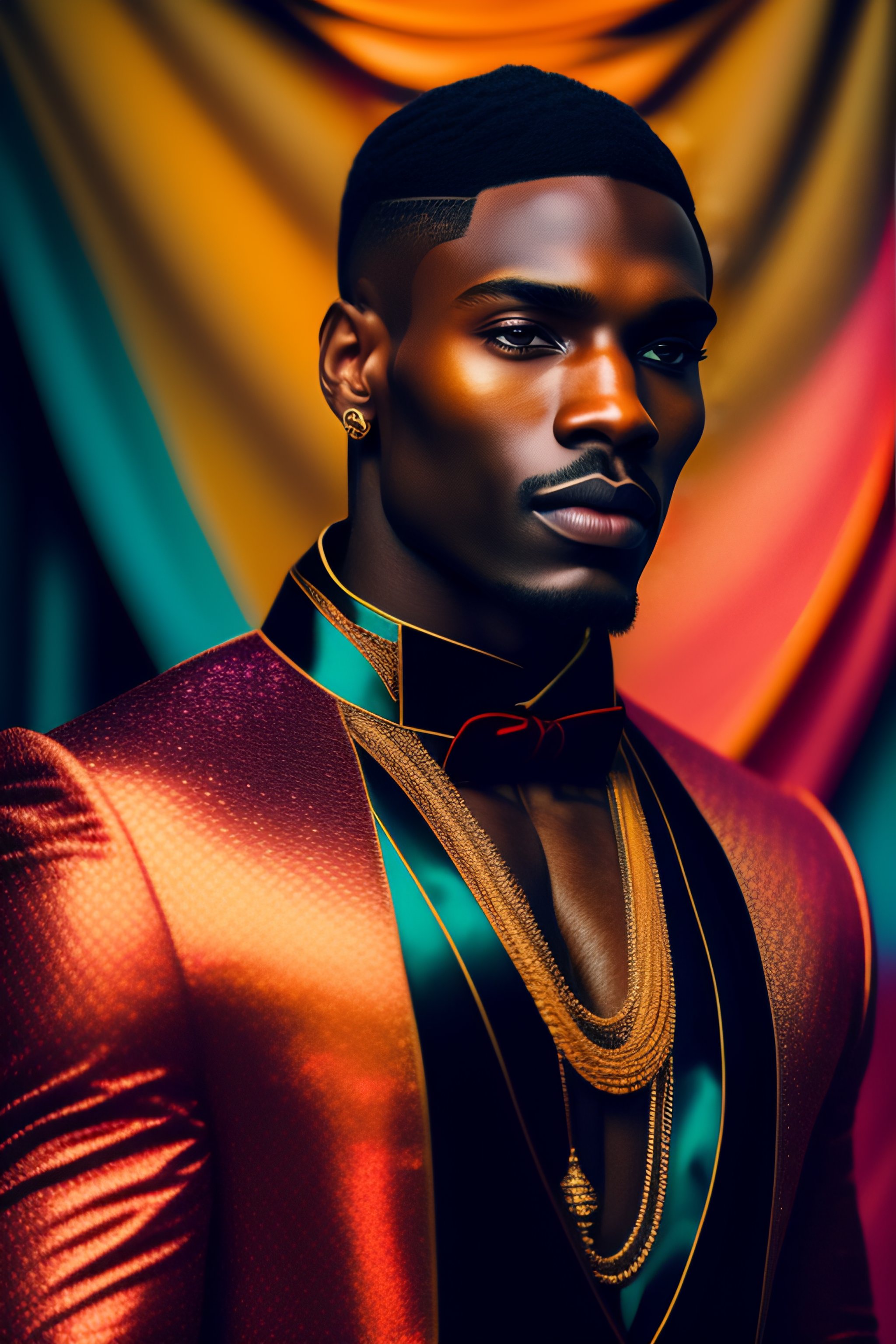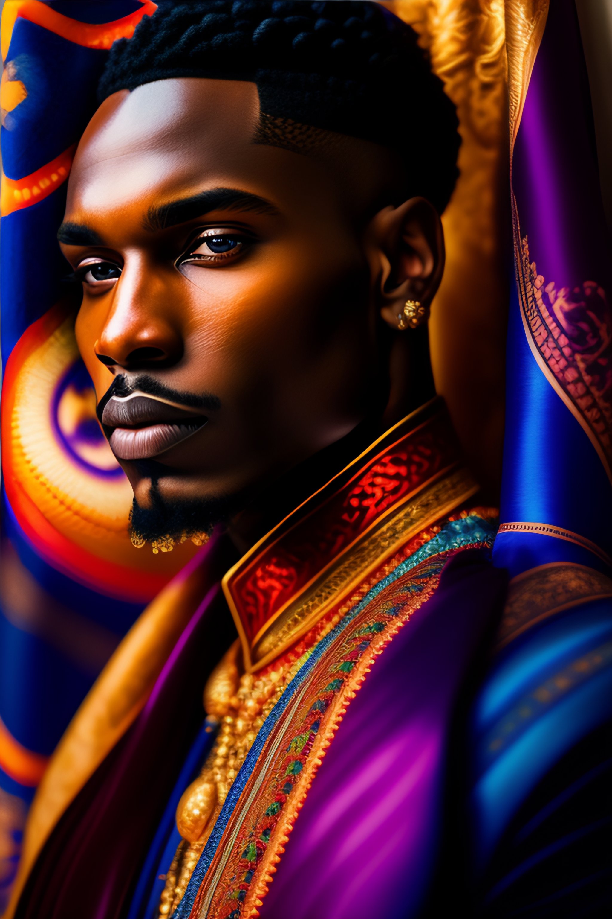 A beautiful and mysterious melanated man in an intricate and colorful gown, no blur, close up, details, sharp focus, elegant, highly detailed, fabric background