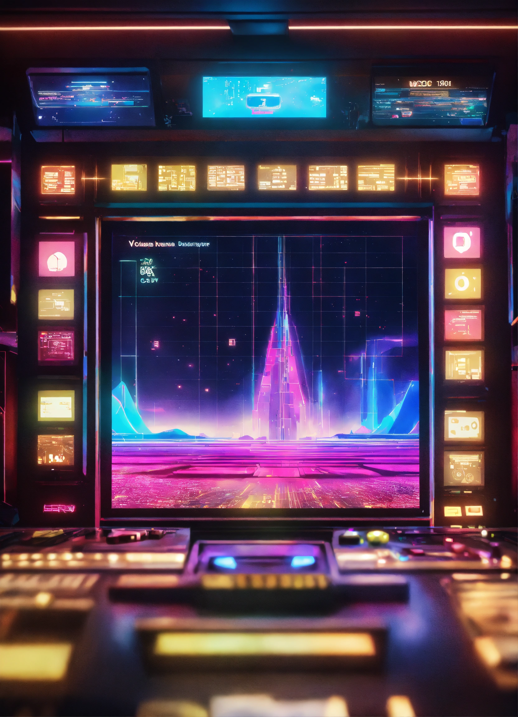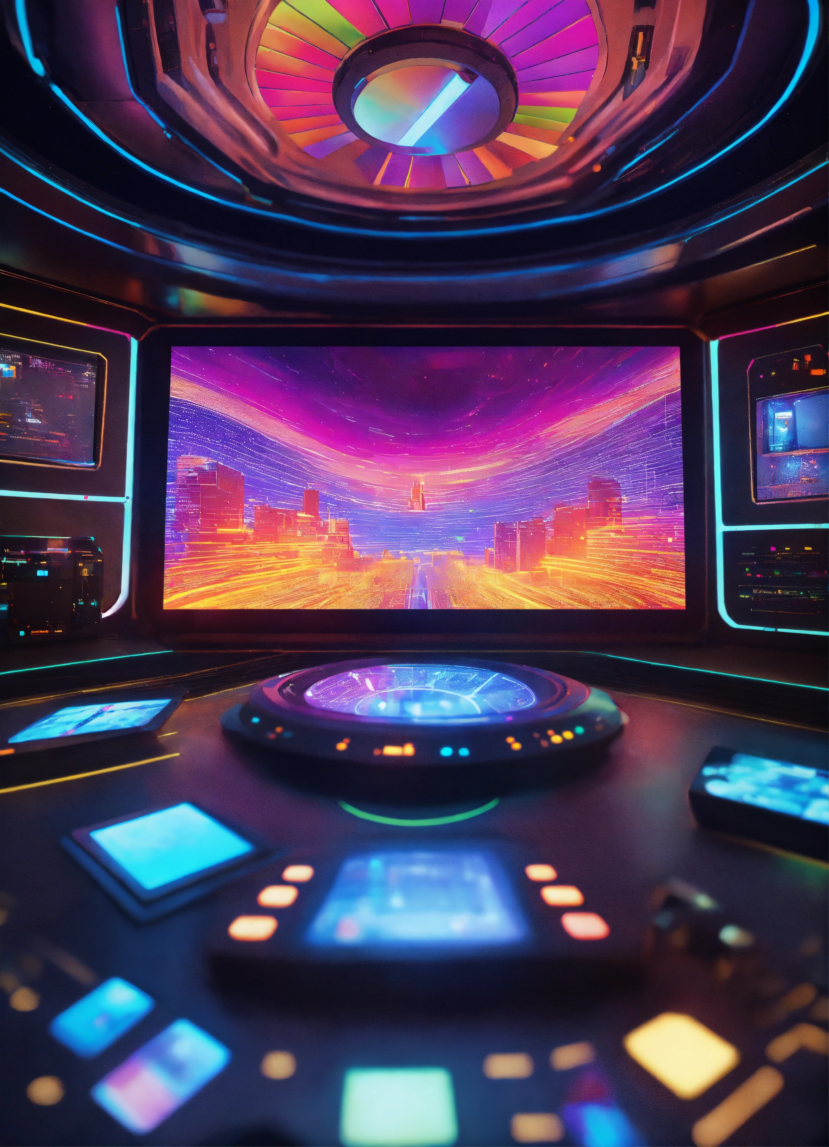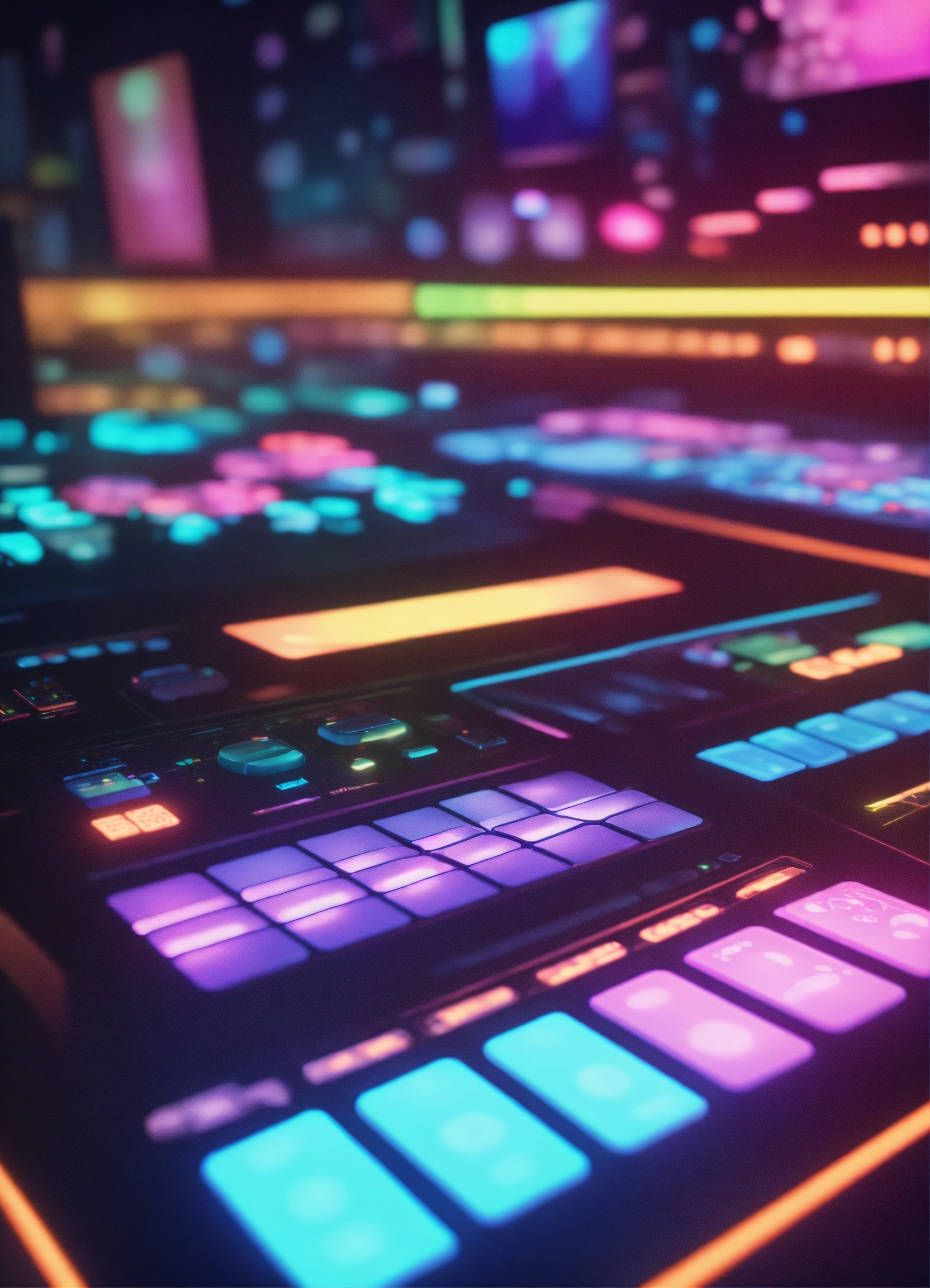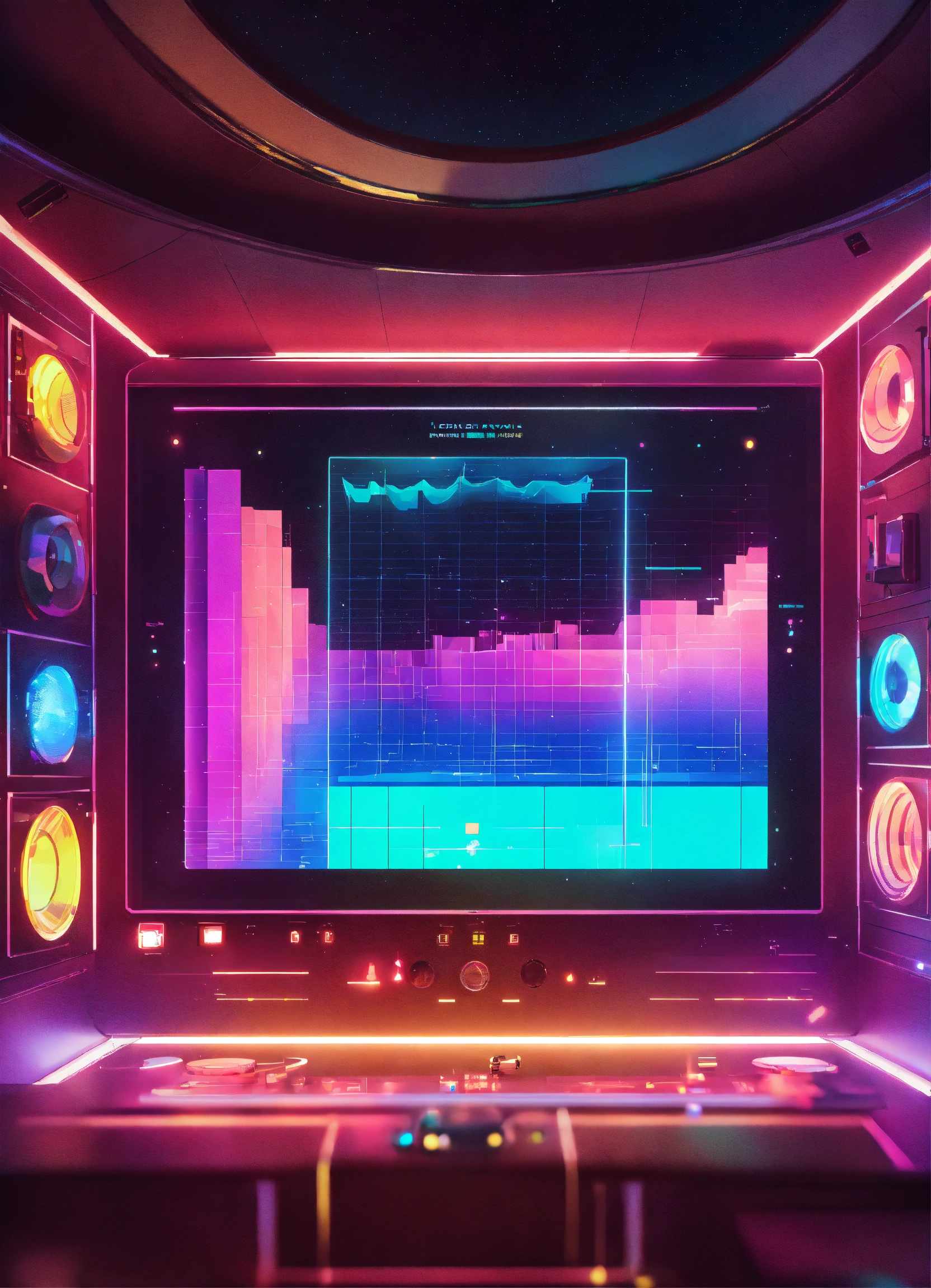 Close up of 1 big screen in the center of a bunch of big colorful square lighted buttons, on the screen is abstract sound waveform that is the voice of the luxurious space yacht, realistic, futuristic, sci fi, 8k, unreal engine, analog controls, cartoon, pixar, disney