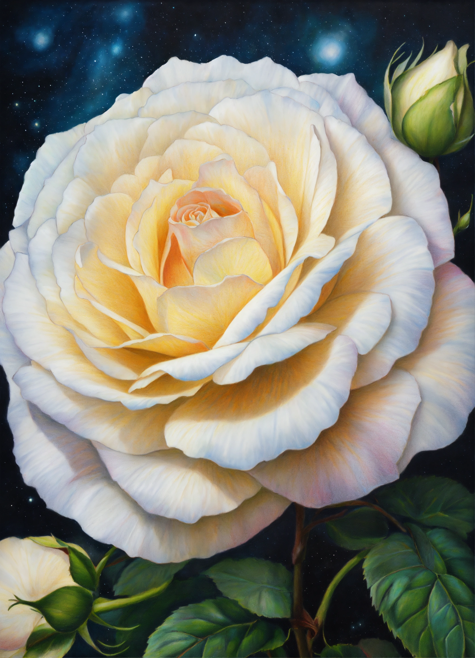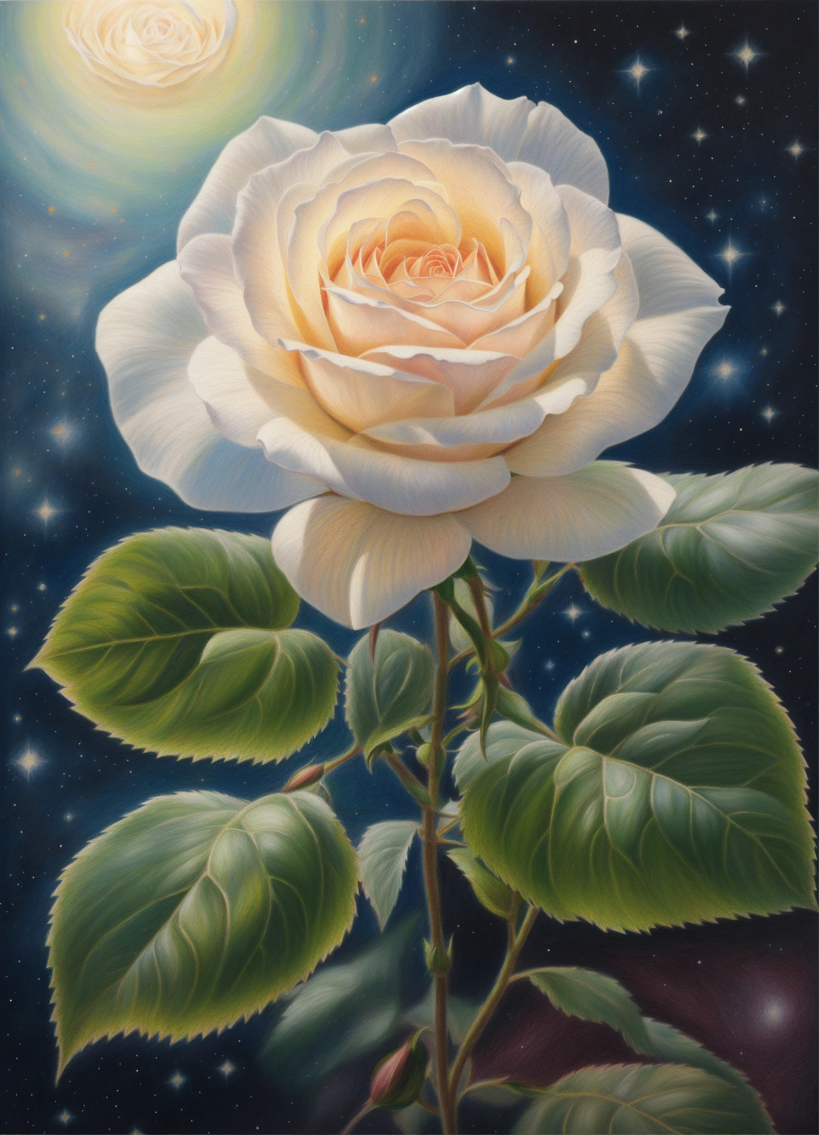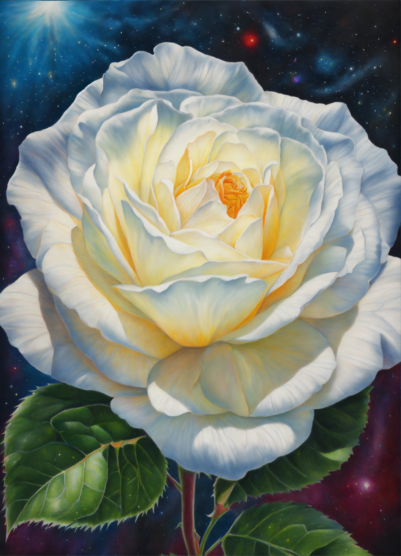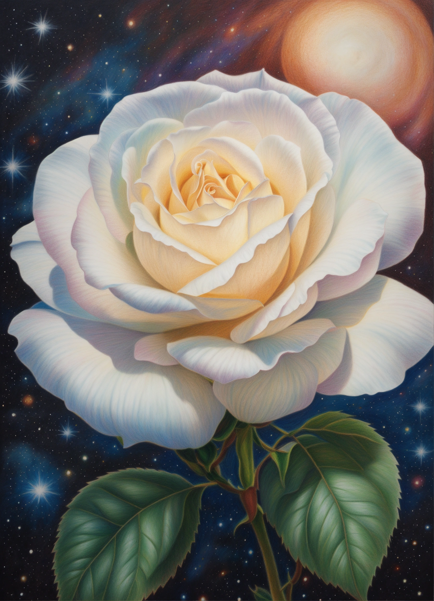 Realistic colored pencil drawing of a large white rose at the level of the navel, universe background, spiritual art