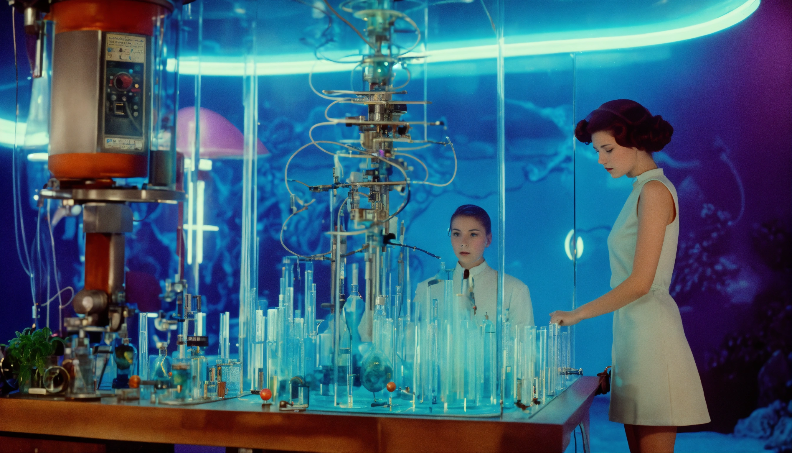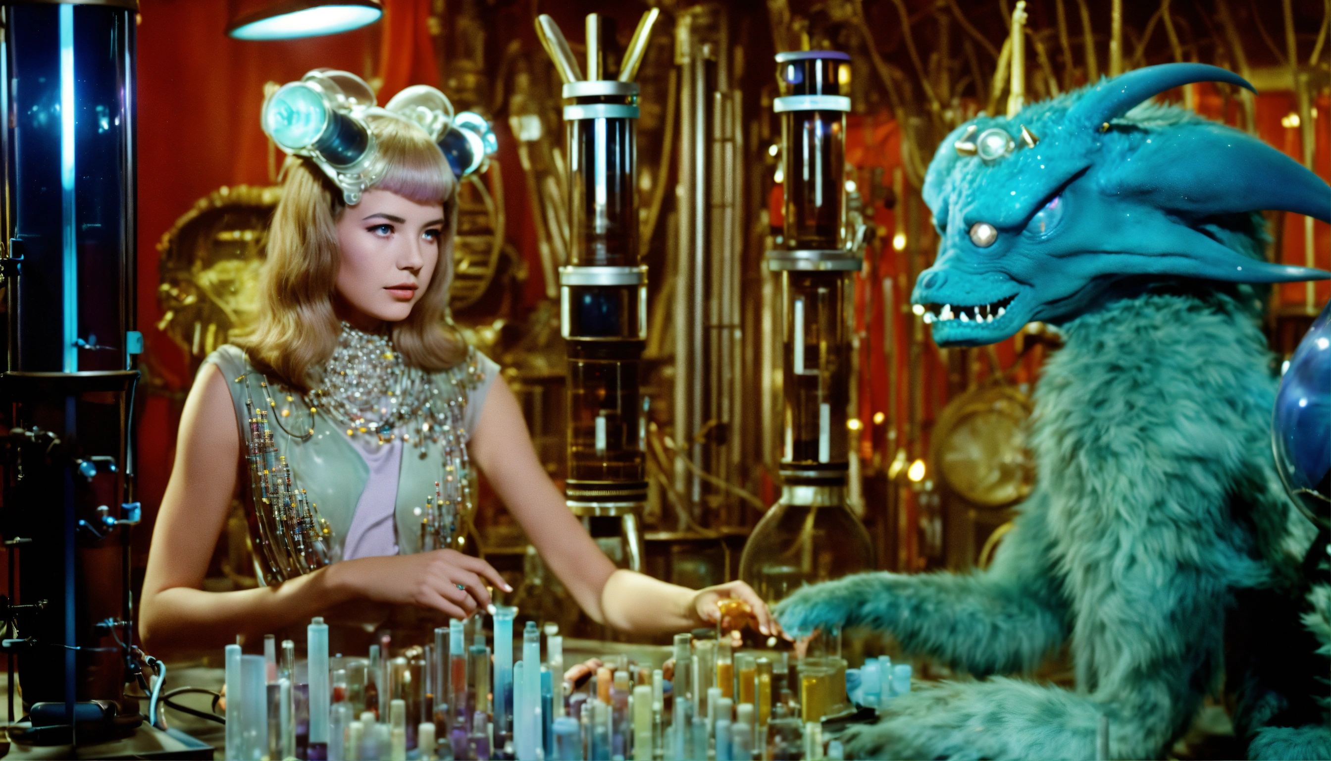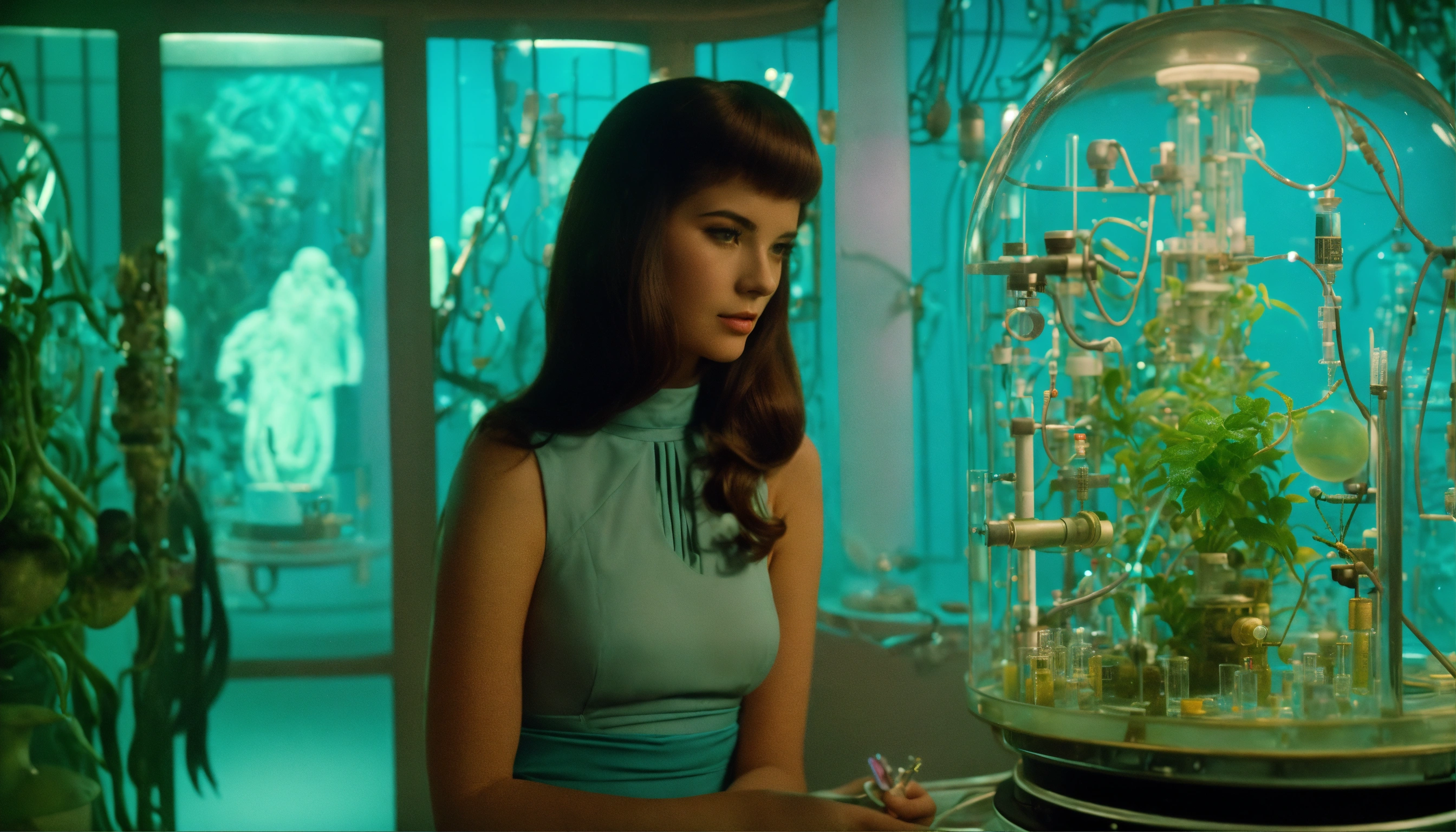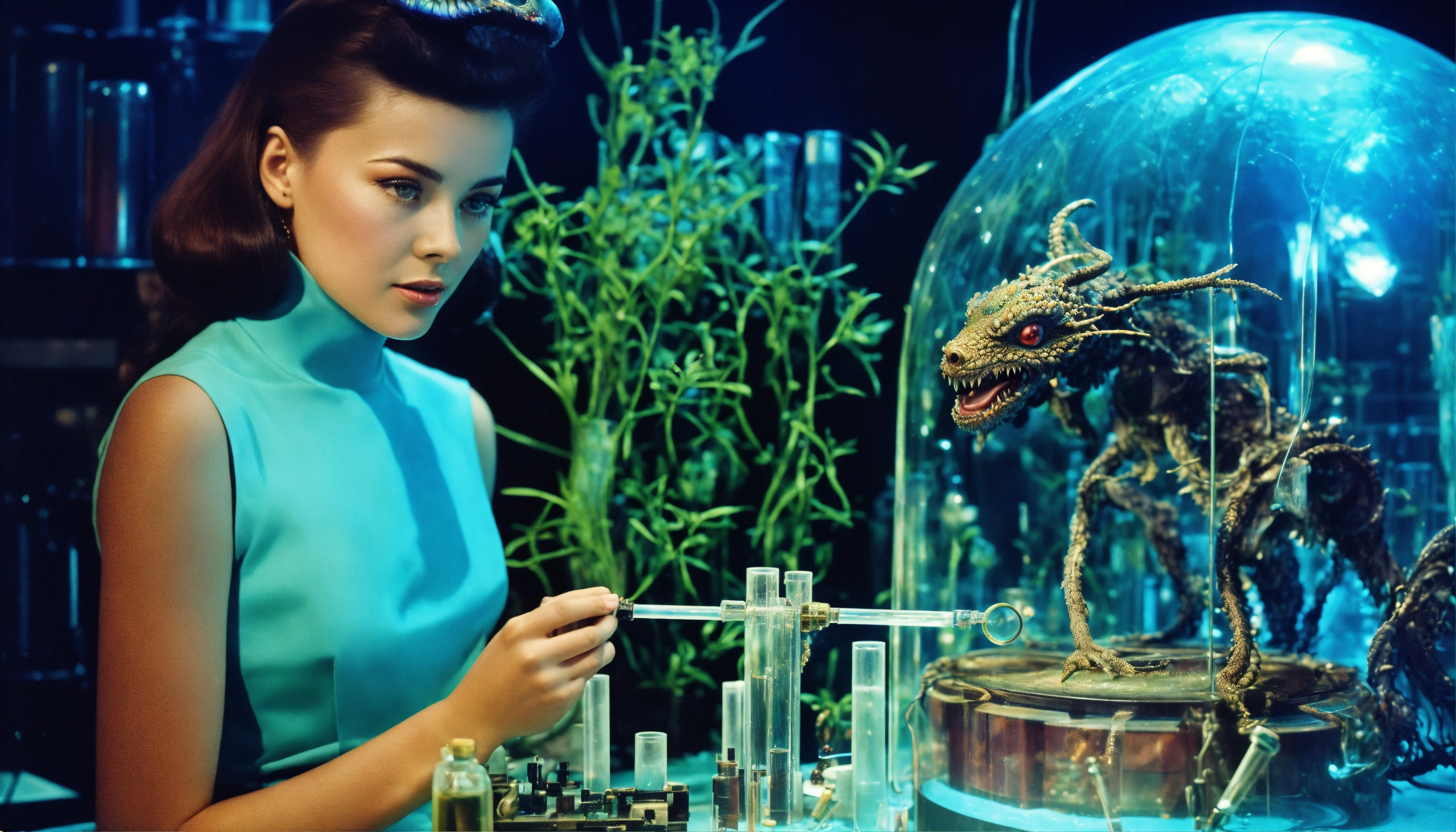 1964, old photography, kodak film colour, surreal sci fi, old film, unknown beautiful 16 years old futuristic fortune teller lady with a big unknown fantasy beast monster, futuristic glass lab with myriad of research instruments, a myriad of futuristic test tubes, pale cyan blue and pale purple, regenerative plants and ai and big unknown magic beast
