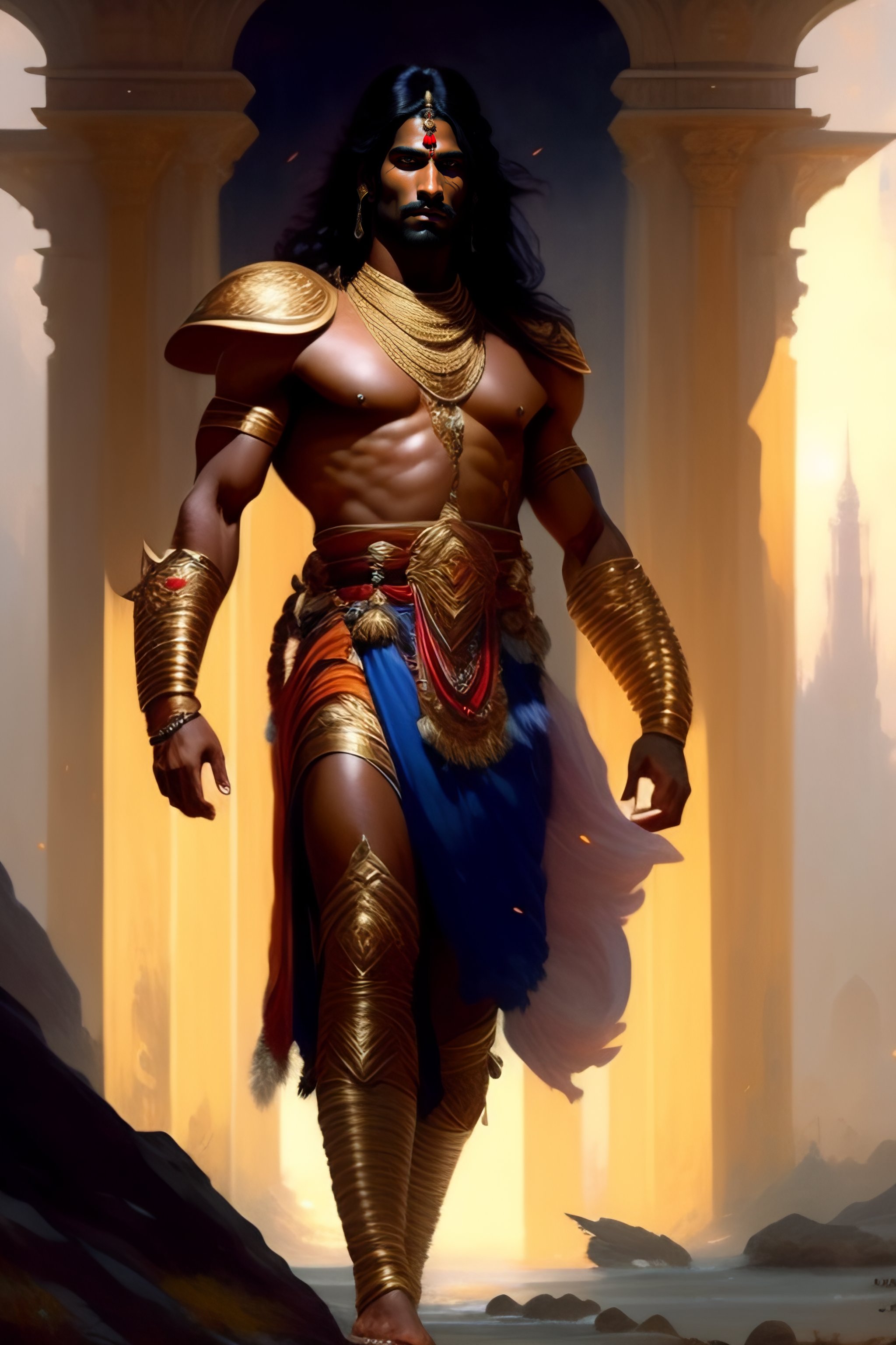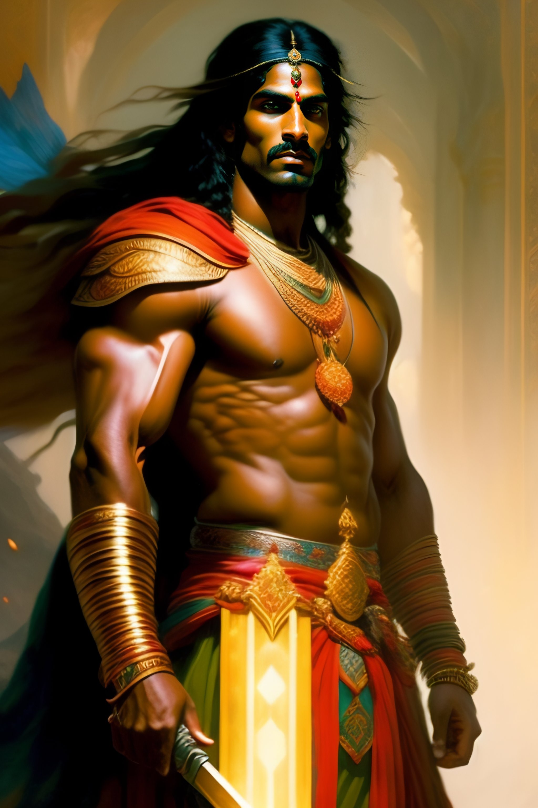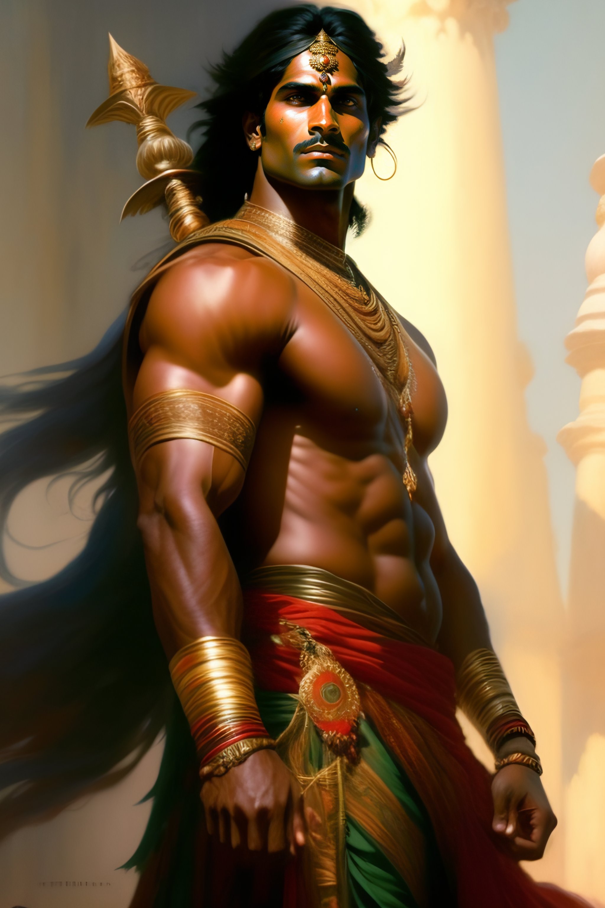 Foll body potrait of mahabharata( indian epic) character arjuna was known as for handsome appearance and was considered one of the most physically attractive characters in the epic. he was tall and well-built, with a strong and muscular physique. it is said that he was as radiant as the sun and that his arms were as thick as the trunks of small trees. arjuna was also skilled in various arts and was an accomplished warrior, known for his strength, agility, and bravery on the battlefield, art by greg rutkowski and alphonse mucha