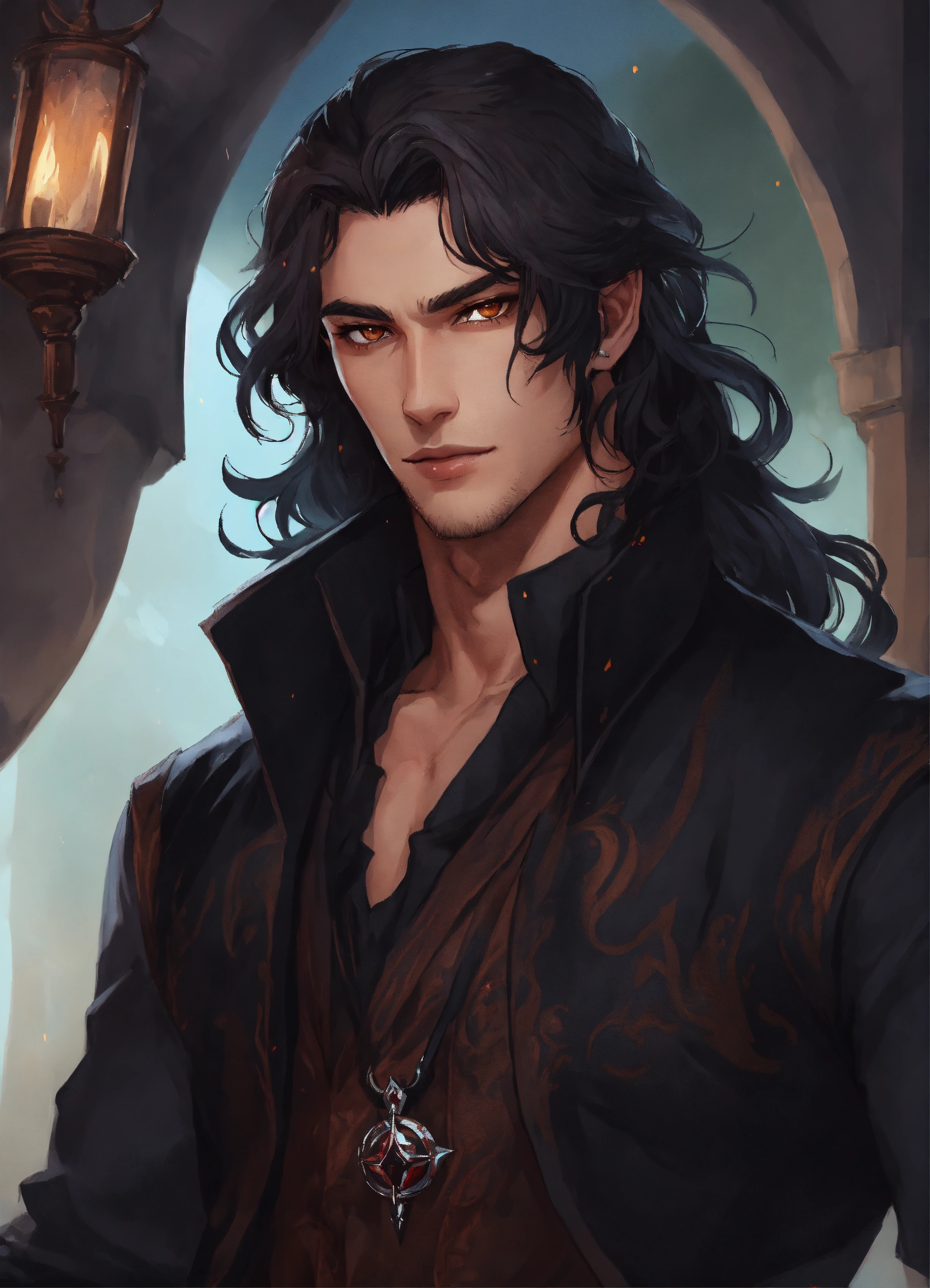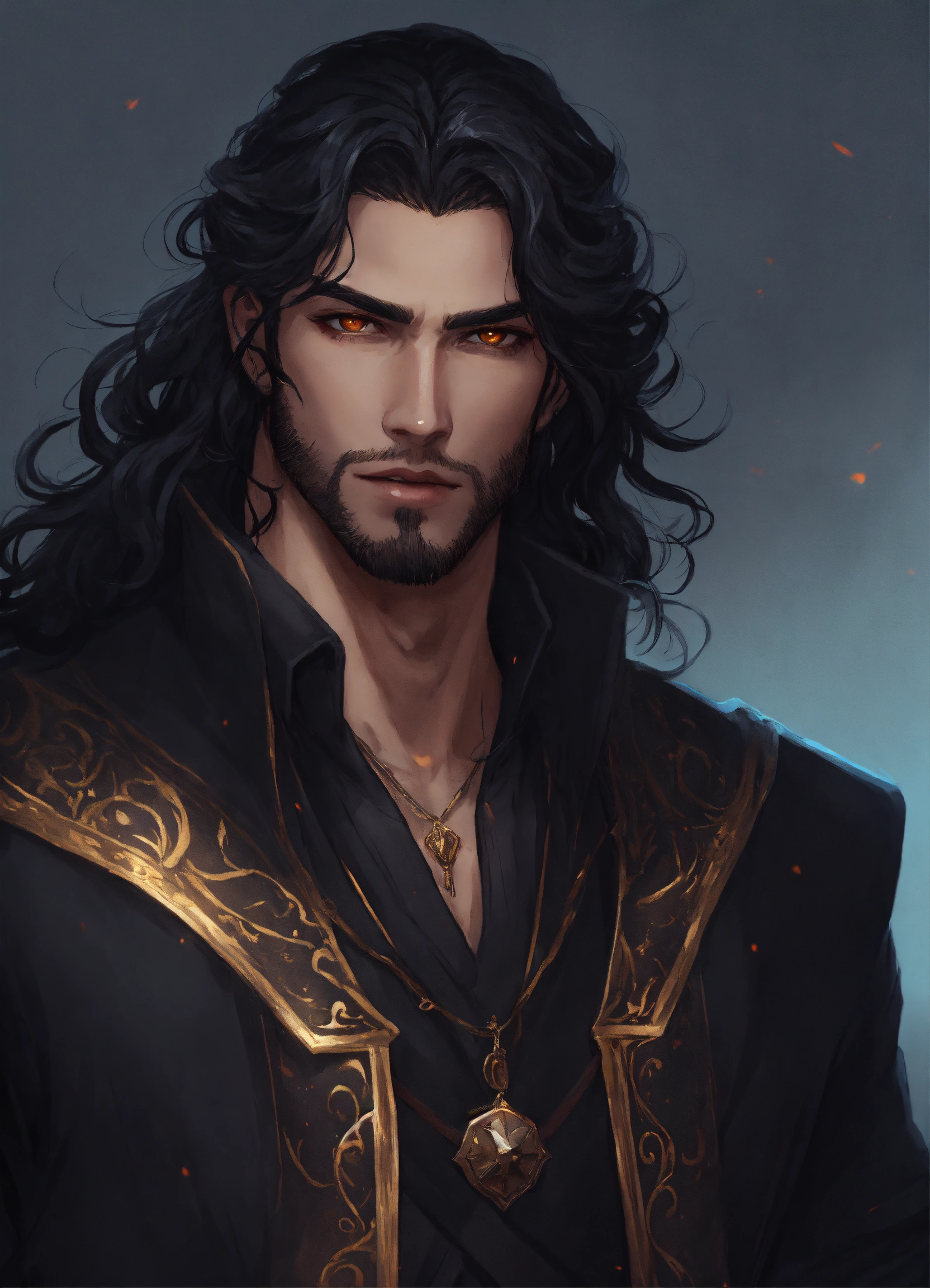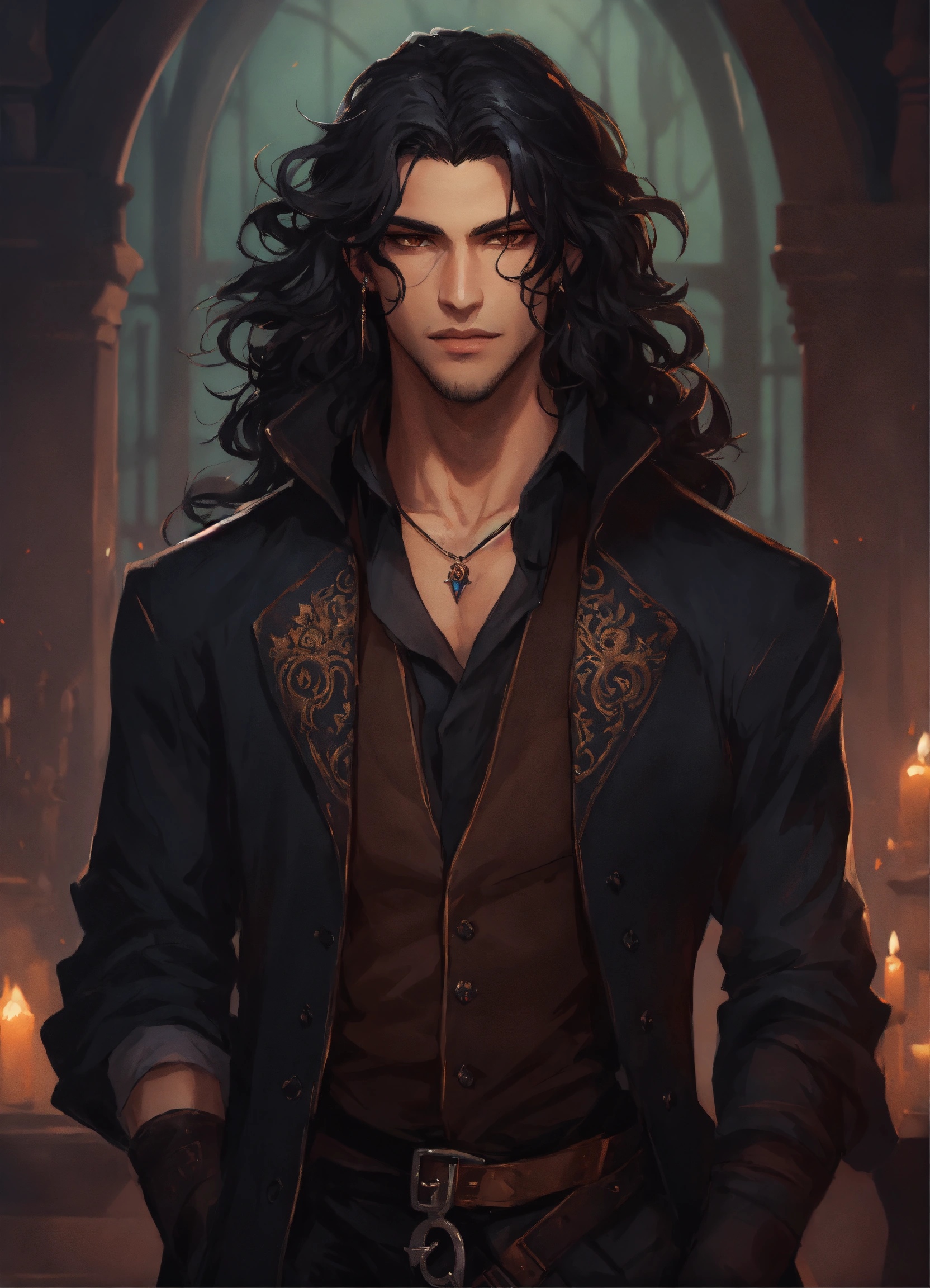A handsome half demon with brown eyes and long wavy black hair wearing dark clothing, charming, dnd character art
