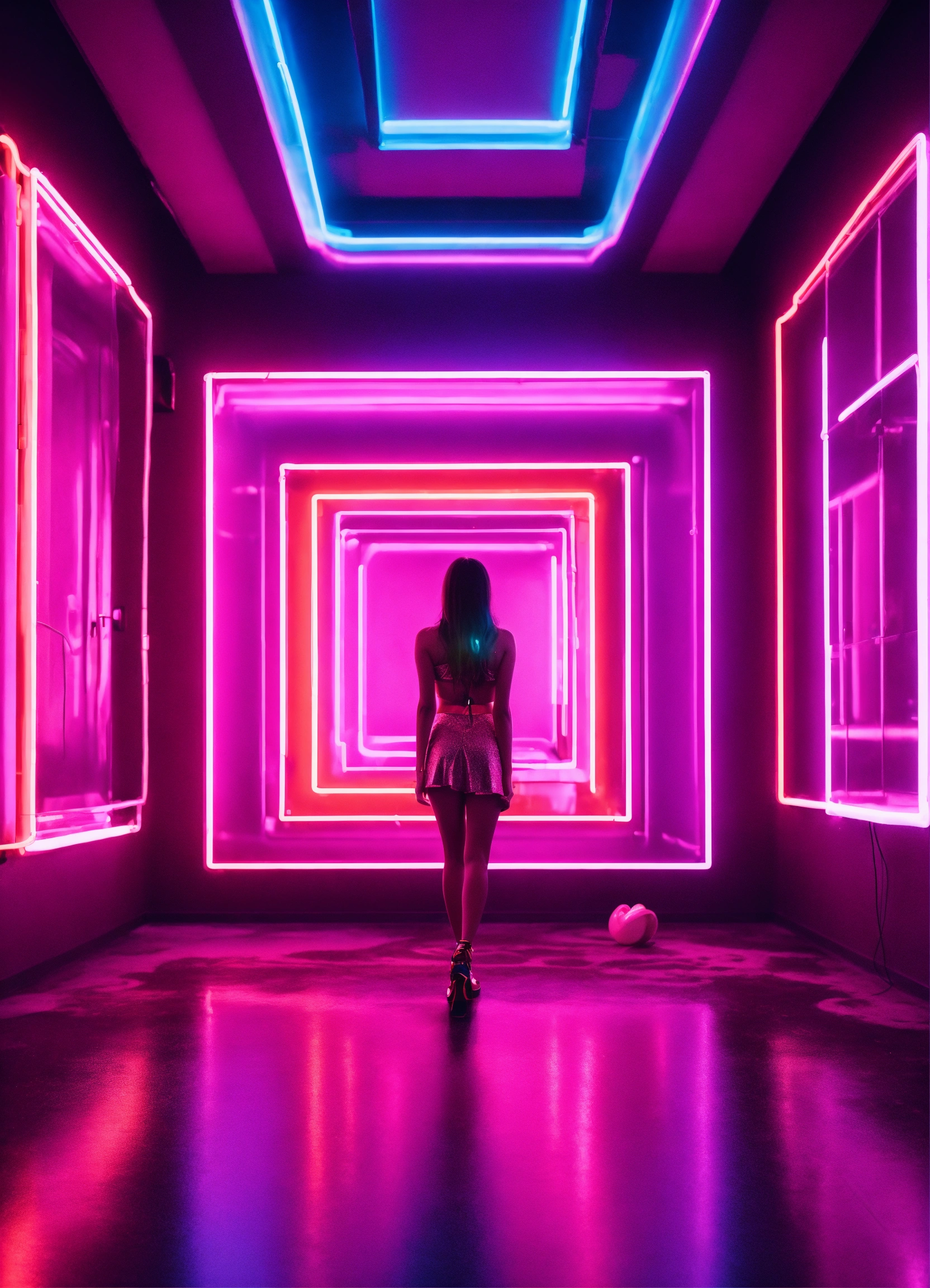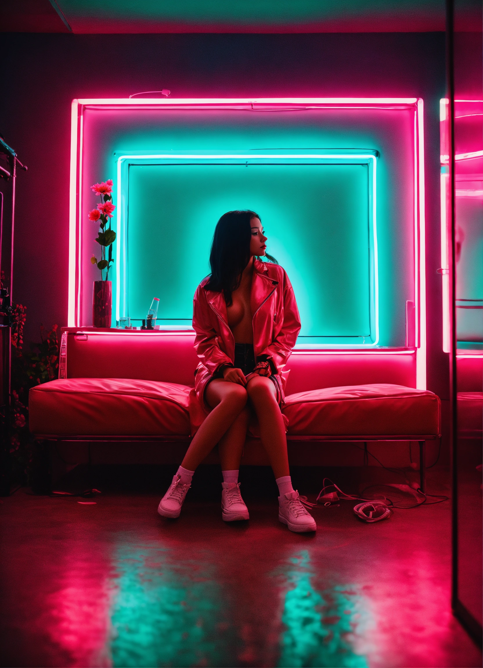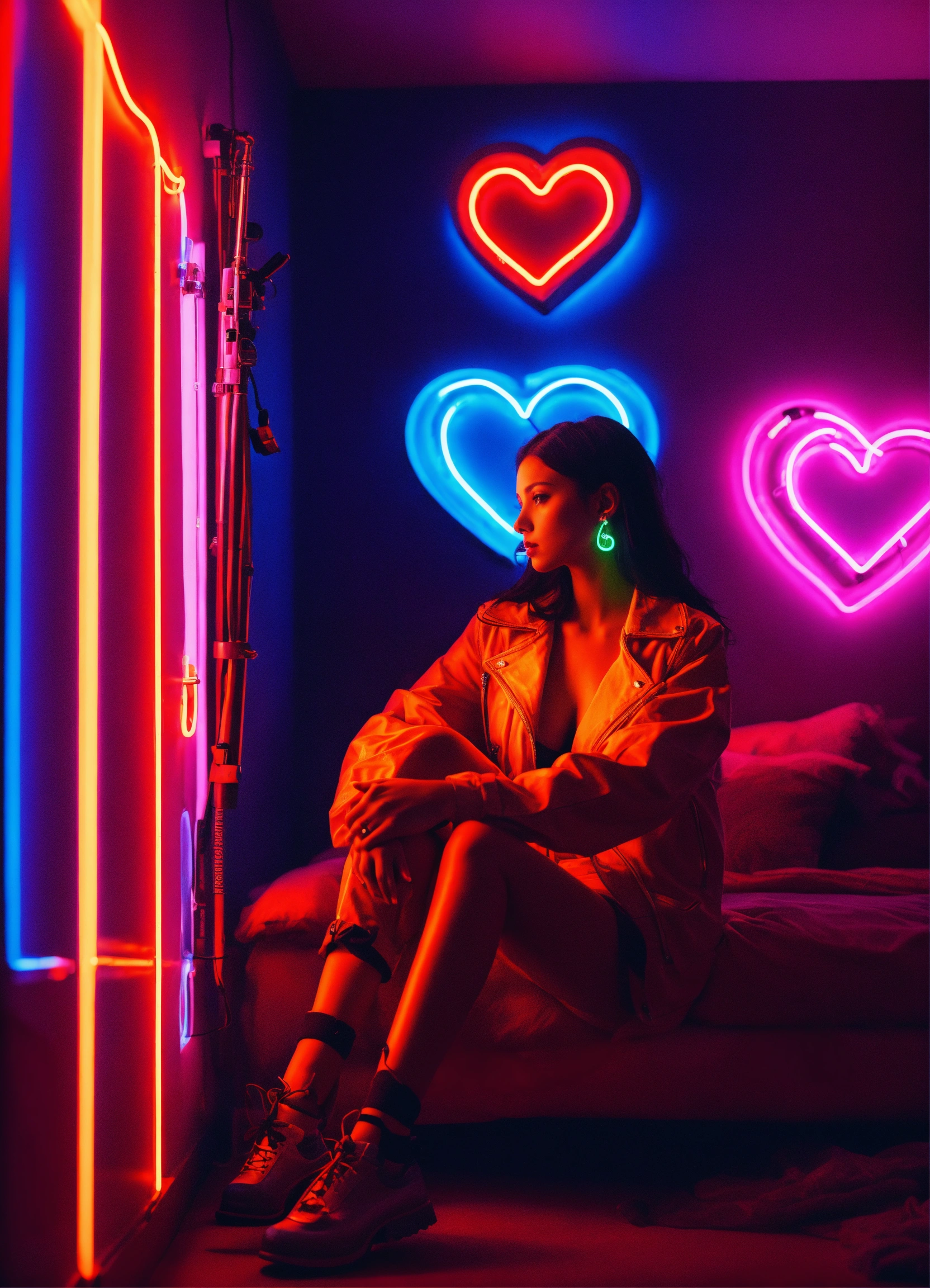 Cinematic photography, modern, mixed female lover in neon hearts room, romantic, proportionate, neon colors details, realistic, ultra 8k resolution