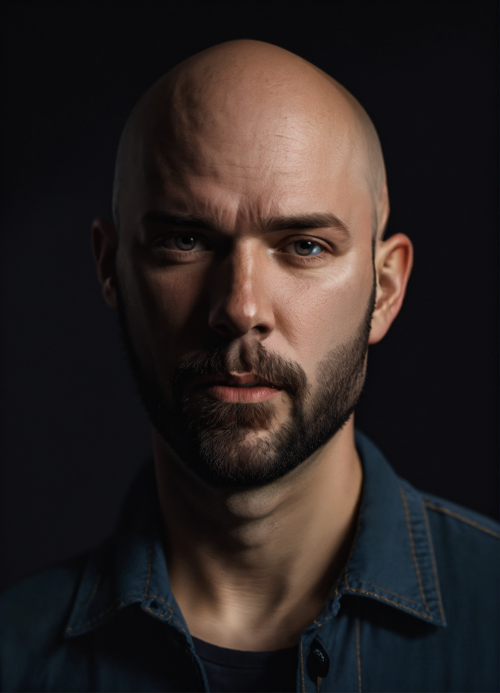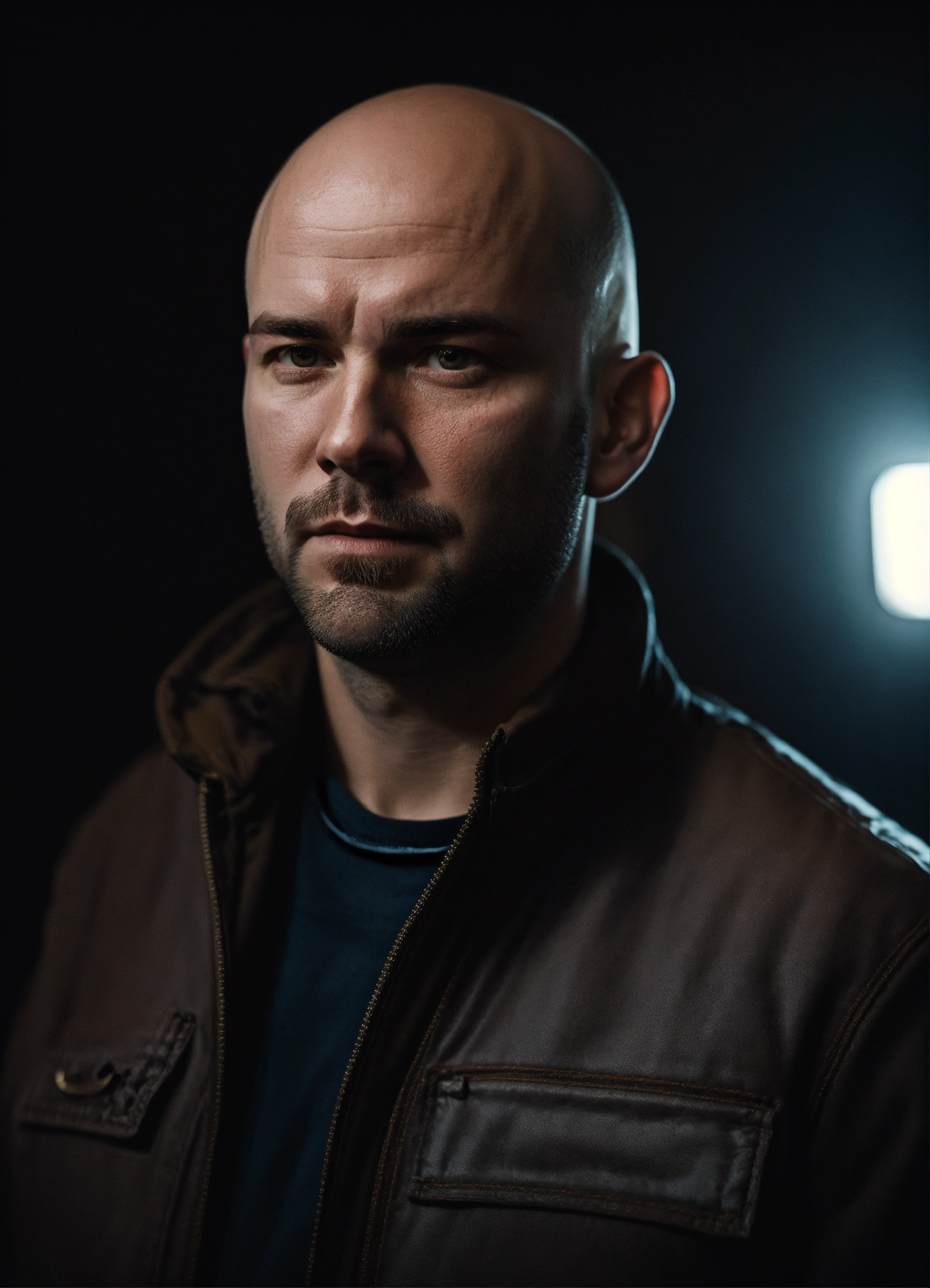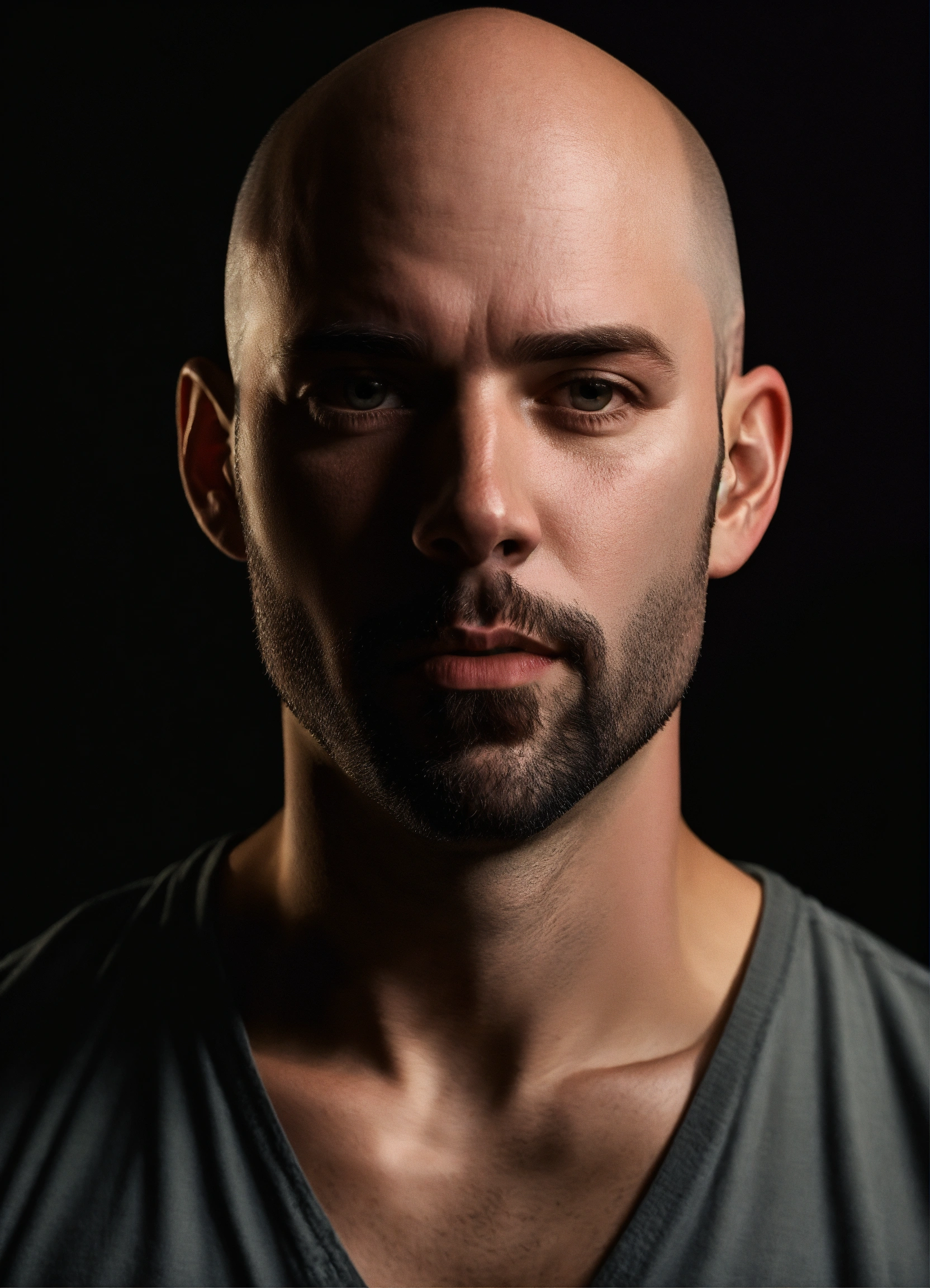 Image of bald andrew tate with stubble, facing at camera, super realistic, high resolution, dark room