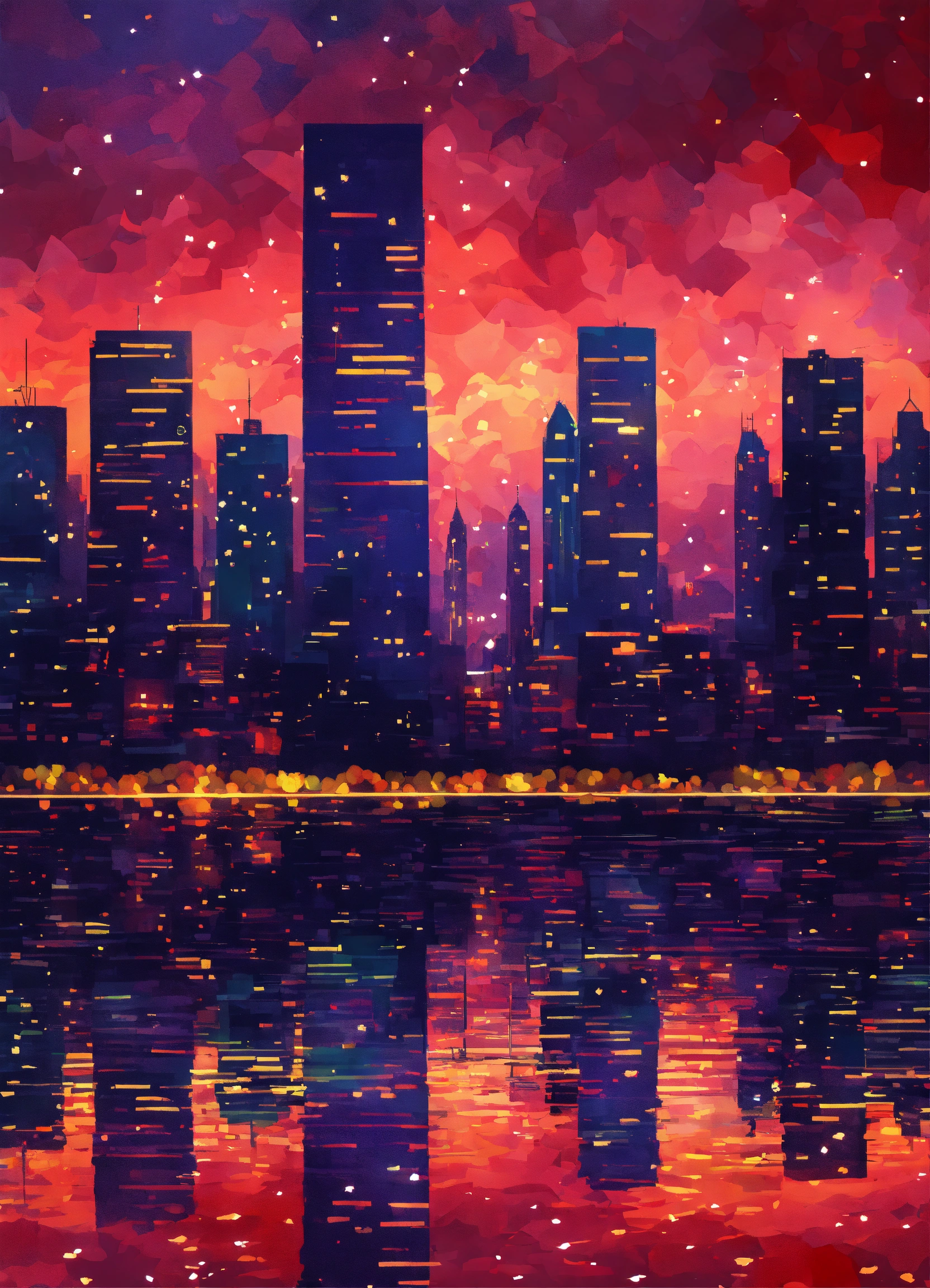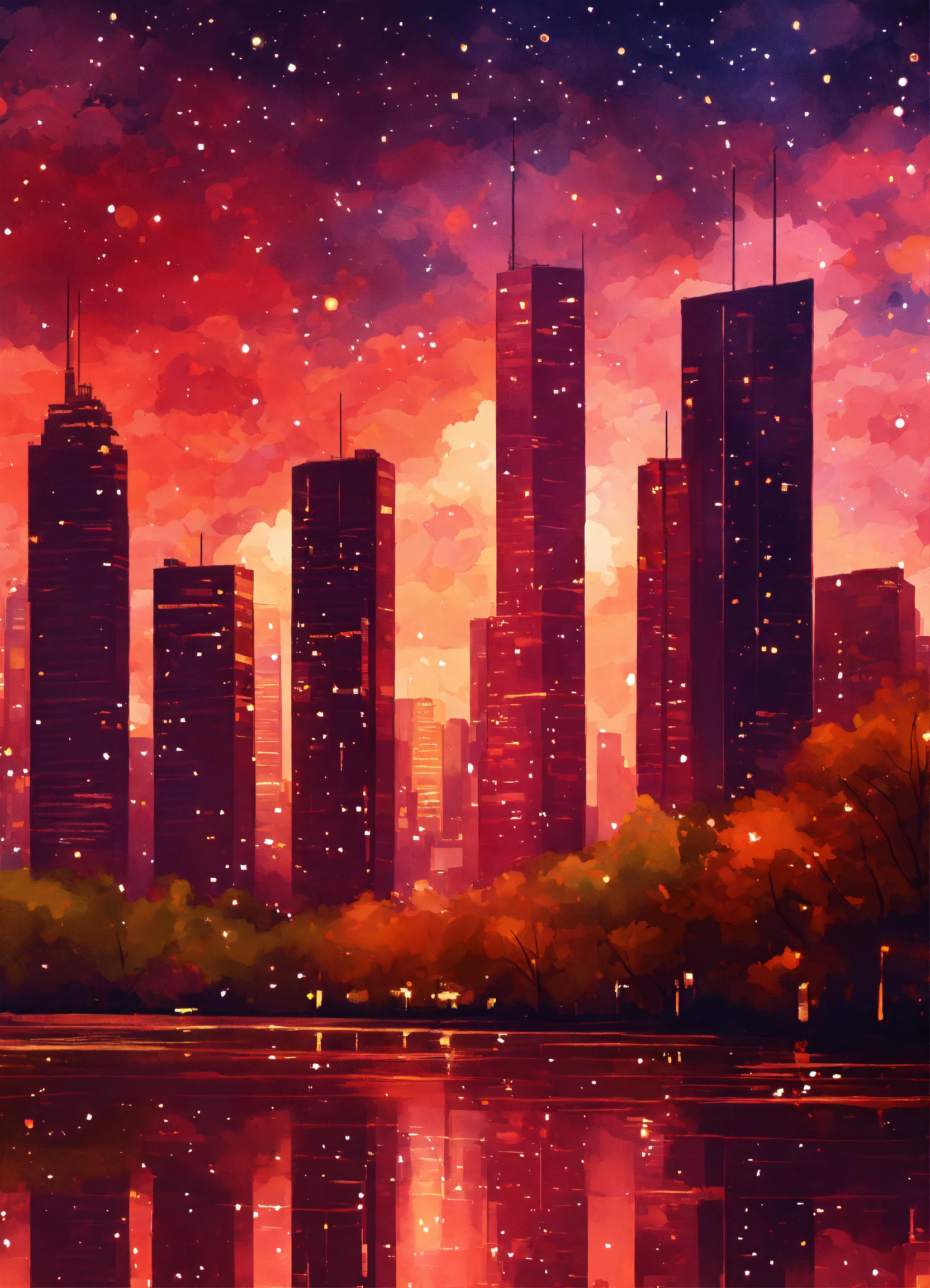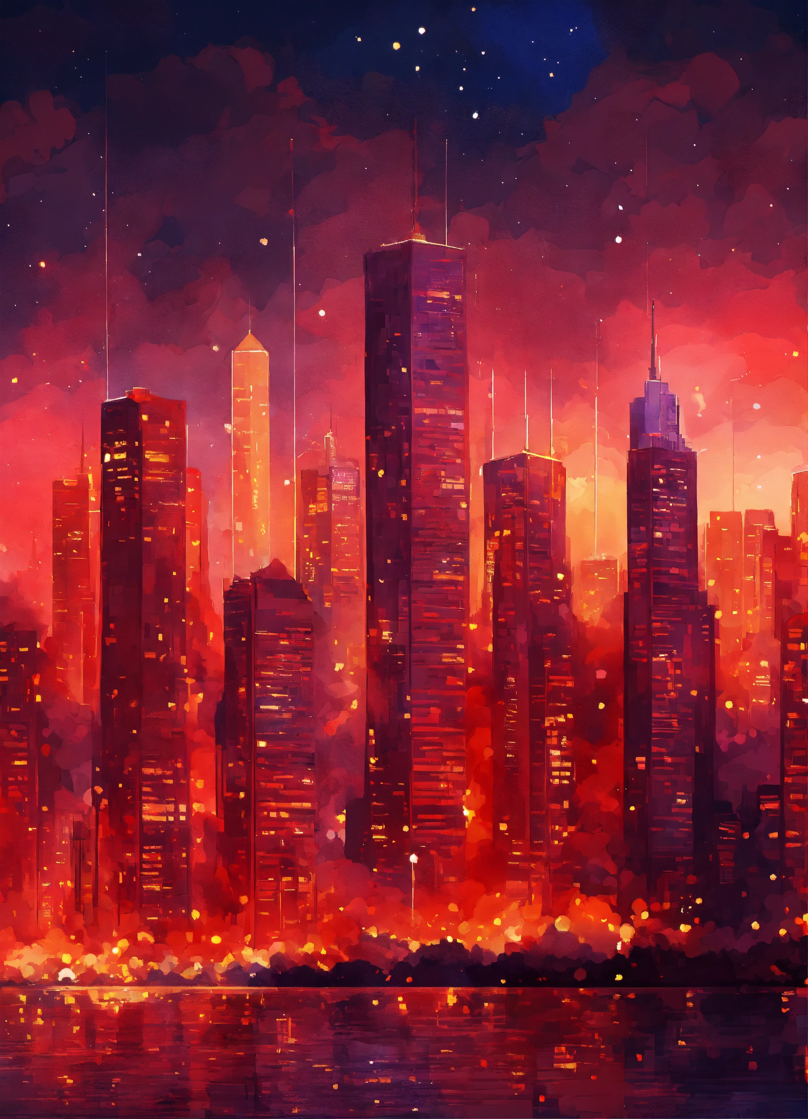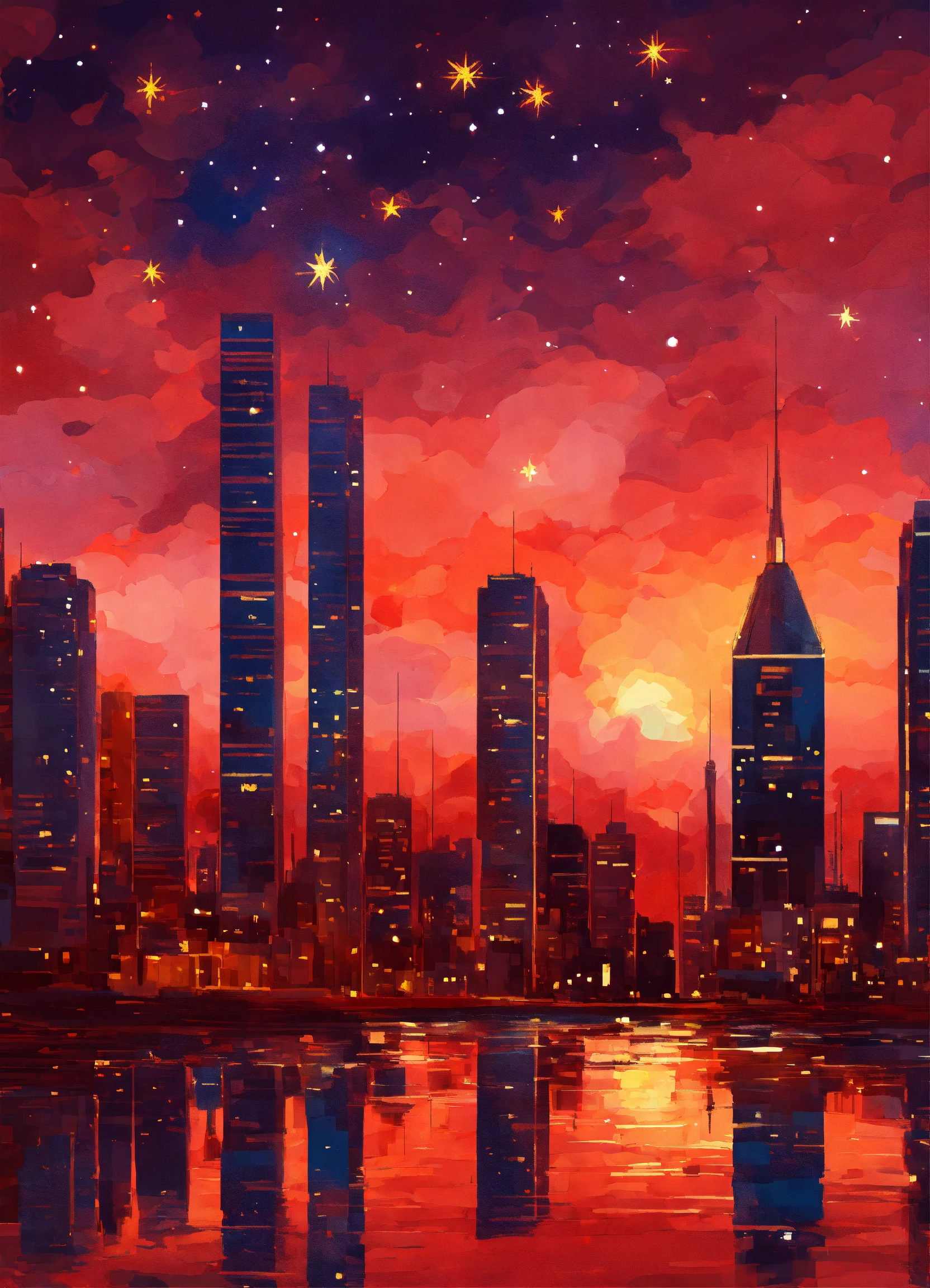 Skyscrapers in the style of impressionism, digital art, star constellations, colors are warm reds, romantic, intricate details.