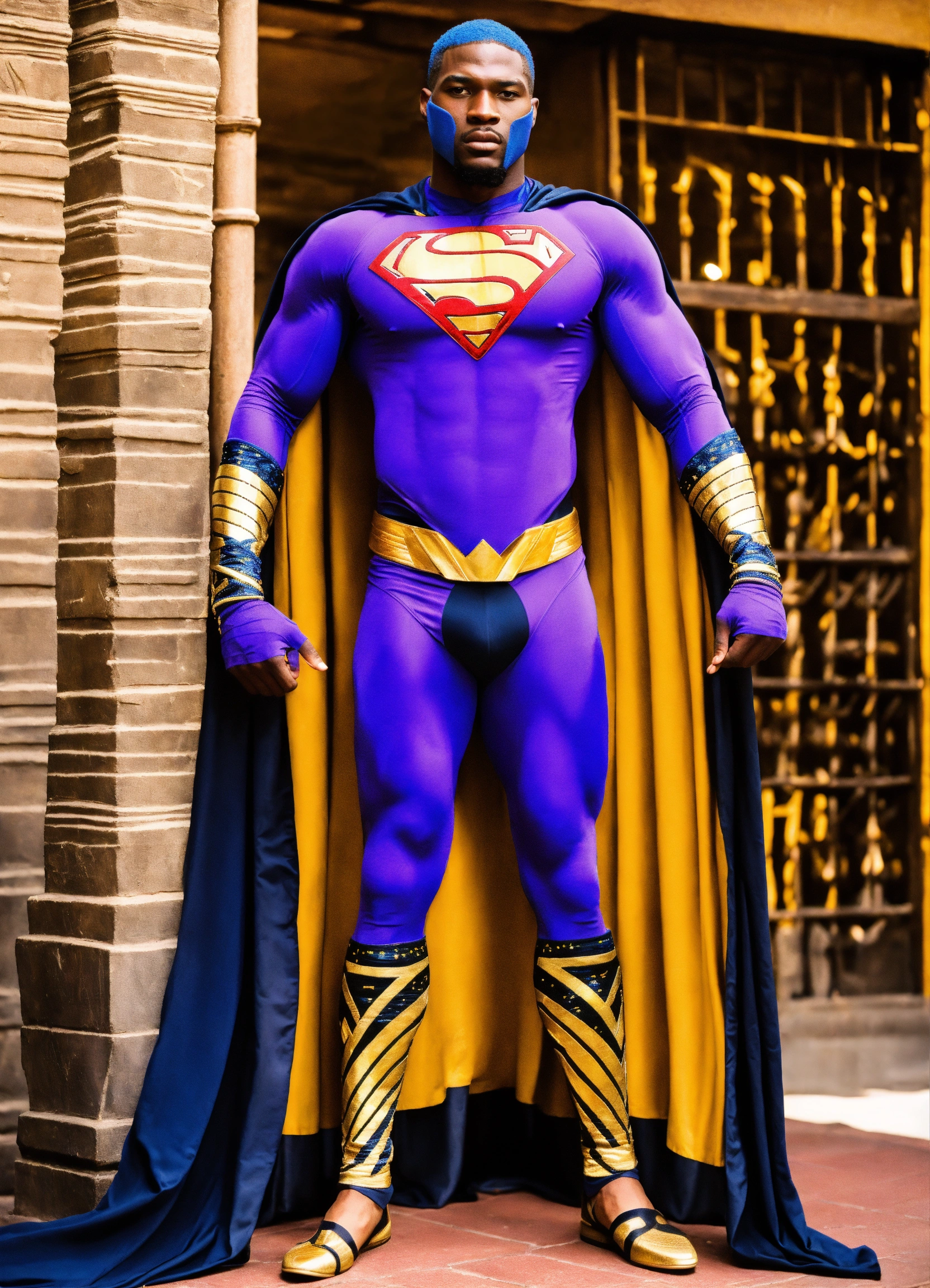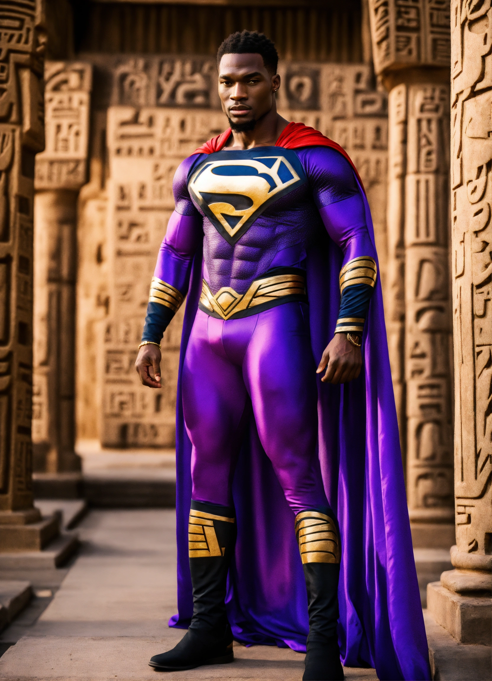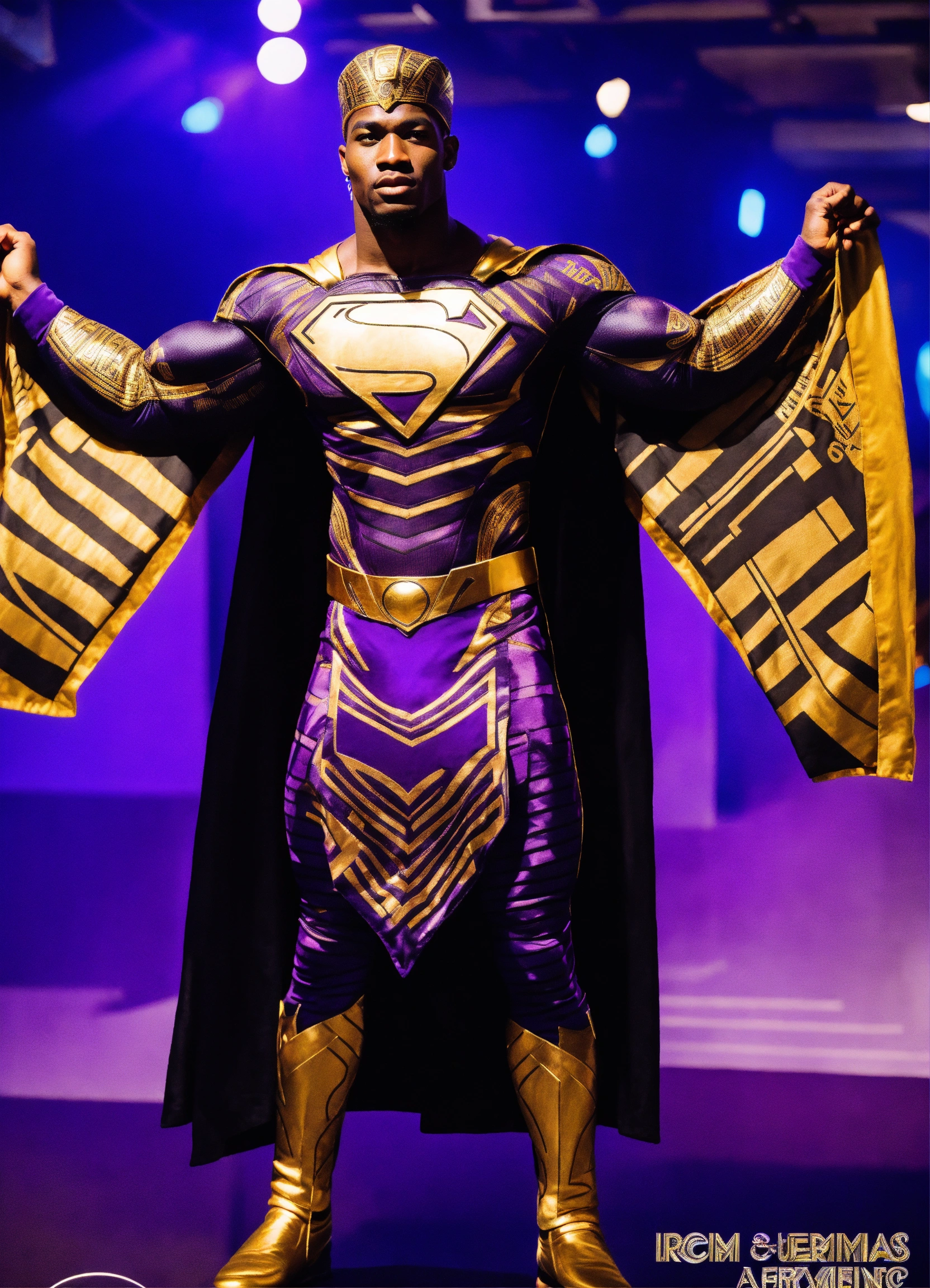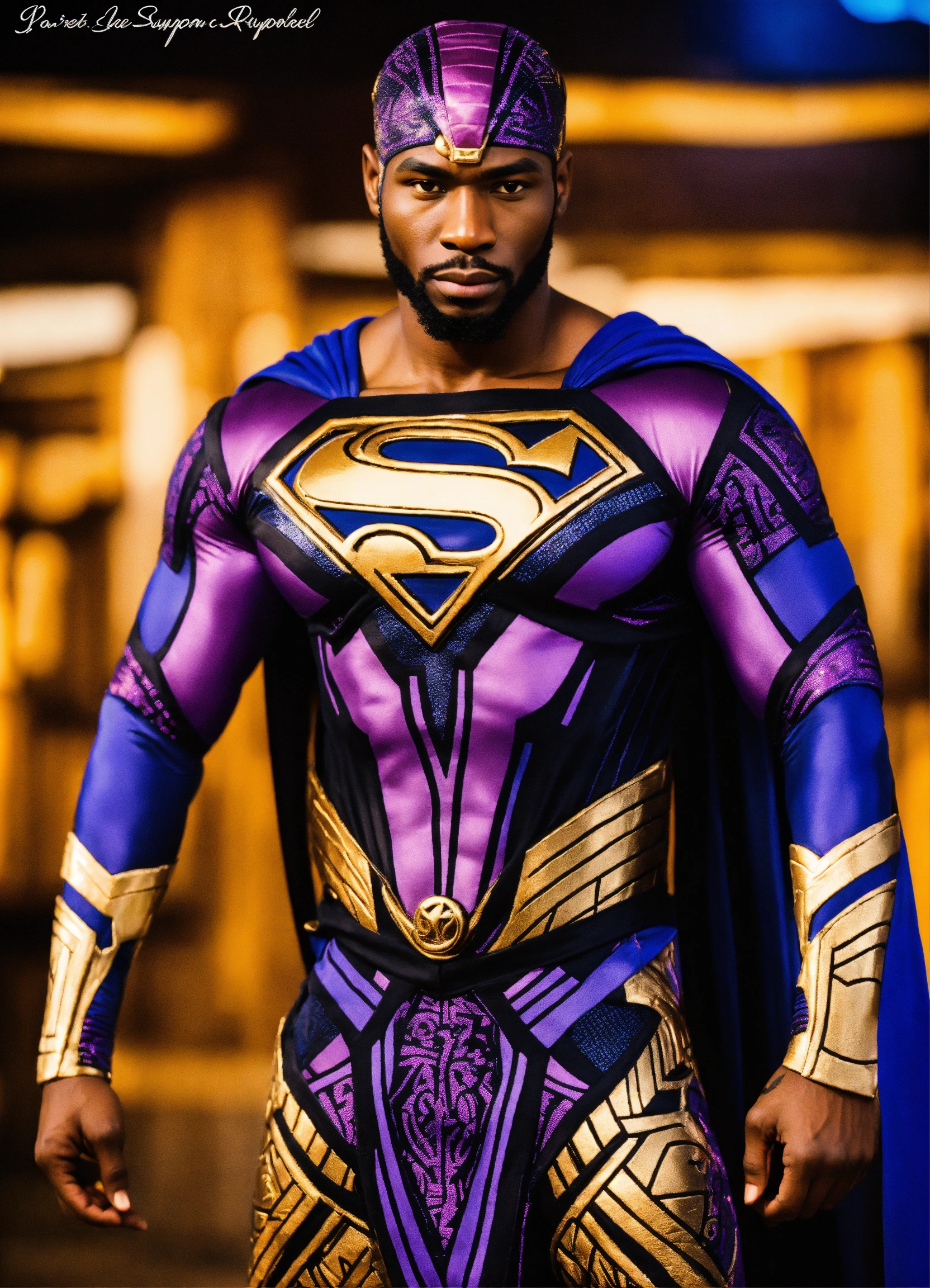 Ultra-detailed purple black & gold hieroglyphics-designed super-advanced muscular african superman costume