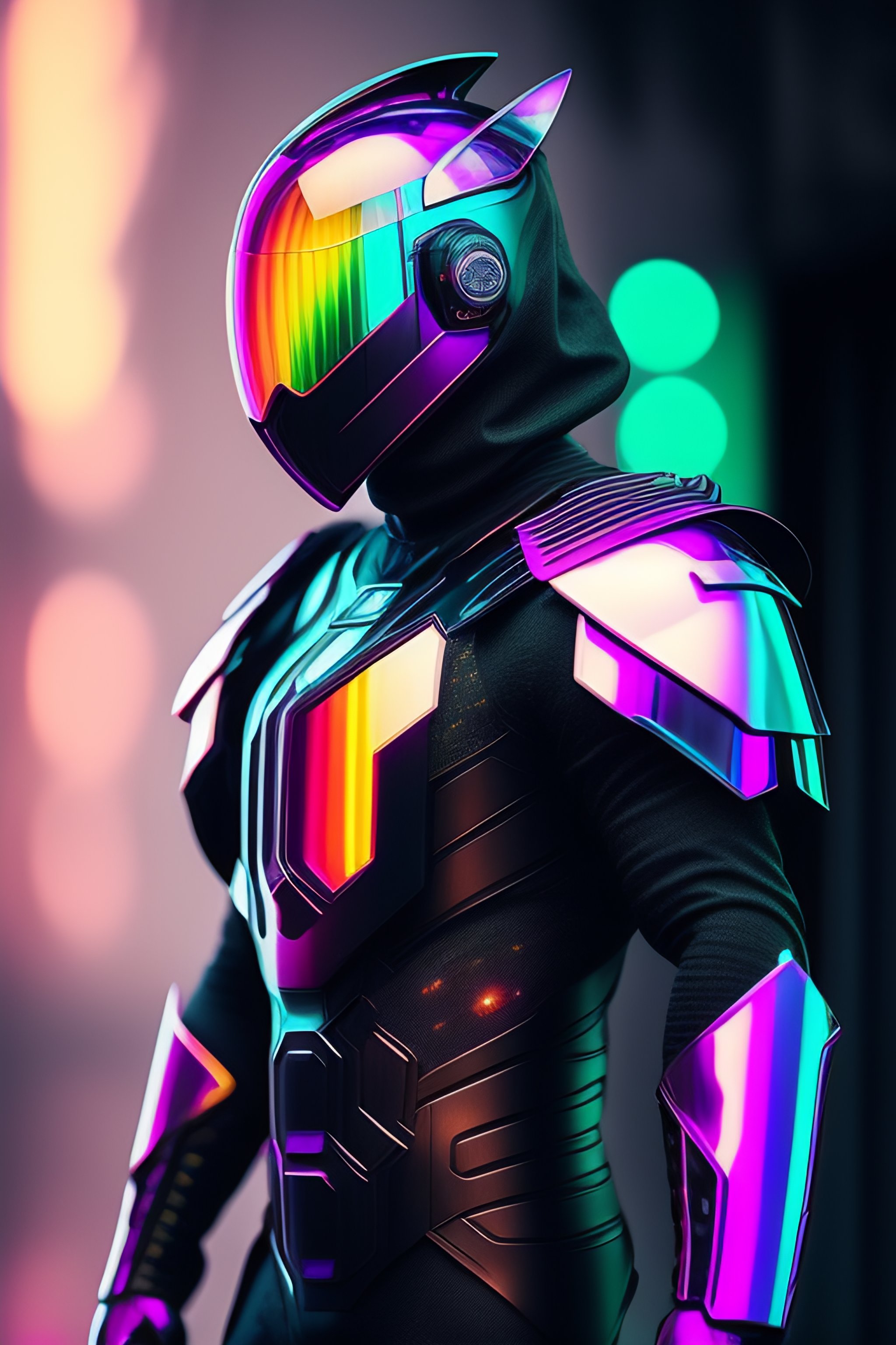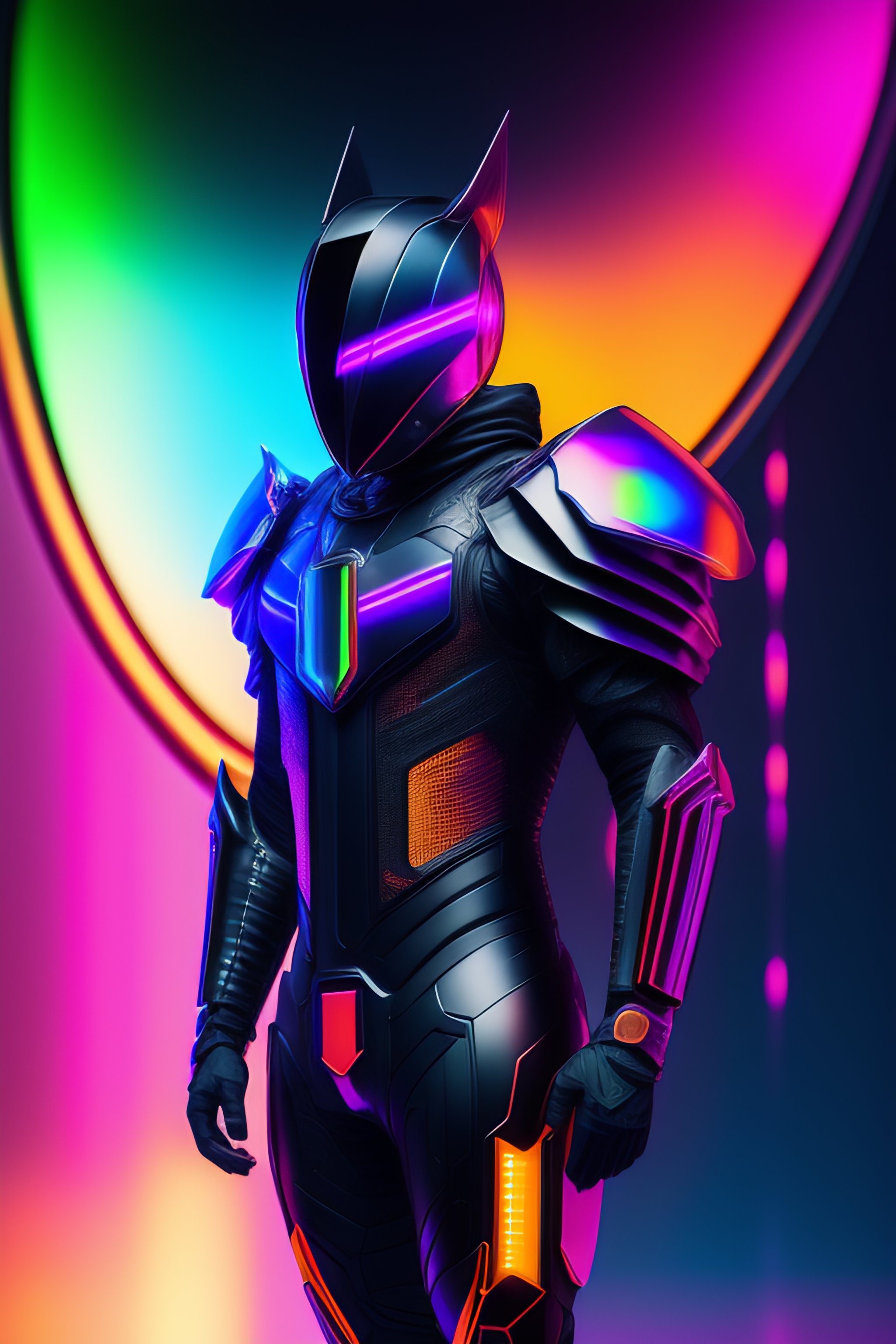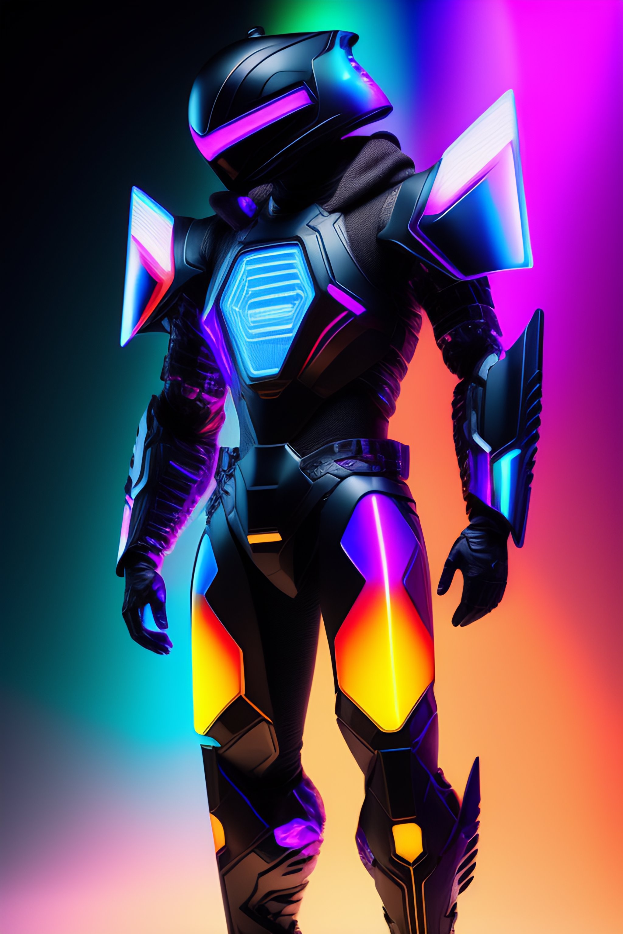 Armadura de cuerpo entero, cyberpunk hecha de titanio negro y algo de cristal, rgb leds arco iris, traje de poder, degradado, cristal, cables visibles y microchip, holograma, torso transparente cristalino, imponente, elegante, para hombres, minimalismo moderno, líneas de polietileno bajo, núcleo glitch, soñador, colorido, distopía, divino, misterioso