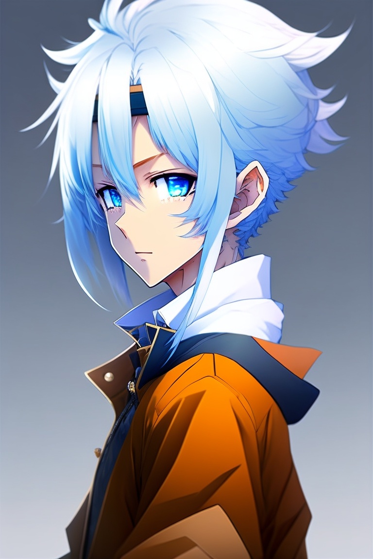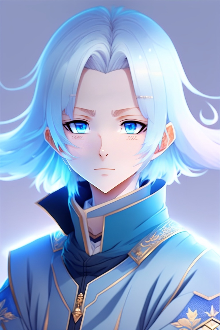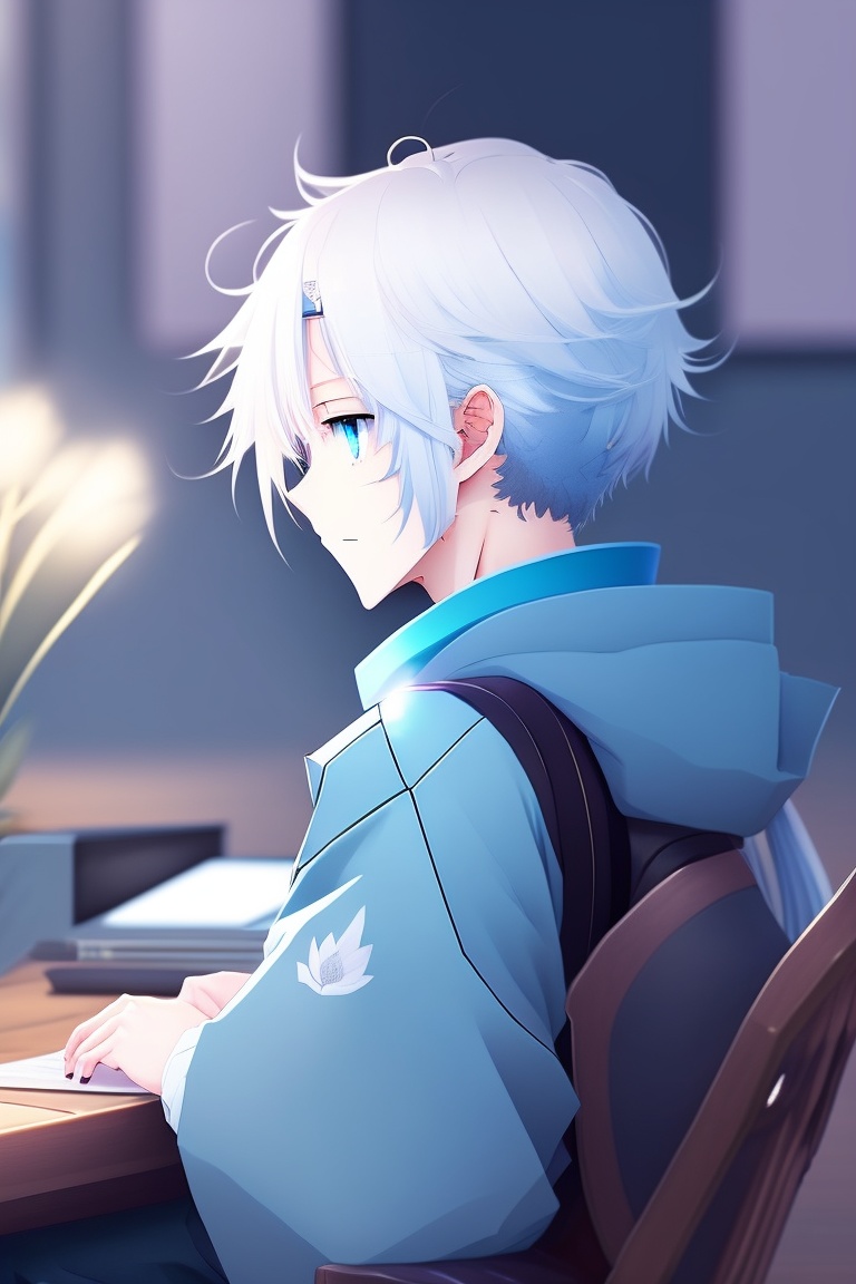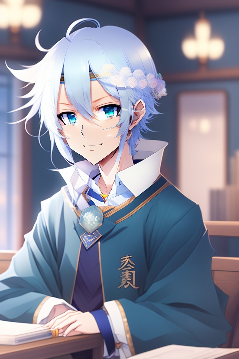 Animeboy, anime, quiet boy, has the power of ice, white hair, ice blue eyes, in class alone, japanese style