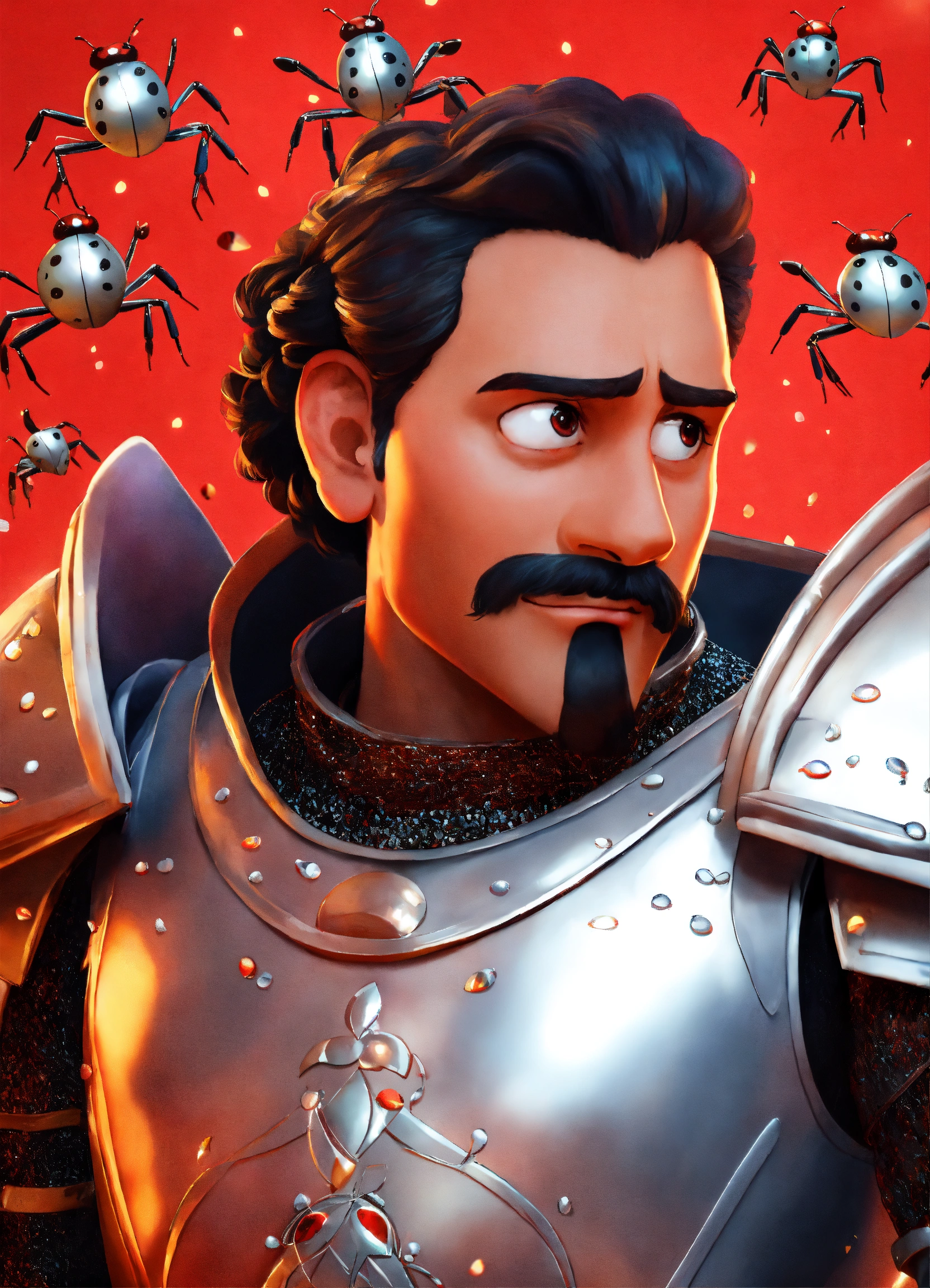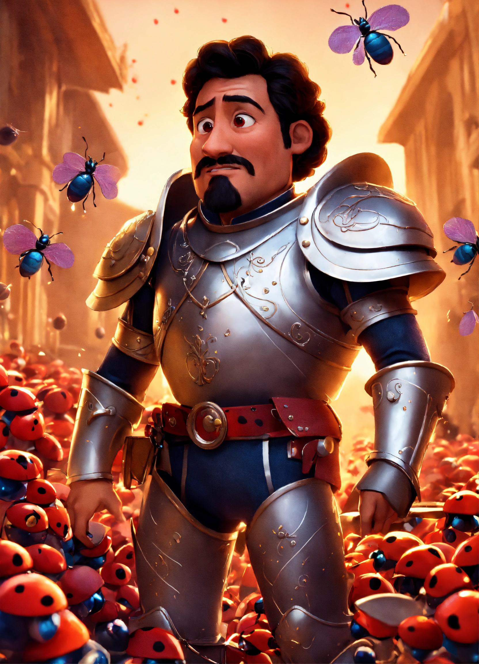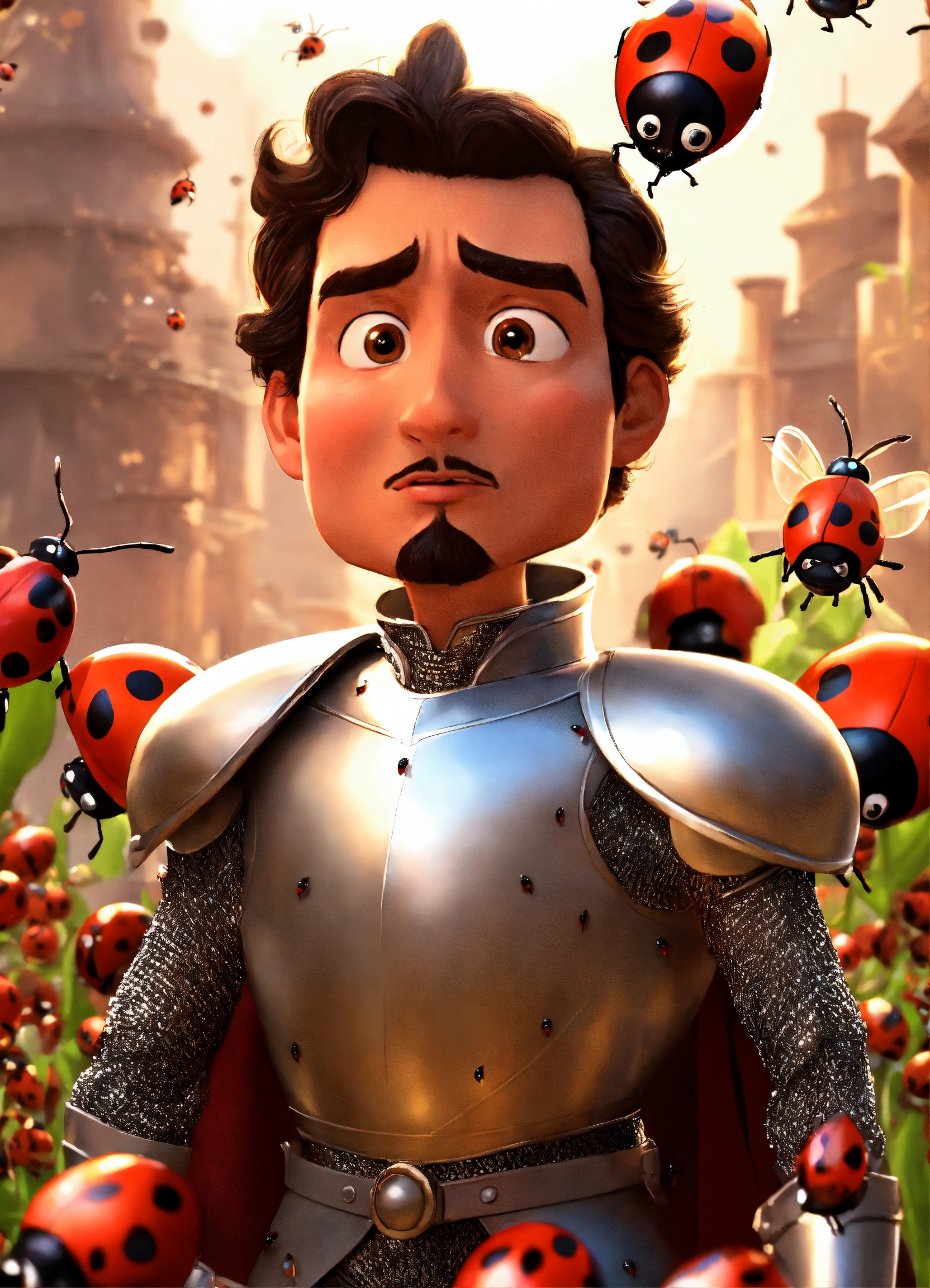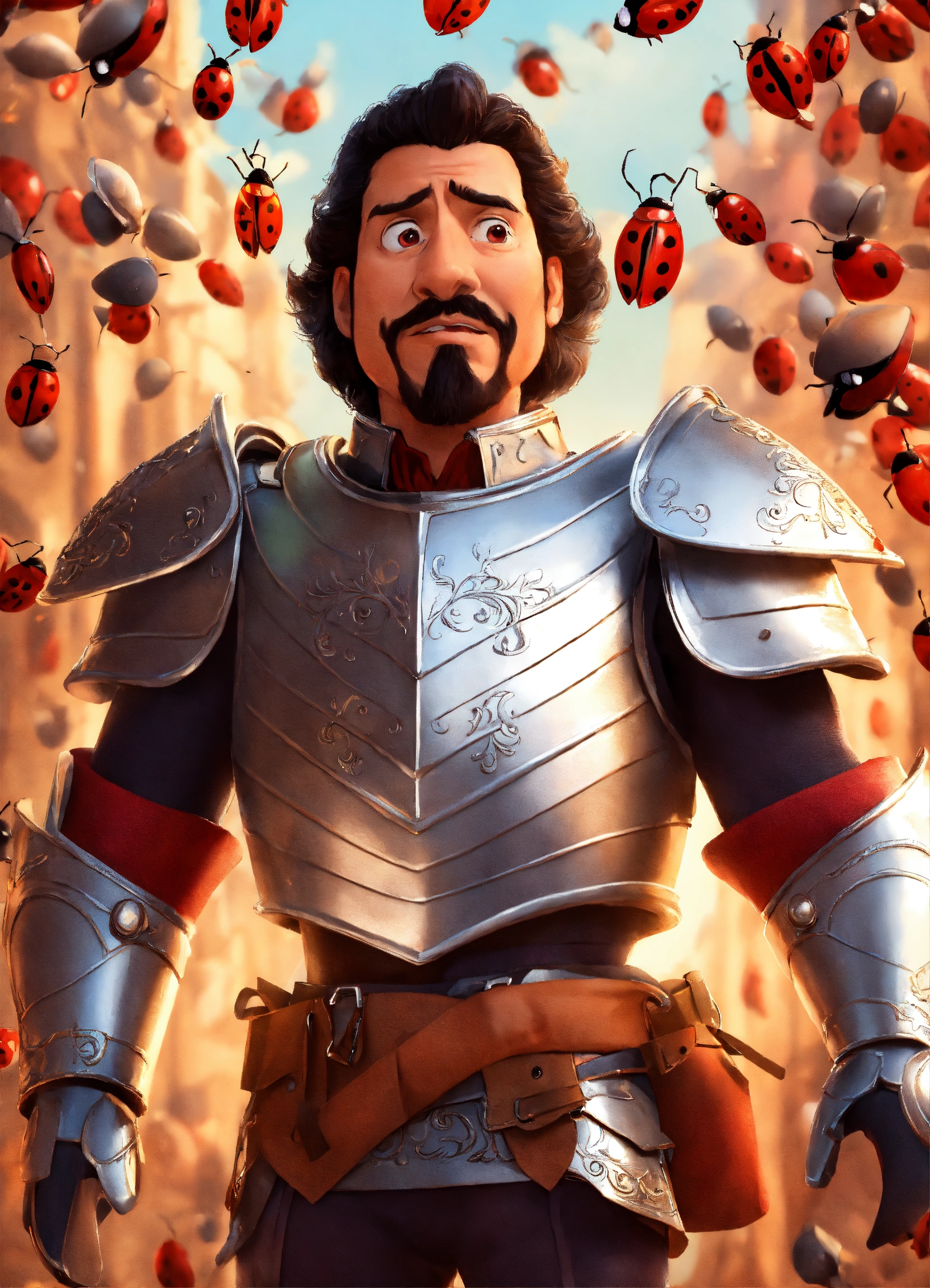 Pixar animation of a hernan cortes looking scared in silver armor, tons of ladybugs flying around him, pixar style cartoon