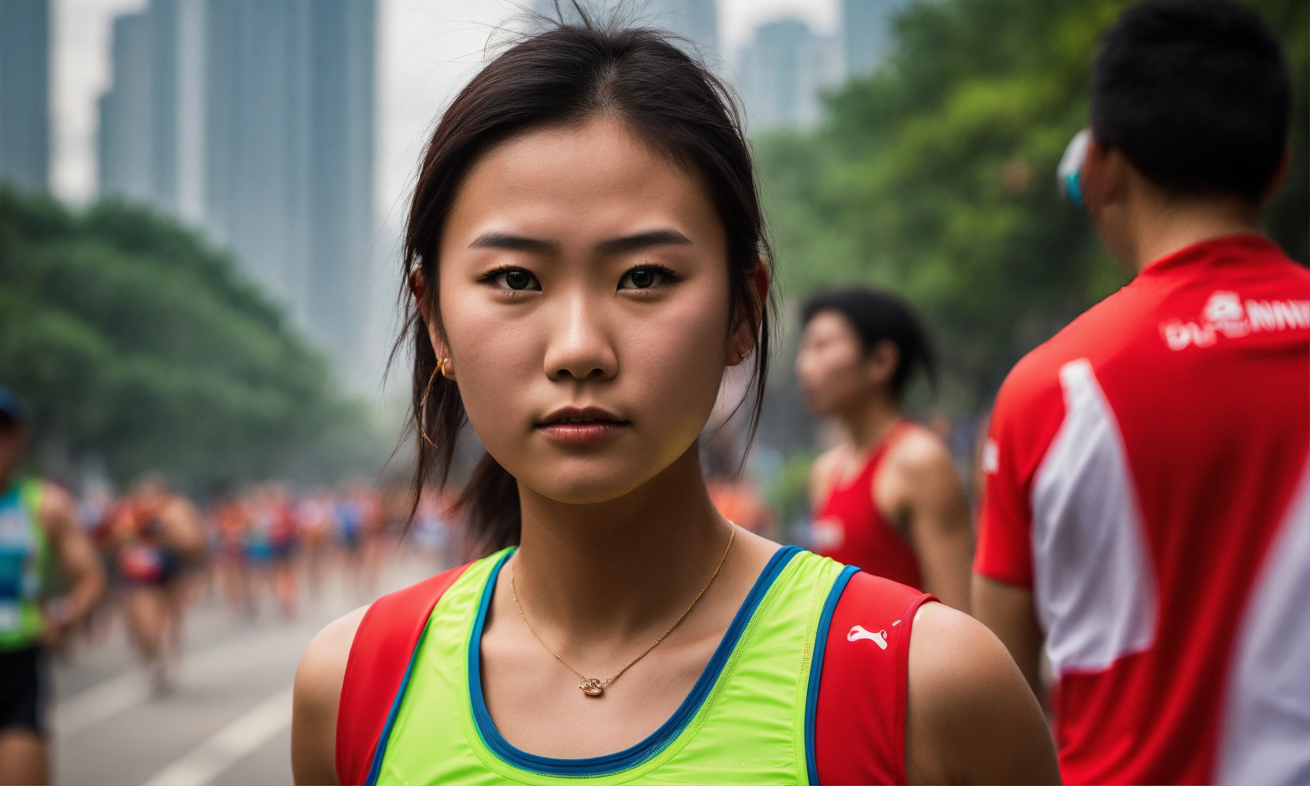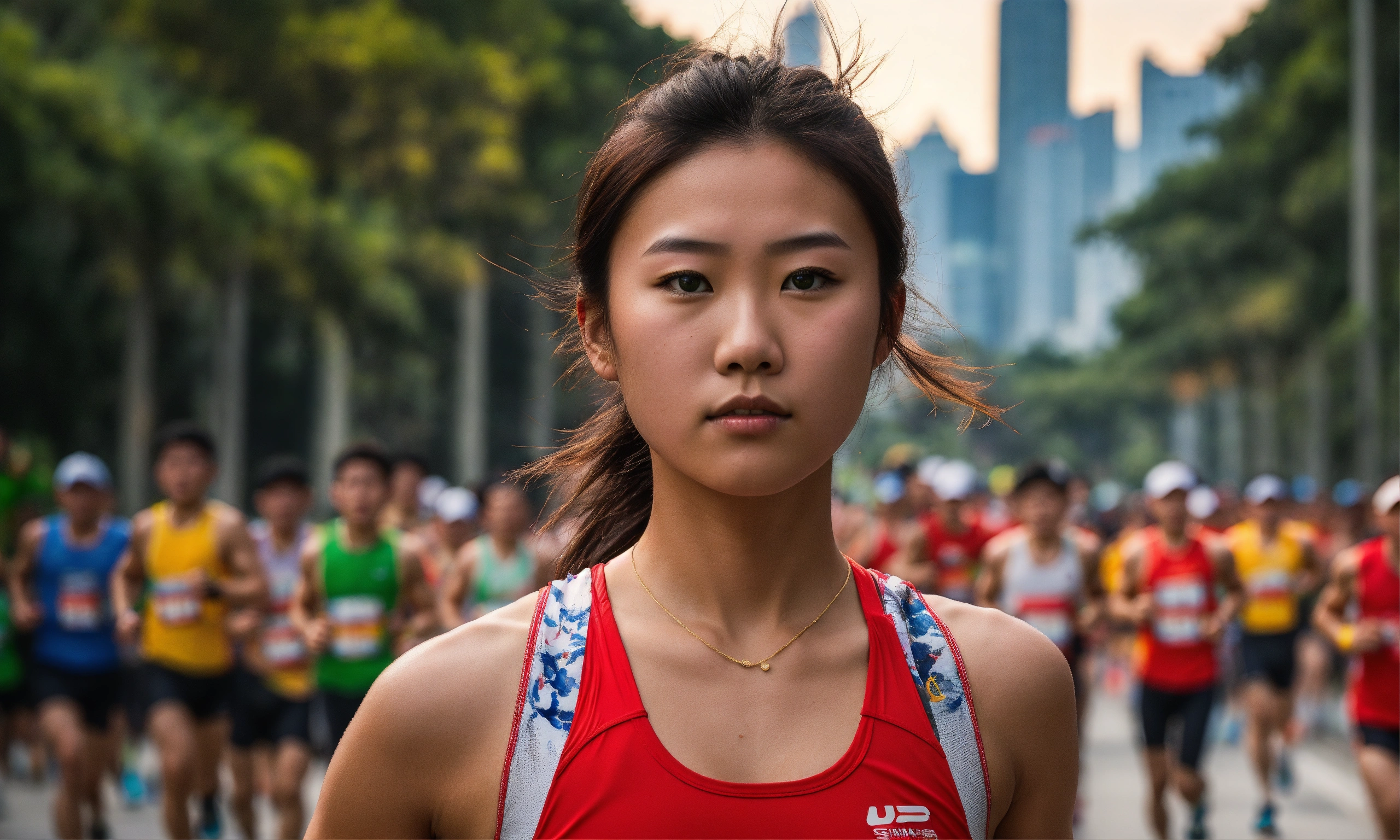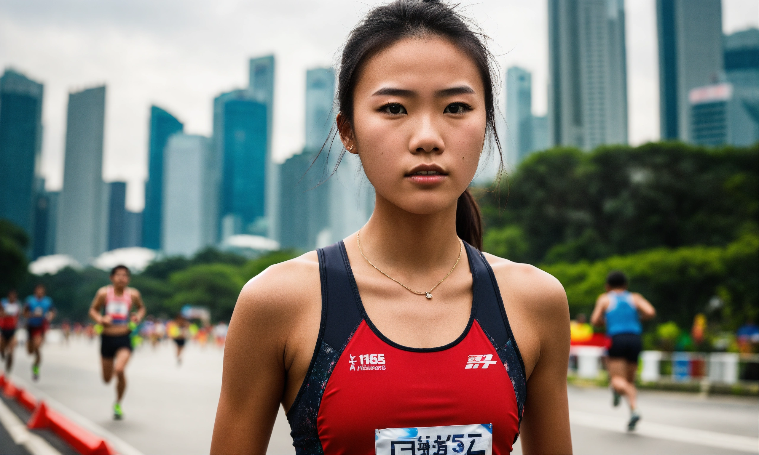 Mid-day at a world marathon event in singapore, ultra close-up frontal shot of an 18-year-old tanned and athletic chinese girl, plain red singlet, looks with unwavering determination, her eyes, locked onto the camera, radiate ambition, resilience, and a deep focus, with green and singapore cityscape in the backdrop, other runners at the back, captured with a nikon d850, 85mm f/1.4 lens, the photograph is given a touch of watercolor rendering for added depth, making her the undeniable centerpiece of the image.