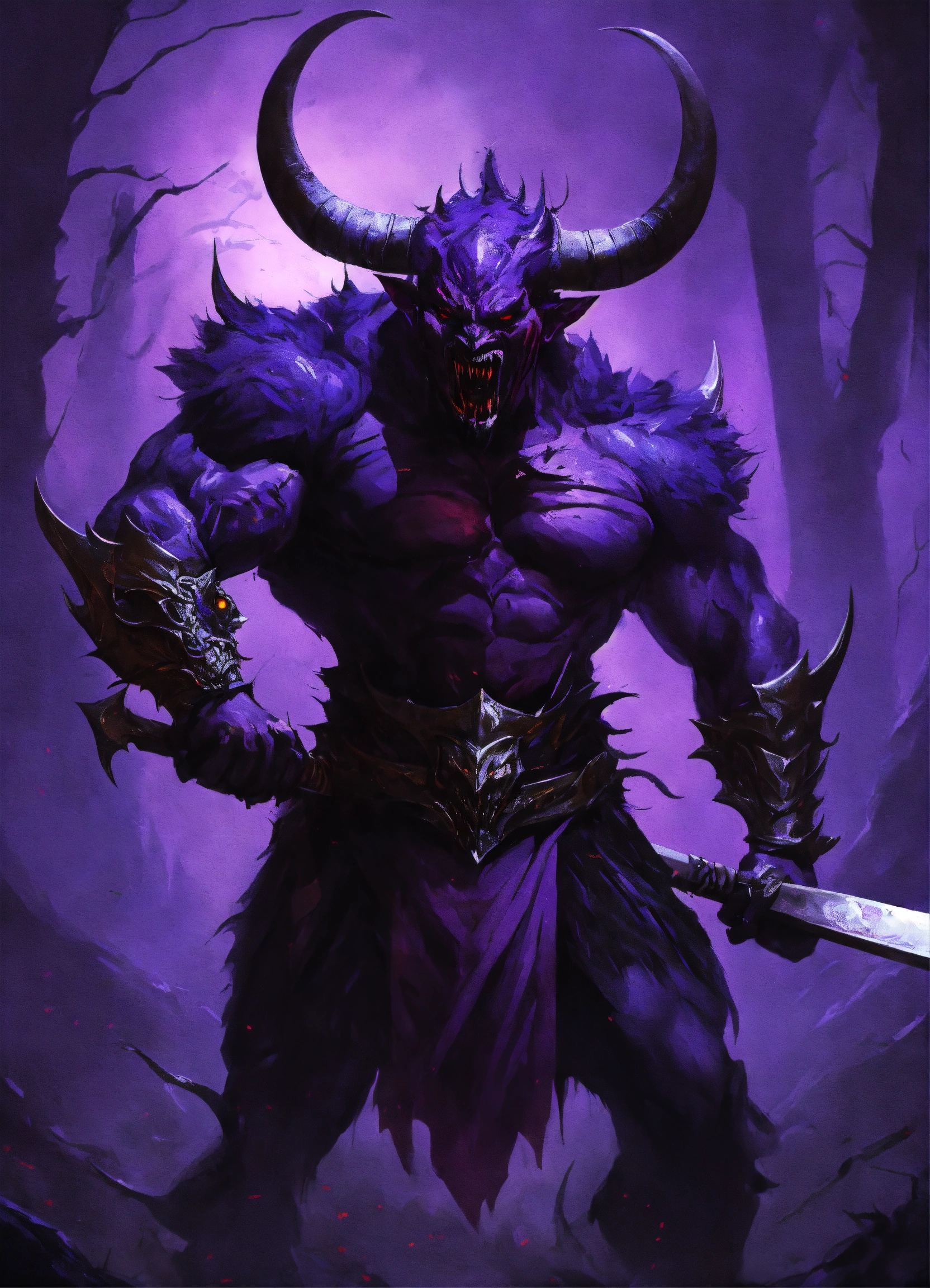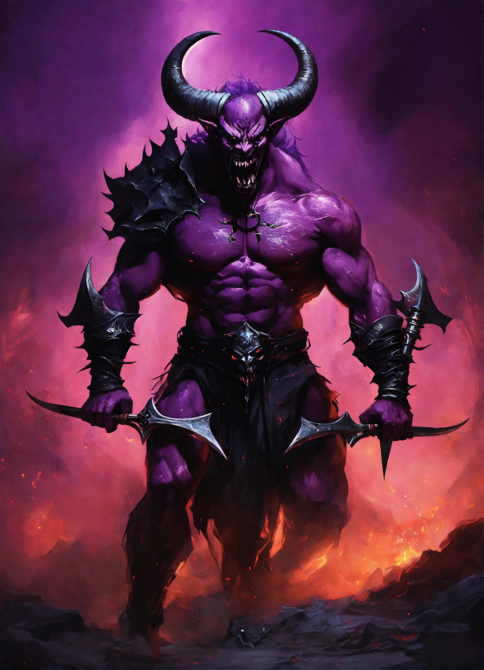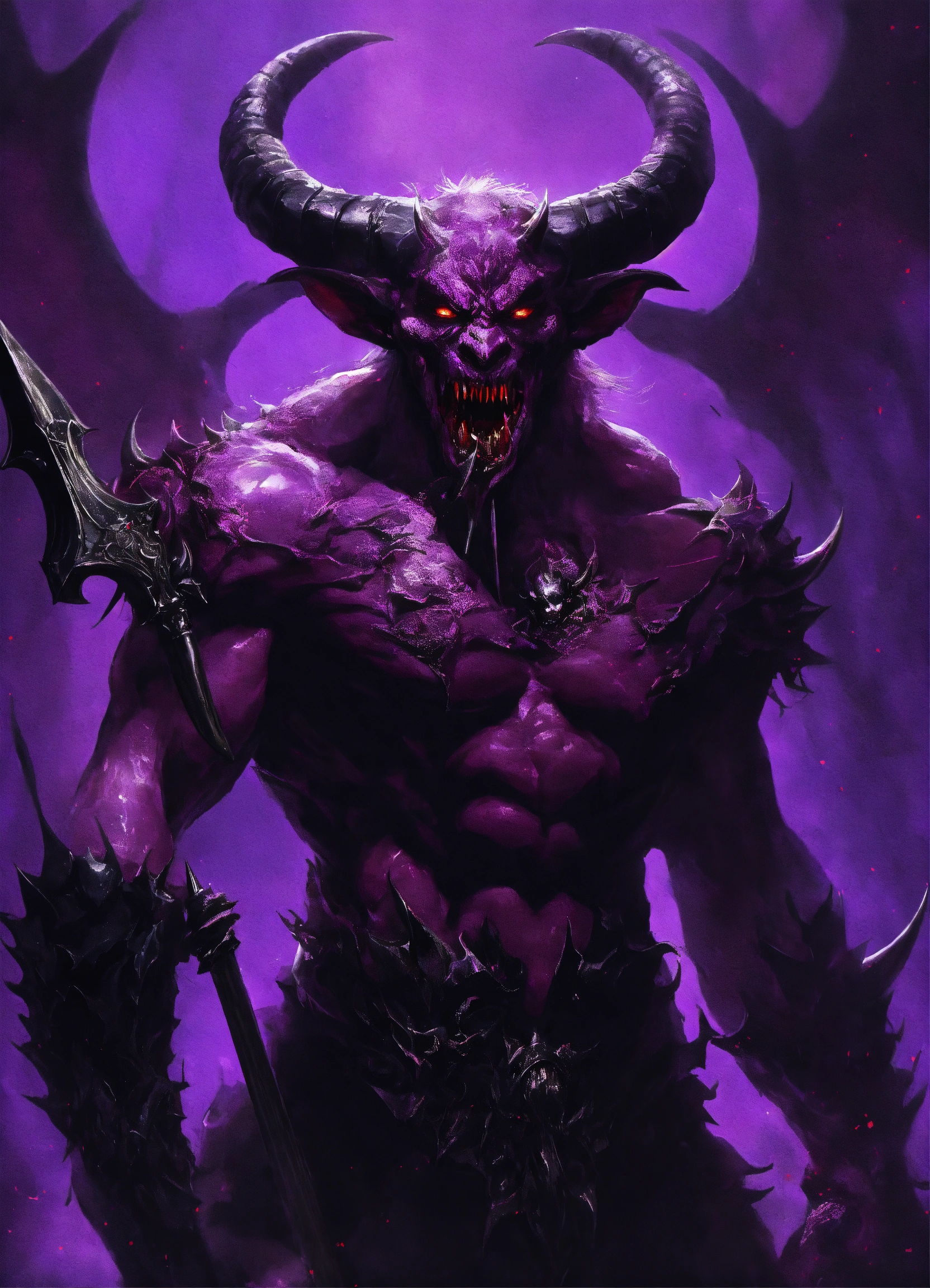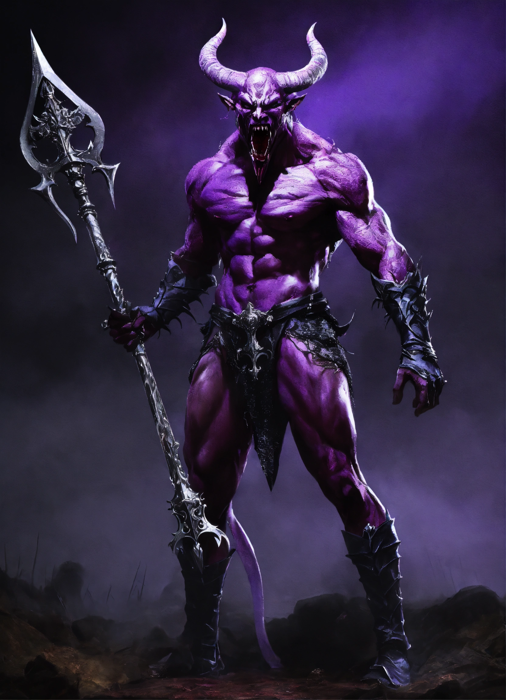 Subject the demon devours itself. genre gothic. image quality realism. the picture itself the demon has three heads with sharp white teeth and black horns, and together they bite their own body, in his two hands he holds a halberd of purple metal, his body is made of muscle without skin
