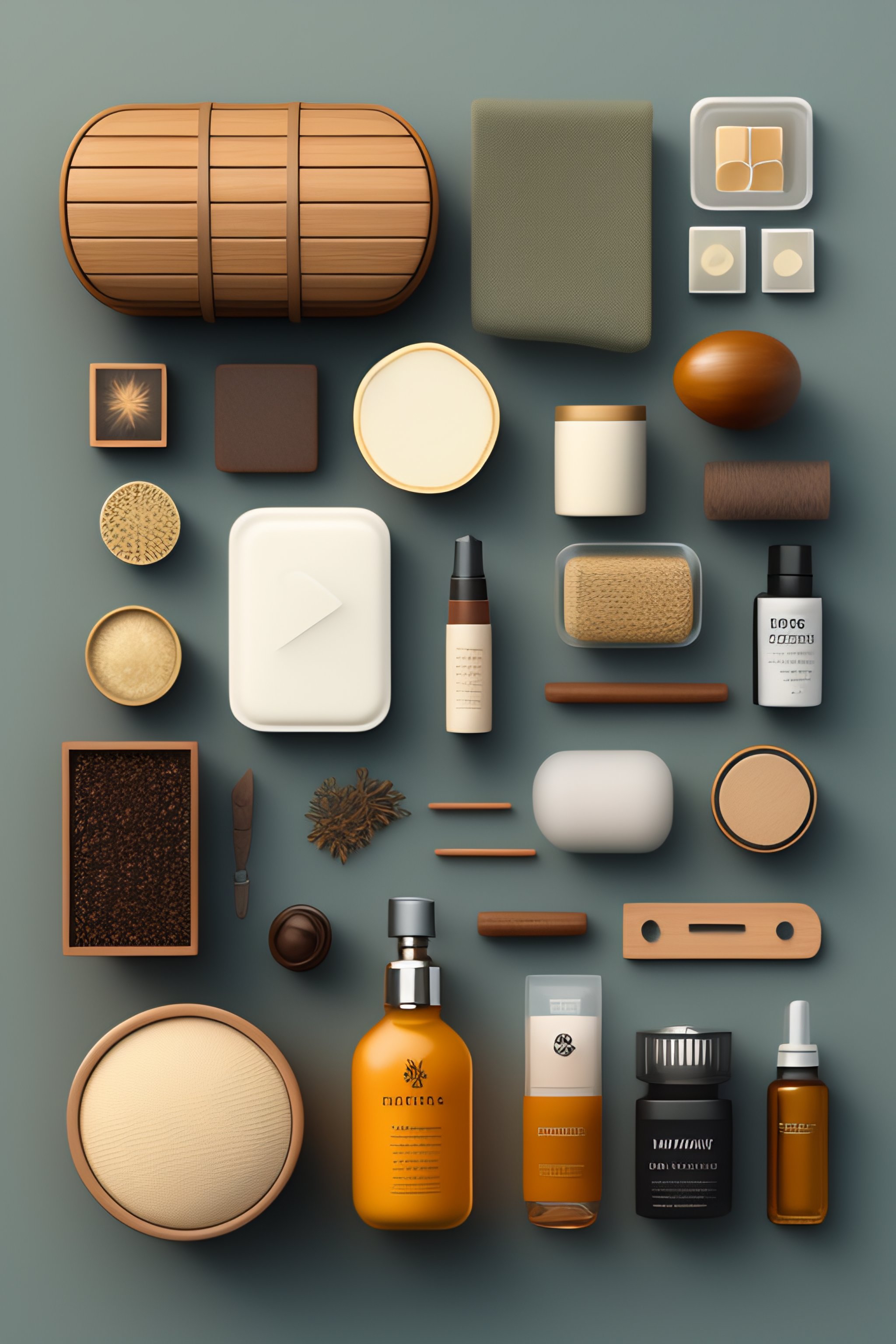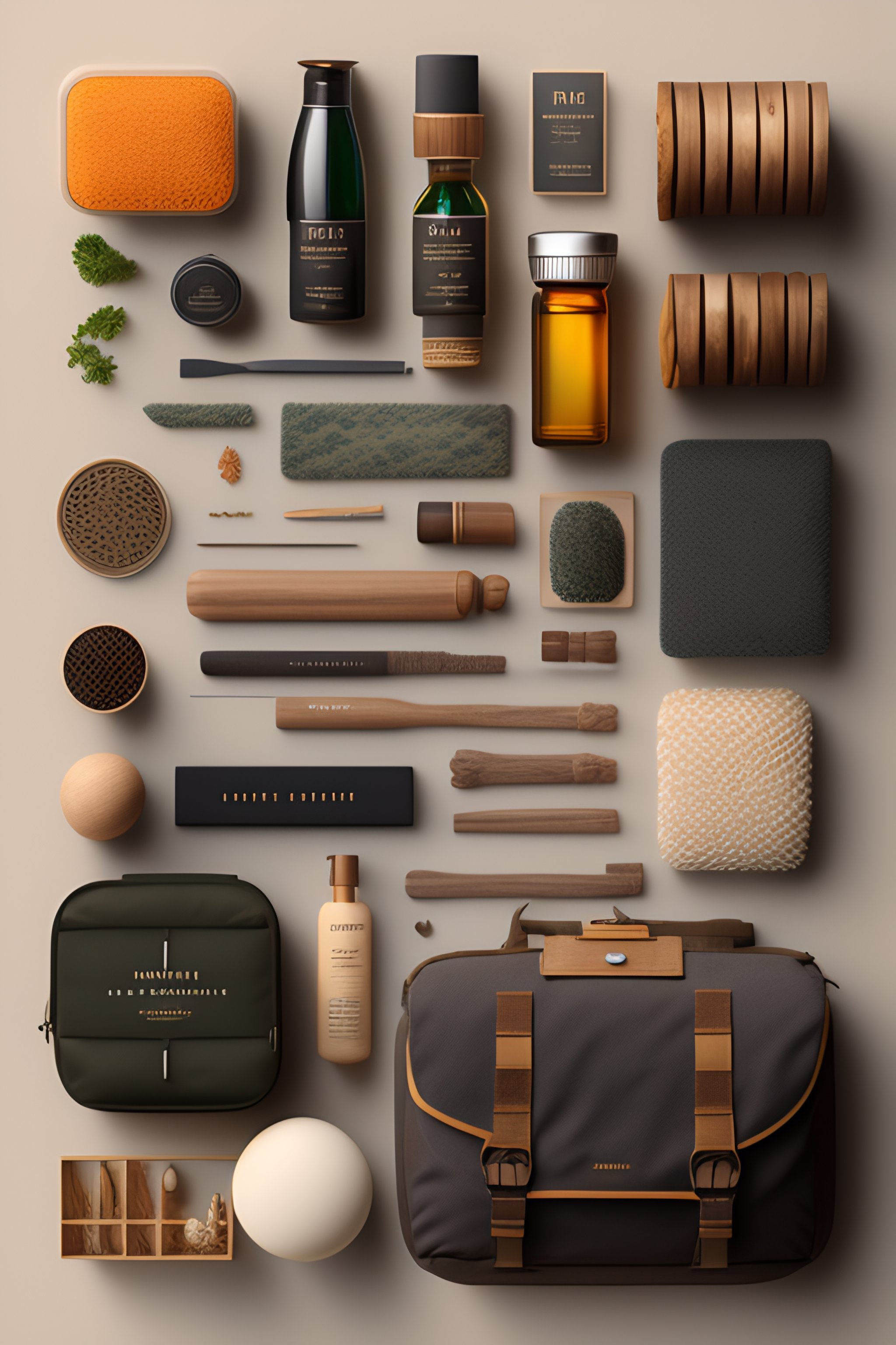 Prompt: 'shaving kit, knolling, flat lay, natural materials, deconstruction, highly detailed, depth, many parts, lumen render, 8k'