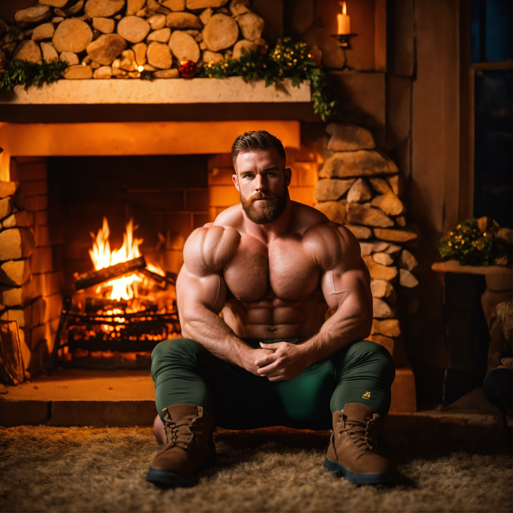 30-year-old hairy irish man with big muscles, big bodybuilder, body like a wrestler, sitting in front of a fireplace at midnight