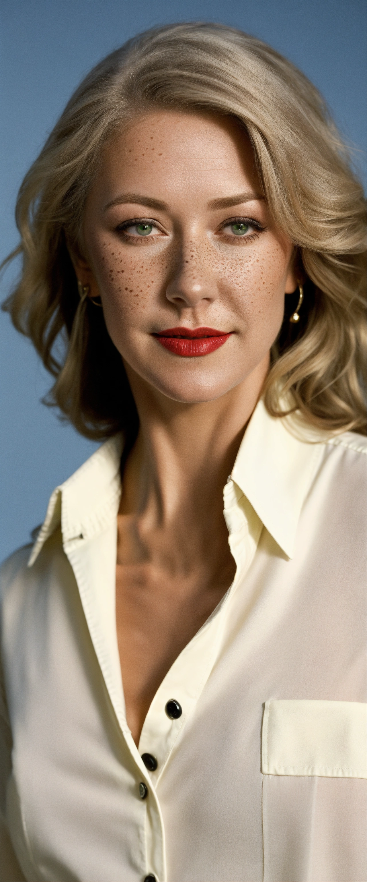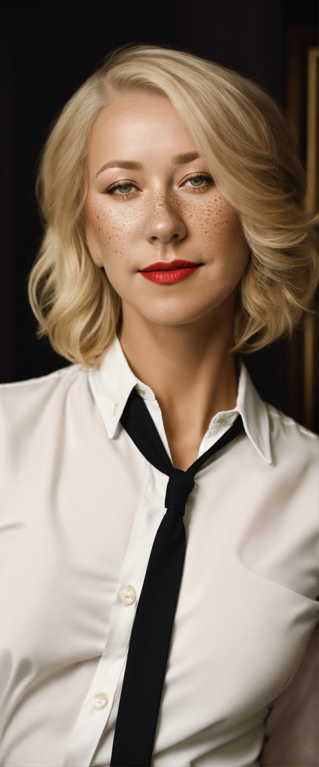 A helen mirren photographic portrait of a woman with neck lengthened, greater bust, tight shirt, wide bust, she has green eyes, freckles on her face and red lipstick, form-fitting, curve-hugging, snug, tailored, close-cut, sculpted, defined, pronounced curves, shapely, casual, relaxed, laid-back, undone, informal, nonchalant, easygoing, disheveled, carefree, unbuttoned, unstructured, effortless, she wears a black suit jacket with a white shirt and black tie. her head is triangle shaped, preppy, elite, well-dressed, polished, sophisticated, form-fitting shirt, stylish, prestigious, private school attire, layered, hosiery, affluent, knee-high socks, upscale, traditional
