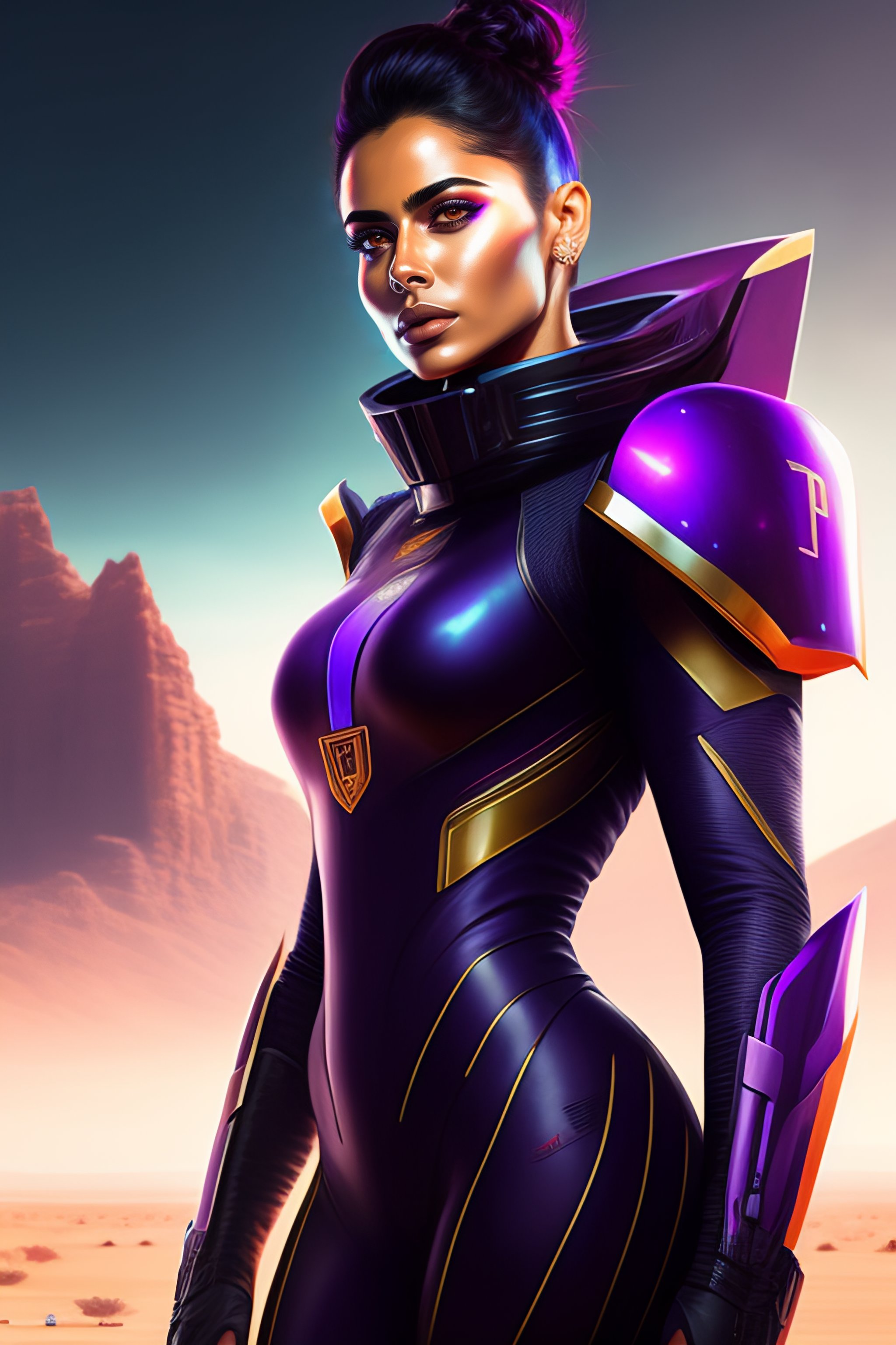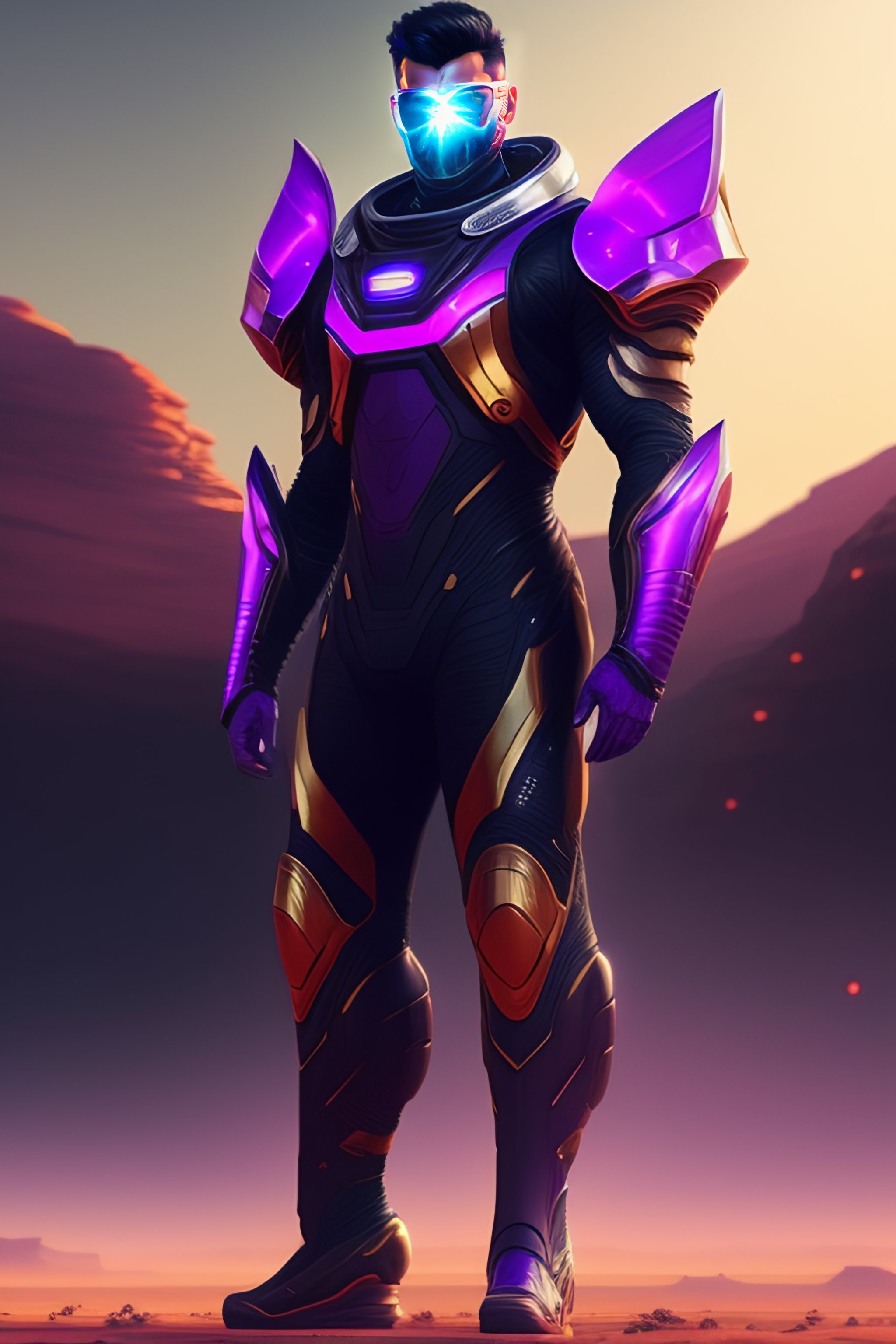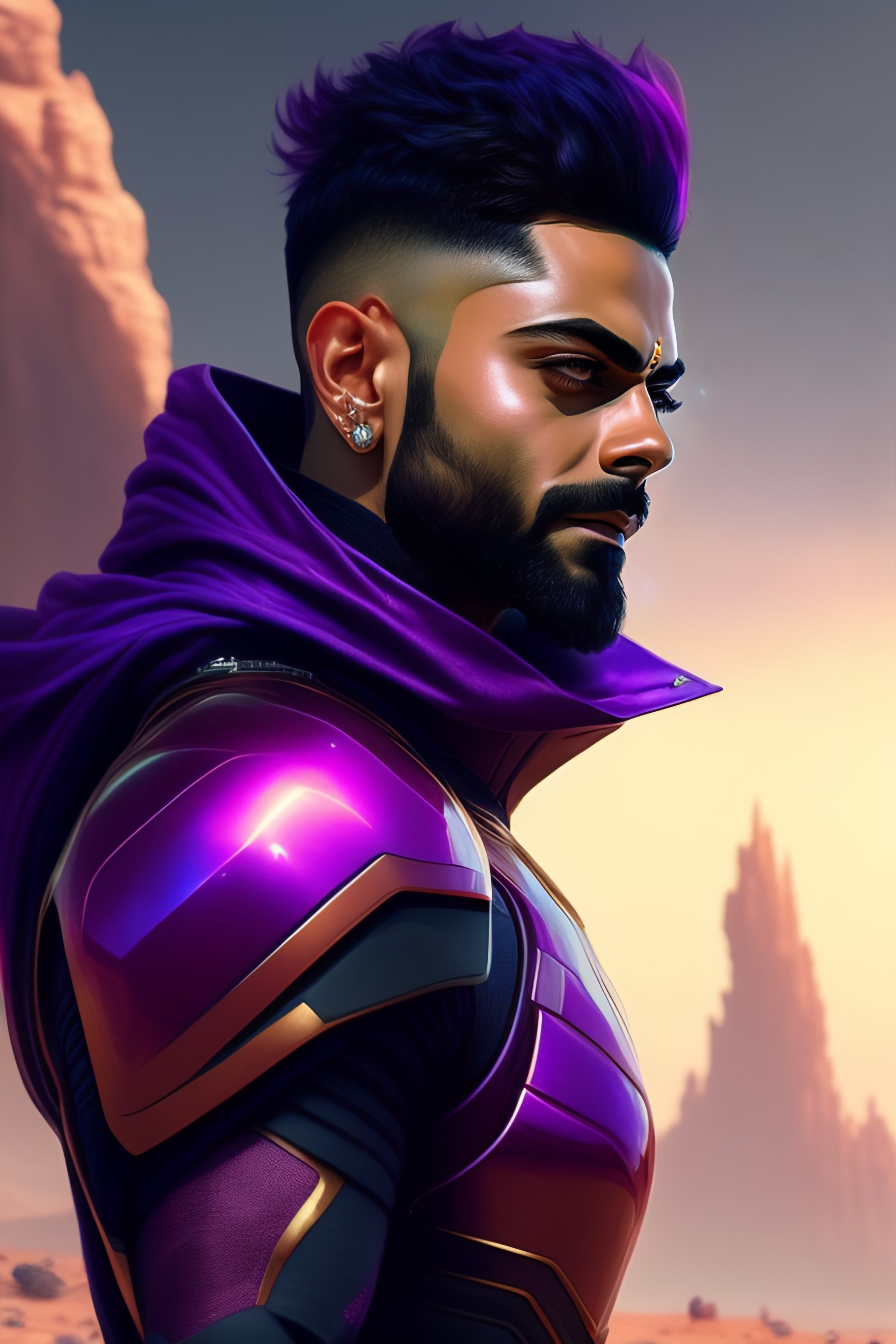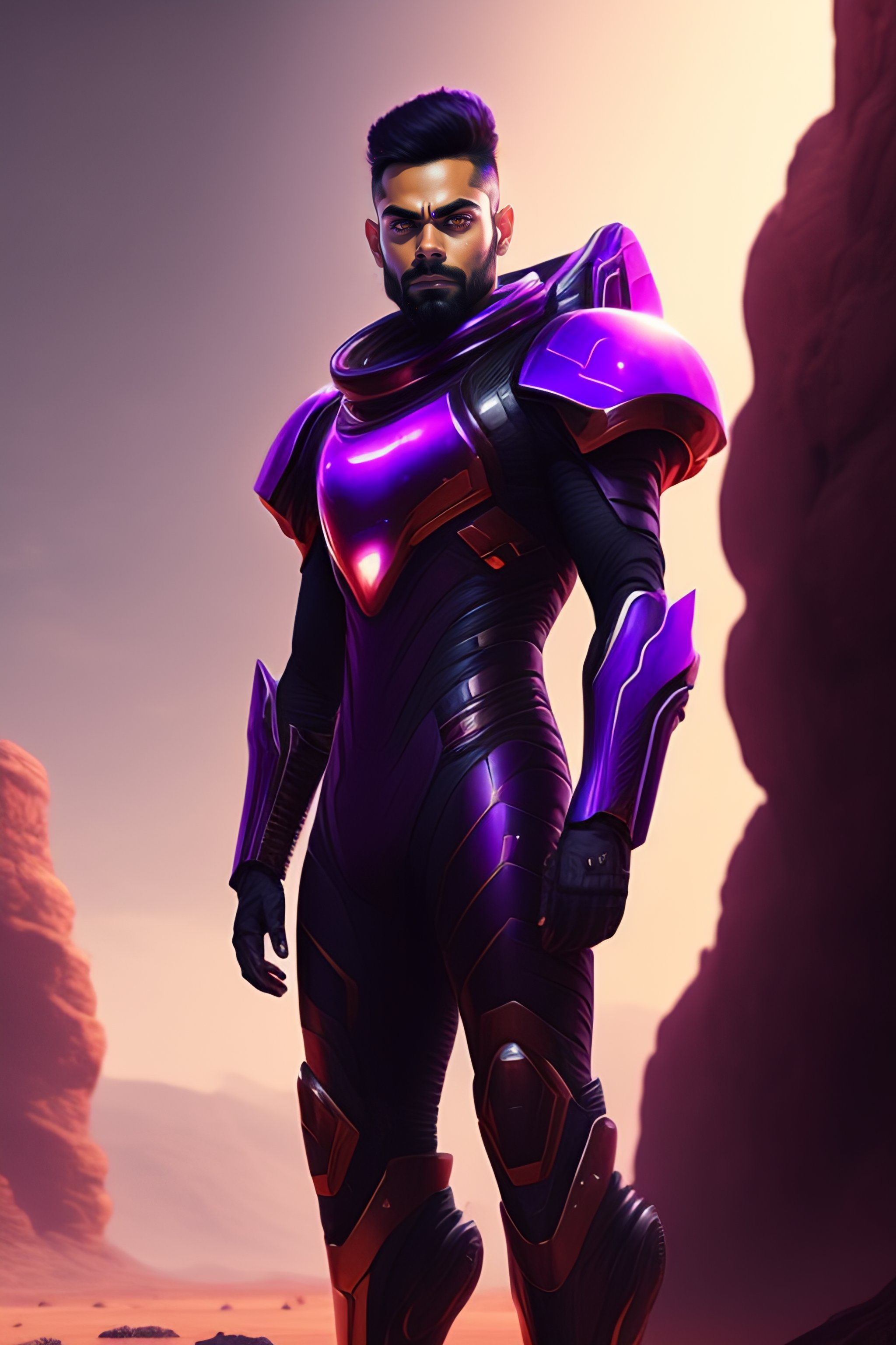 Half body portrait of virat kohli weared in scifi futuristic suit, action, dynamic pose, spaceship on mars in background, dark purple color palette, by greg rutkowski extremely detailed, brush hard, artstation, soft light