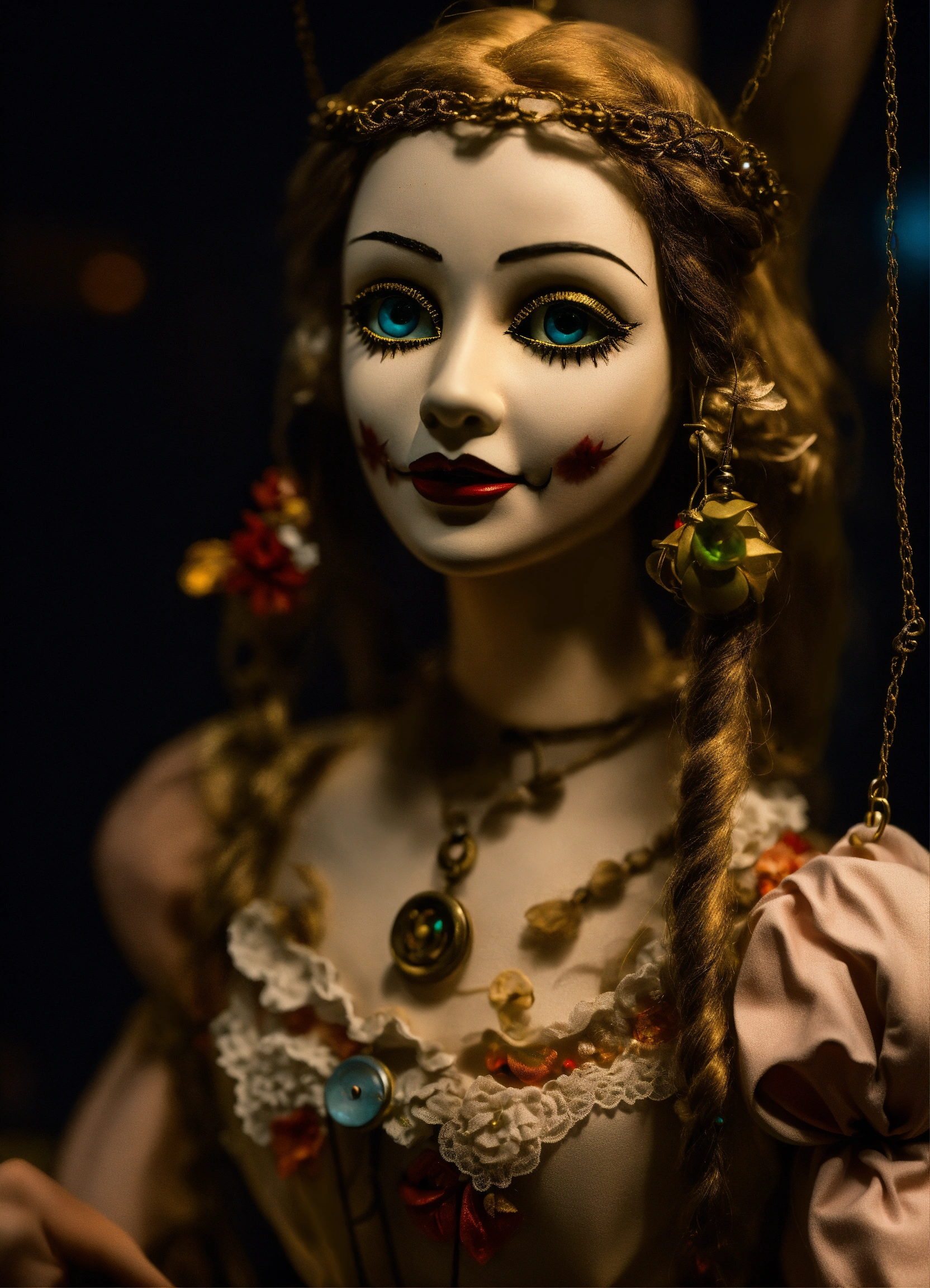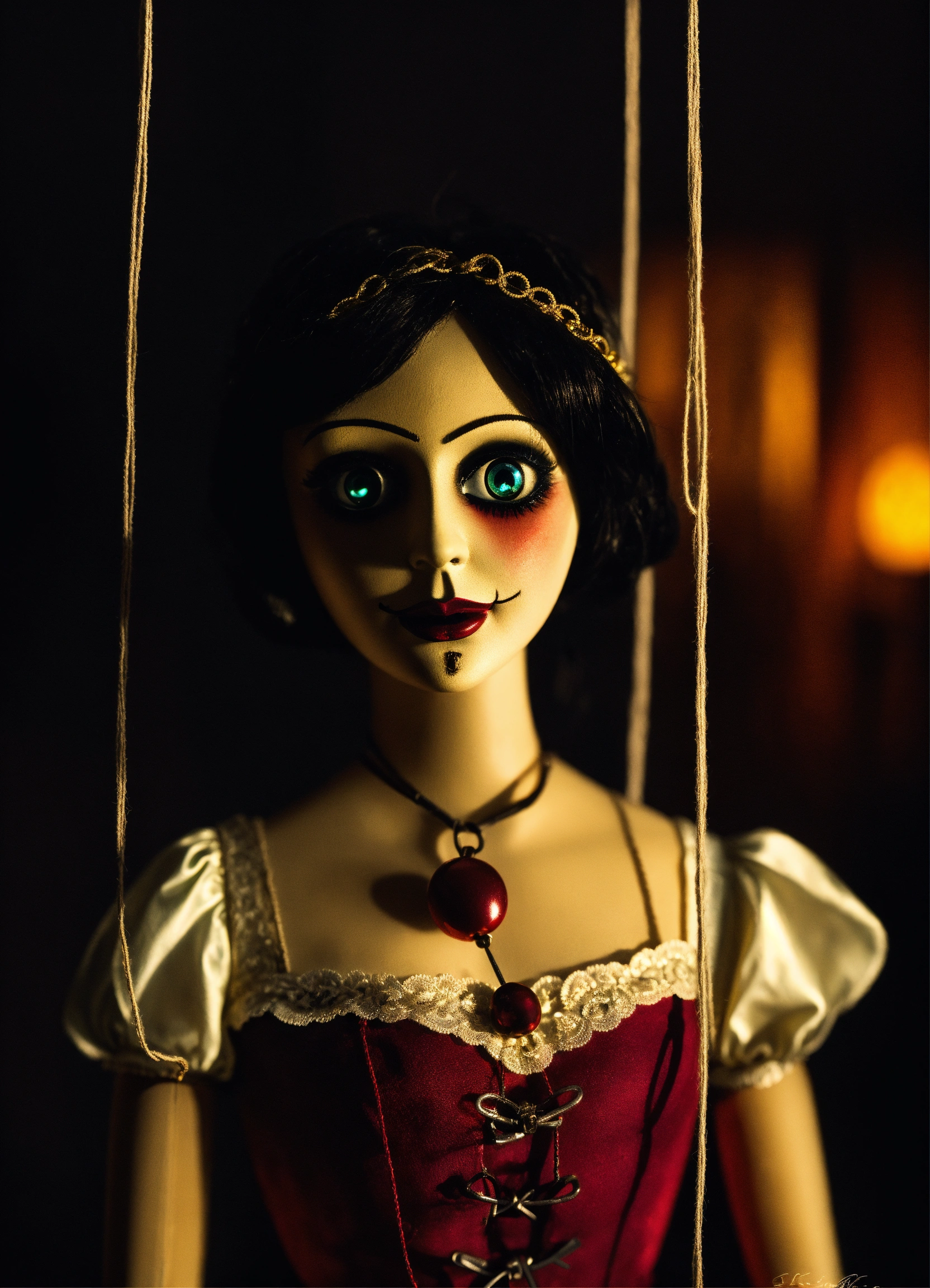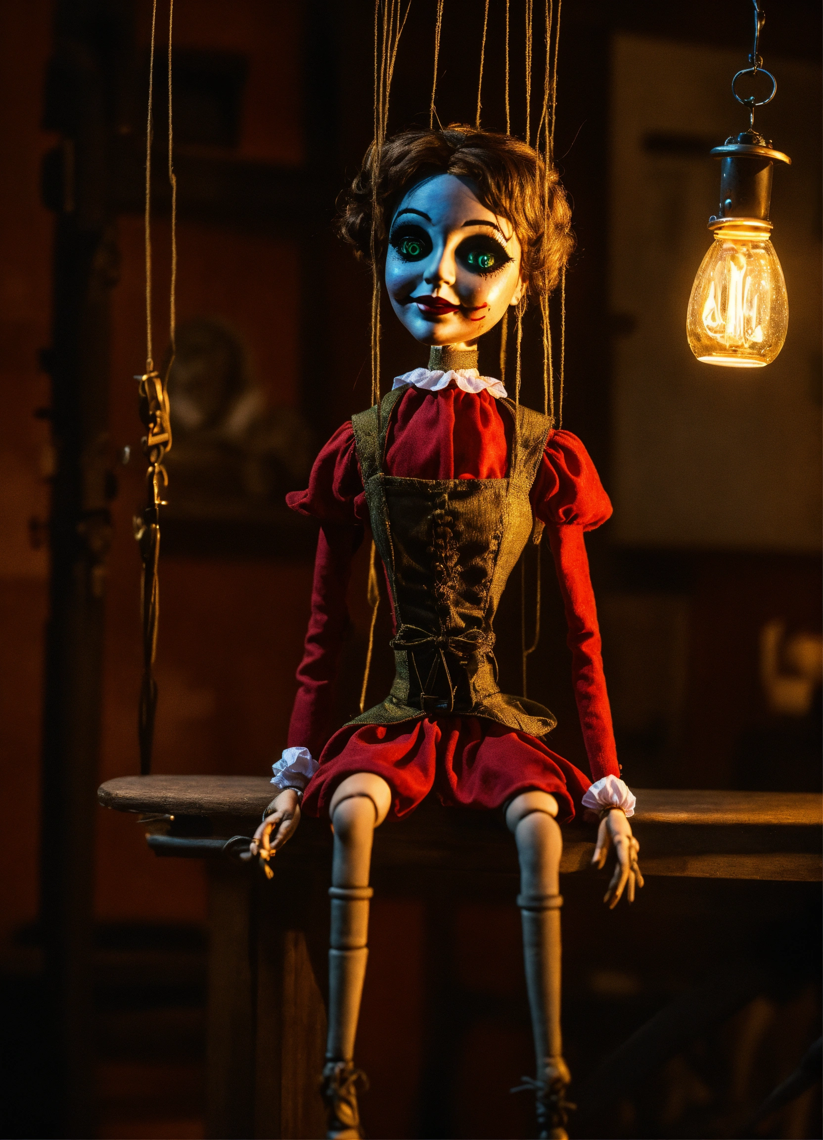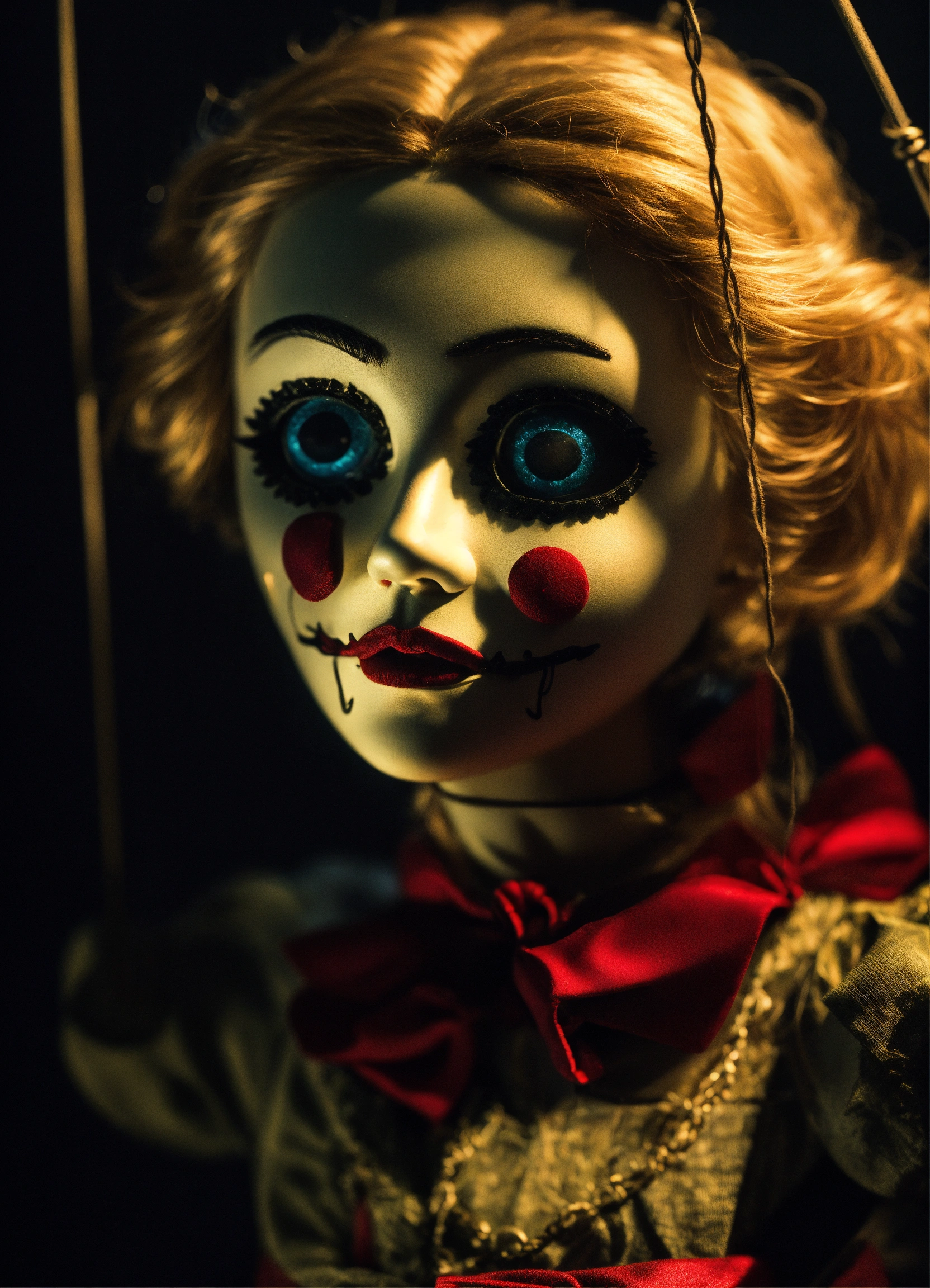 The realistic-looking marionette of a lovely damsel is used as a lure to draw in unsuspecting victims, sinister eyes glow in the darkness behind the marionette