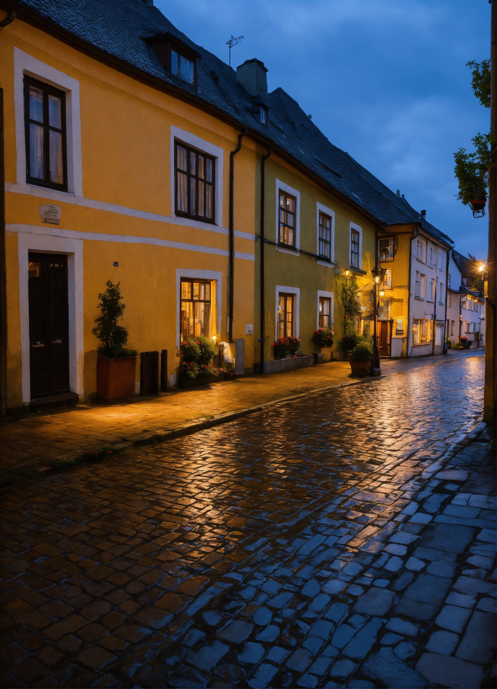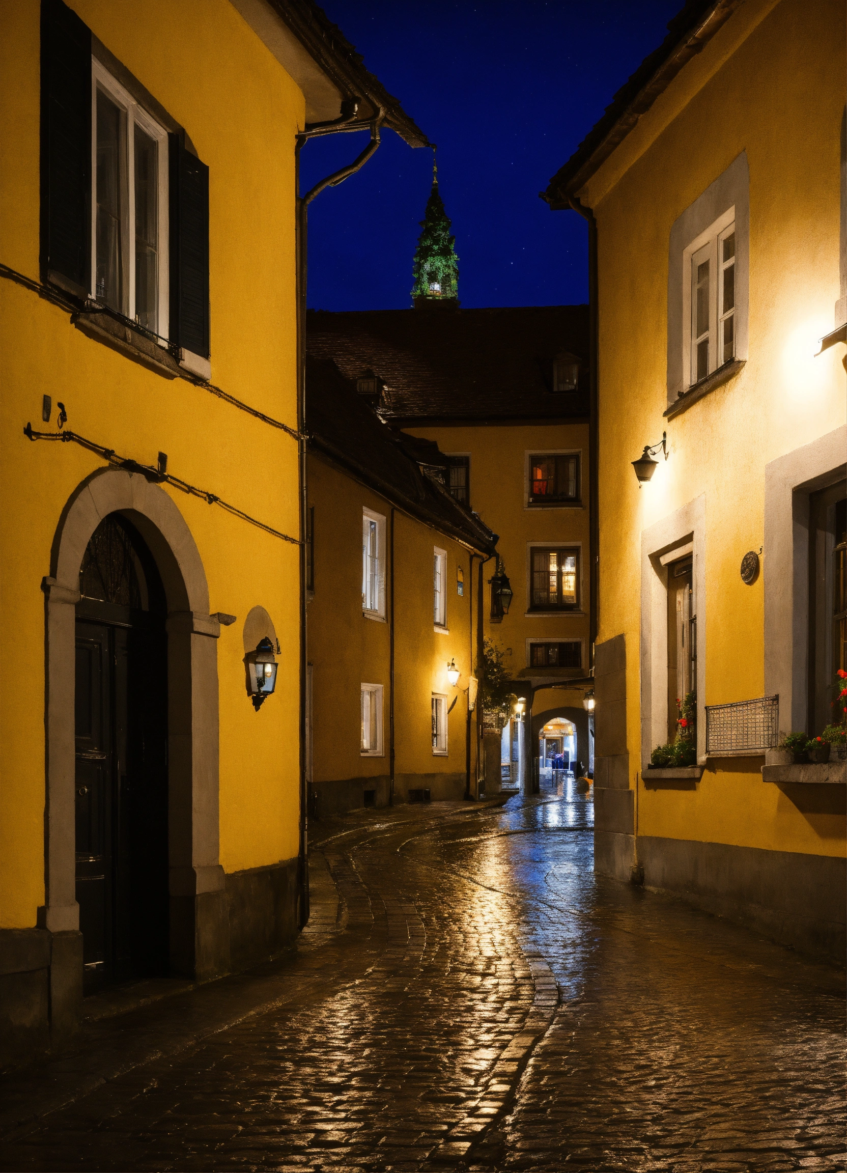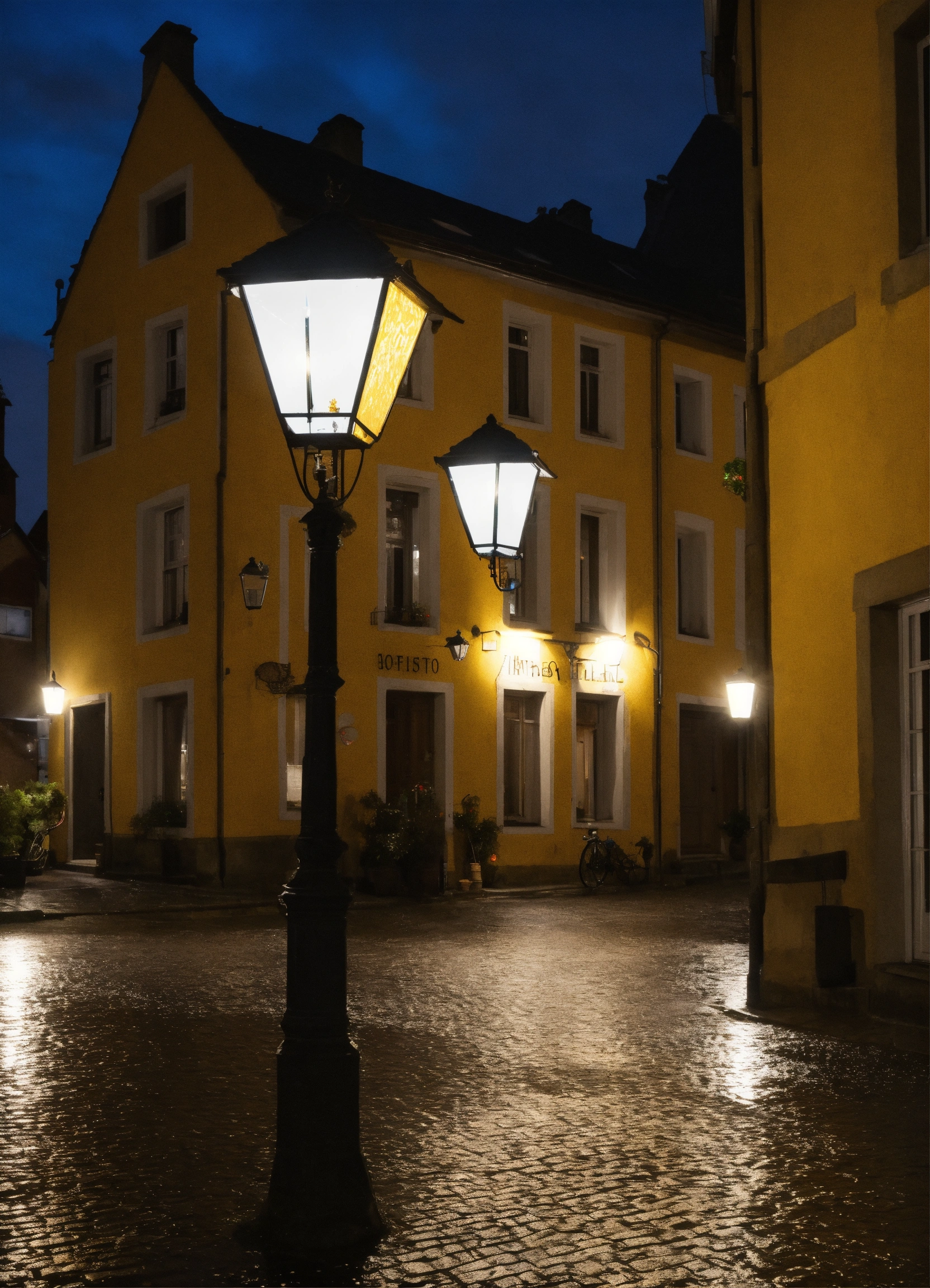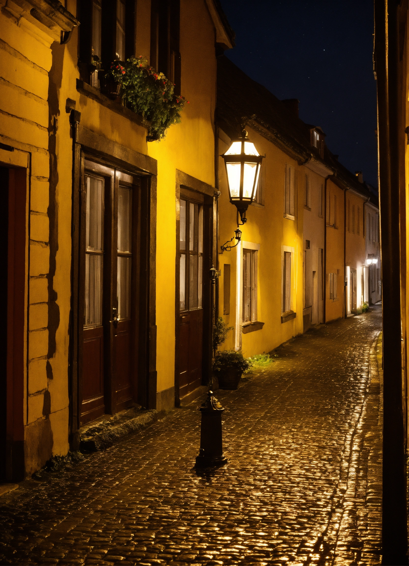 Nacht regen pflastersteine laternen
