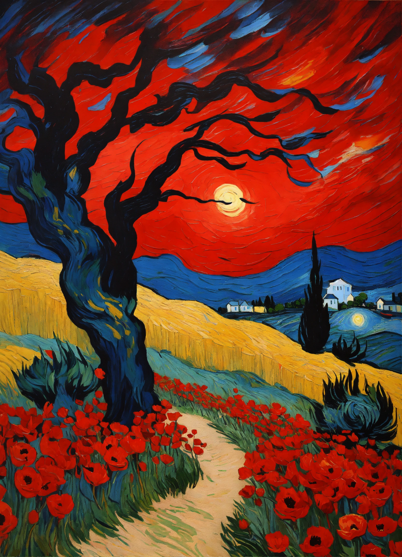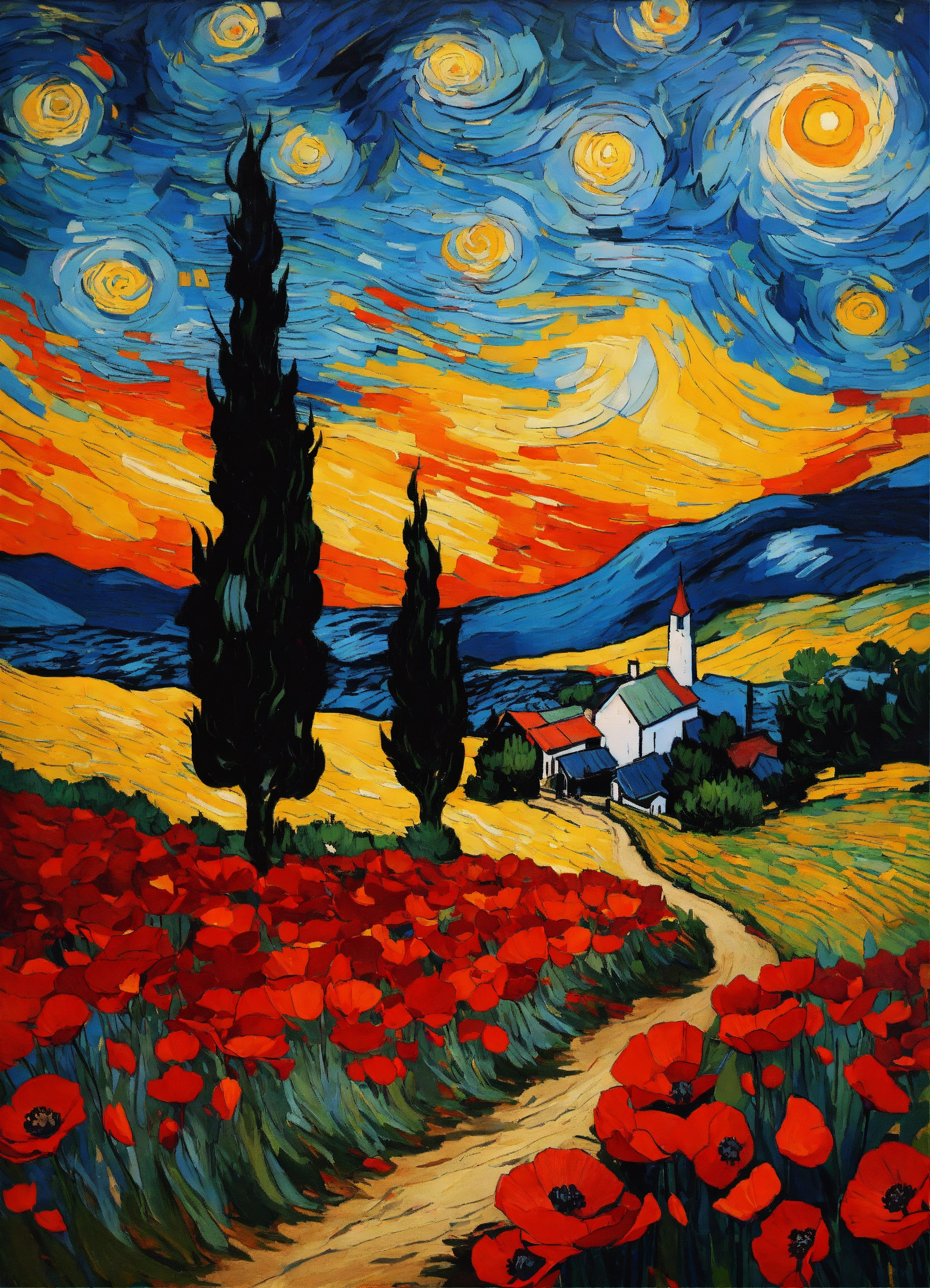Painting starry night by van gogh, windy, night sandy path through red poppy flowers field, windy cypress silhouette, red bright stars