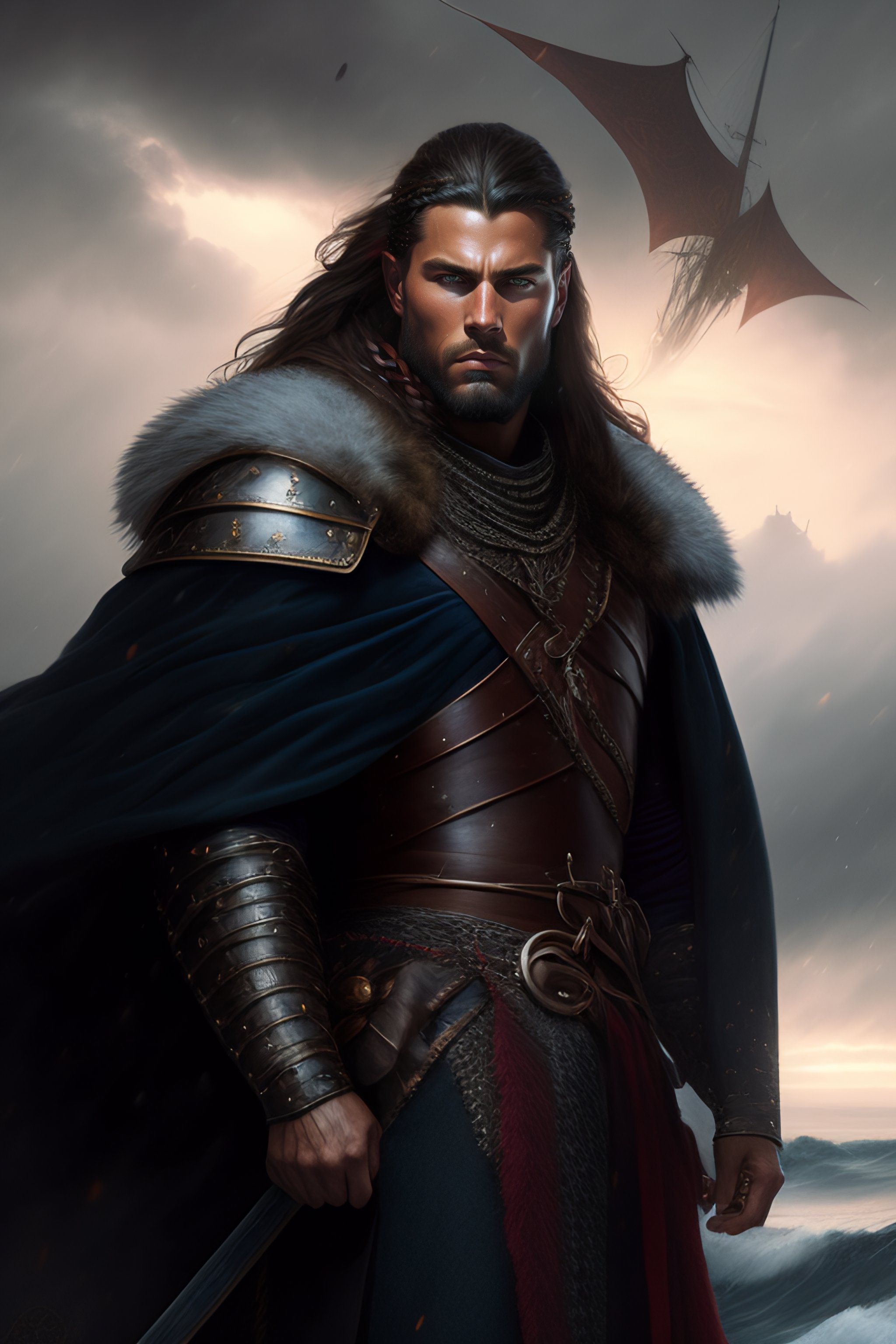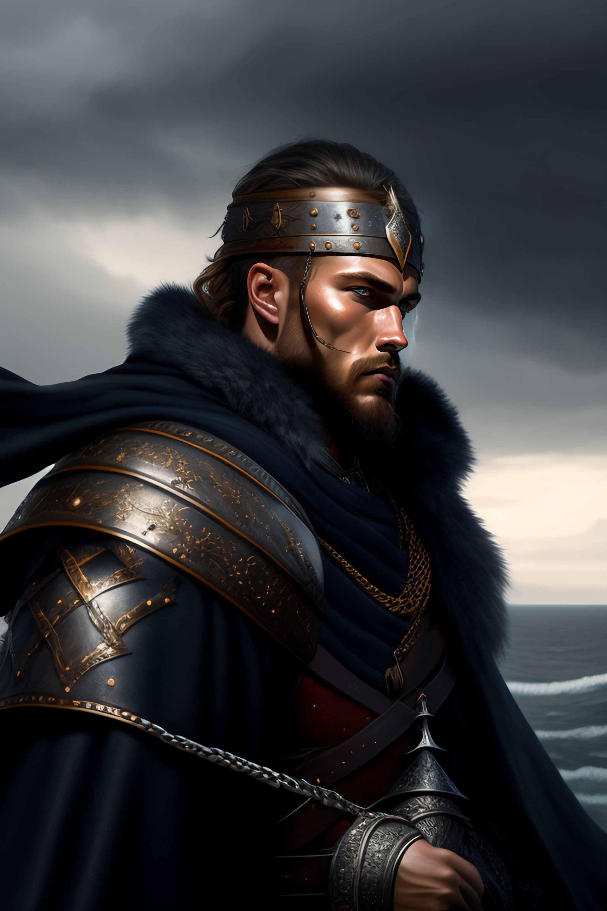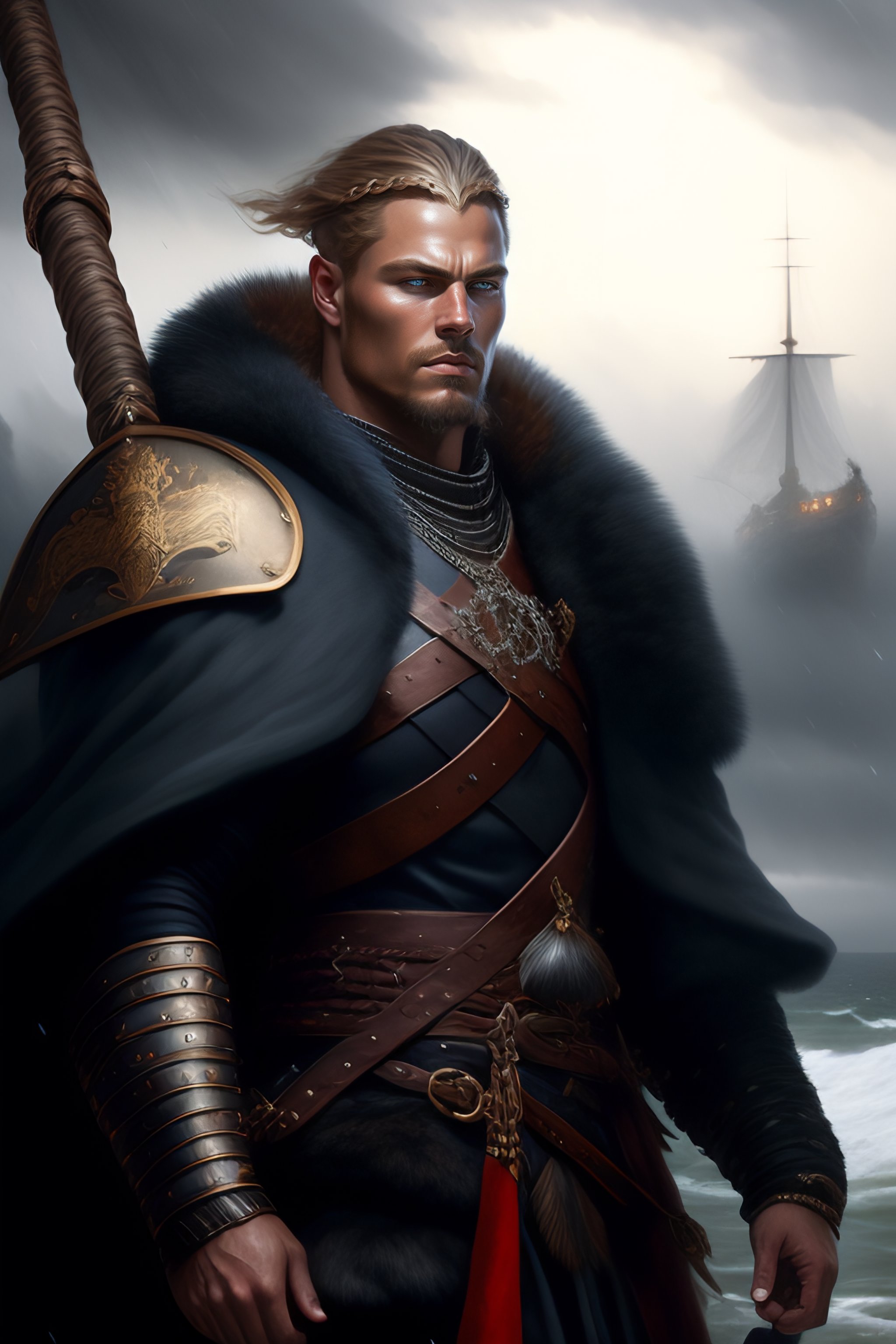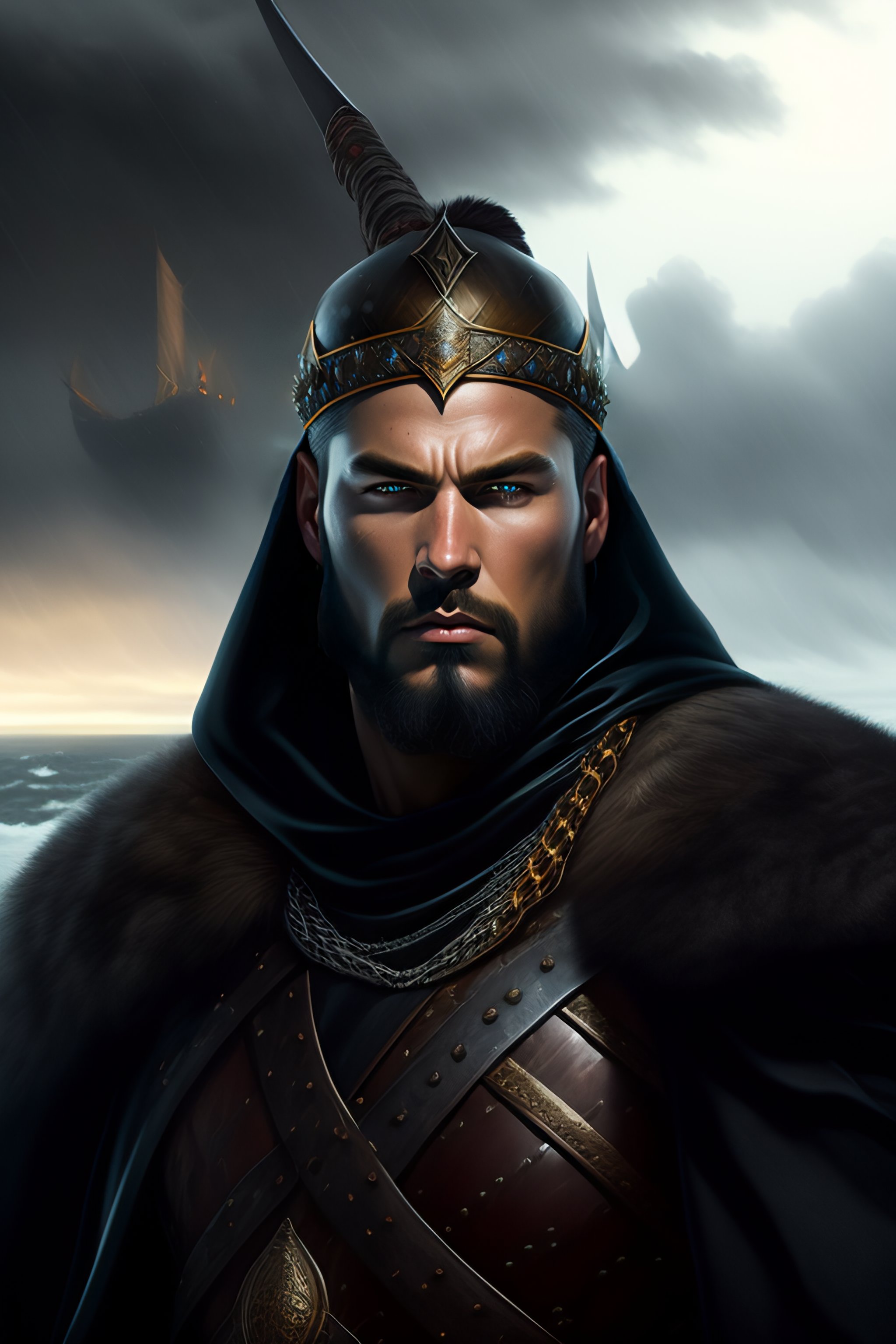 Medieval portrait of a viking warrior man wearing black chain armor and a cloak sharp features, grim, cold stare, dark colors, volumetric lighting, baroque oil painting in ship in storm in the background by greg rutkowski, artgerm, wlop, alphonse mucha dynamic lighting hyperdetailed intricately detailed