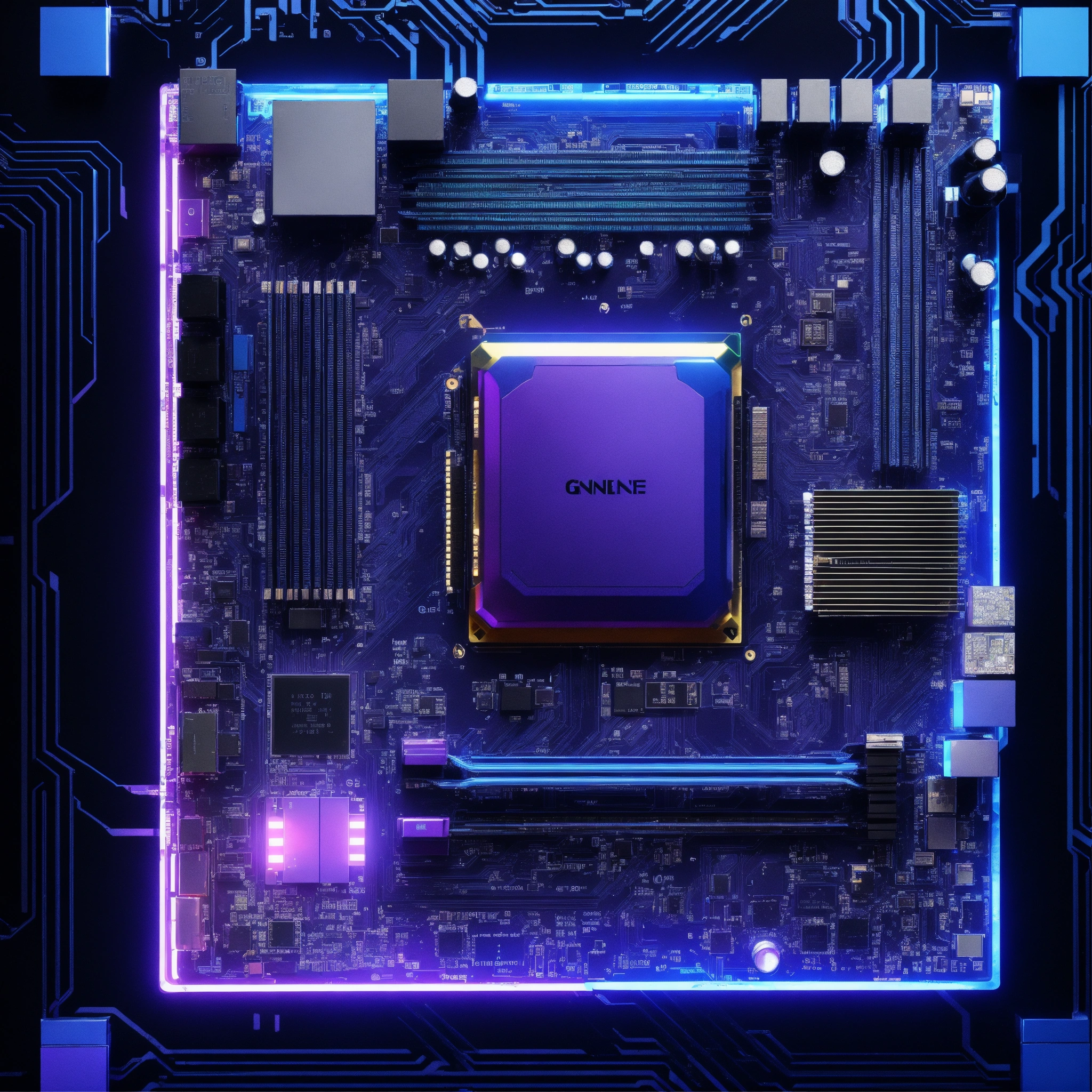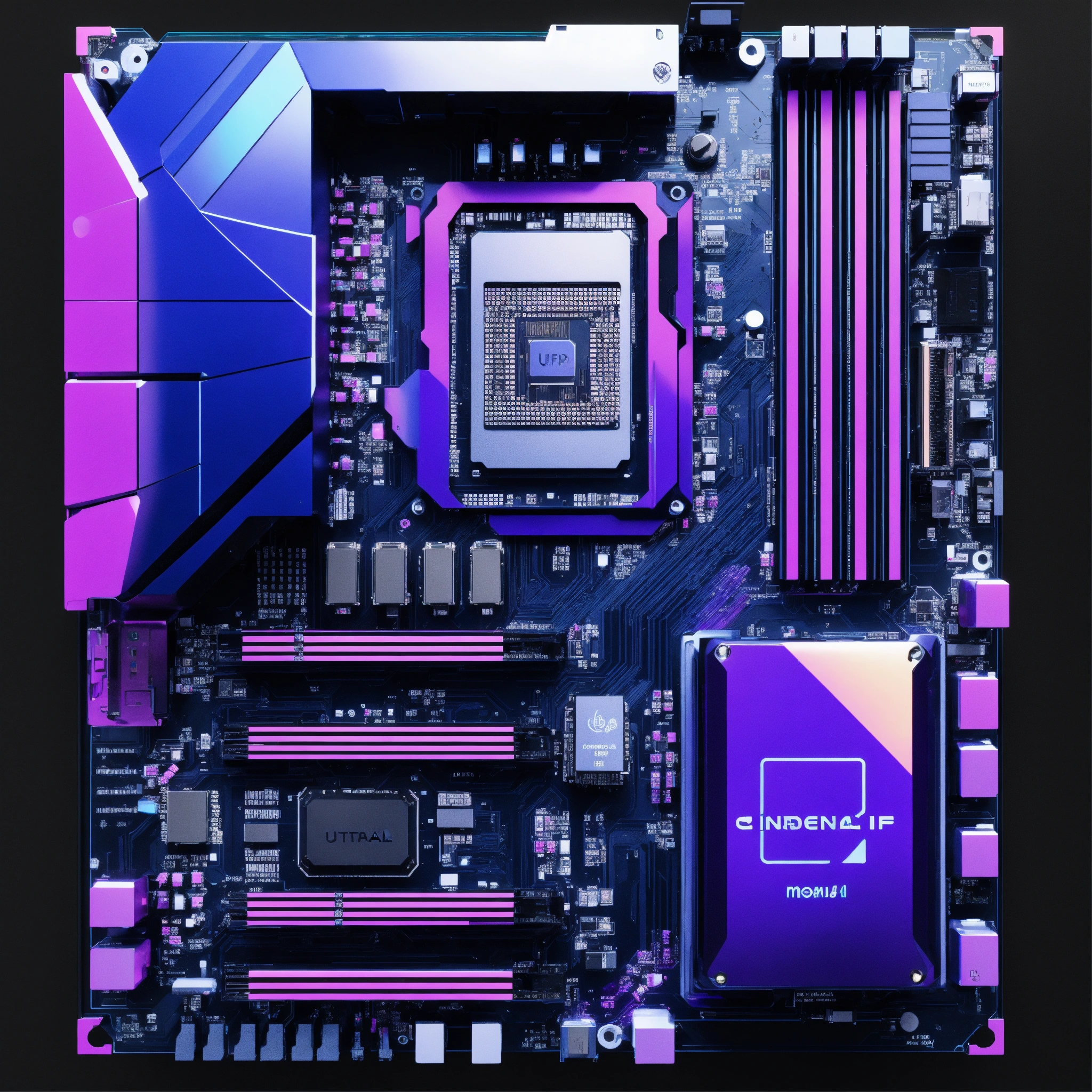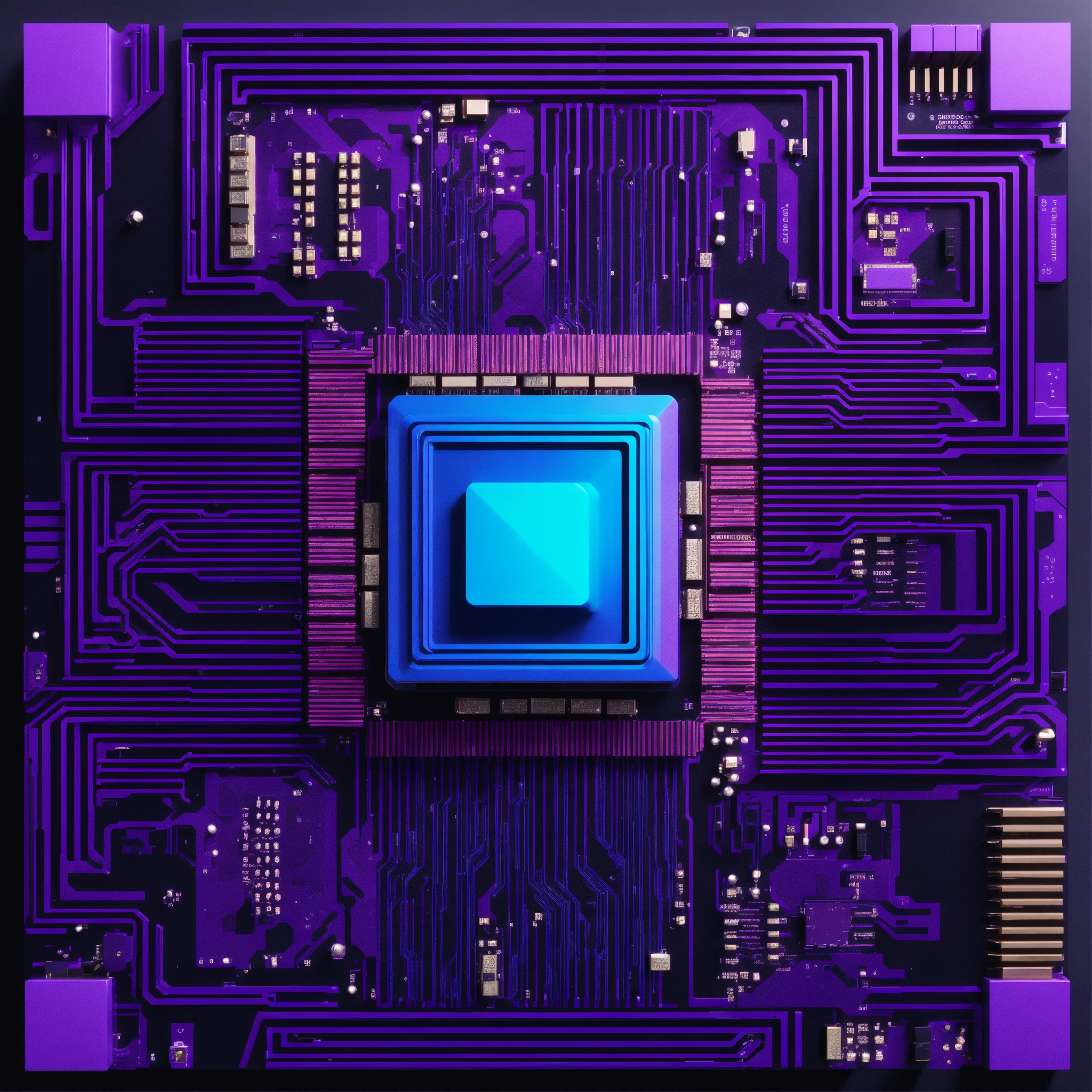 Simple motherboard with processor, chip, connected geometry lines, futuristic, blue and purple with black background, rendered in unreal engine, black background, top view