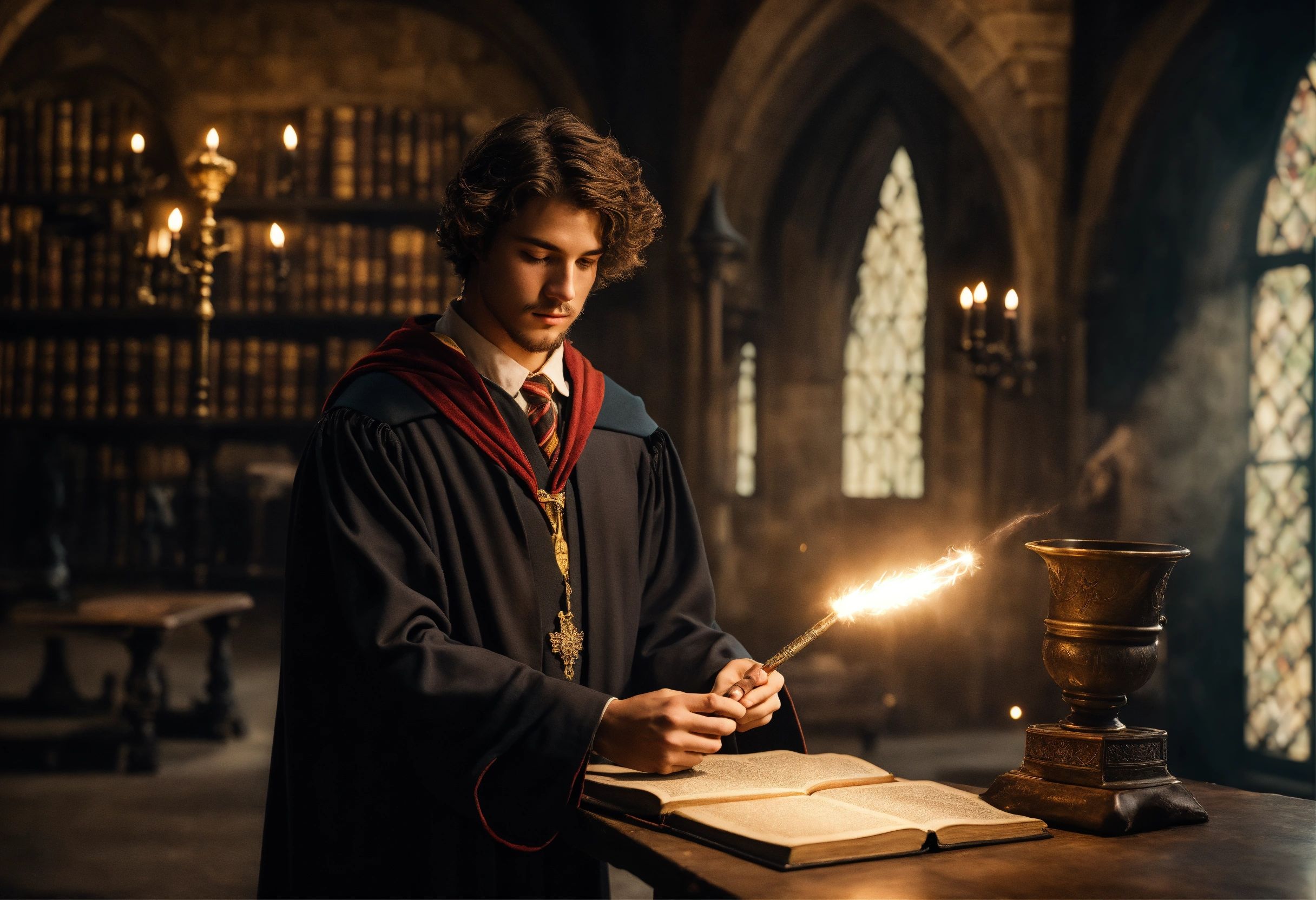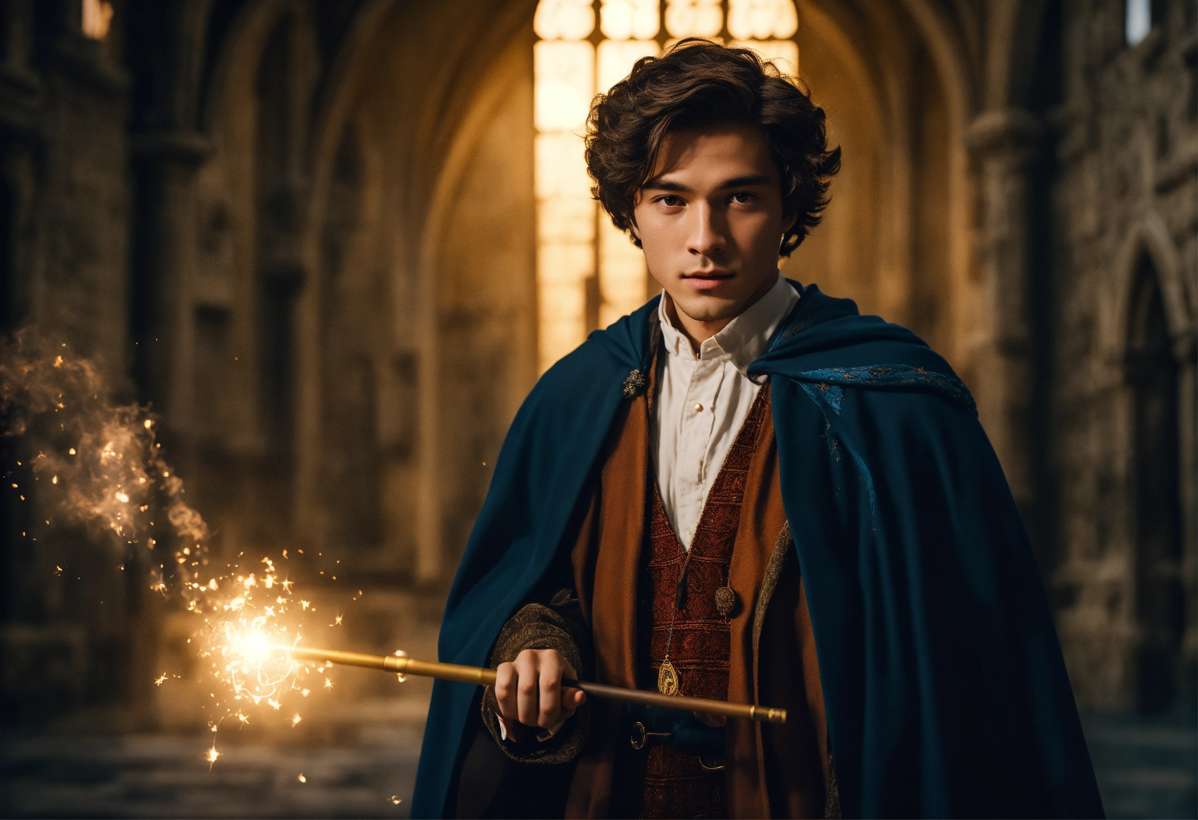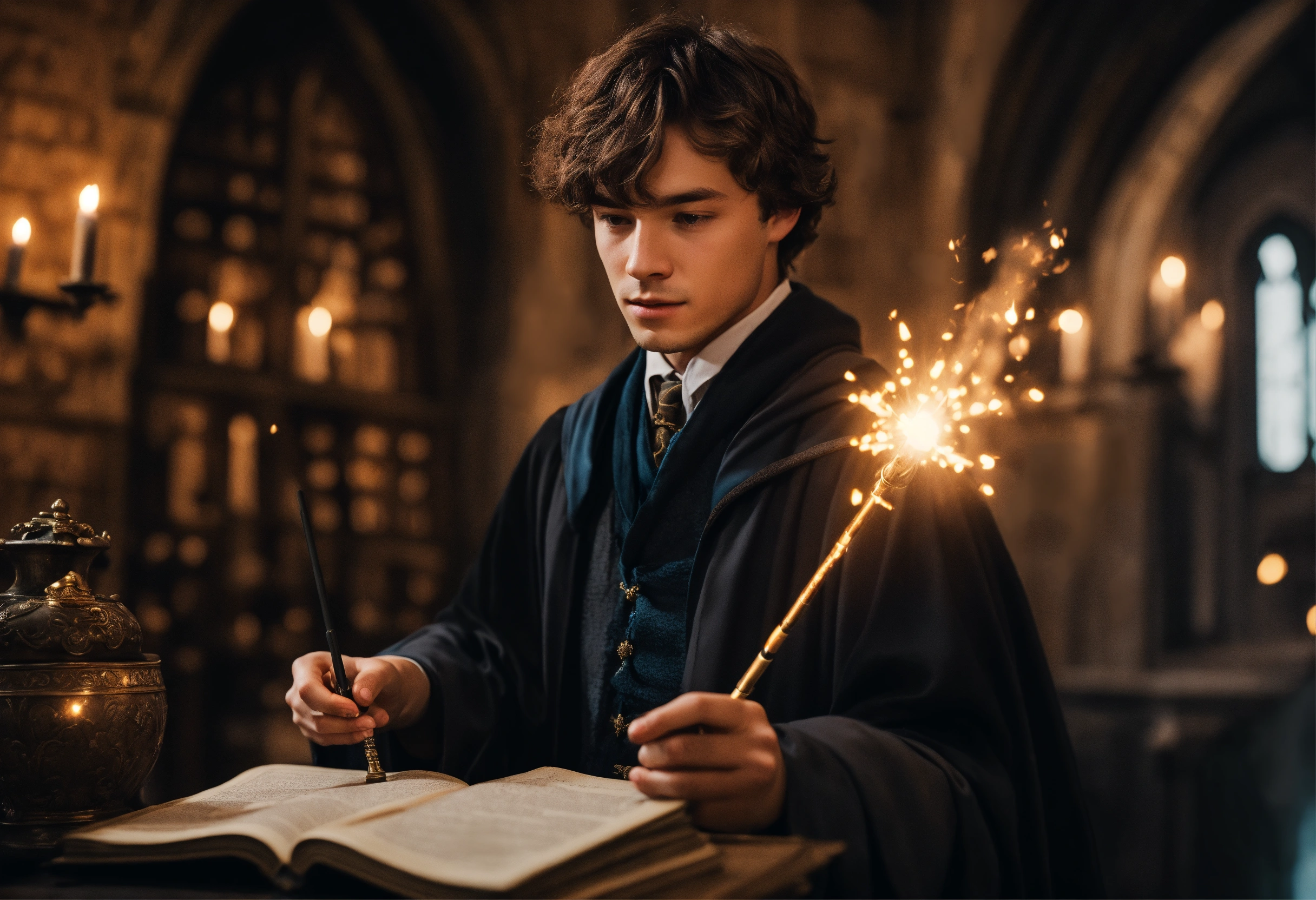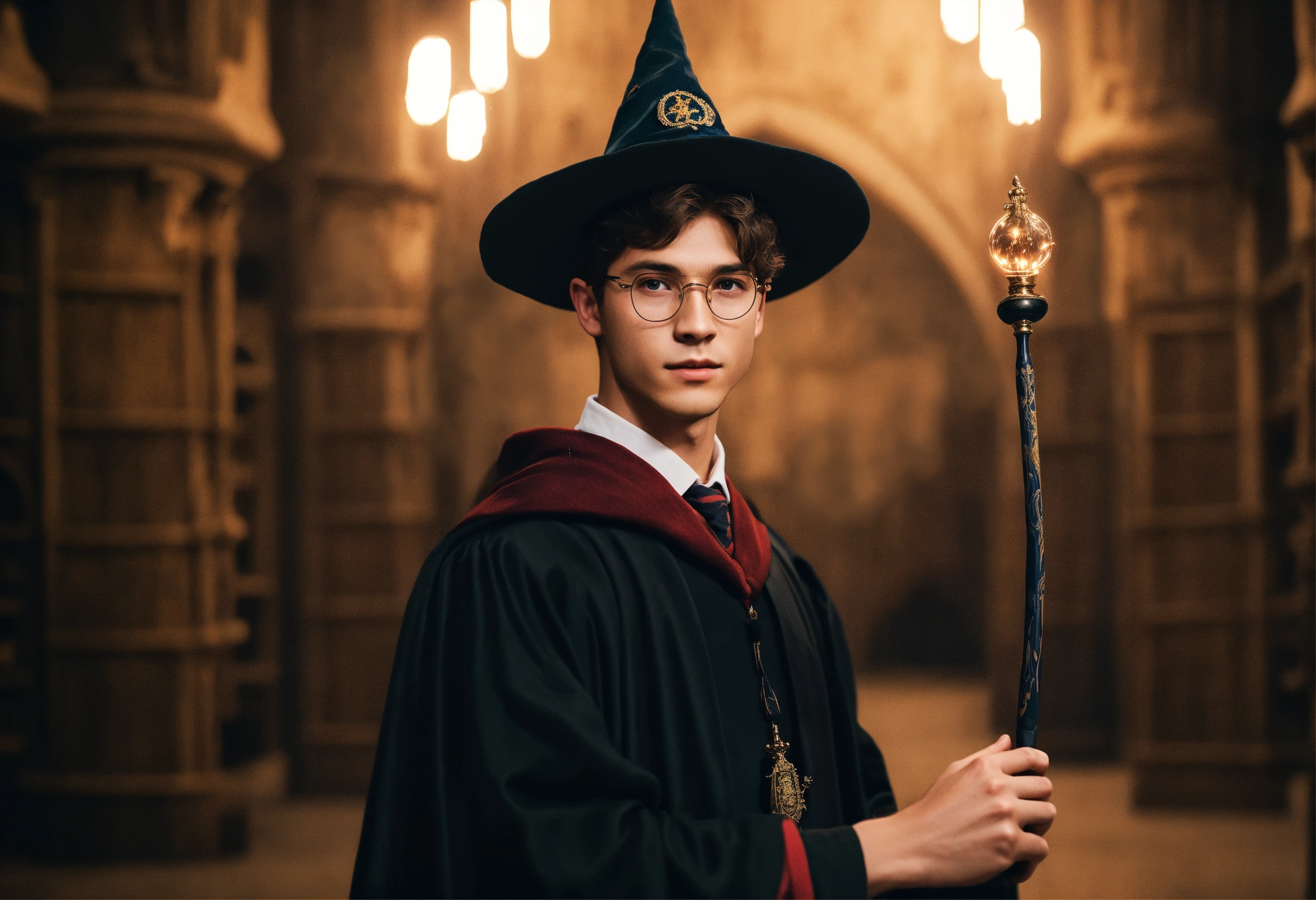 inside hogwarts with a magic wand in his hand 2023 year