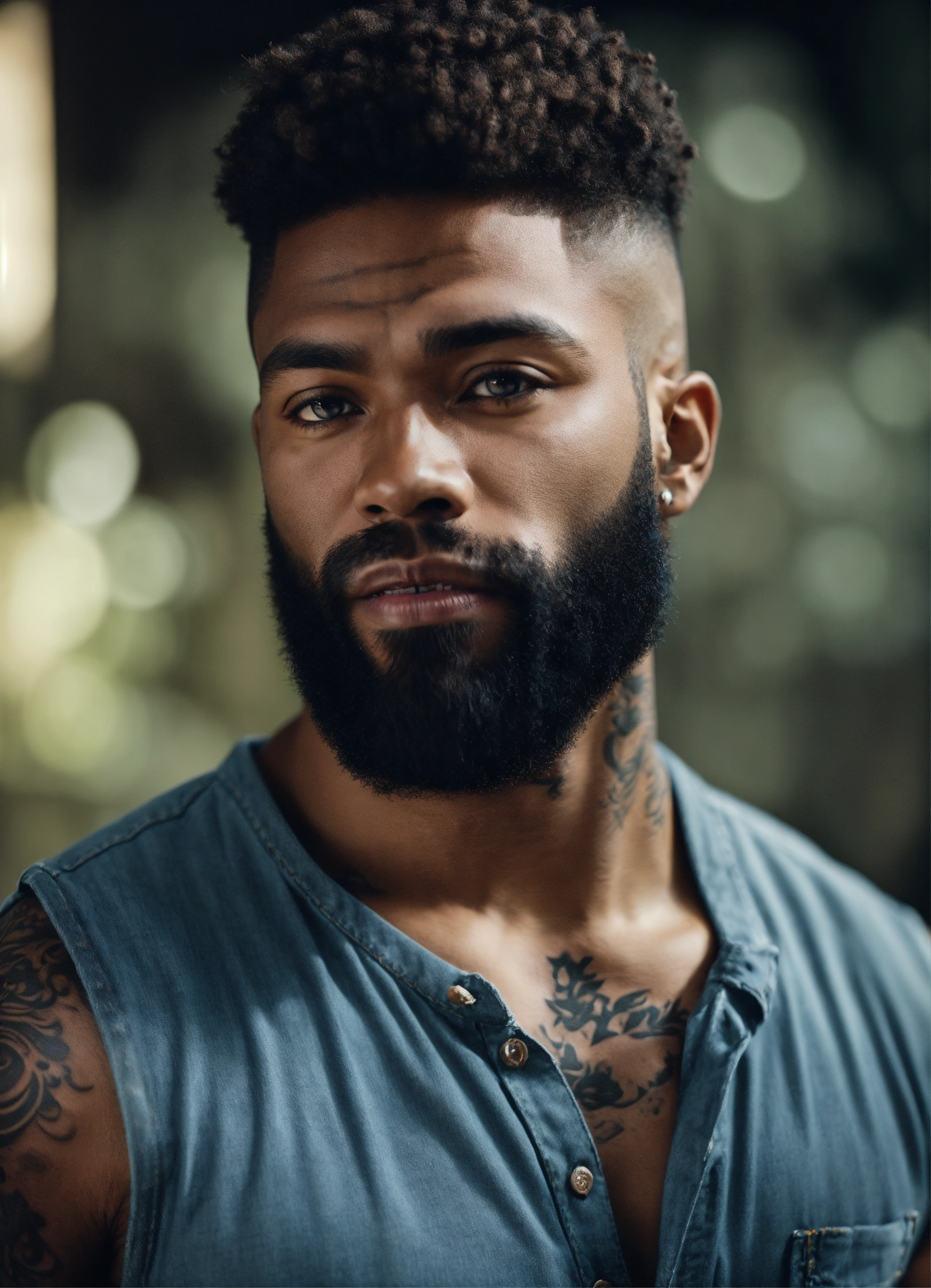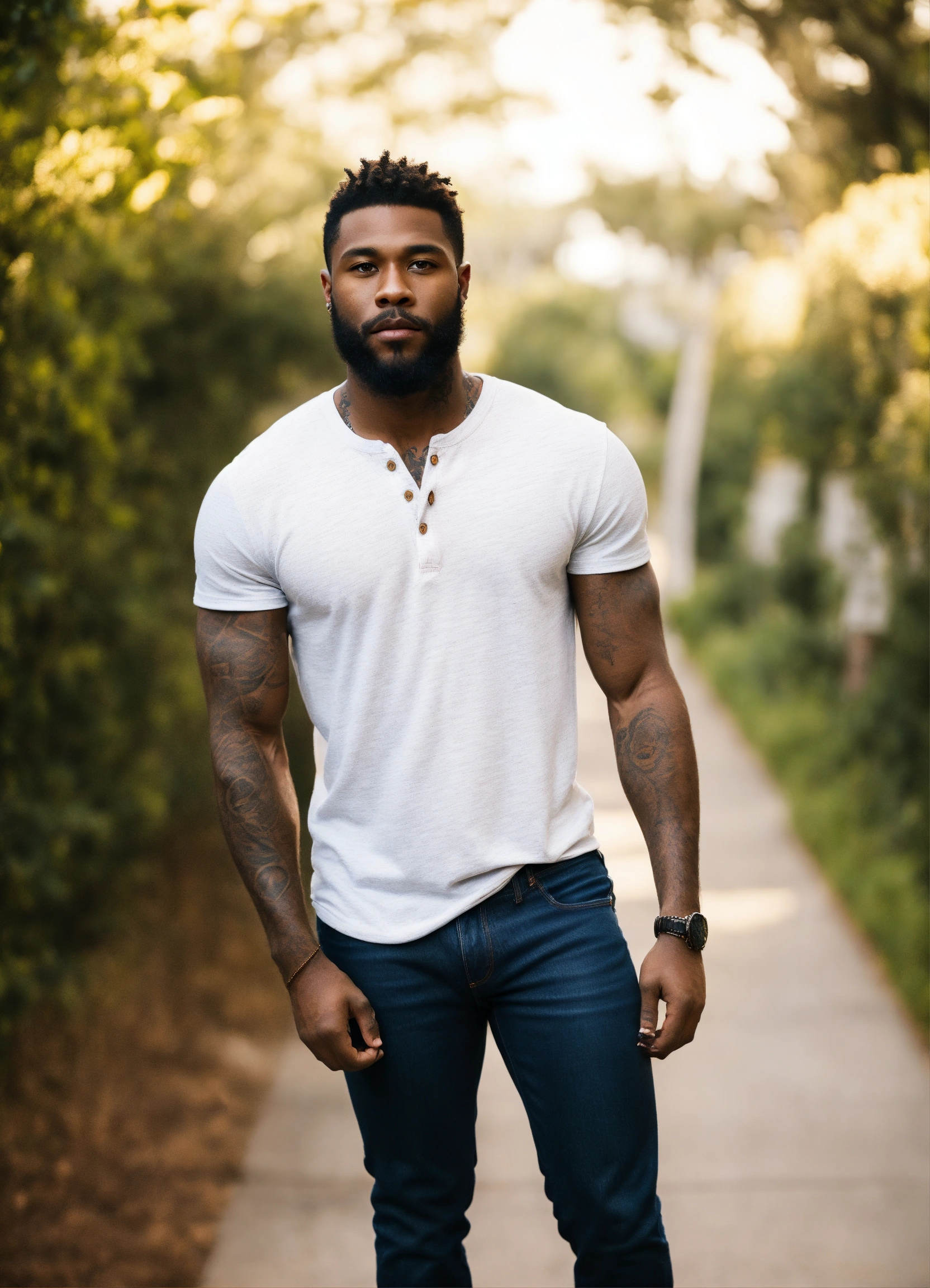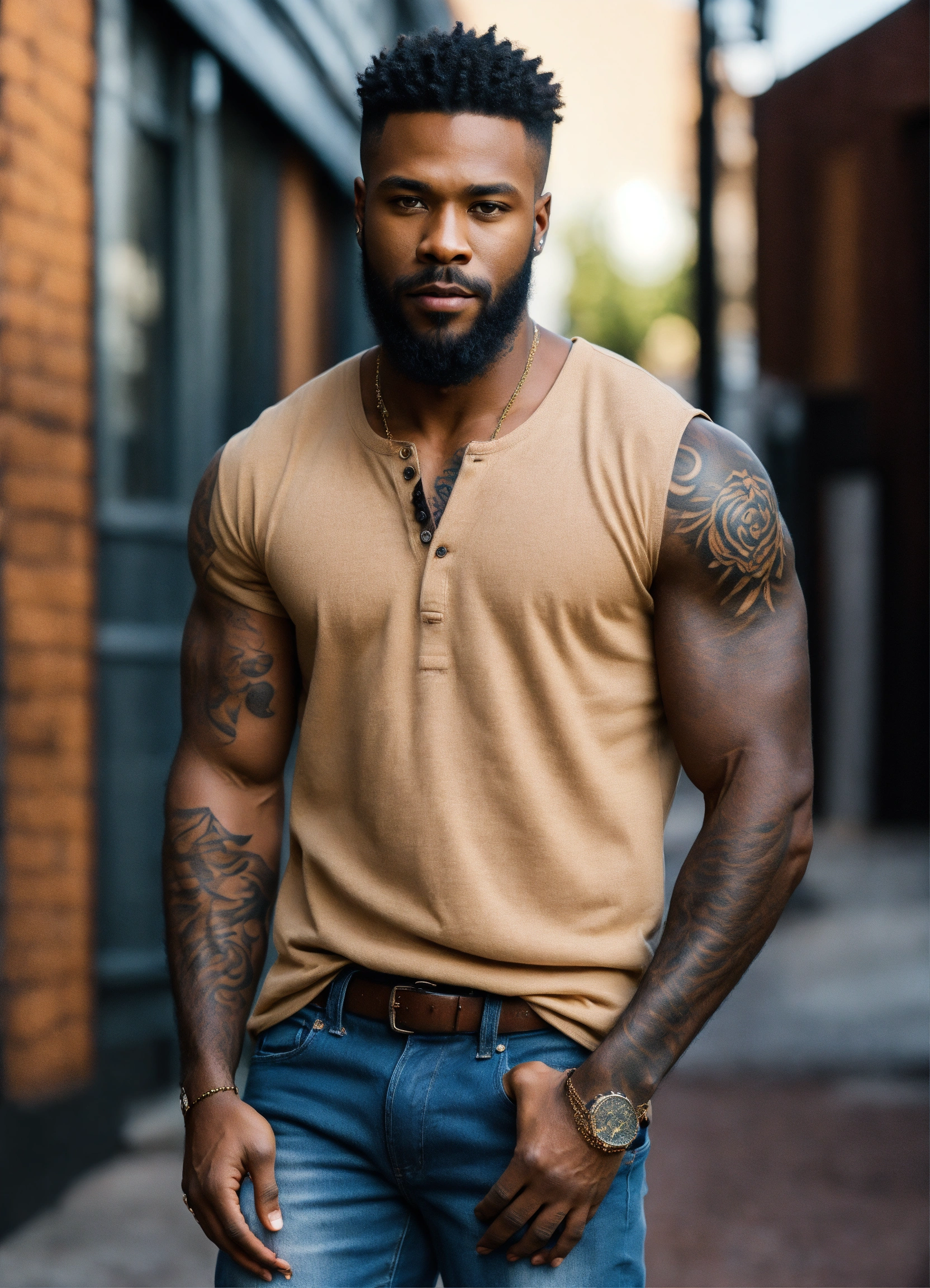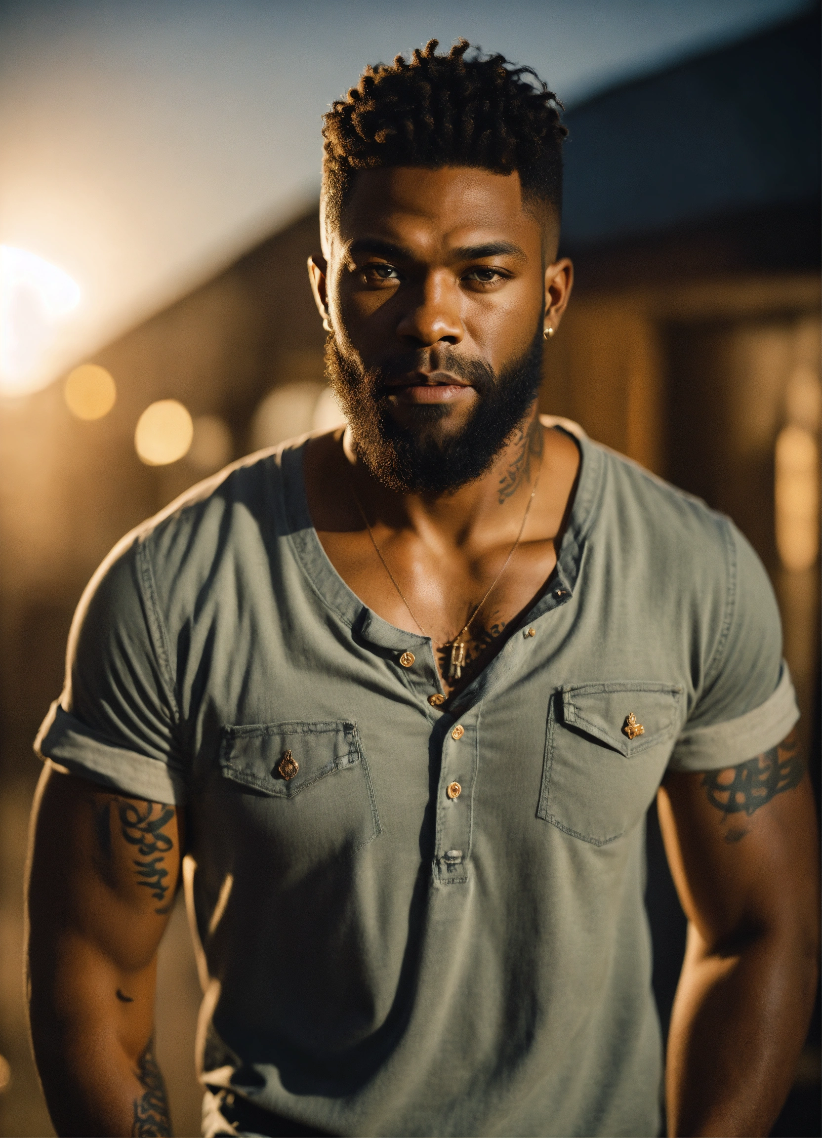 Handsome black male, werewolf, light eyes, beard, wearing jeans and henley shirt, tattoos on arms and chest