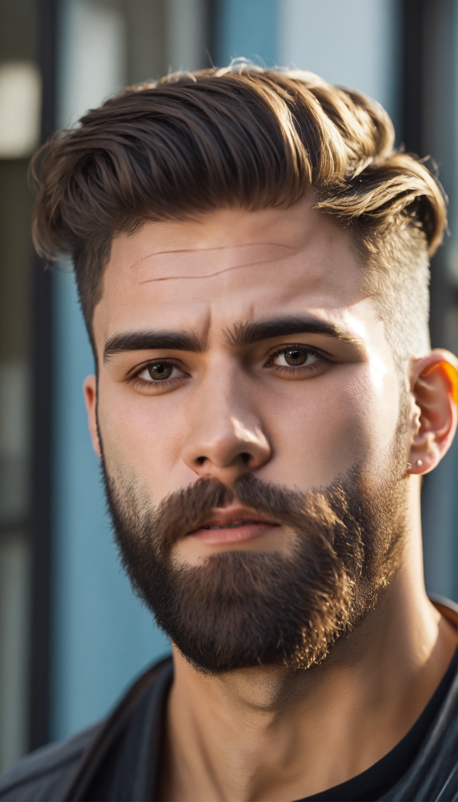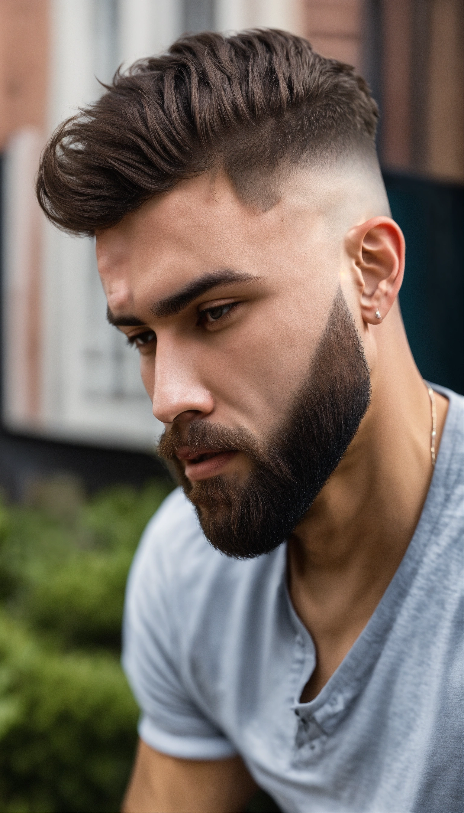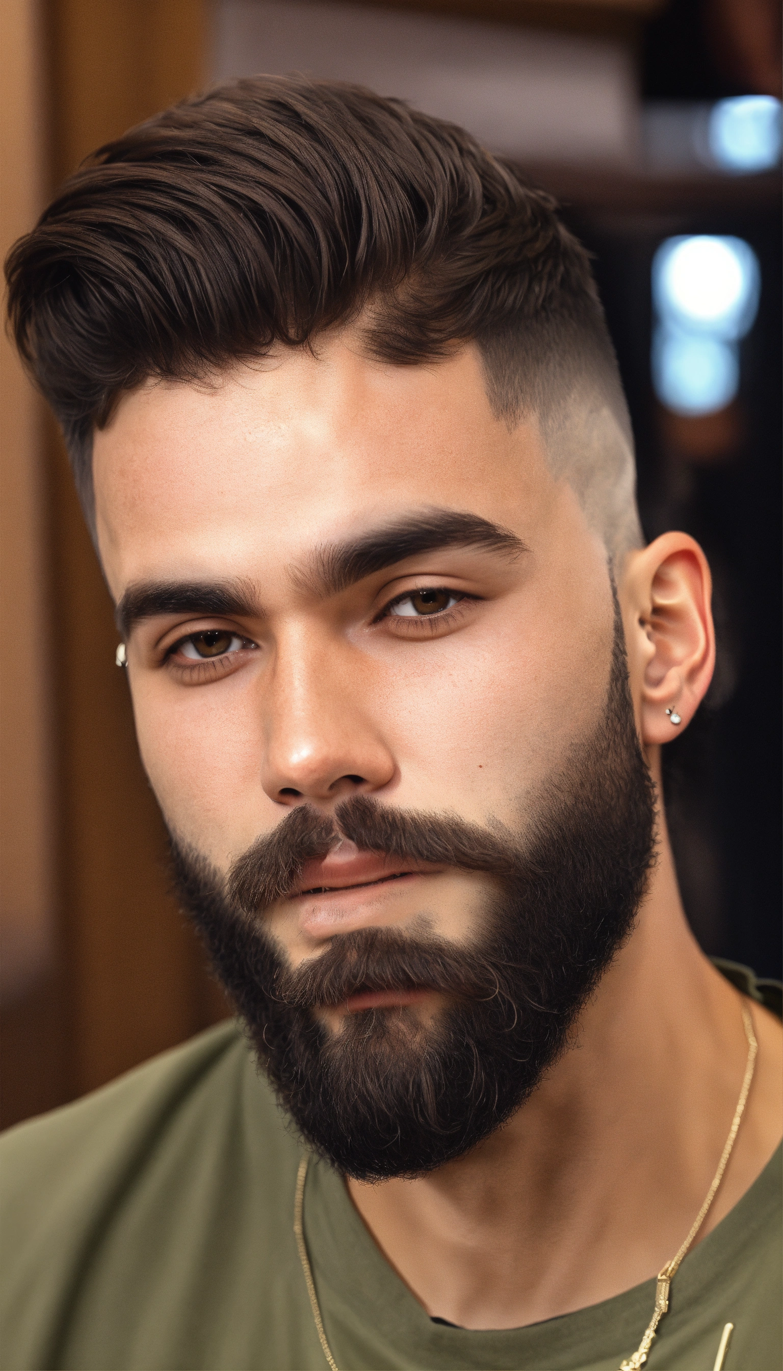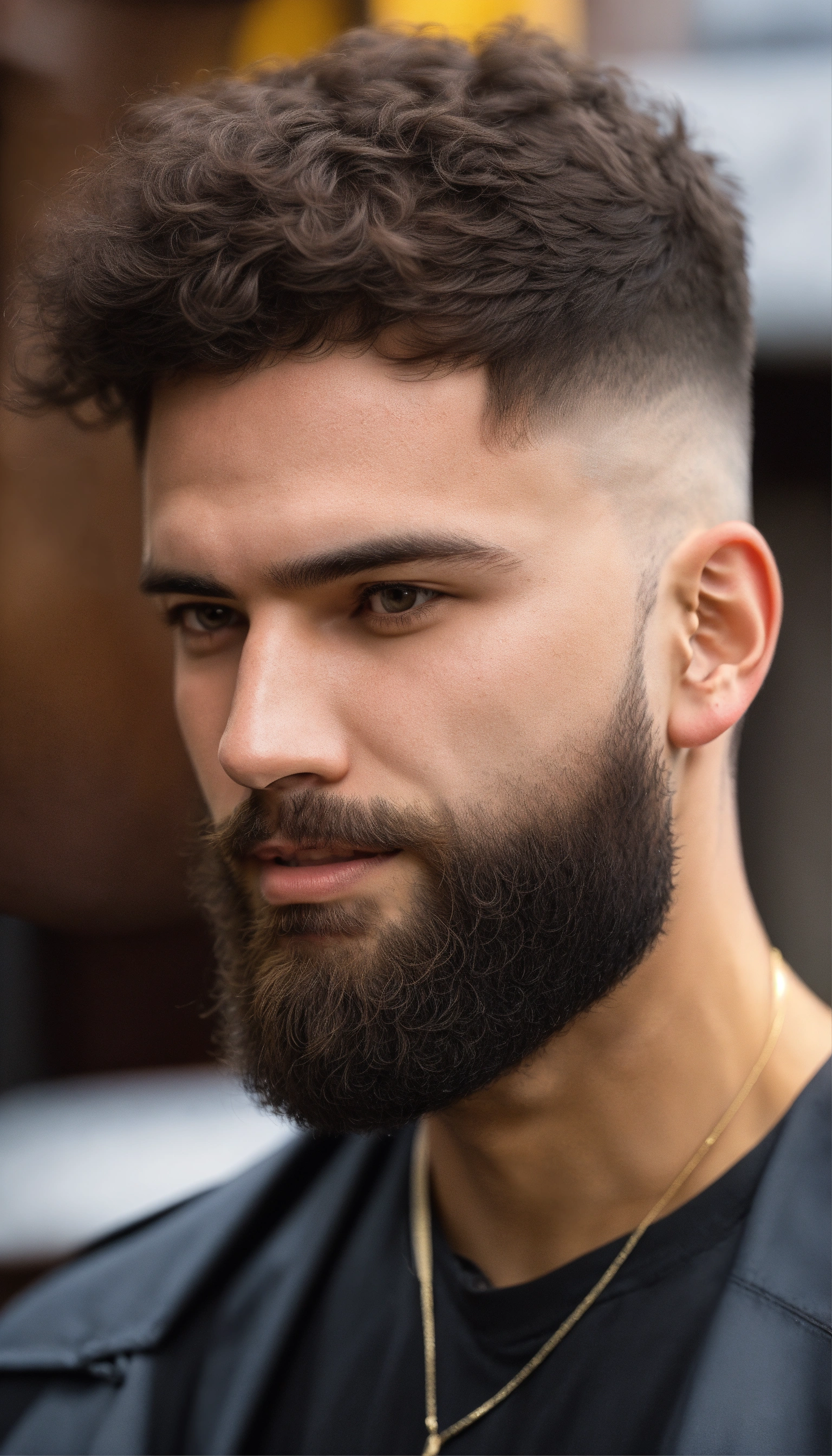 Man with a zero fade haircut and a stubble beard with faded on the side of the beard up to the sideburns