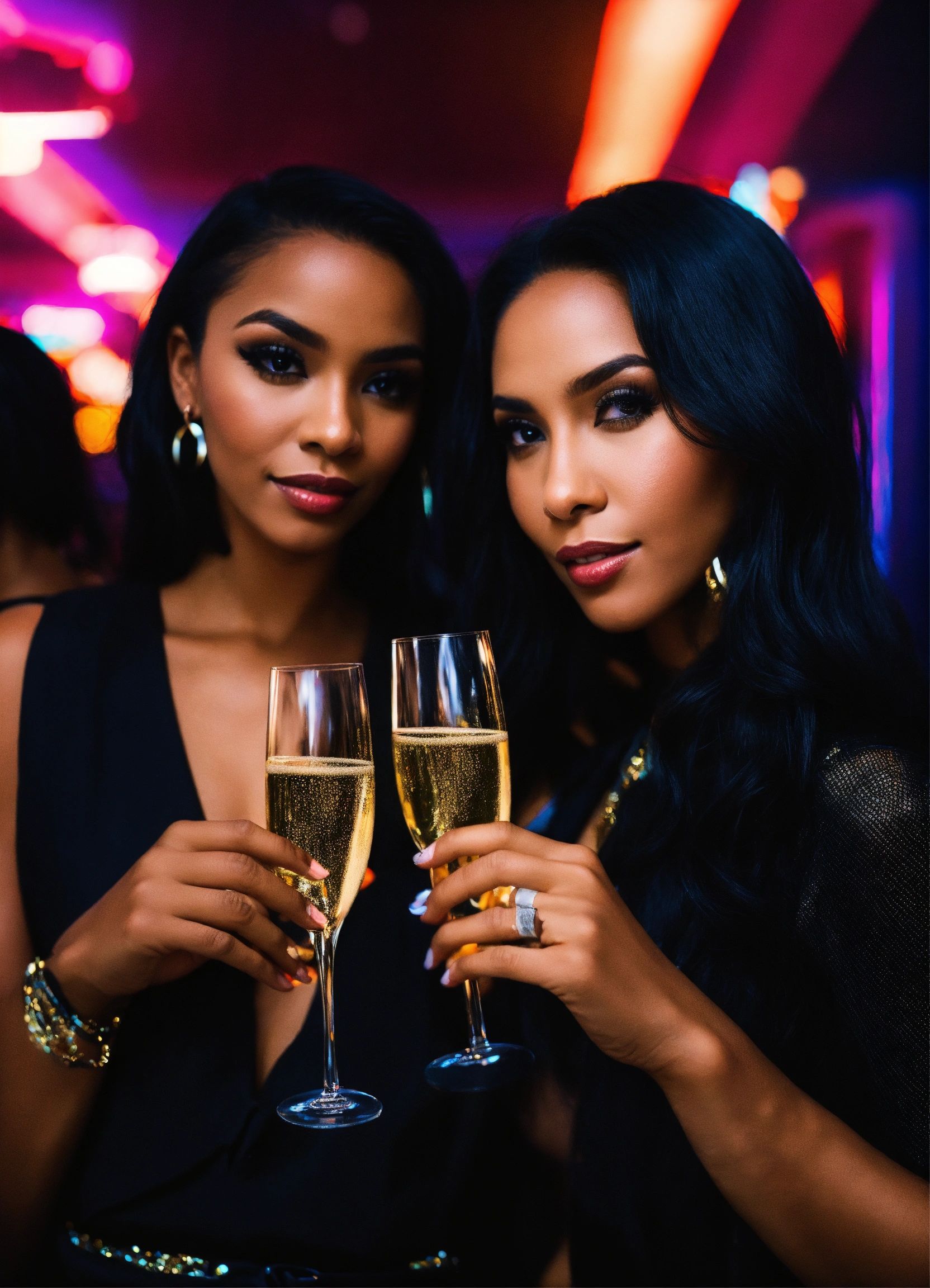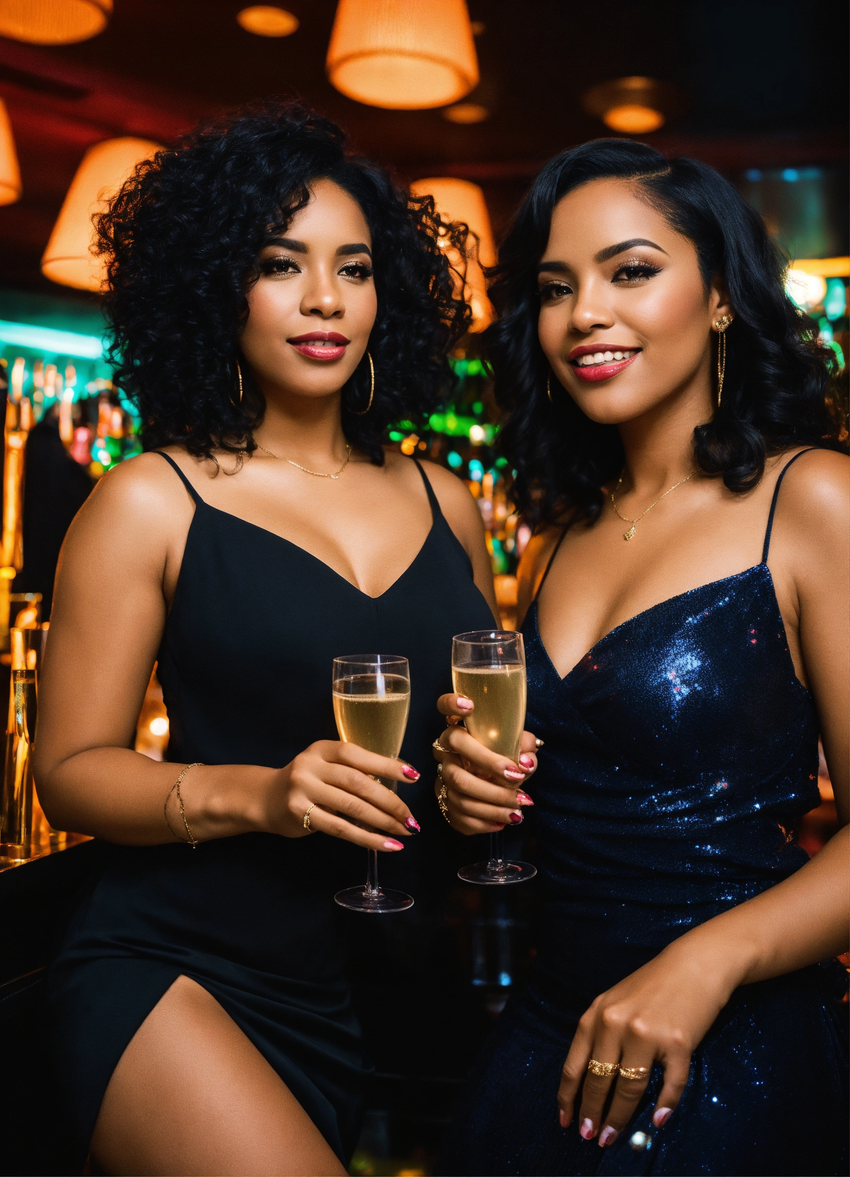 Two dominican women in all black semi formal clothing drinking champagne in a classy nightclub