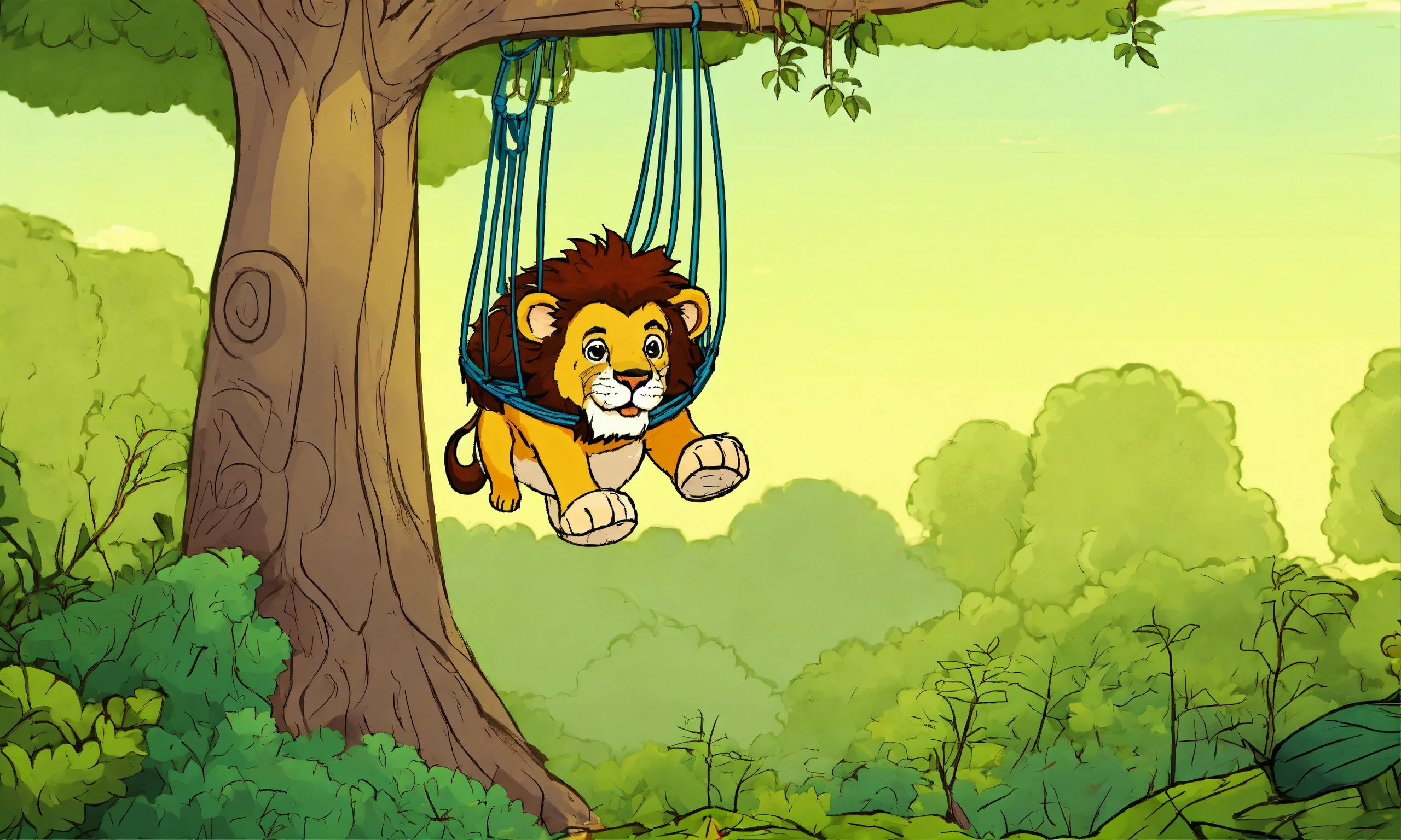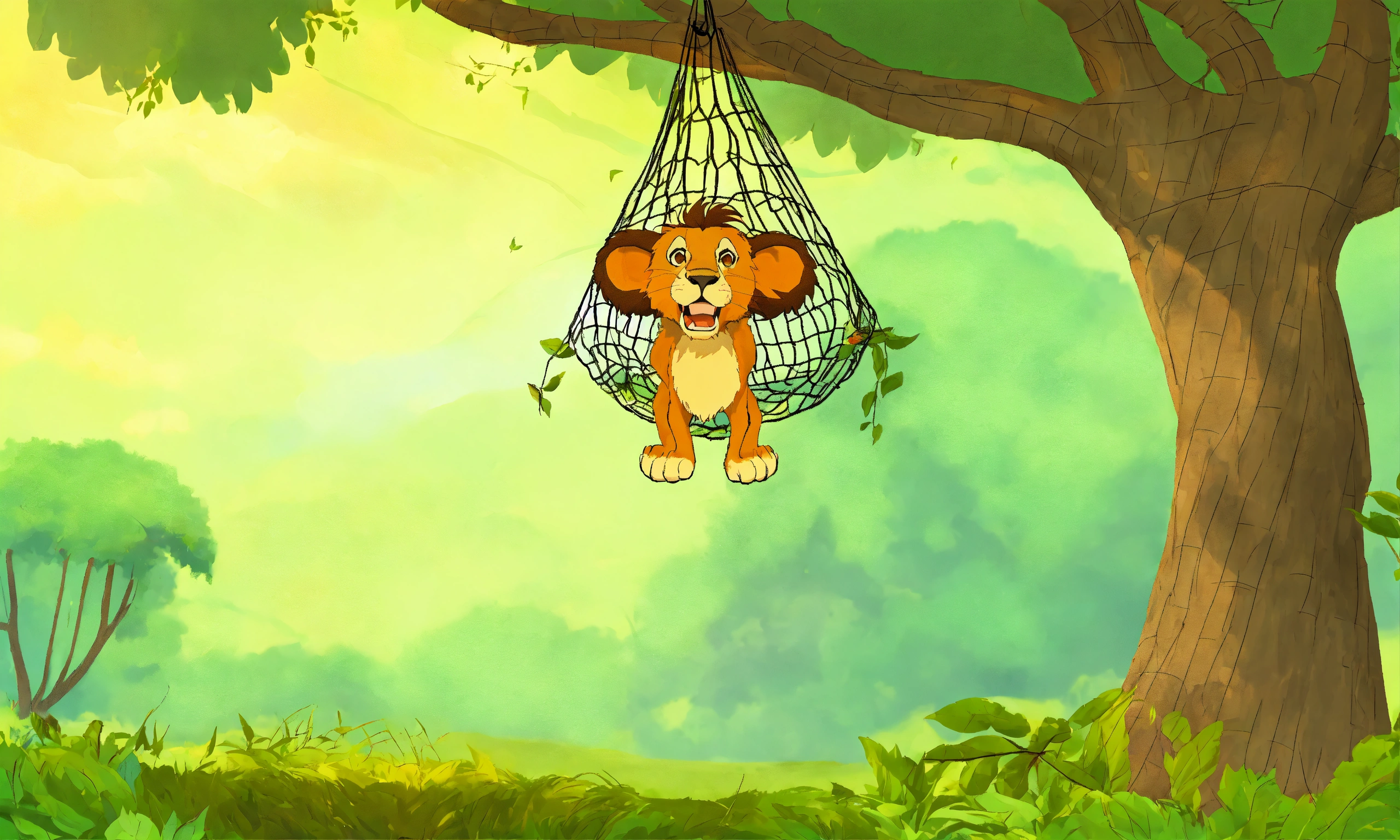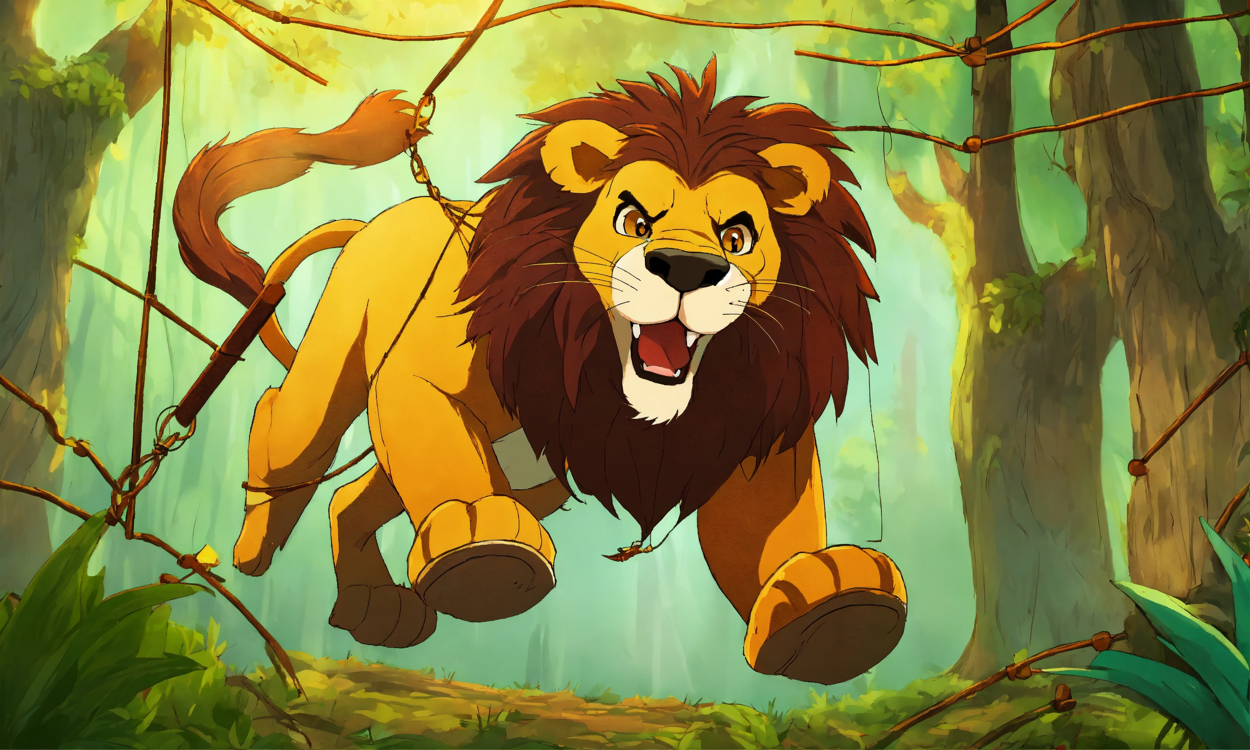 Cartoon a big lion gets trapped in a net in the forest and hangs upside down from a tree