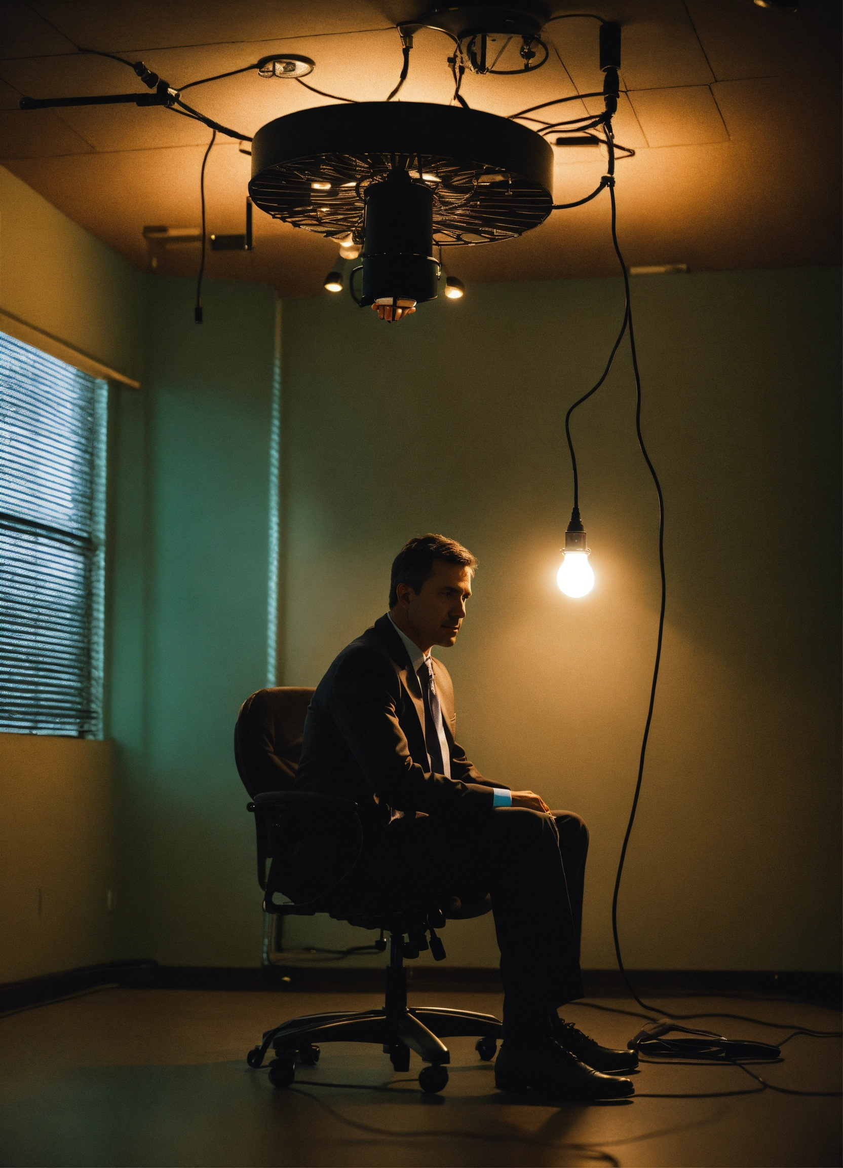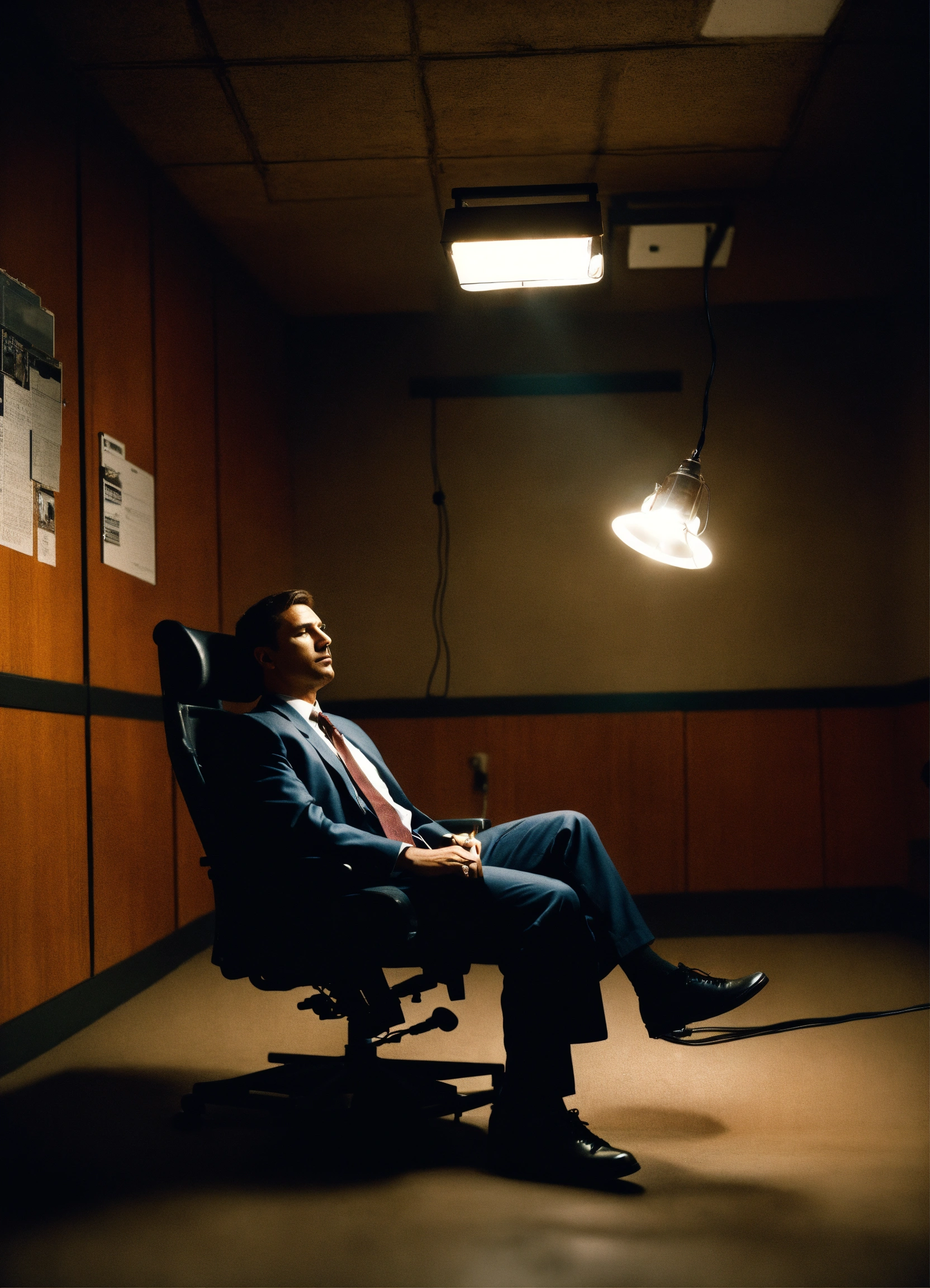 An fbi agent sitting in a chair in an interrogation room, there is nothing else in the room except the man and chair but he is lit by a small lightglobe hanging from a black cable from the ceiling, cinematic movie still