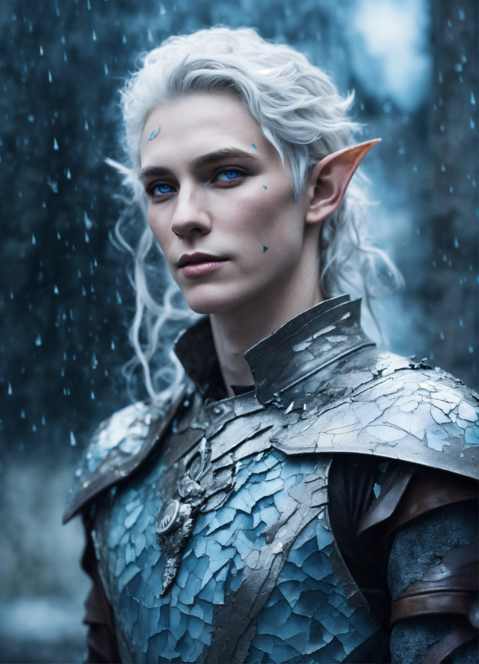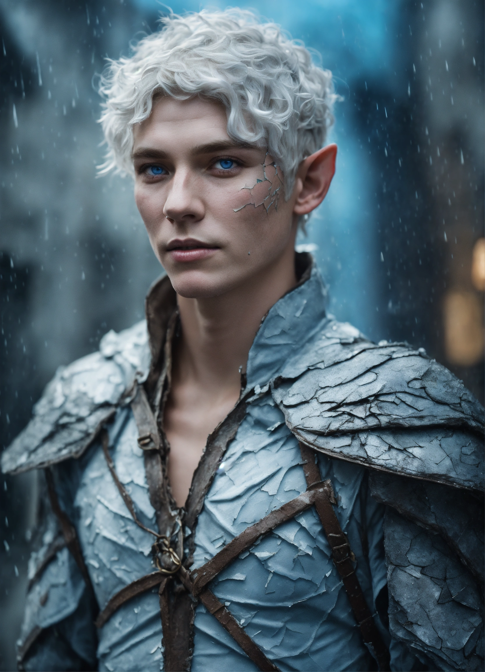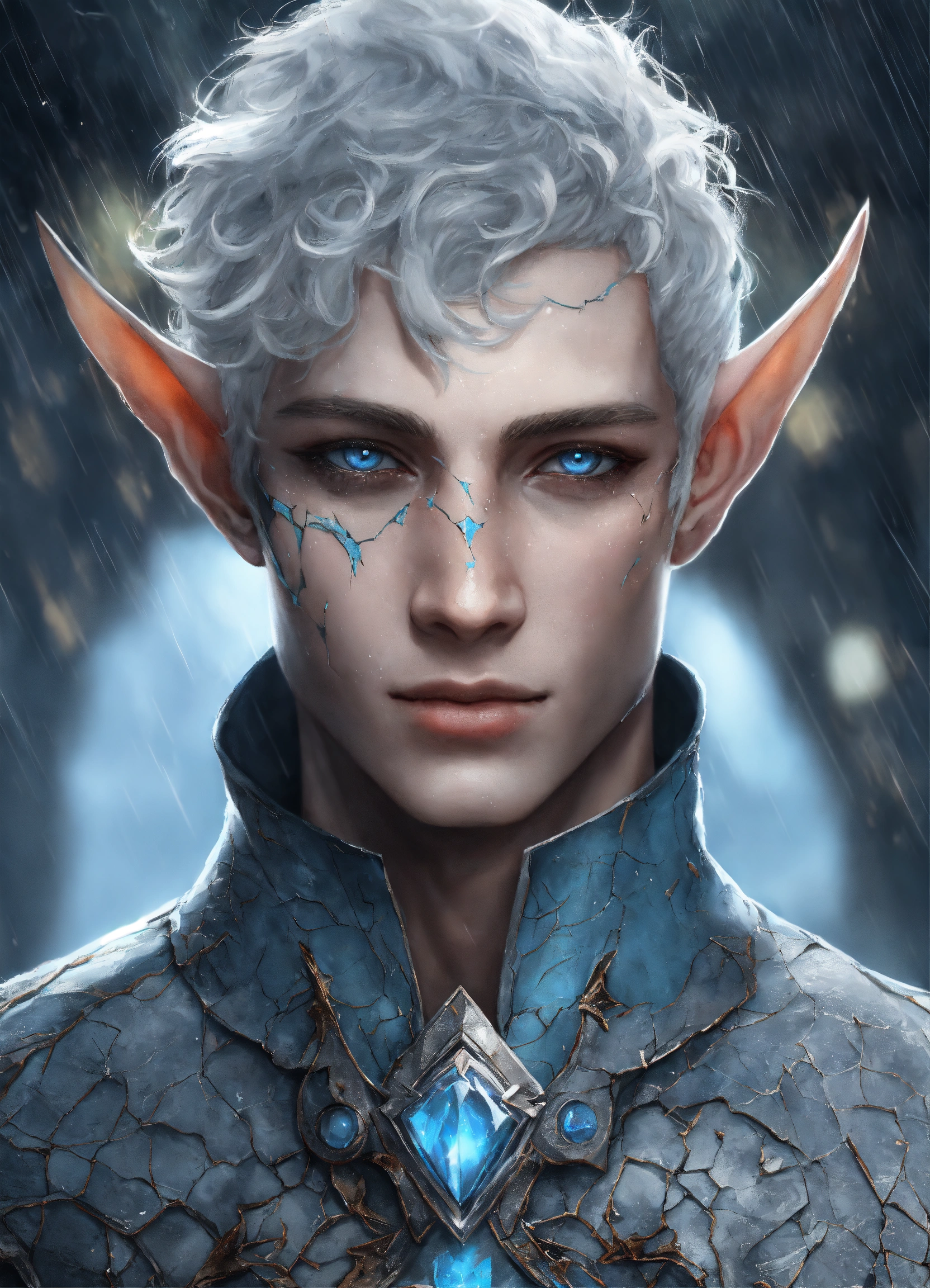Fantasy portrait of a ash-grey skinned elf, masculine, androgynous, shattered and cracked skin, pale blue eyes, sickly, soft smile, glowing white curly hair, rainy castle background, ultra detailed