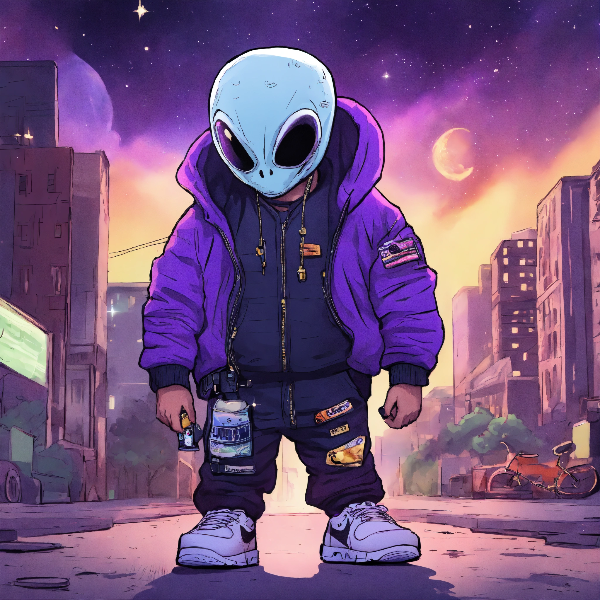 Criminal, alien face, jogging pants, nike airmax plus, pistol, drawing, art, 4k, cartoon style, bundles of dollar shines, city, galaxy purple