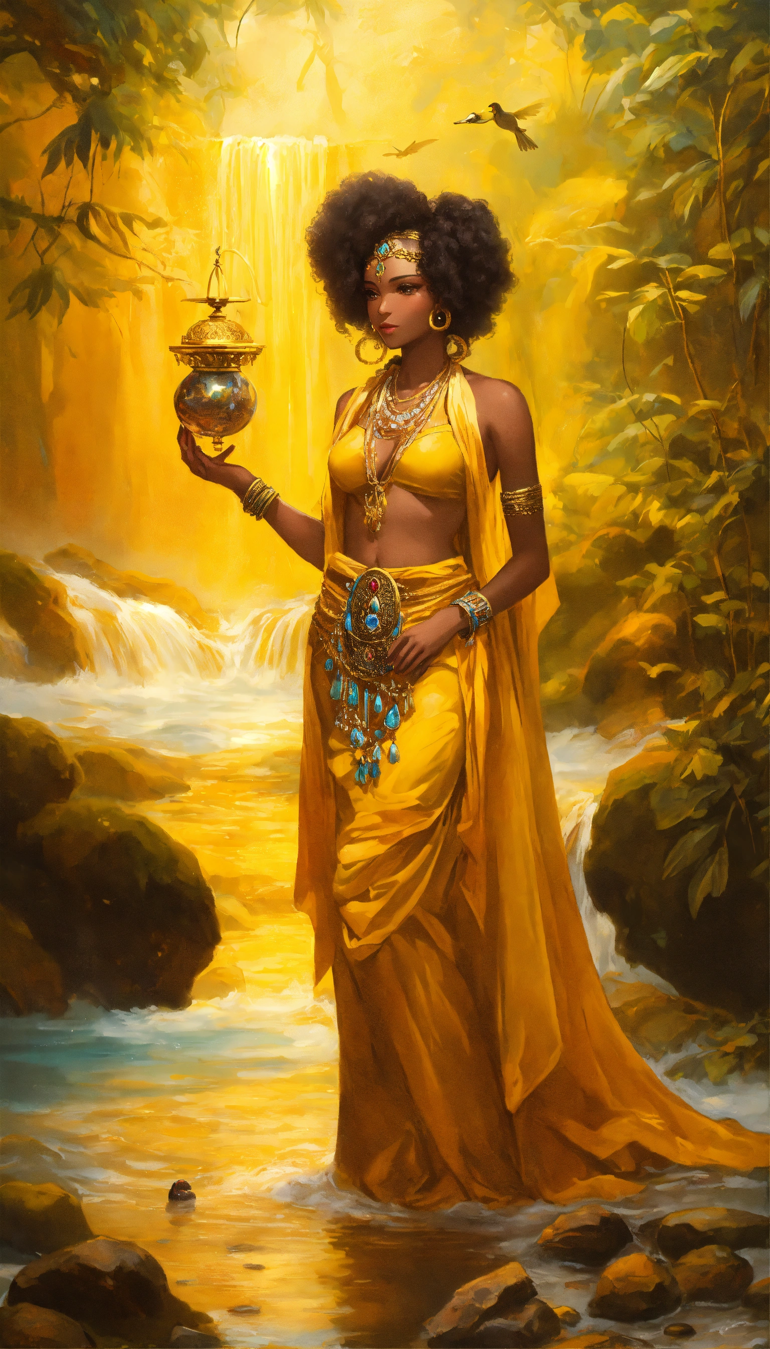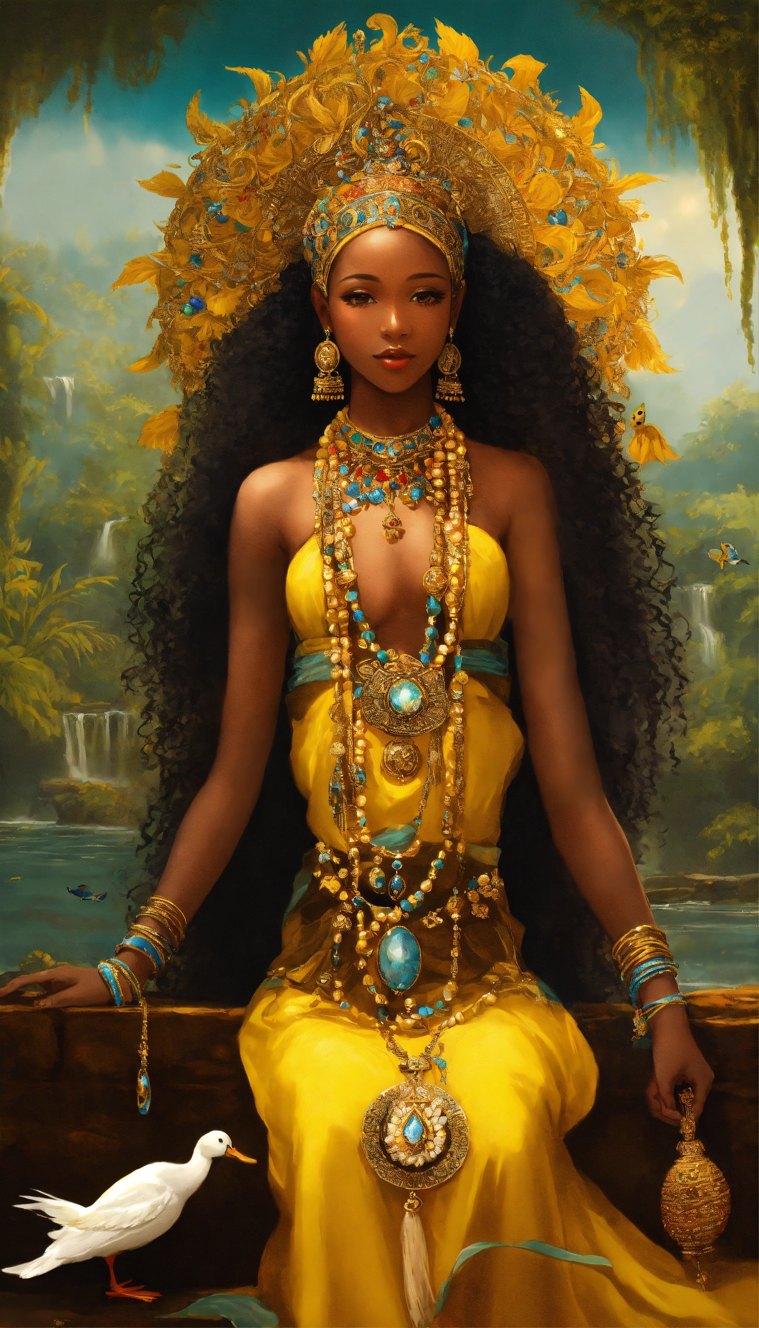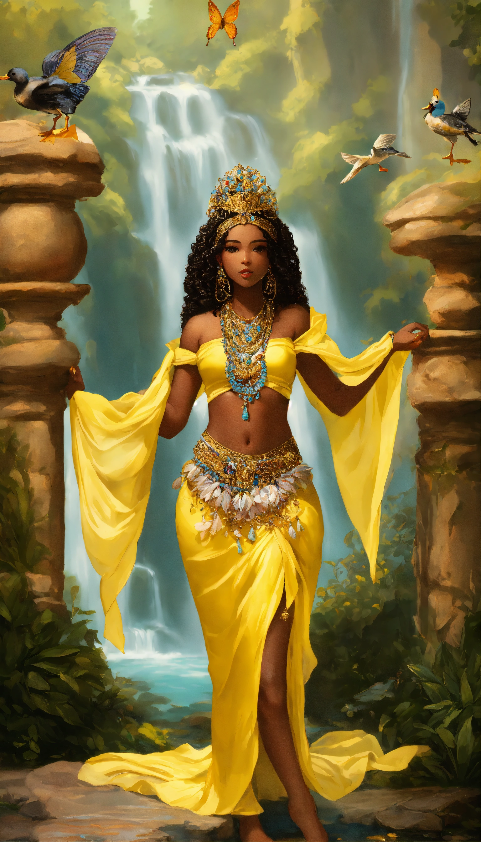 Oxum, in yoruba mythology and candomblé, is a female deity, a black woman, with afro-descendant hair associated with fresh water (waterfalls), love, fertility, prosperity and beauty. light colored clothing, such as yellow, which symbolizes her connection with gold and the sun, long skirts, often full and decorated with embroidery or lace. - head adornments, such as crowns or tiaras, decorated with precious stones, shells, gold, bracelets, necklaces and other accessories that symbolize your wealth and femininity, long wavy or curly hair, which can be loose or adorned with braids and ornaments, holding a mirror, which symbolizes vanity, can hold a straw fan, which represents sweetness and generosity, fish, ducks and butterflies, often represented in a graceful and elegant posture, in waterfalls demonstrating their femininity and beauty, she is often portrayed with a soft smile and expressive eyes that reflect compassion and wisdom.