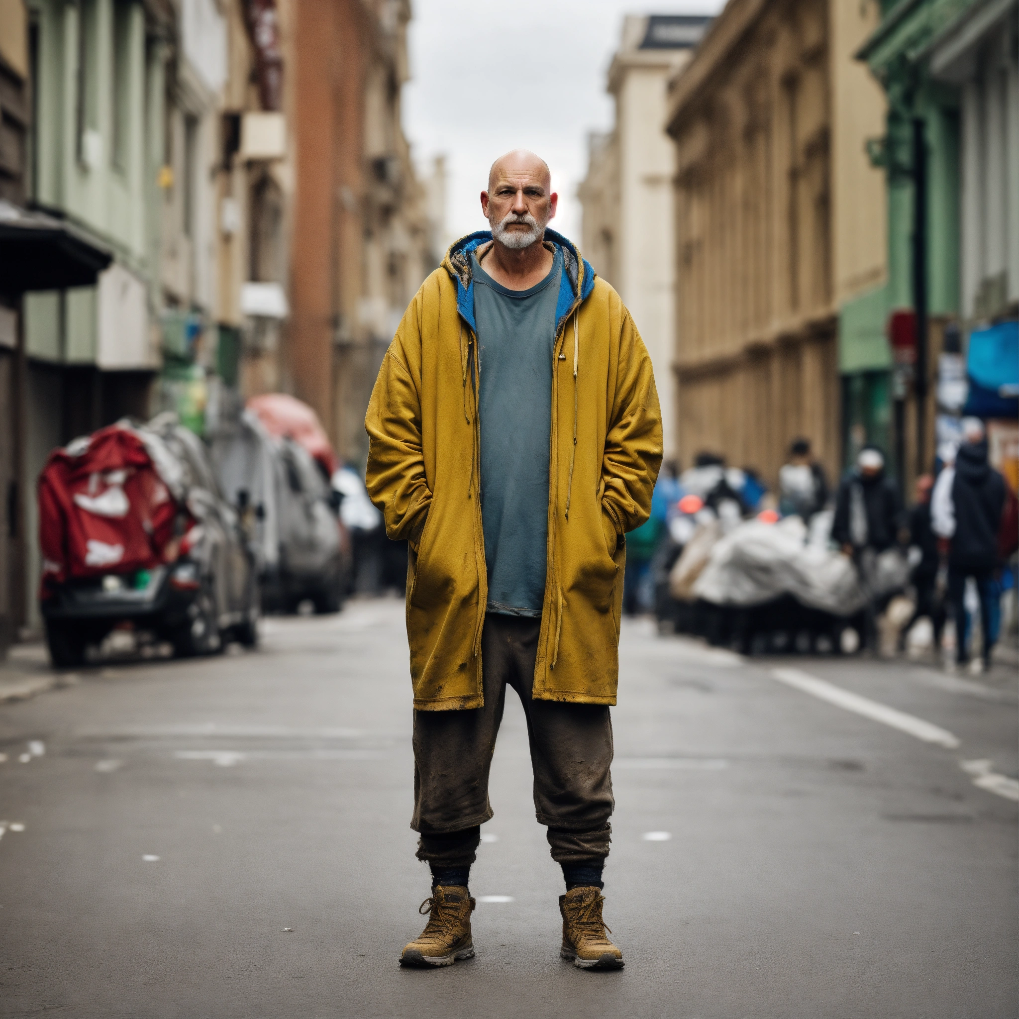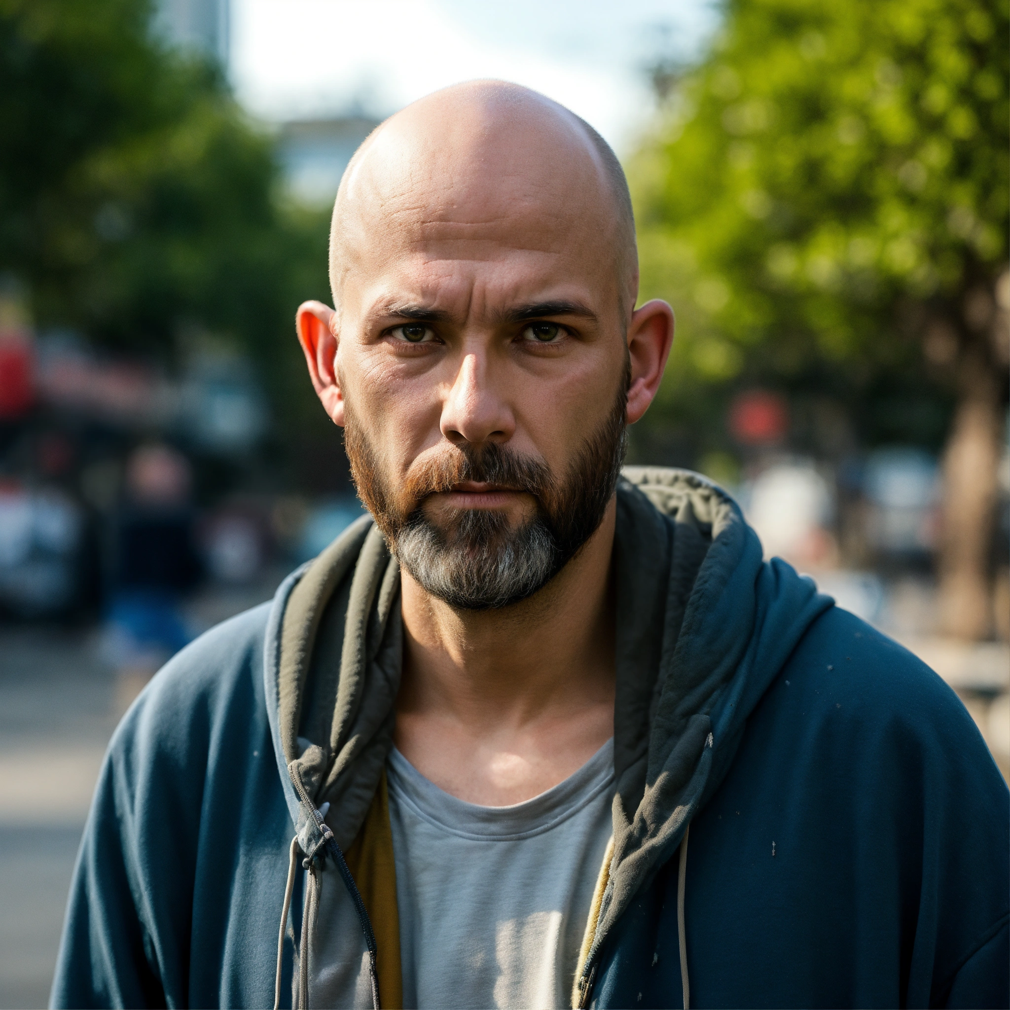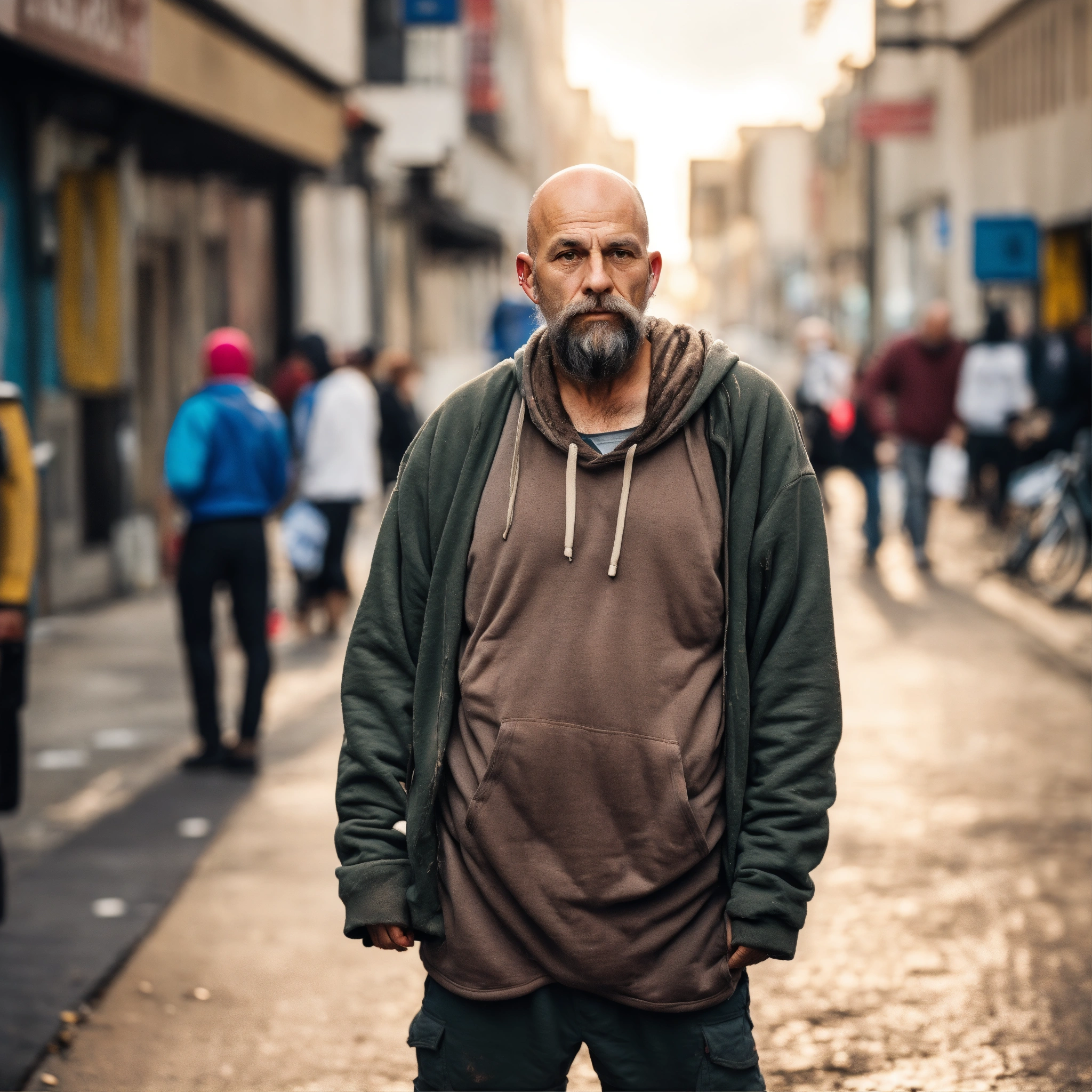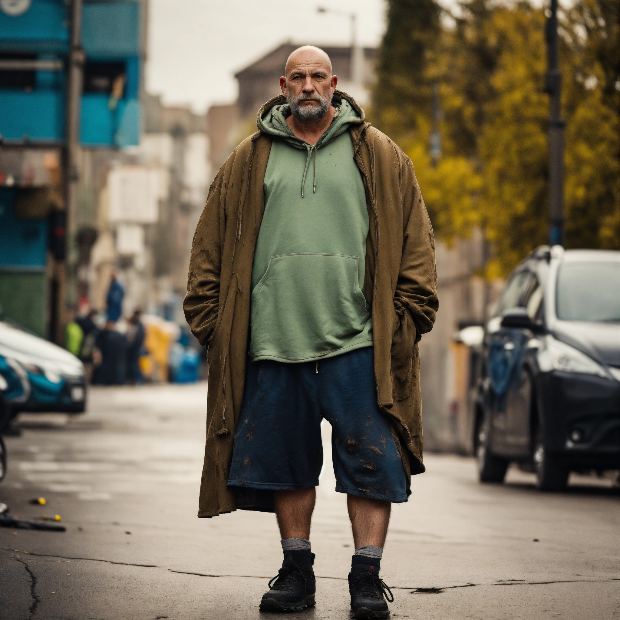 A huge bald homeless man, without beard, large ears, wearing dirty shorts and a hoodie, standing in the street