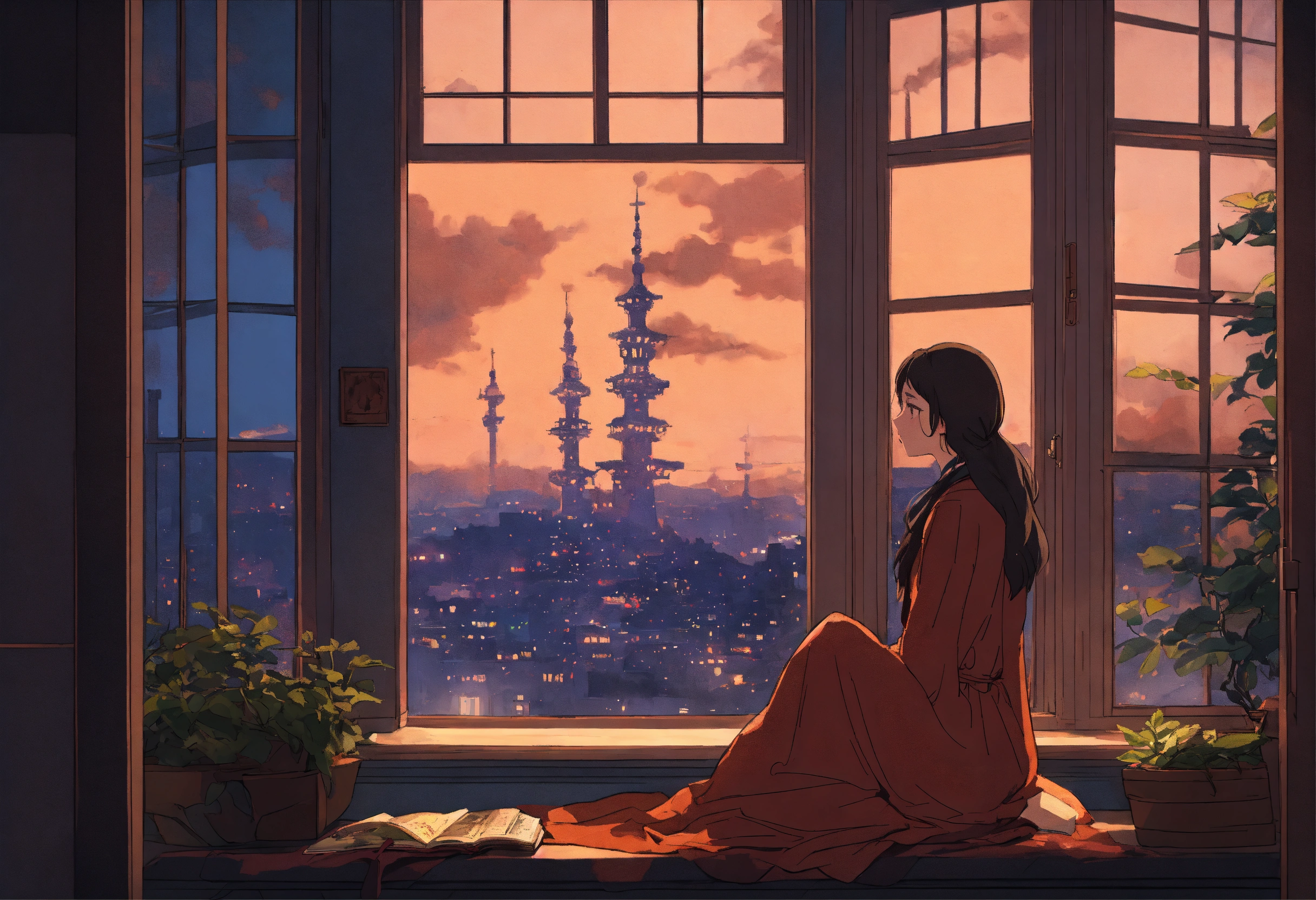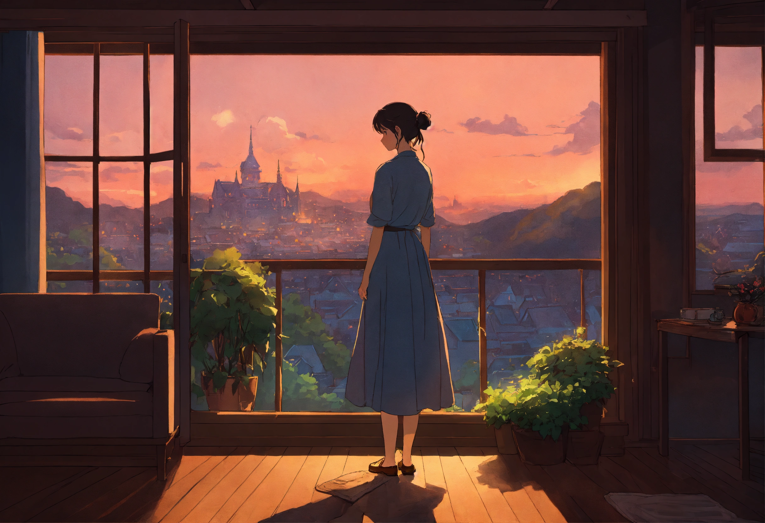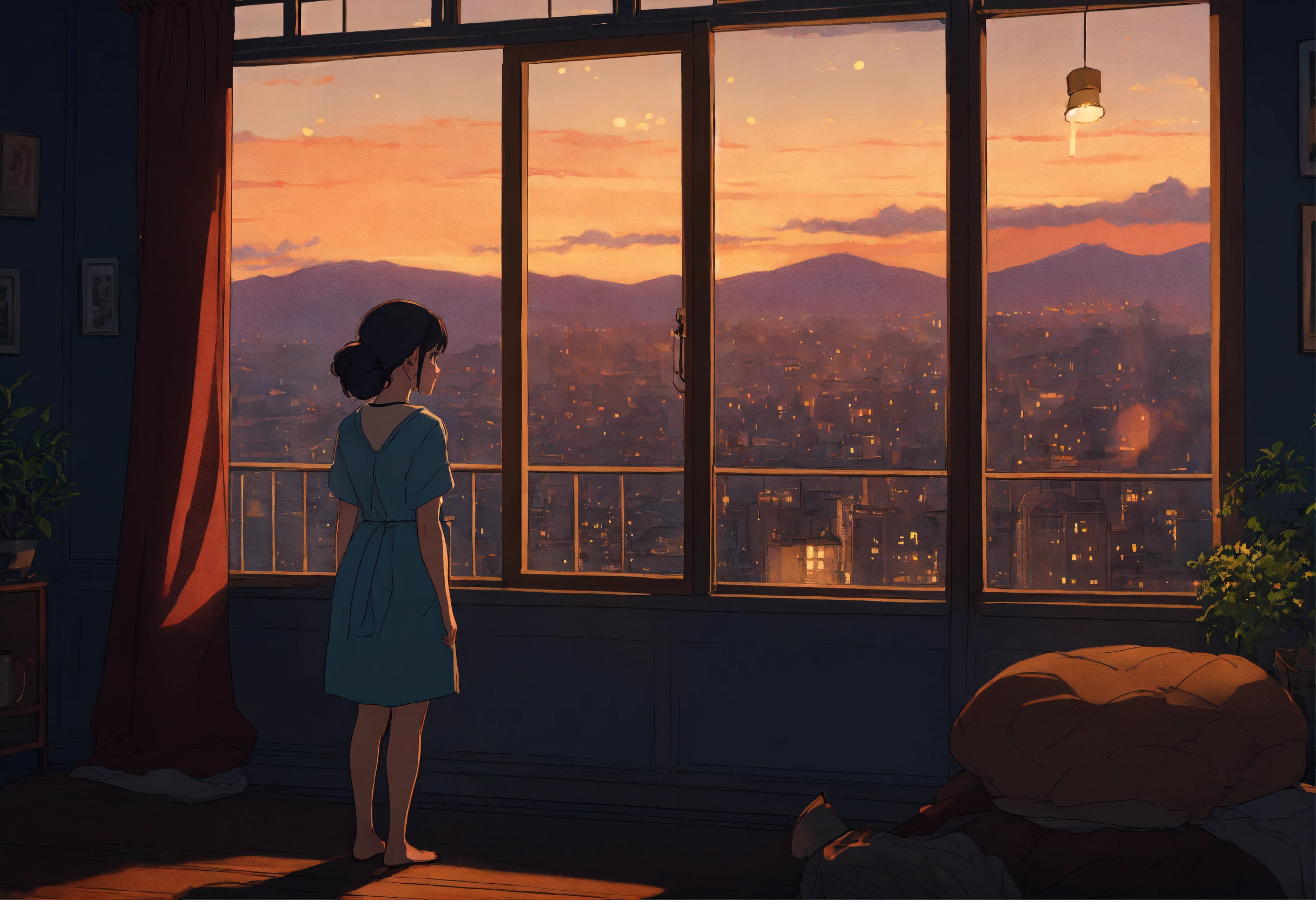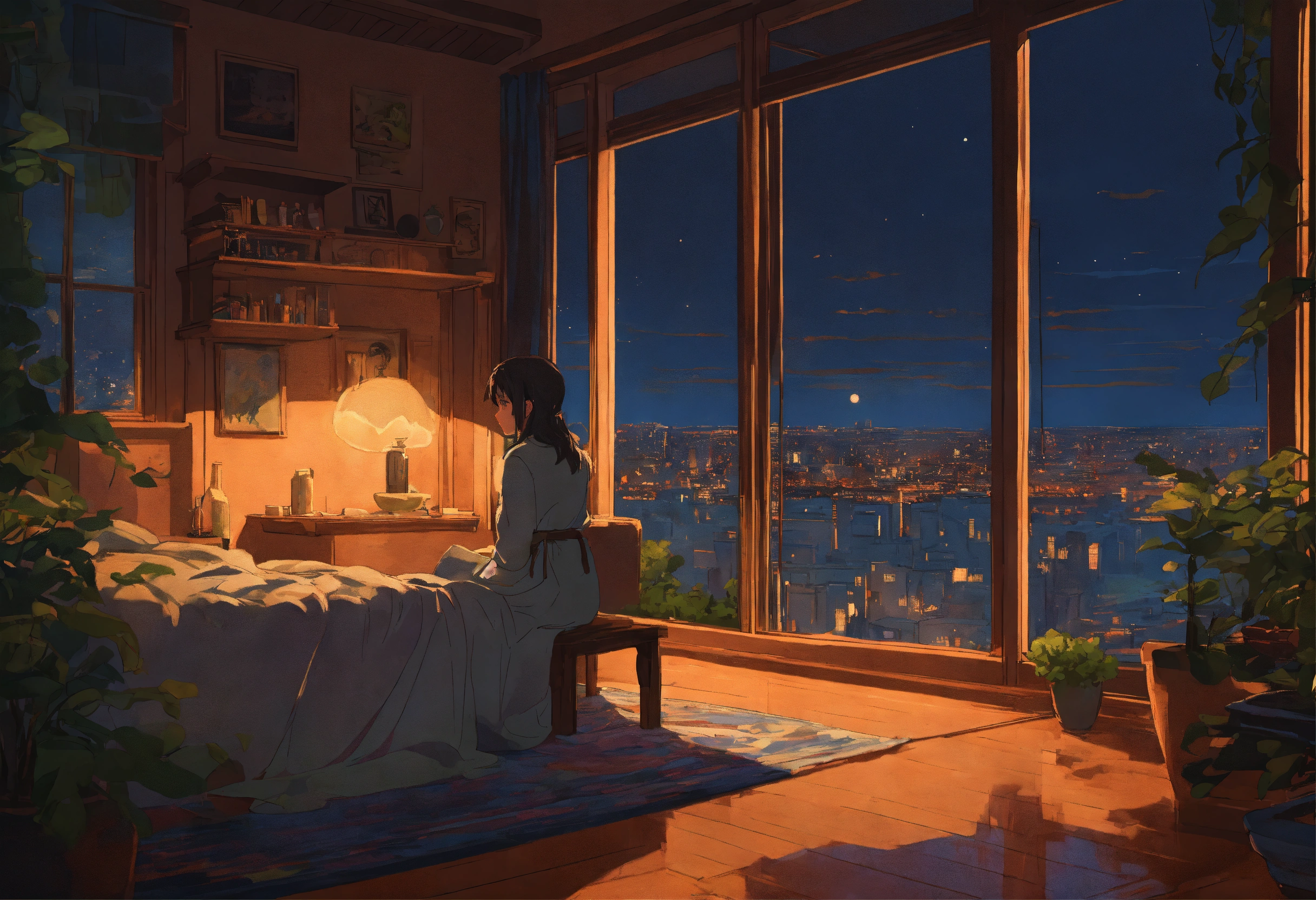 In a studio ghibli-inspired style, depict a woman in a room with ambient lighting. she looks contemplative as she gazes out of the window, which reveals a nighttime cityscape