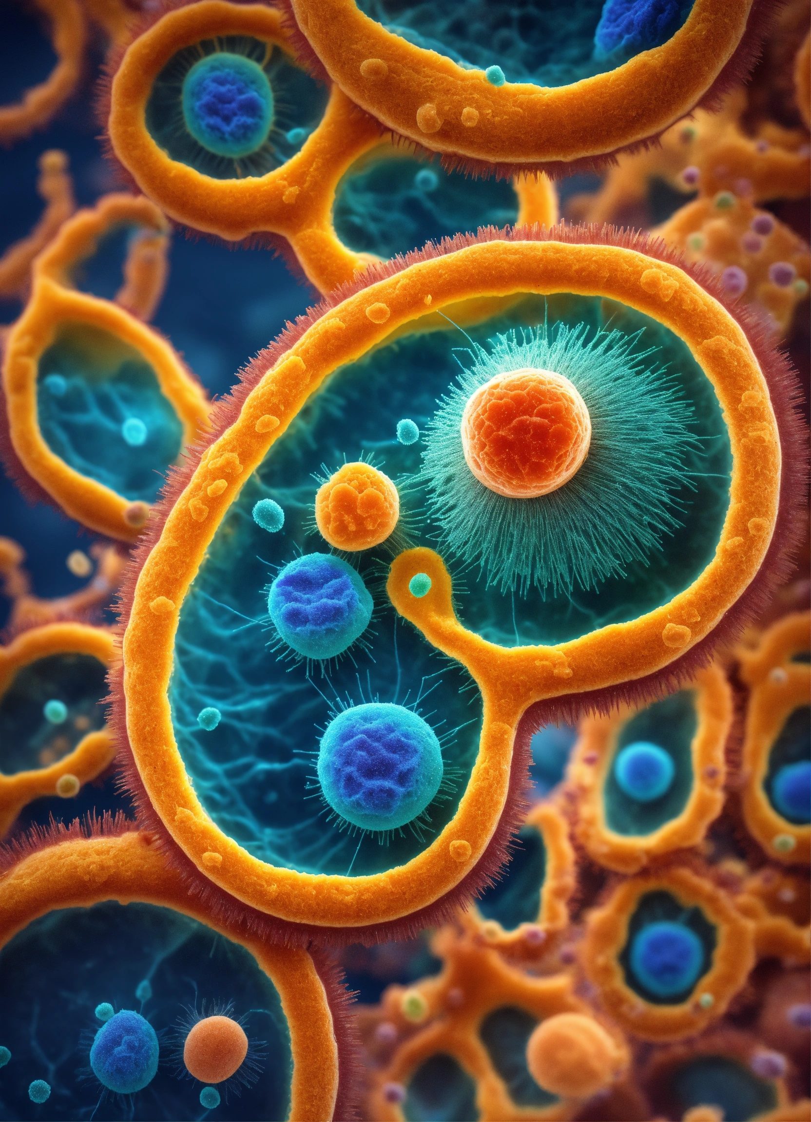 Adherent eukaryotic cells seen through a microscope during cell division, no animation, realistic photo