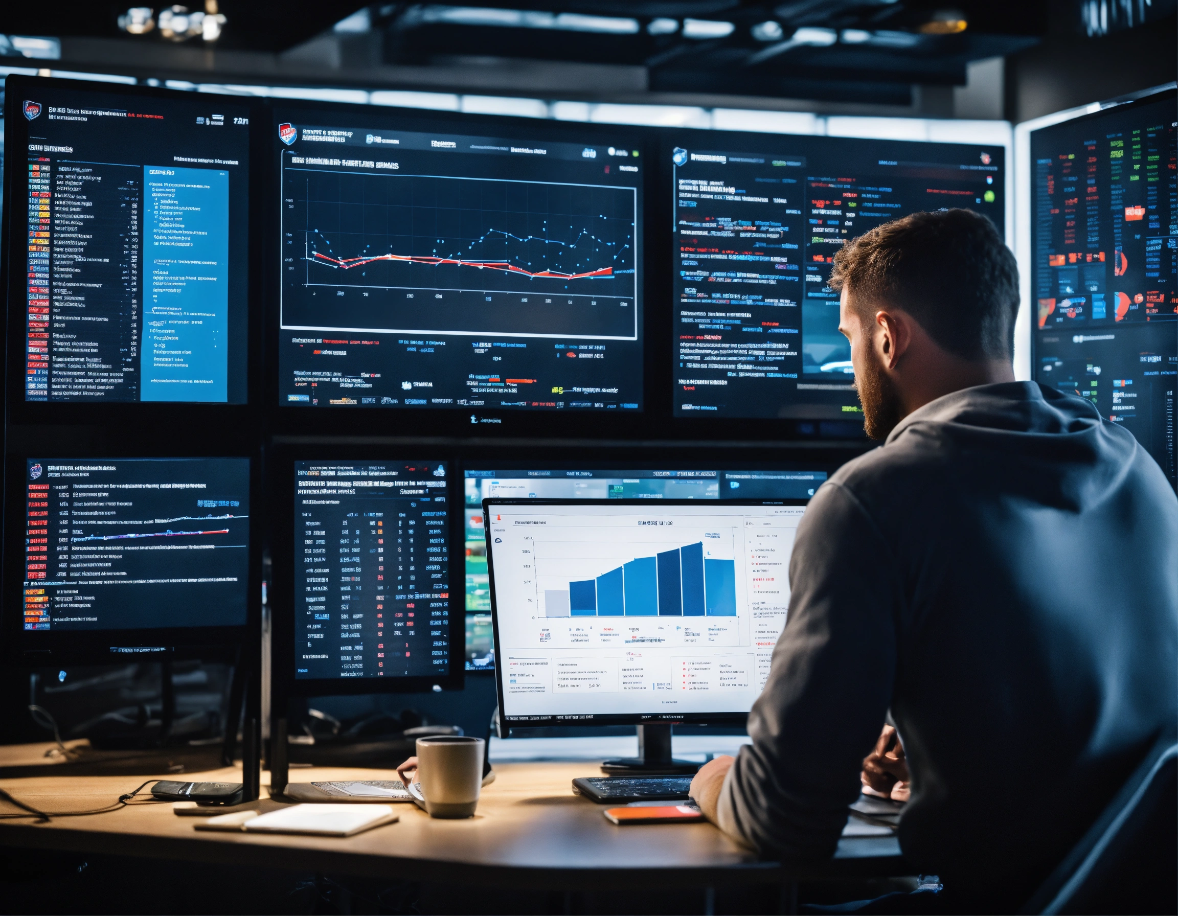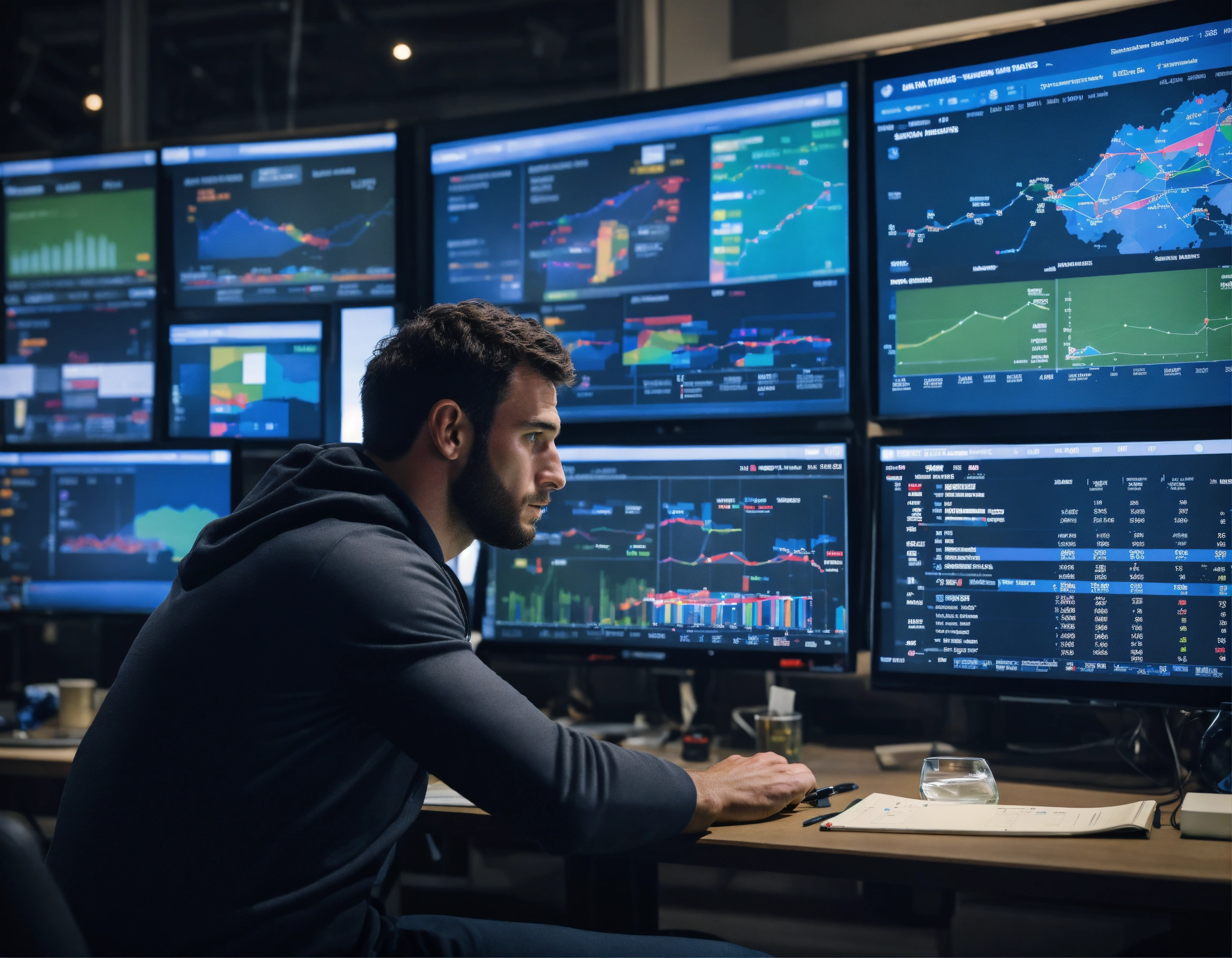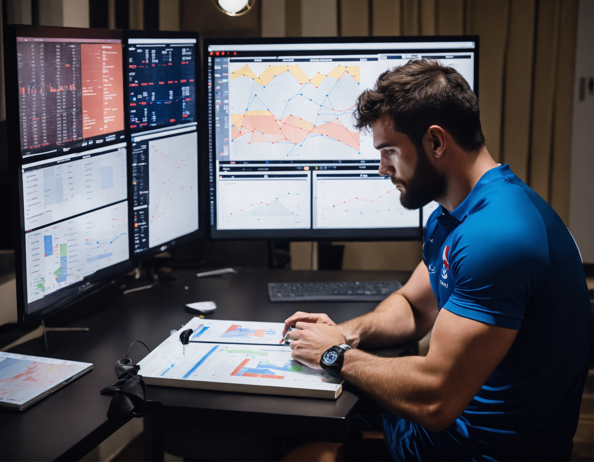 Portrait of a french rugby player analyzing statistics from previous games, lots of screens with sophisticated data dashboards and diagrams, boards with strategy sketches, data analysis, diagrams, metrics, kpis