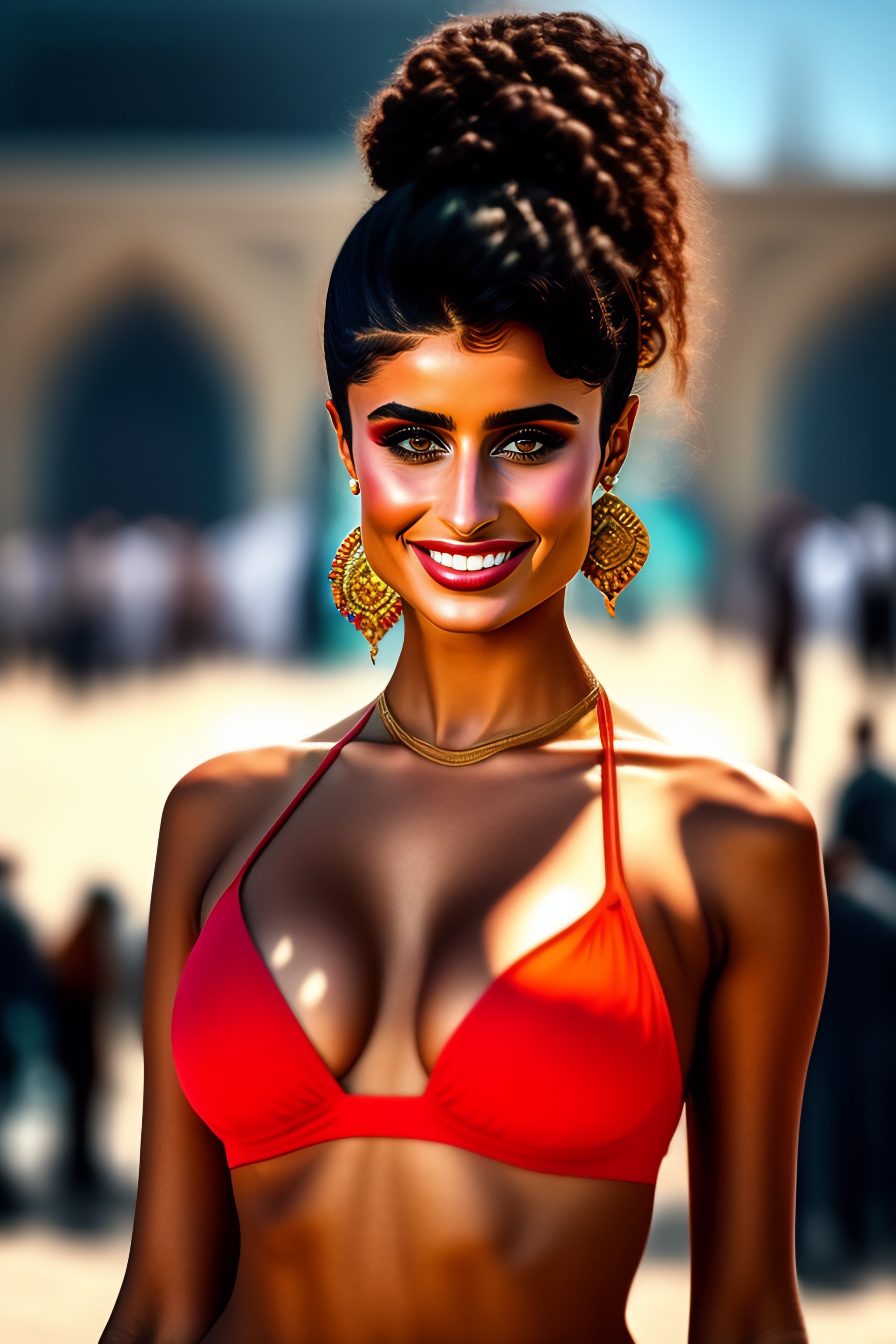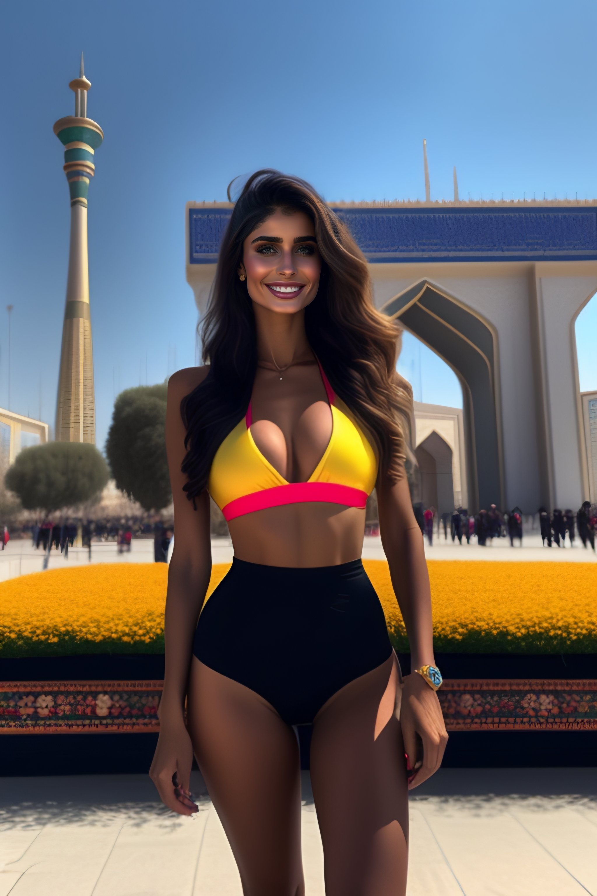 Taylor hill as iranian girl with bikini style standing in azadi square in tehran, rossdraw, smile, hot, radiant light, full length