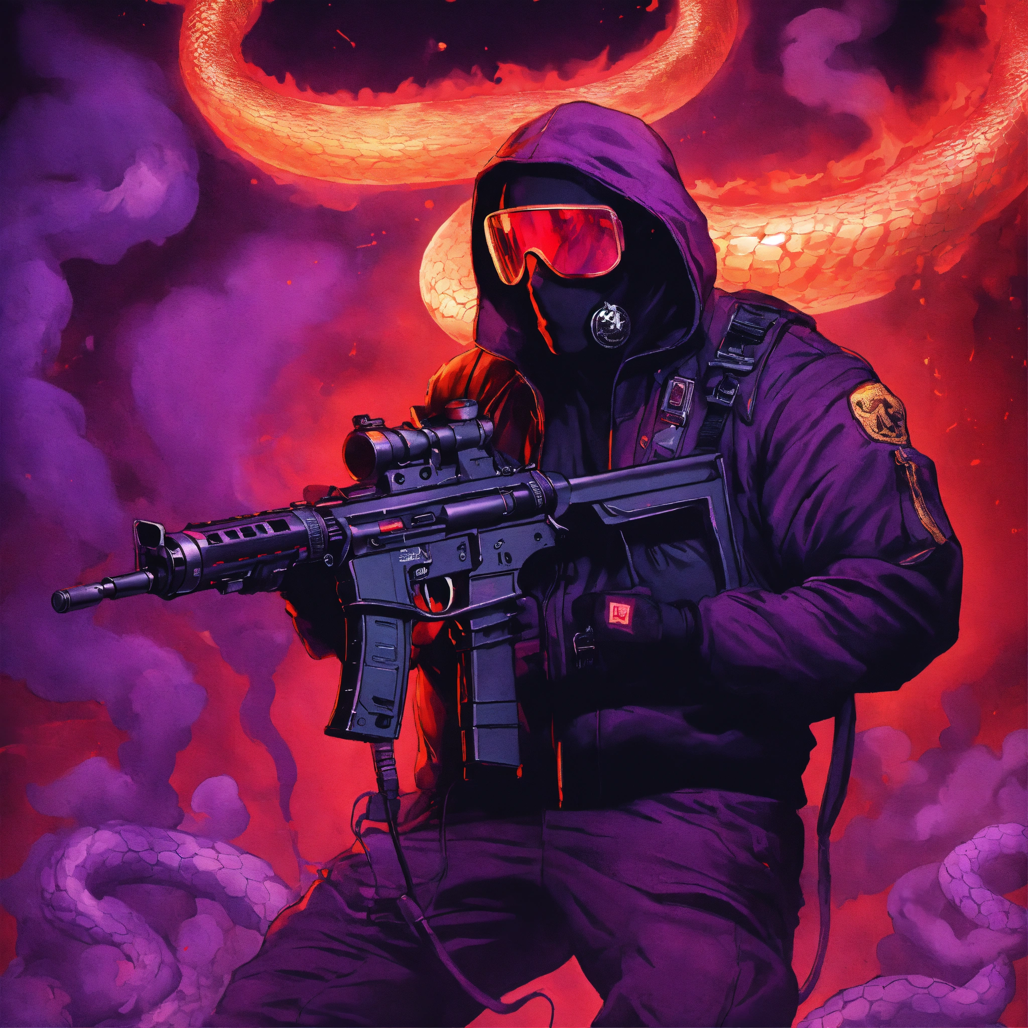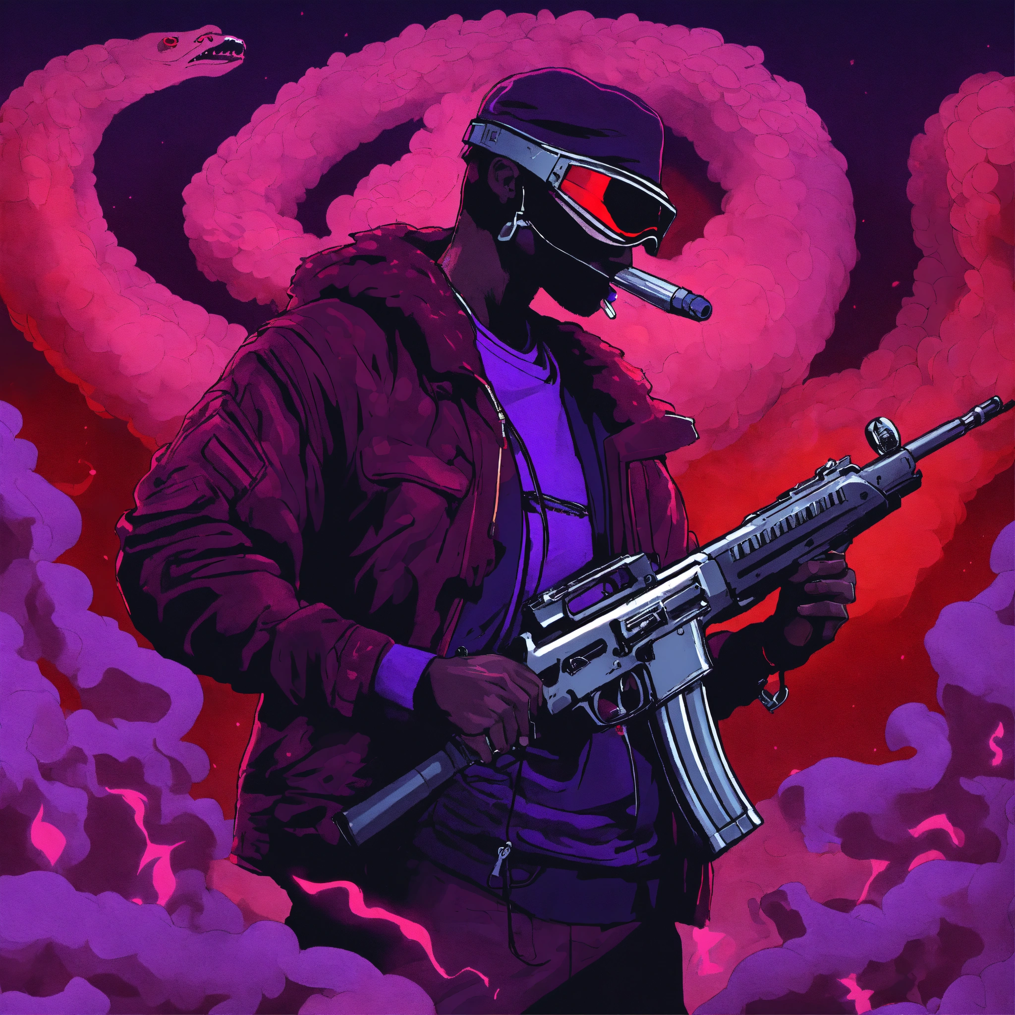 Digital album artwork, dark colors, dominant purple, red smoke in the background, metallic texture, hip hop, toons, submachine gun, snake.