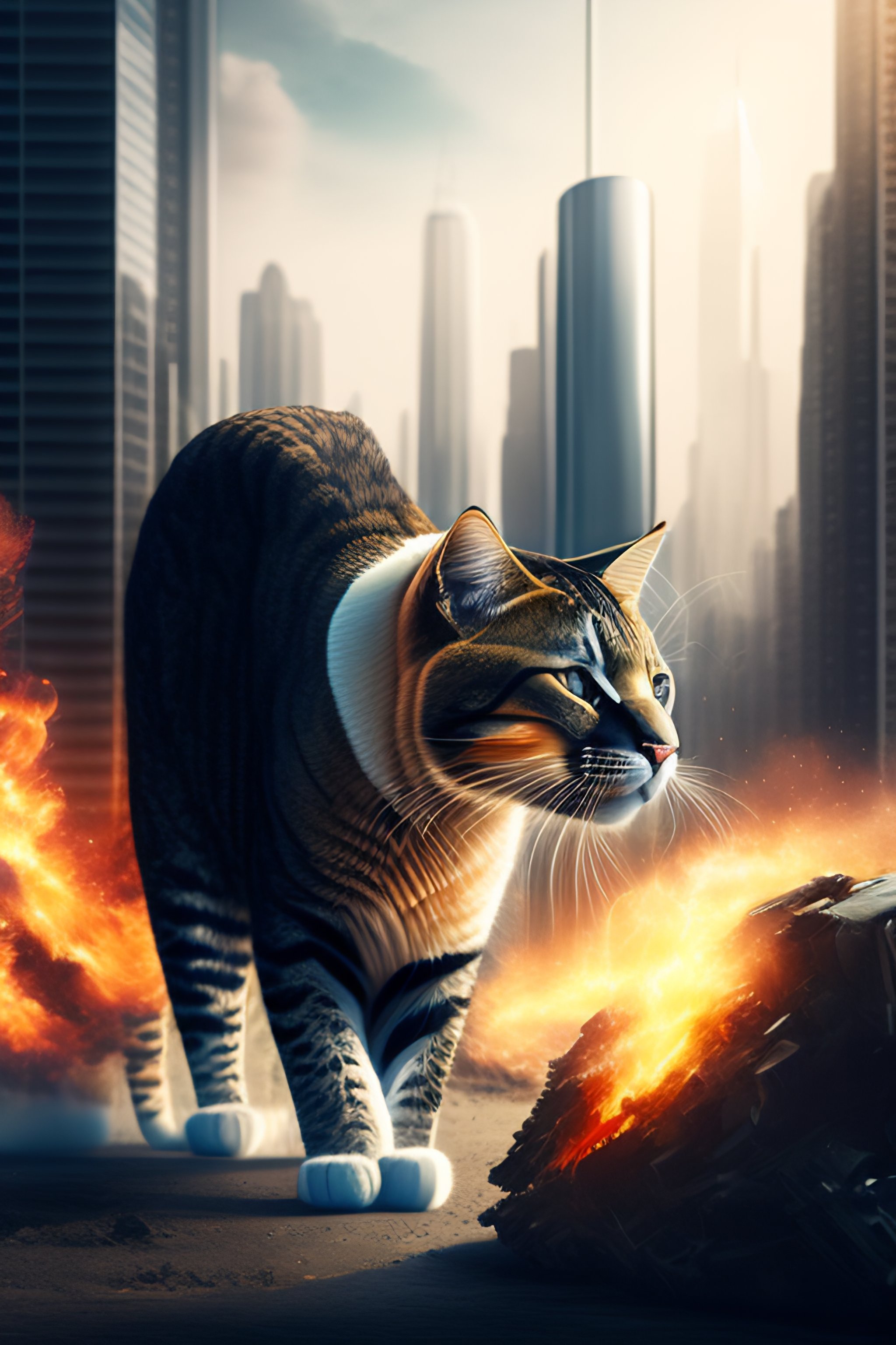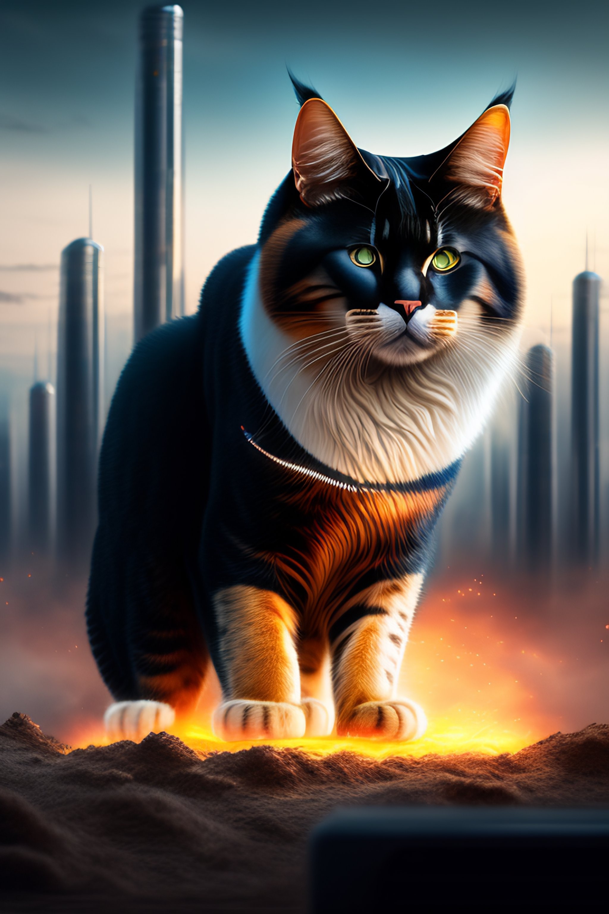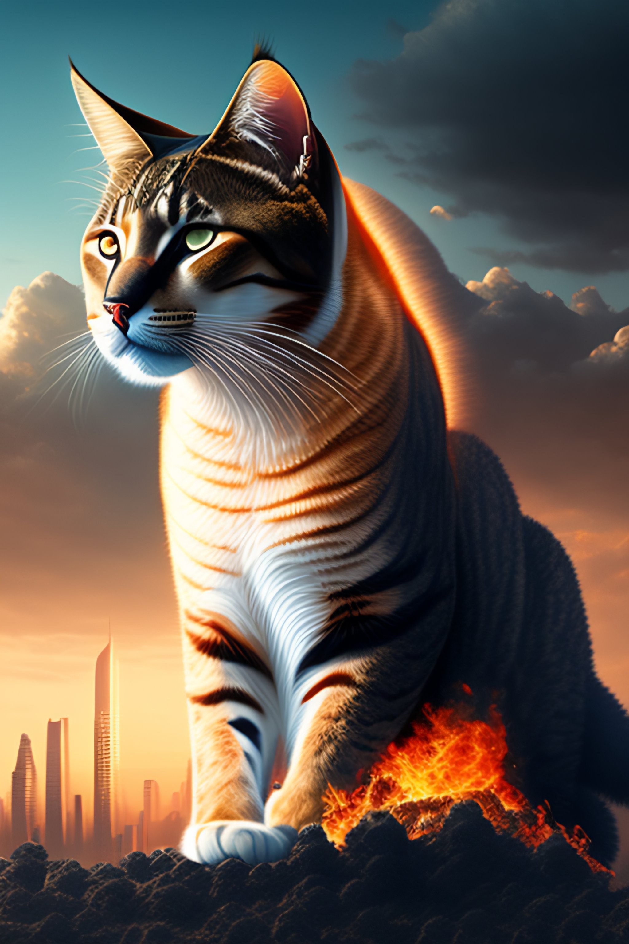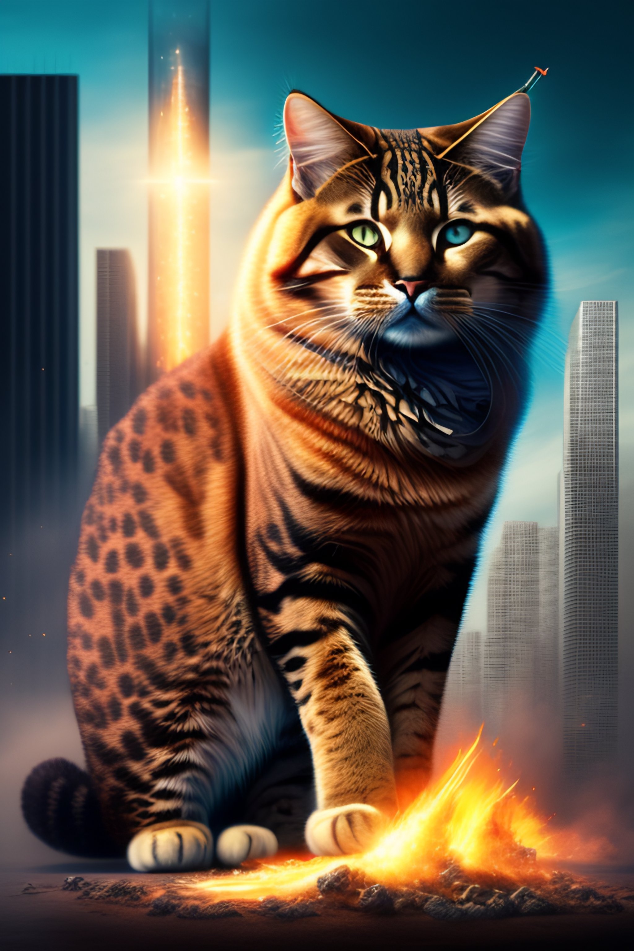 Portrait of a huge cat destroying a technological city