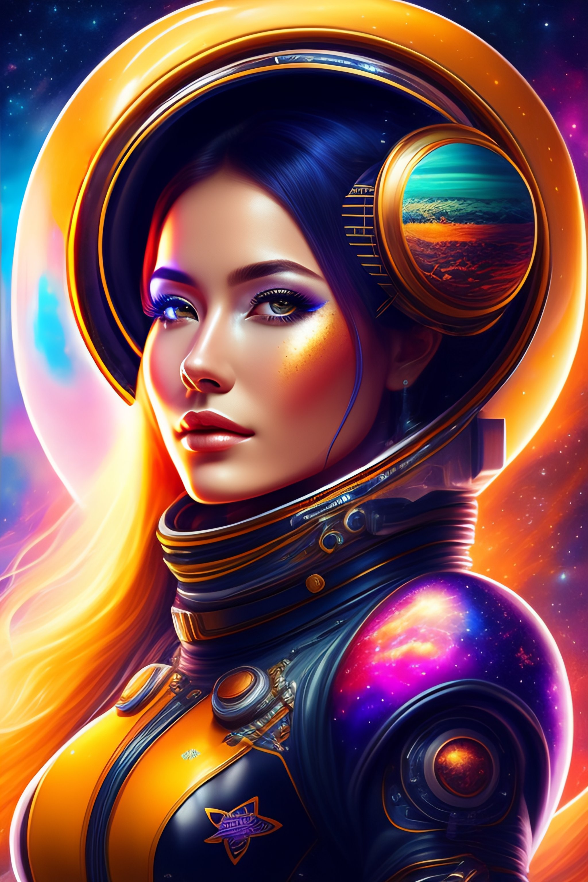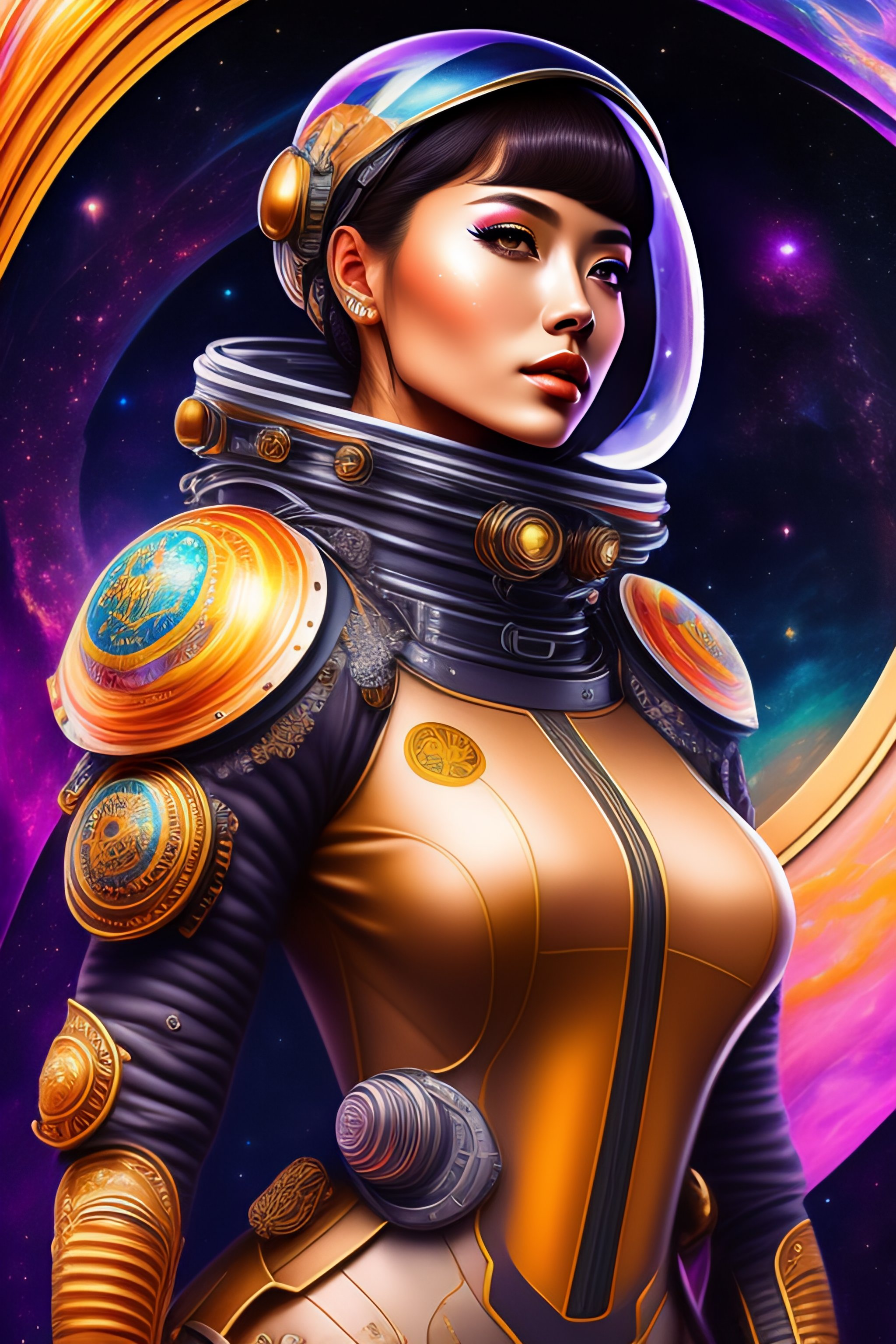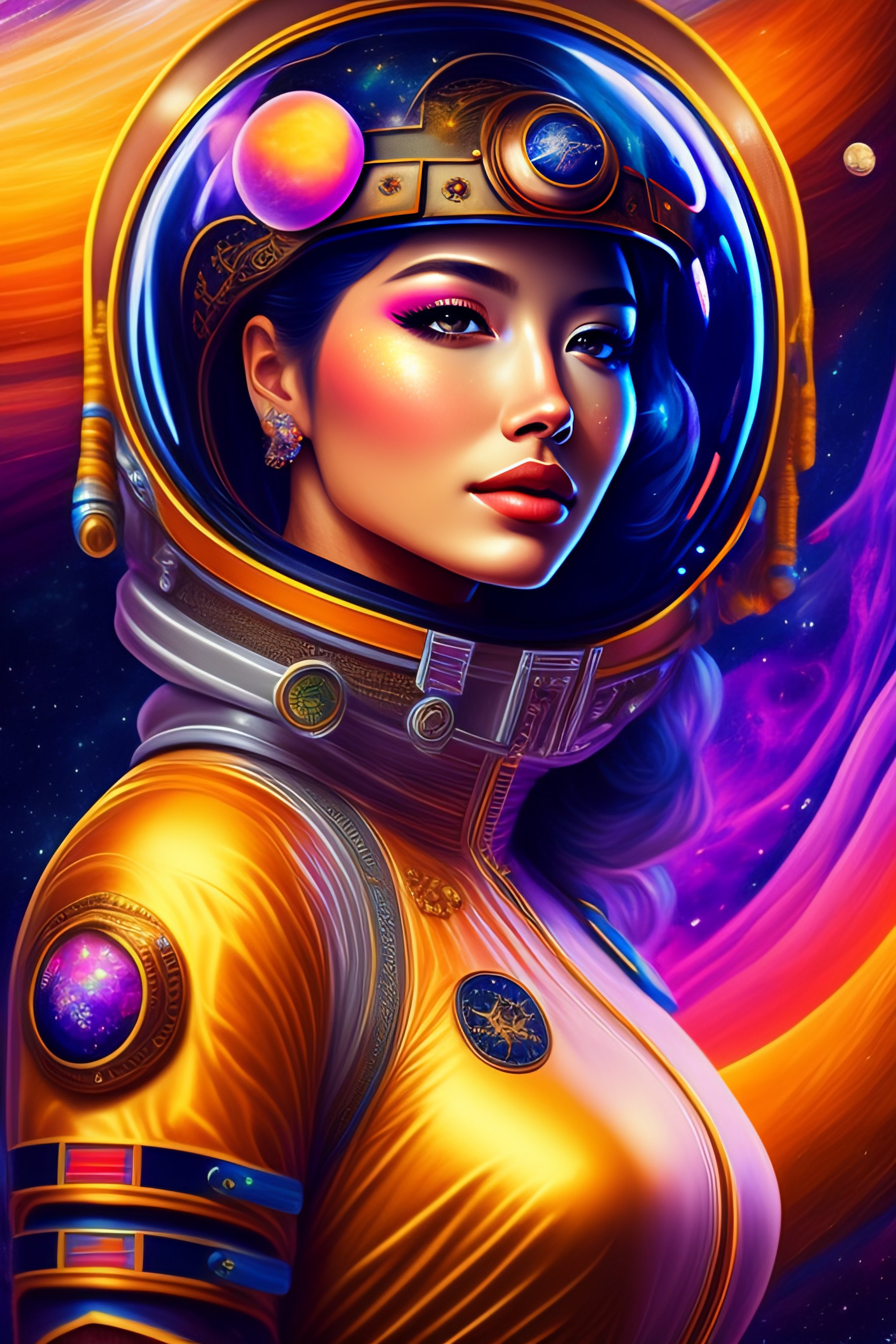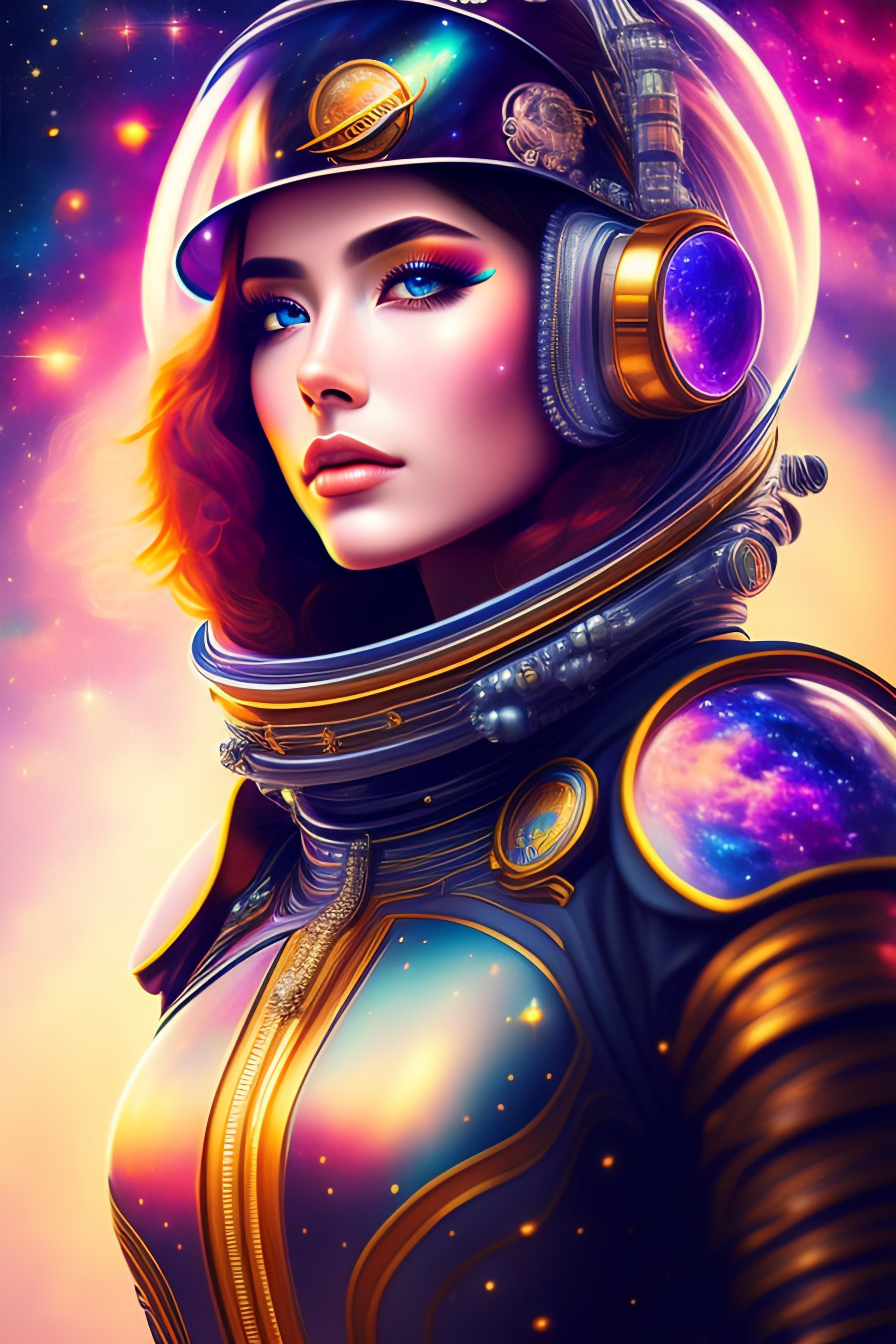 Intricate level of detail, masterpiece, astro, beautiful girl in space, futuristic spacesuit, steampunk feeling, portrait, close-up, colorful, fine linework