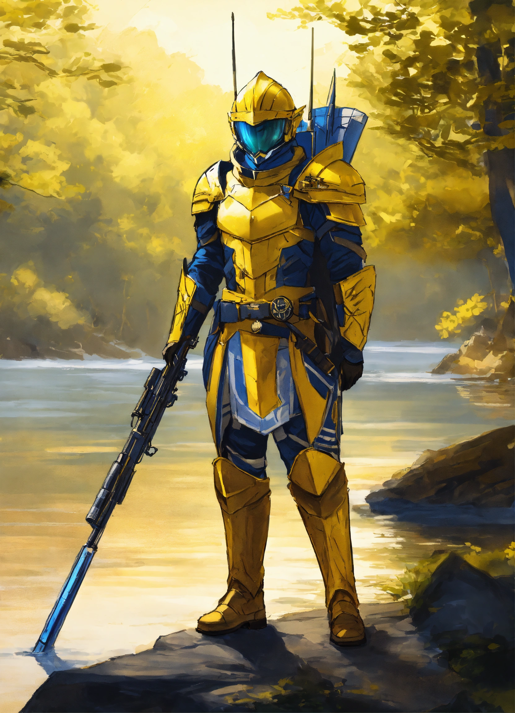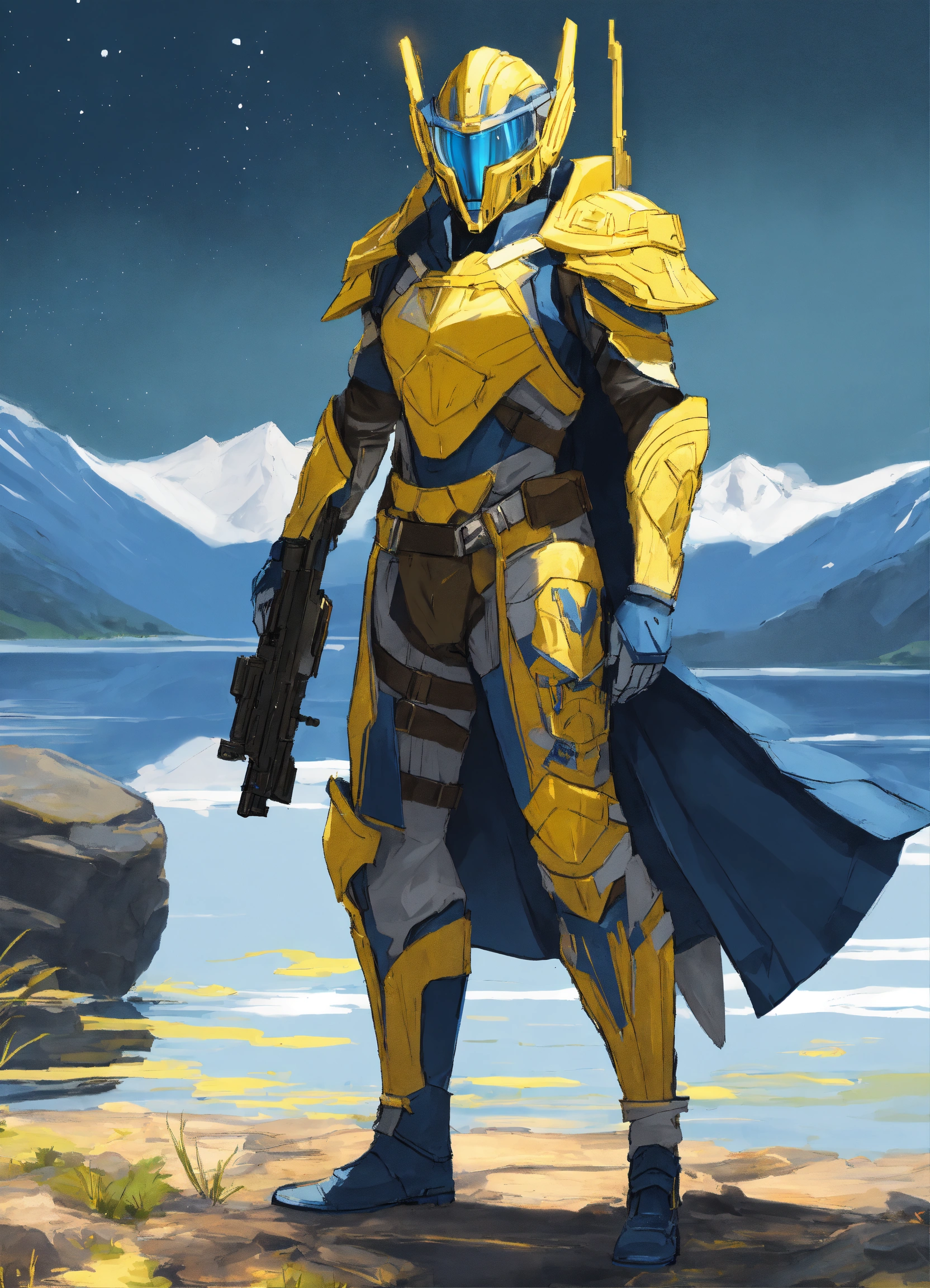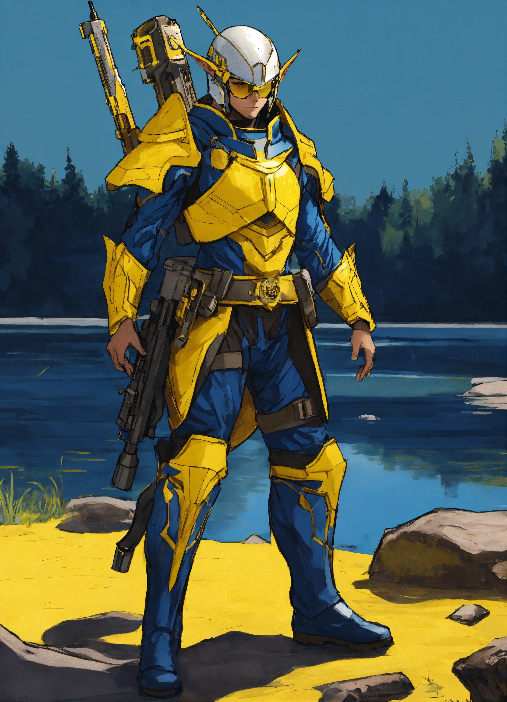 Drawing of a full body of a high elf sci fi soldier wearing sci fi elven armor, navy blue and yellow and white sci fi armor and helmet, visor, boots, male, holding a light machine gun, standing by a lake