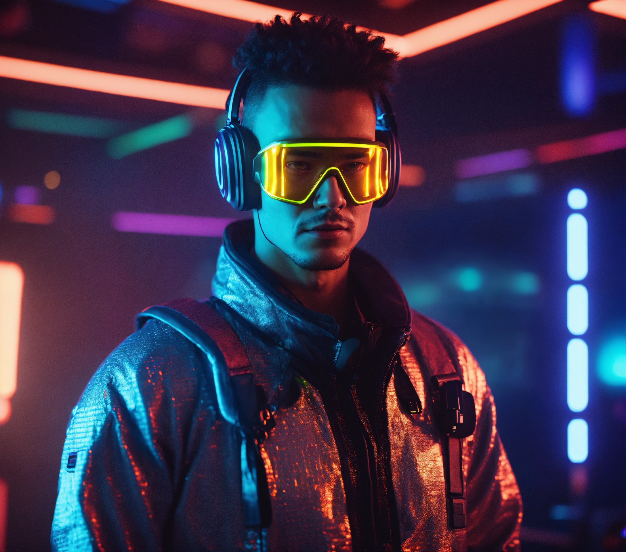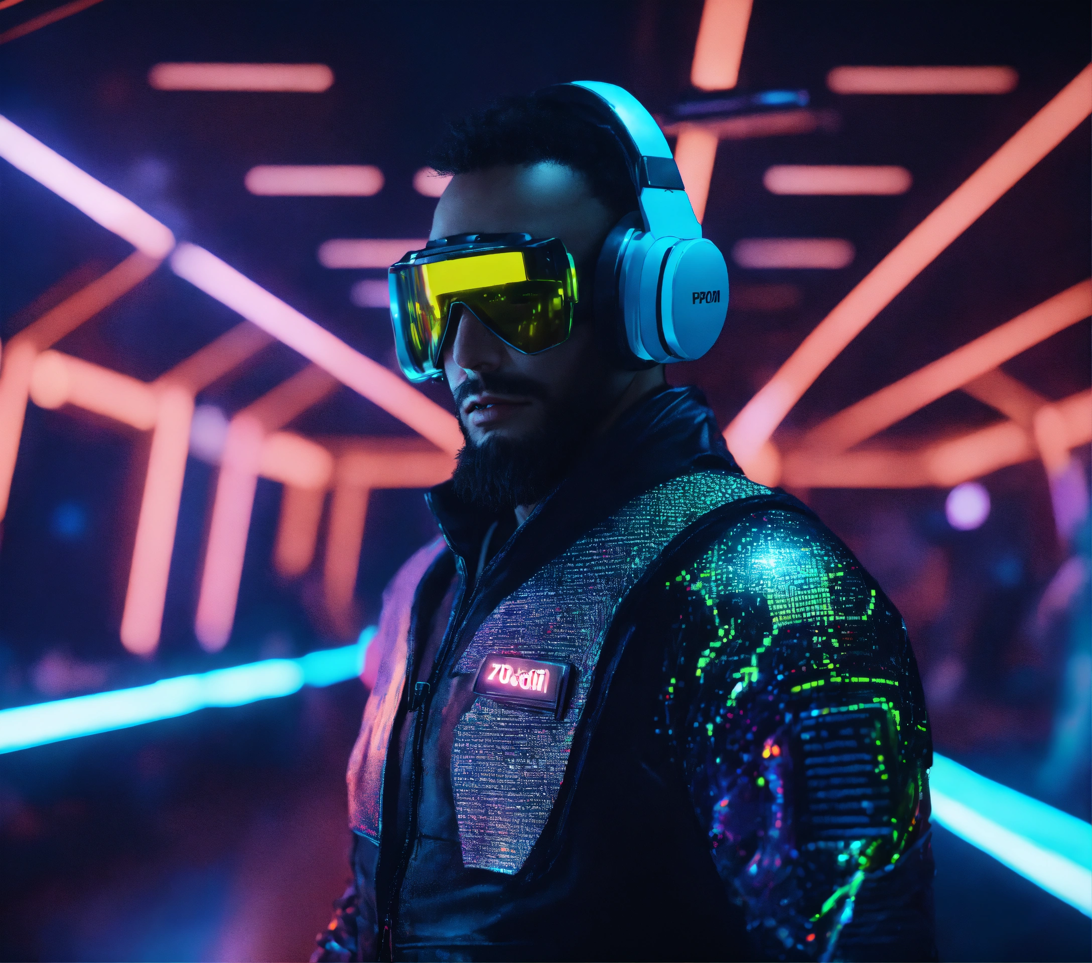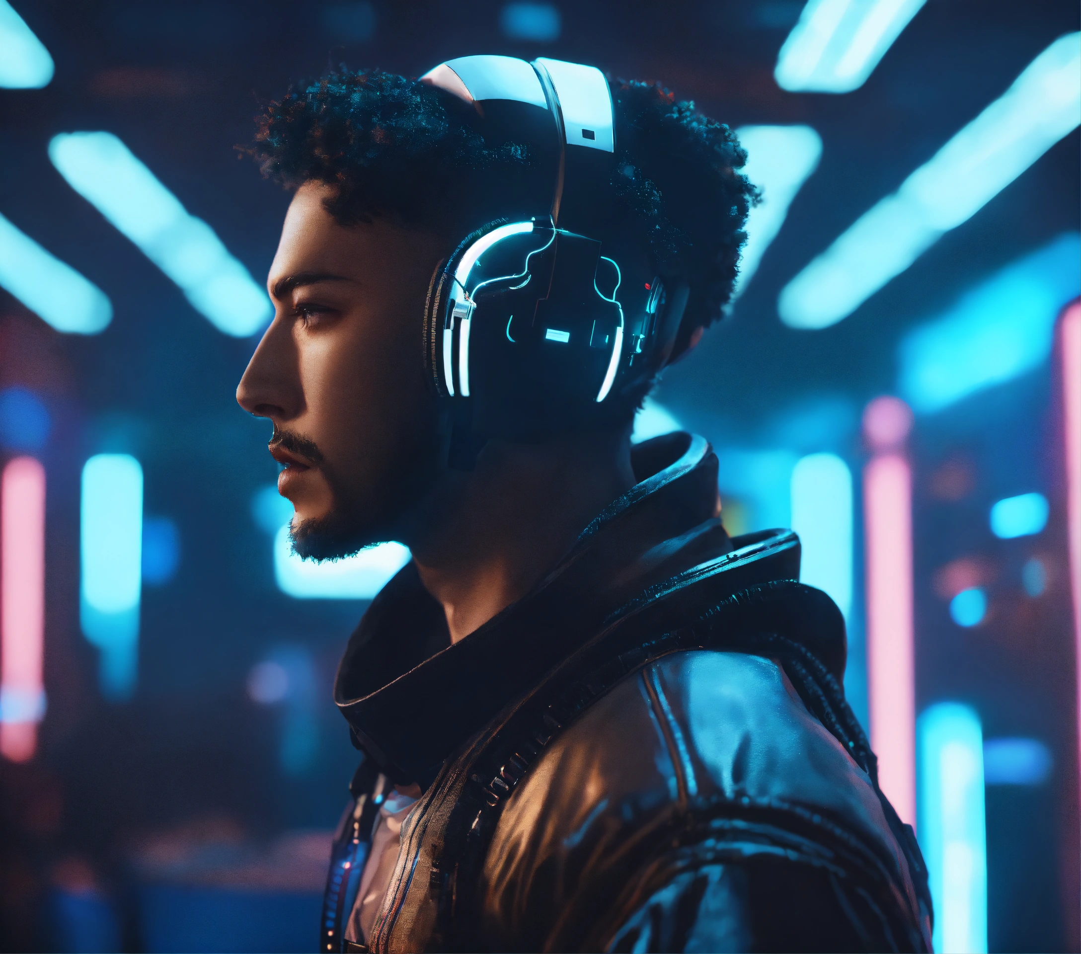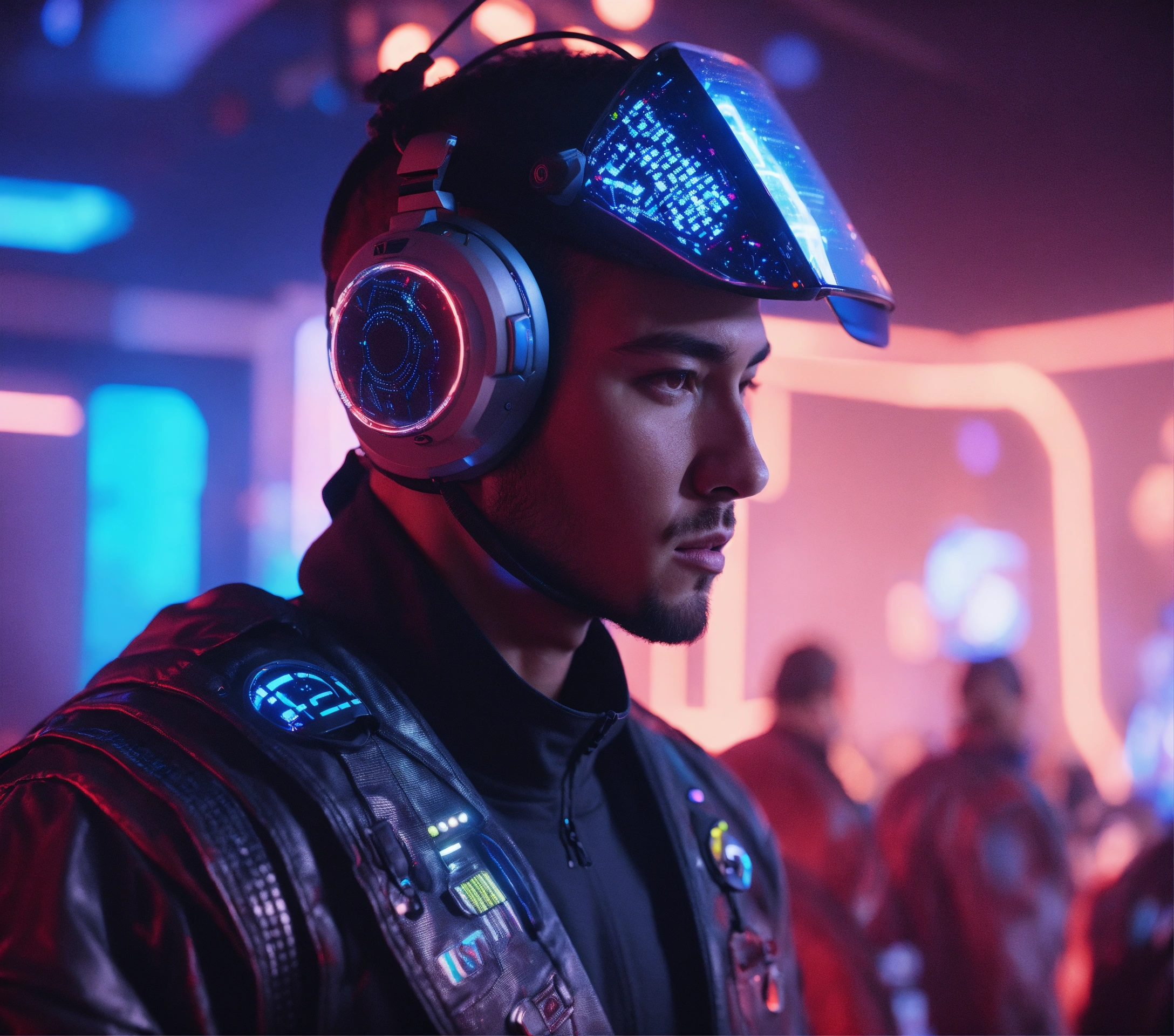 Zoom out of a futuristic mixed martial arts master and hacker, wearing a hi tech clothing and ear antenna at a rave on a space yacht, realistic, futuristic, sci fi, 8k, unreal engine, pixar
